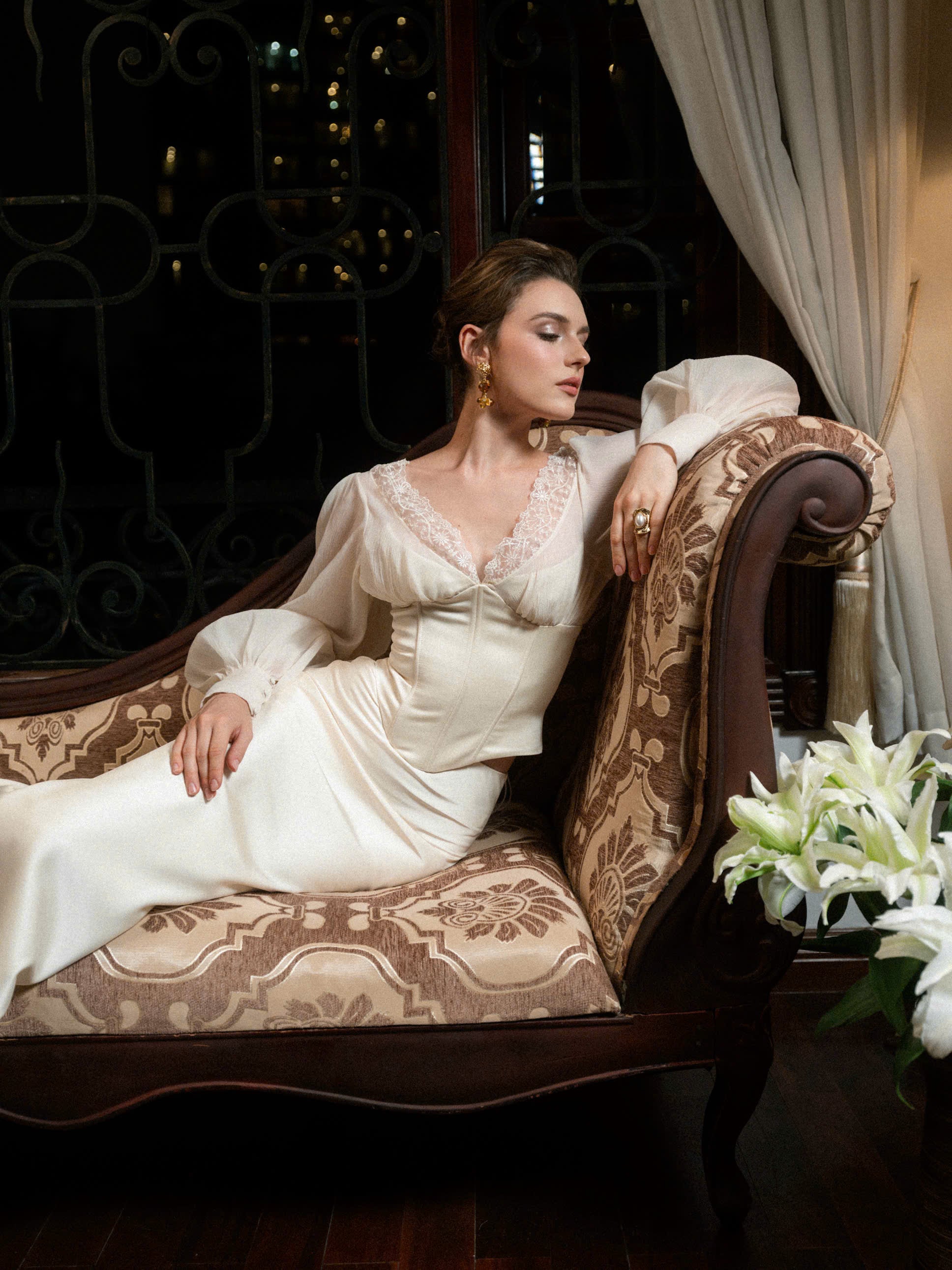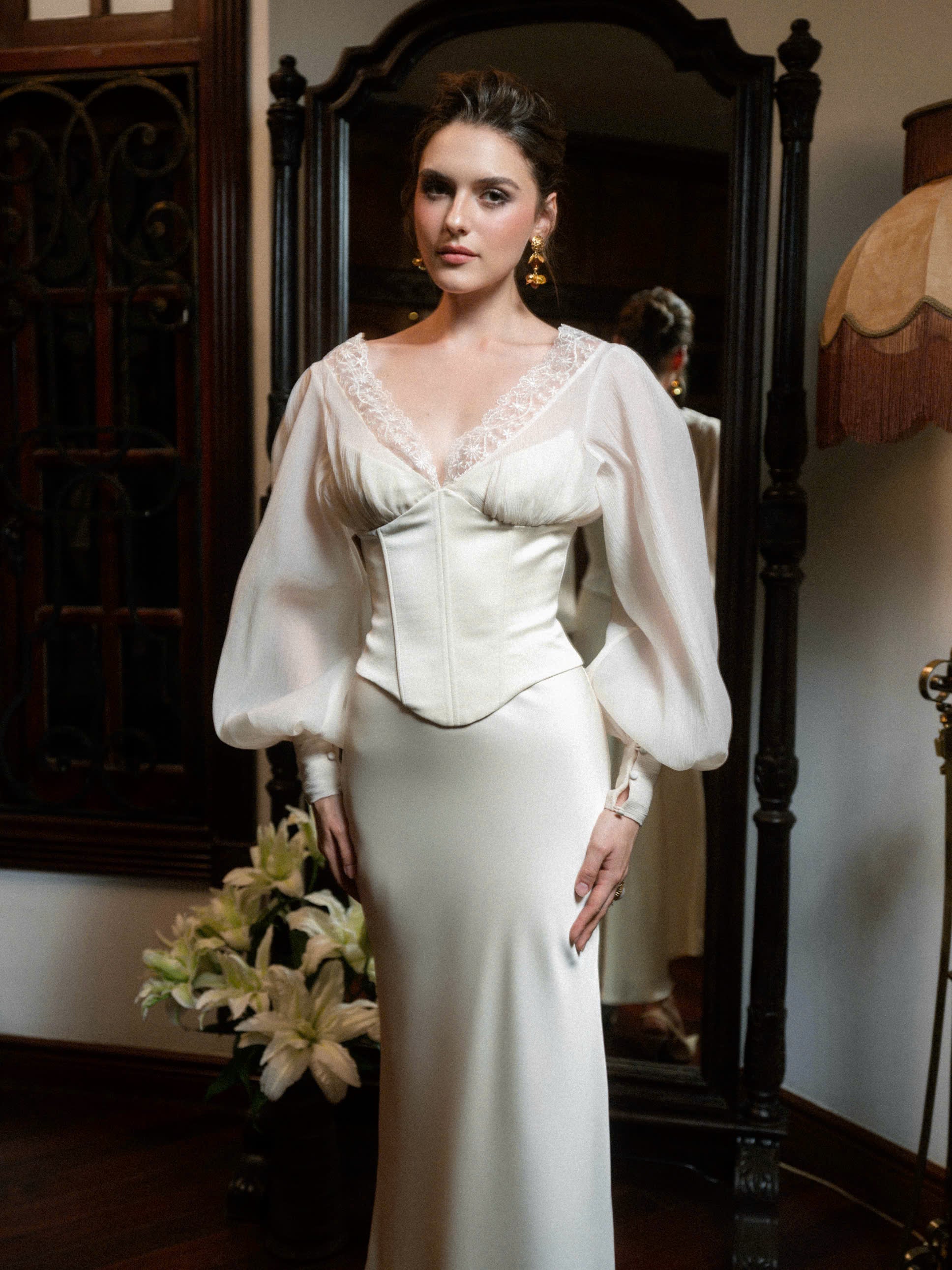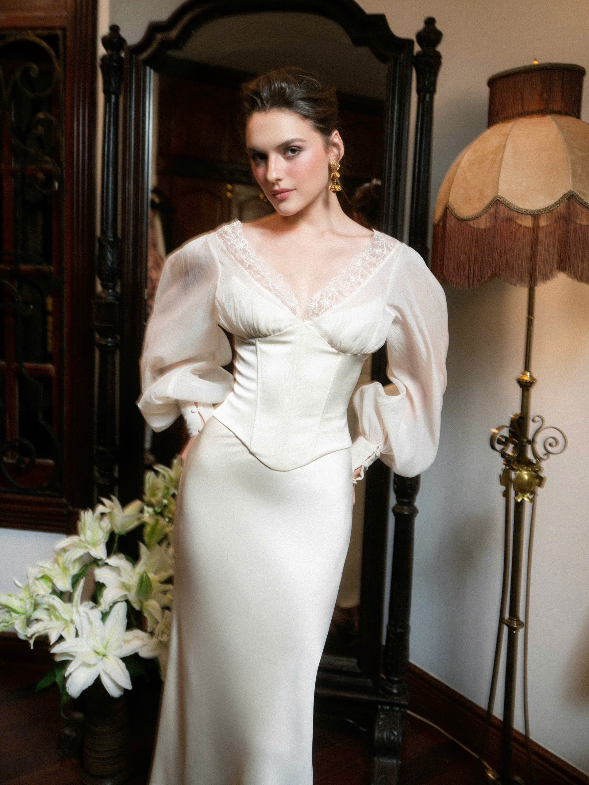 A design that feels as if it stepped out of a classic film frame: the AERIS CORSET with its romantic billowed sleeves, soft lace accents, and a sculpted corset silhouette that embraces every curve, bringing a beauty that is both regal and modern.