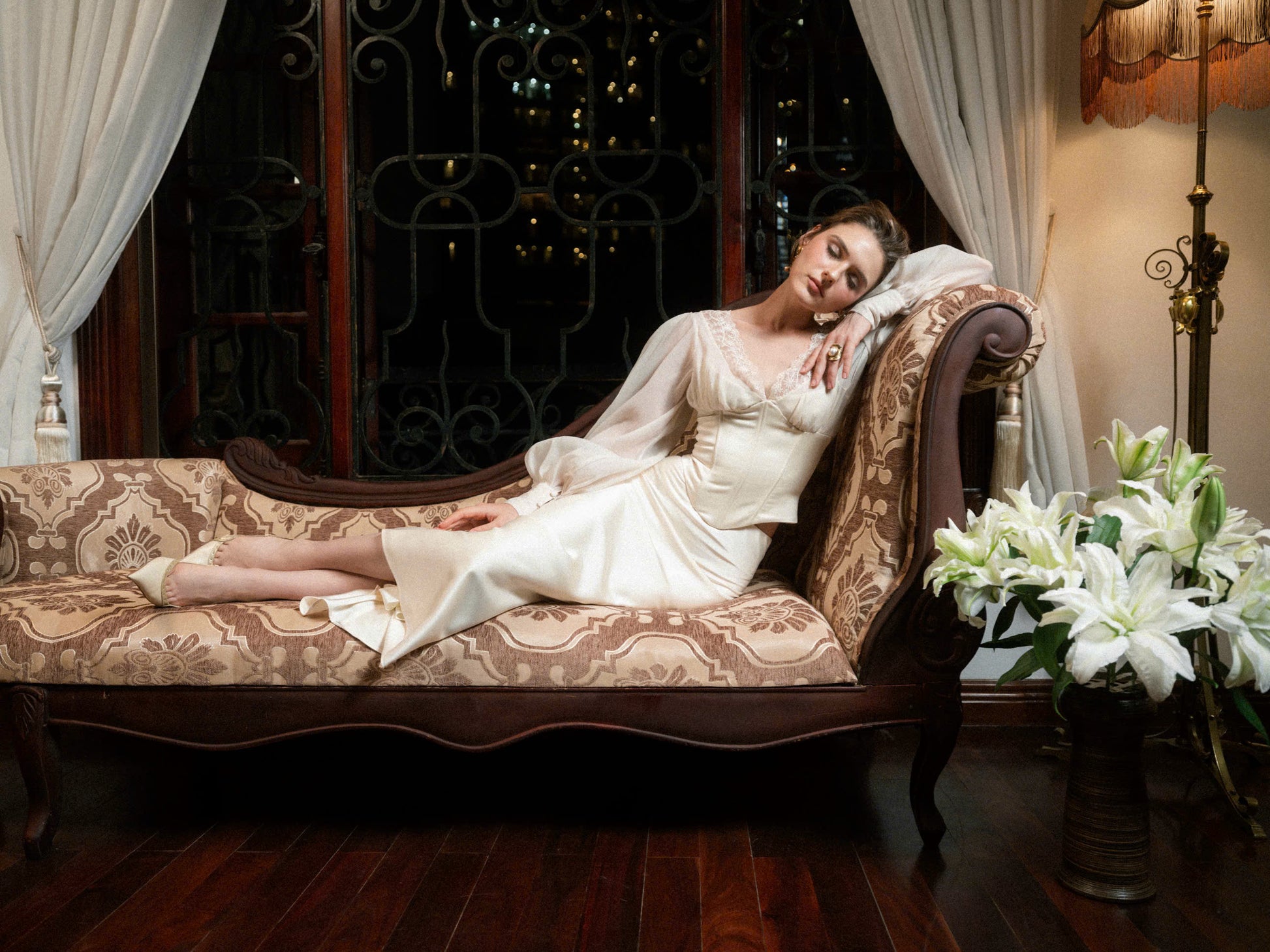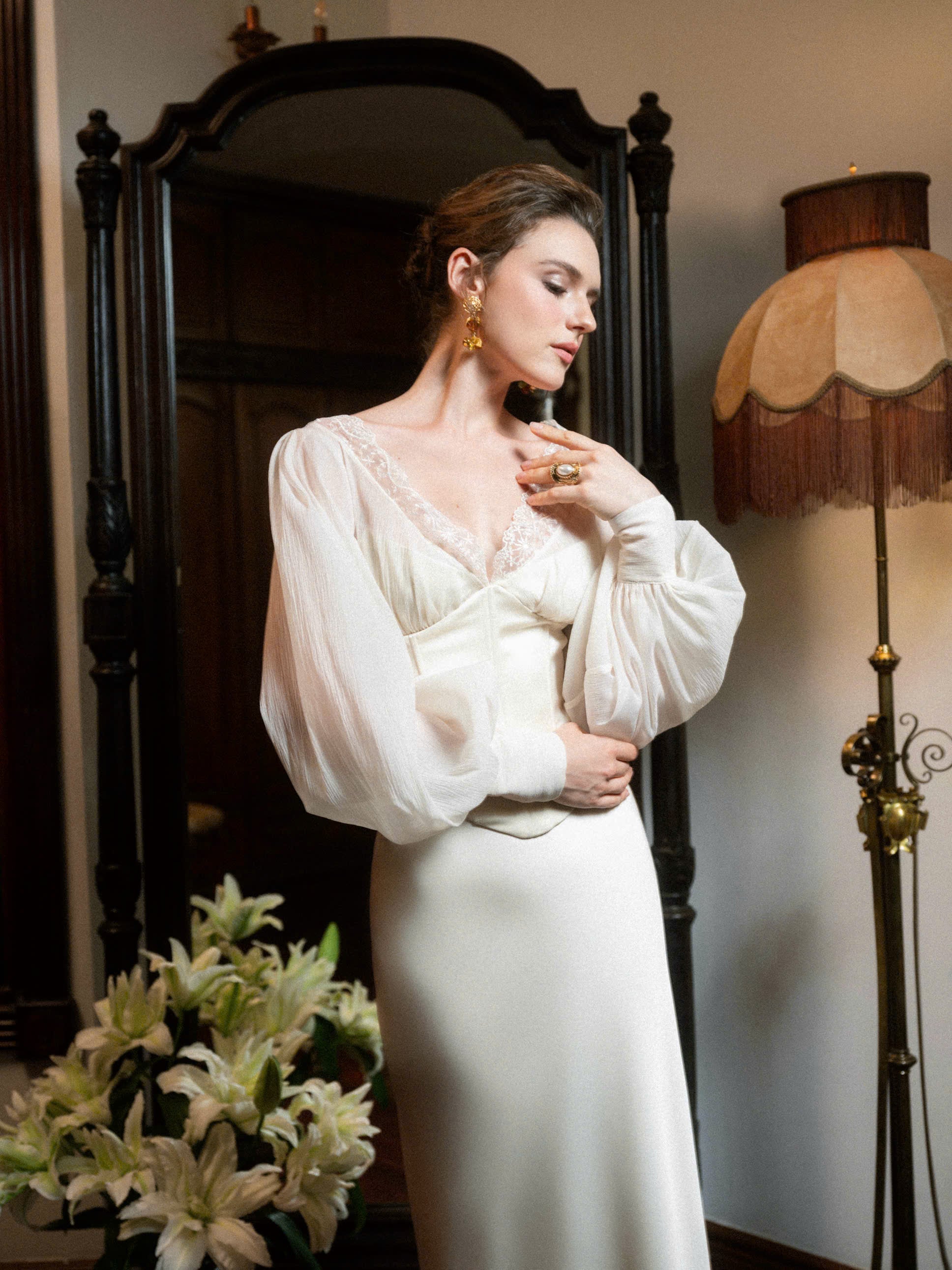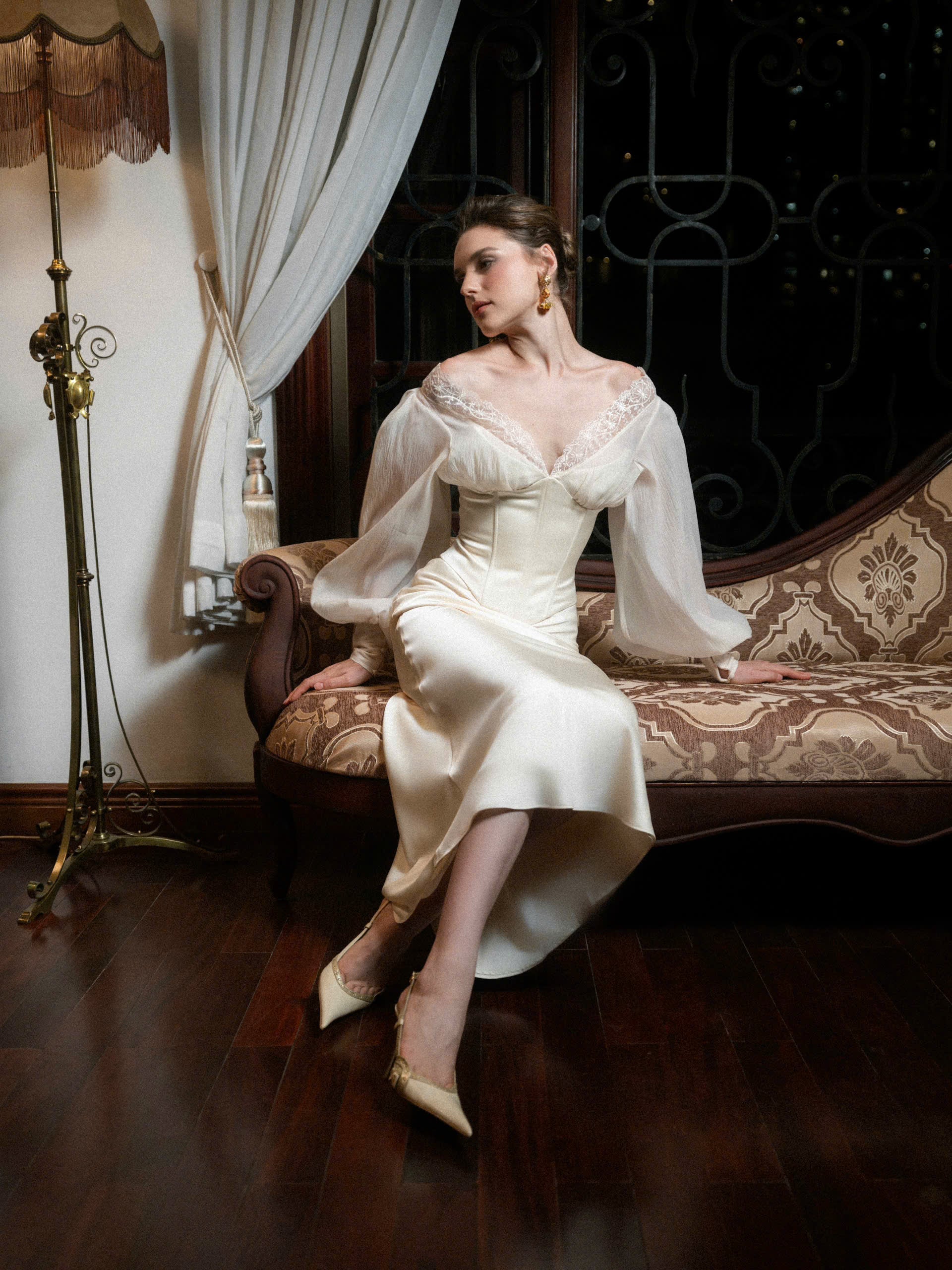 A design that feels as if it stepped out of a classic film frame: the AERIS CORSET with its romantic billowed sleeves, soft lace accents, and a sculpted corset silhouette that embraces every curve, bringing a beauty that is both regal and modern.