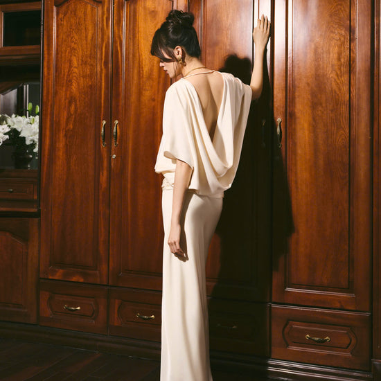 ALMA DRESS – crafted from luxurious satin, where refined draping pleats flow with effortless grace. The sensual draped-back detail becomes the centerpiece, embodying timeless sophistication and an enduring feminine allure.