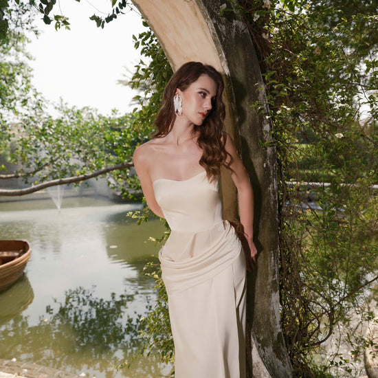 As soft as the breath of a romantic afternoon, AURA is a new silk design that features a unique leaf-shaped long drape, gently cascading with every step you take.