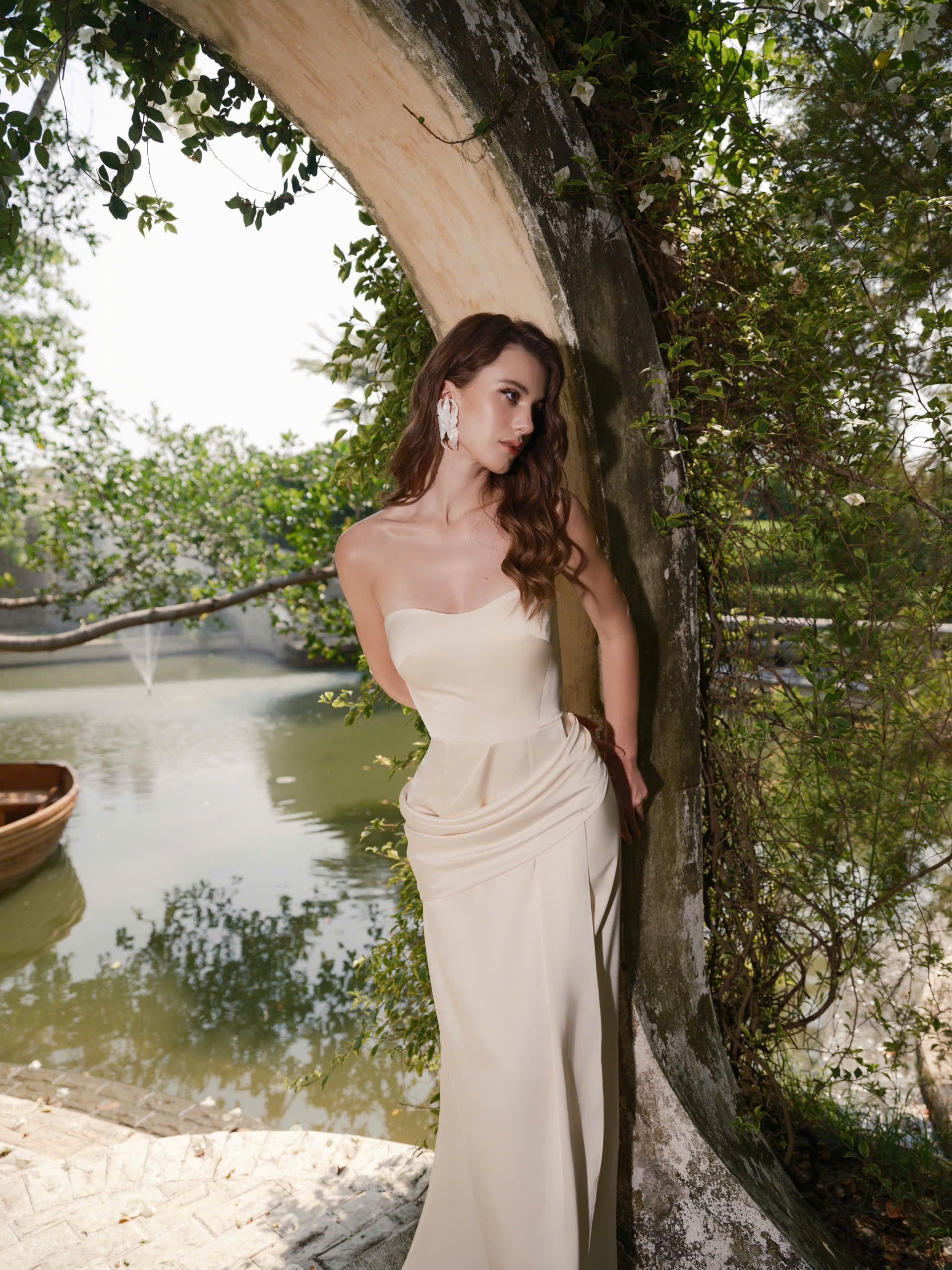 Crafted from premium silk, the gown embraces the body with a soft corset and elegant pleats at the hip, offering a look that is both graceful and alluring. The delicate lace-up back allows for an adjustable fit, adding a touch of feminine softness and charm.