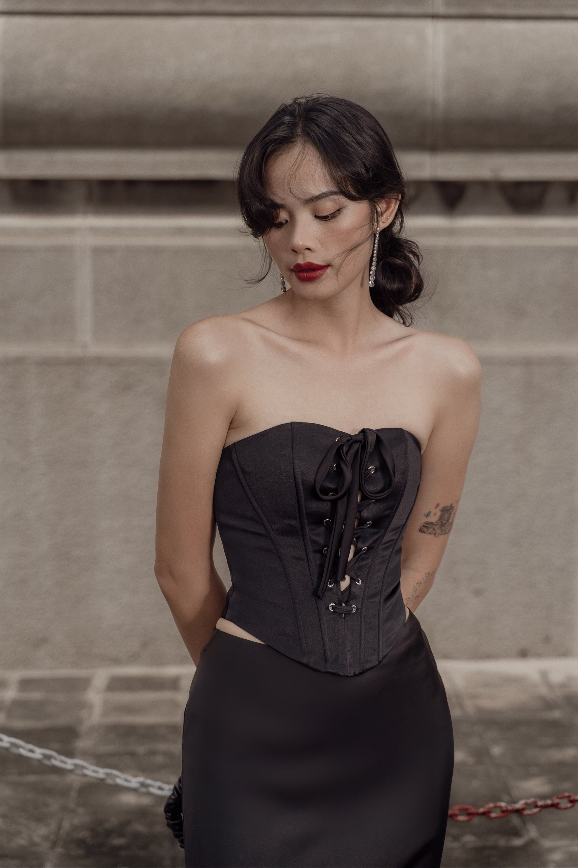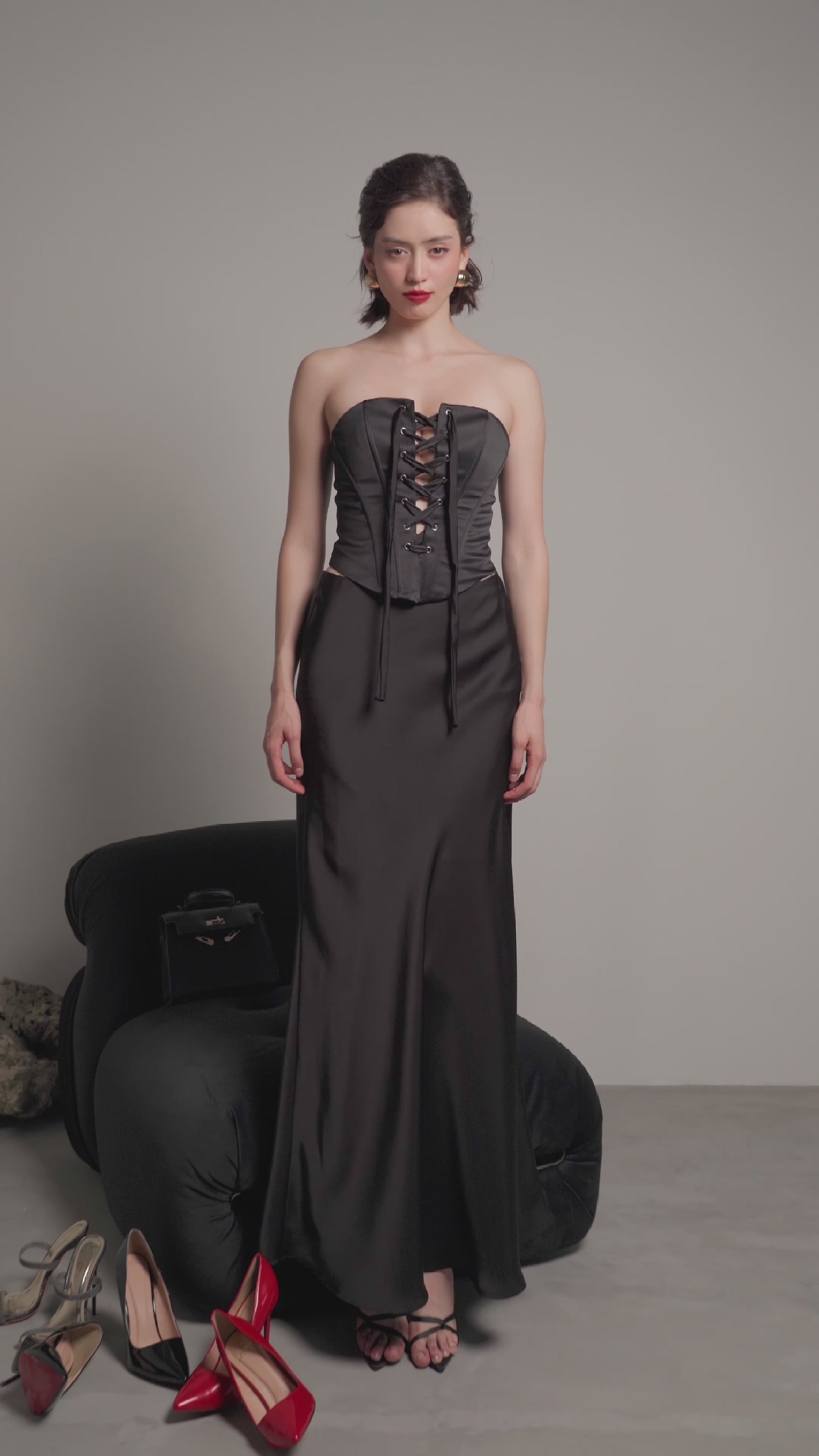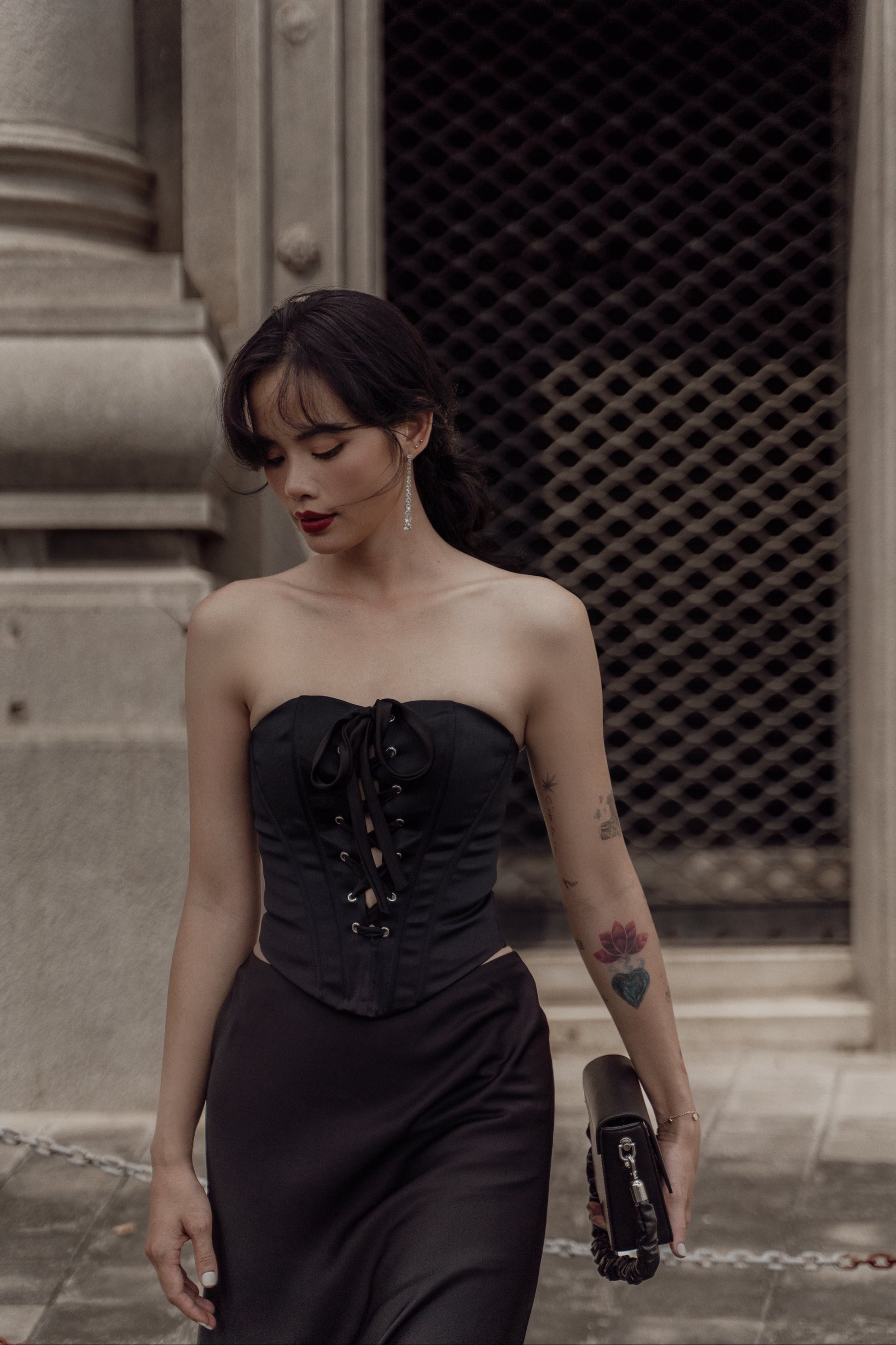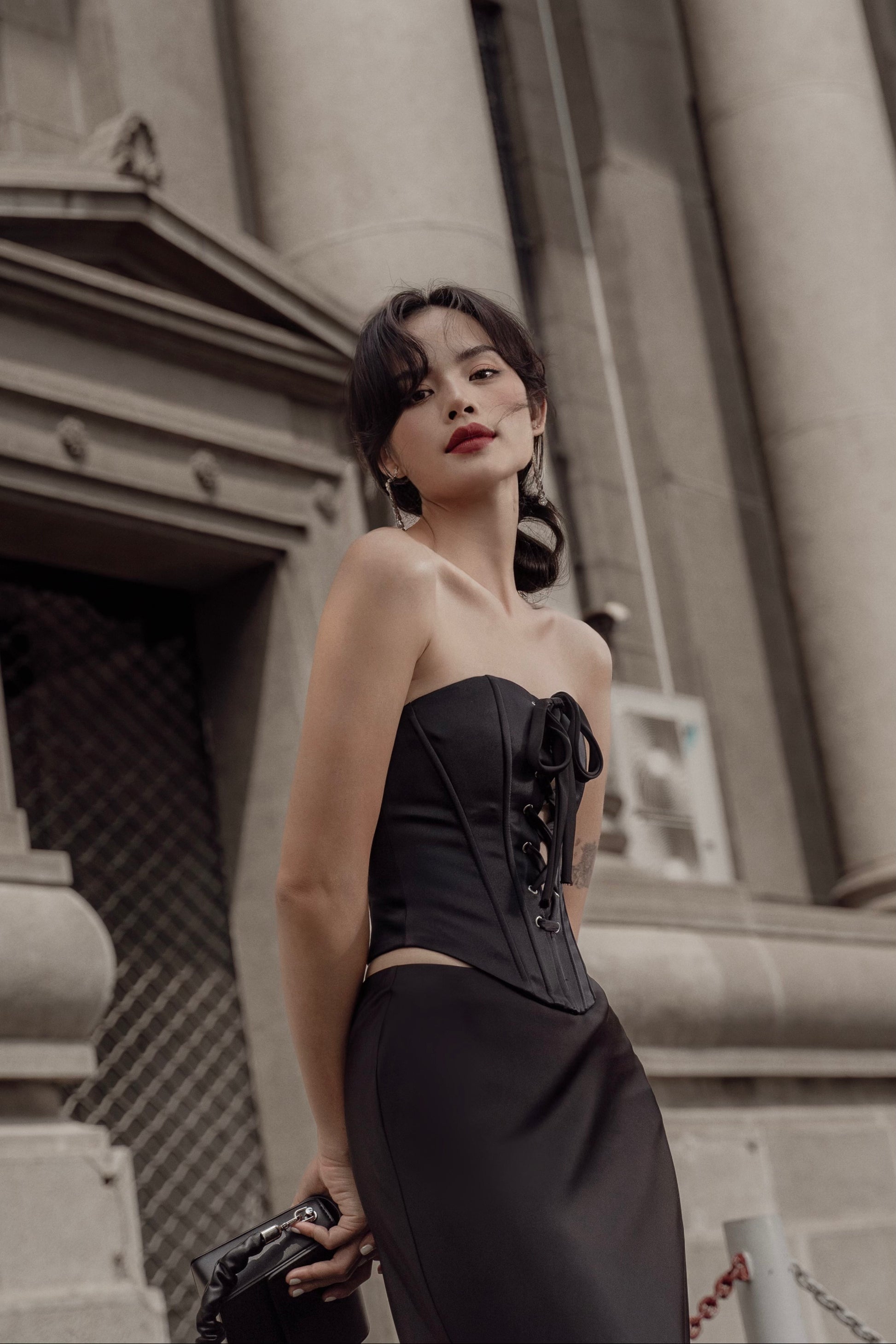 Quyến rũ, bí ẩn và sang trọng với gam màu đen, thiết kế Britney corset với chất liệu phi 2 da cứng cáp, đứng phom cùng các chi tiết xỏ khoen mắt cáo phá cách khiến người mặc trở nên vô cùng thu hút và nổi bật.