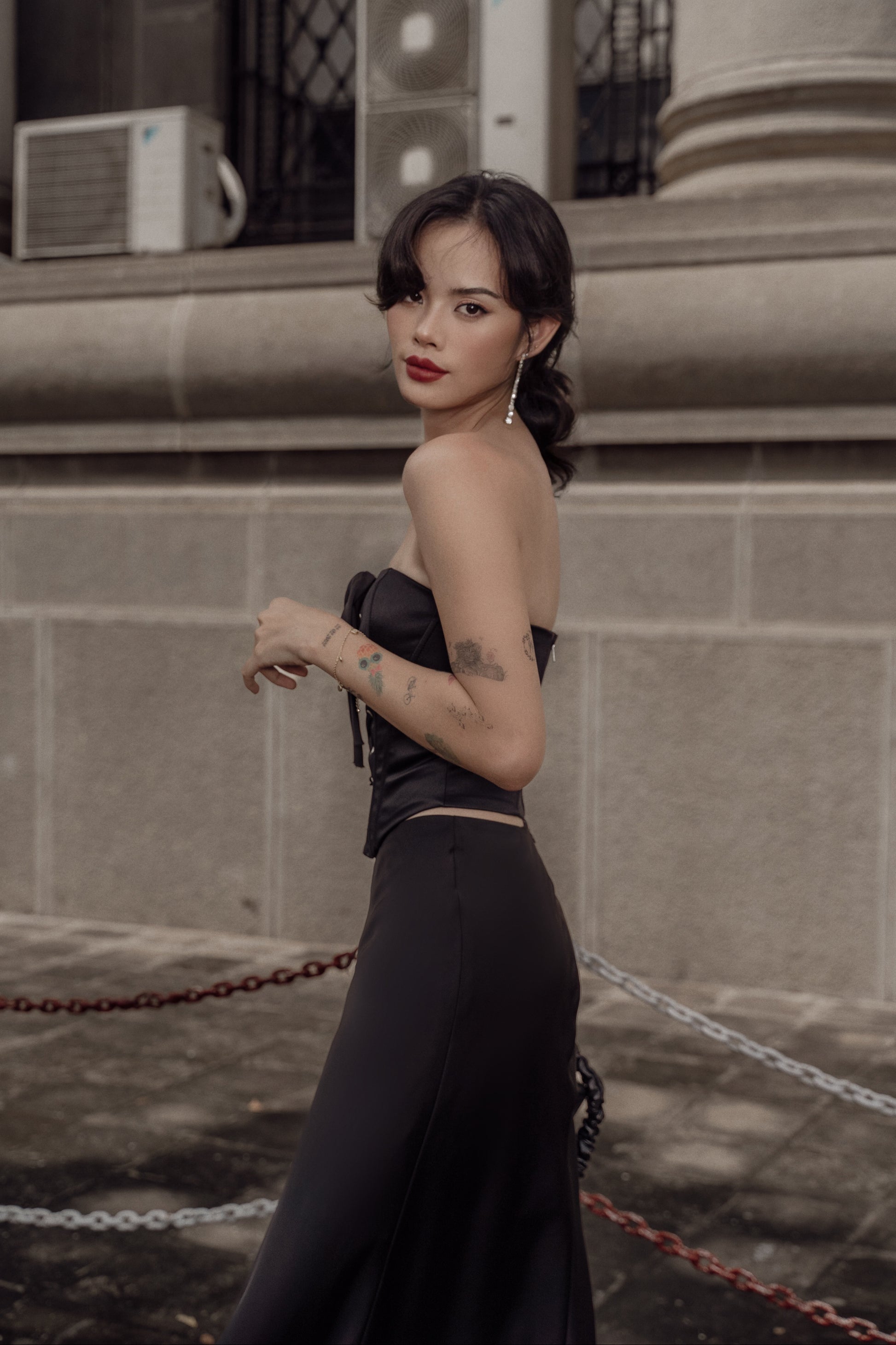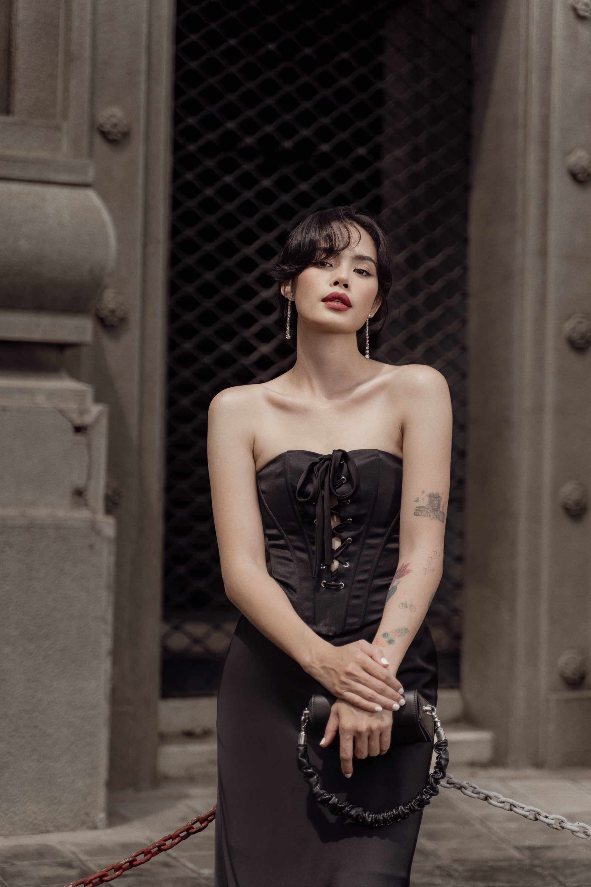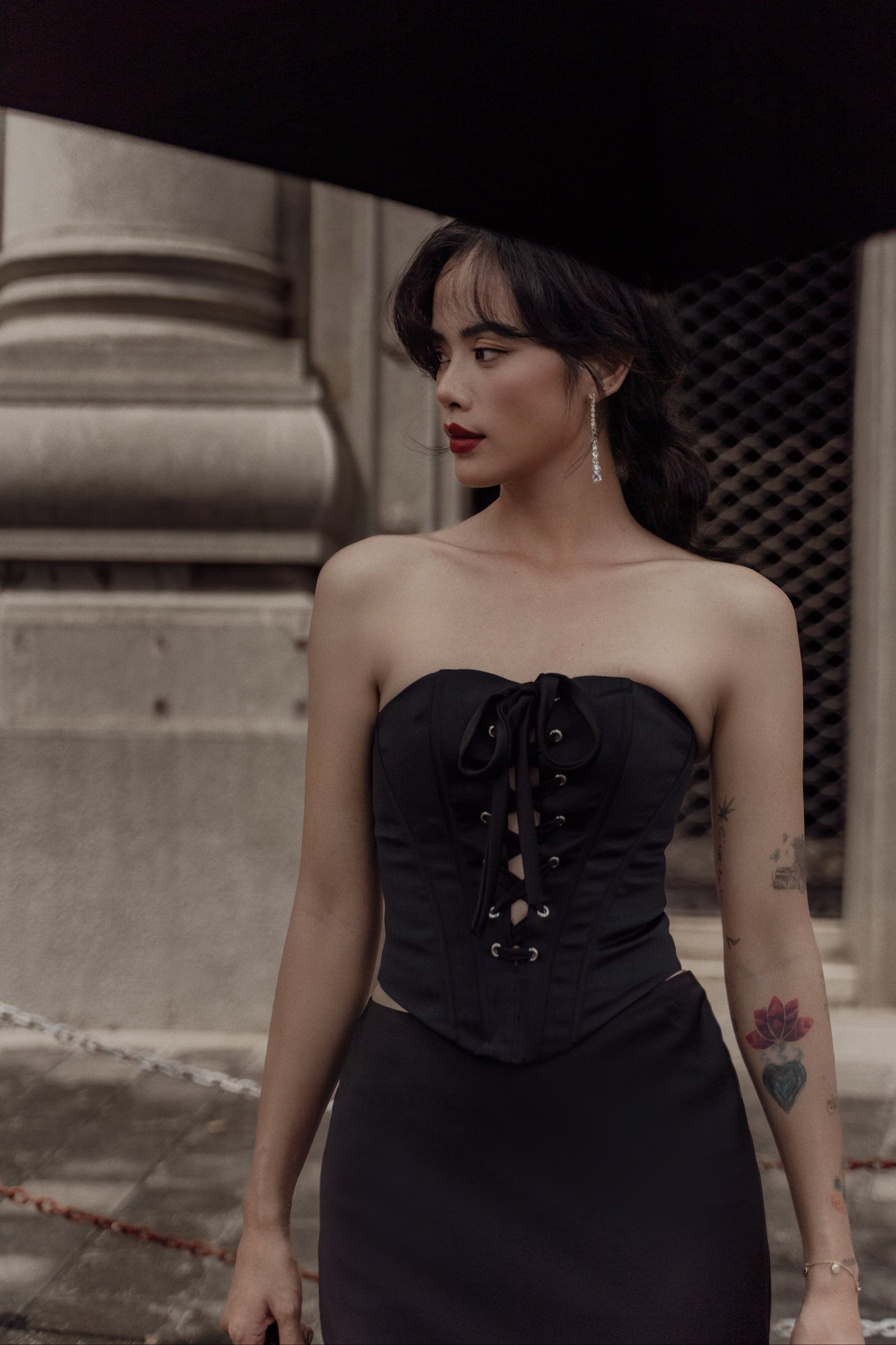 Quyến rũ, bí ẩn và sang trọng với gam màu đen, thiết kế Britney corset với chất liệu phi 2 da cứng cáp, đứng phom cùng các chi tiết xỏ khoen mắt cáo phá cách khiến người mặc trở nên vô cùng thu hút và nổi bật.