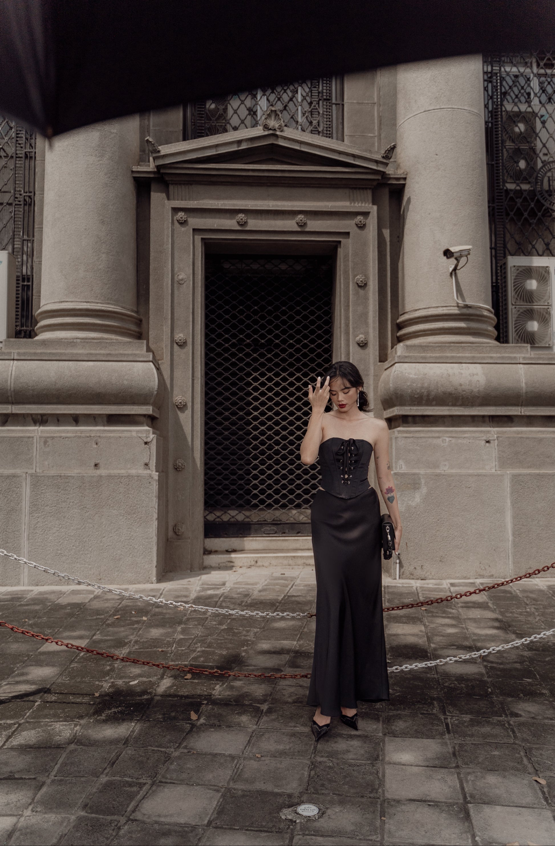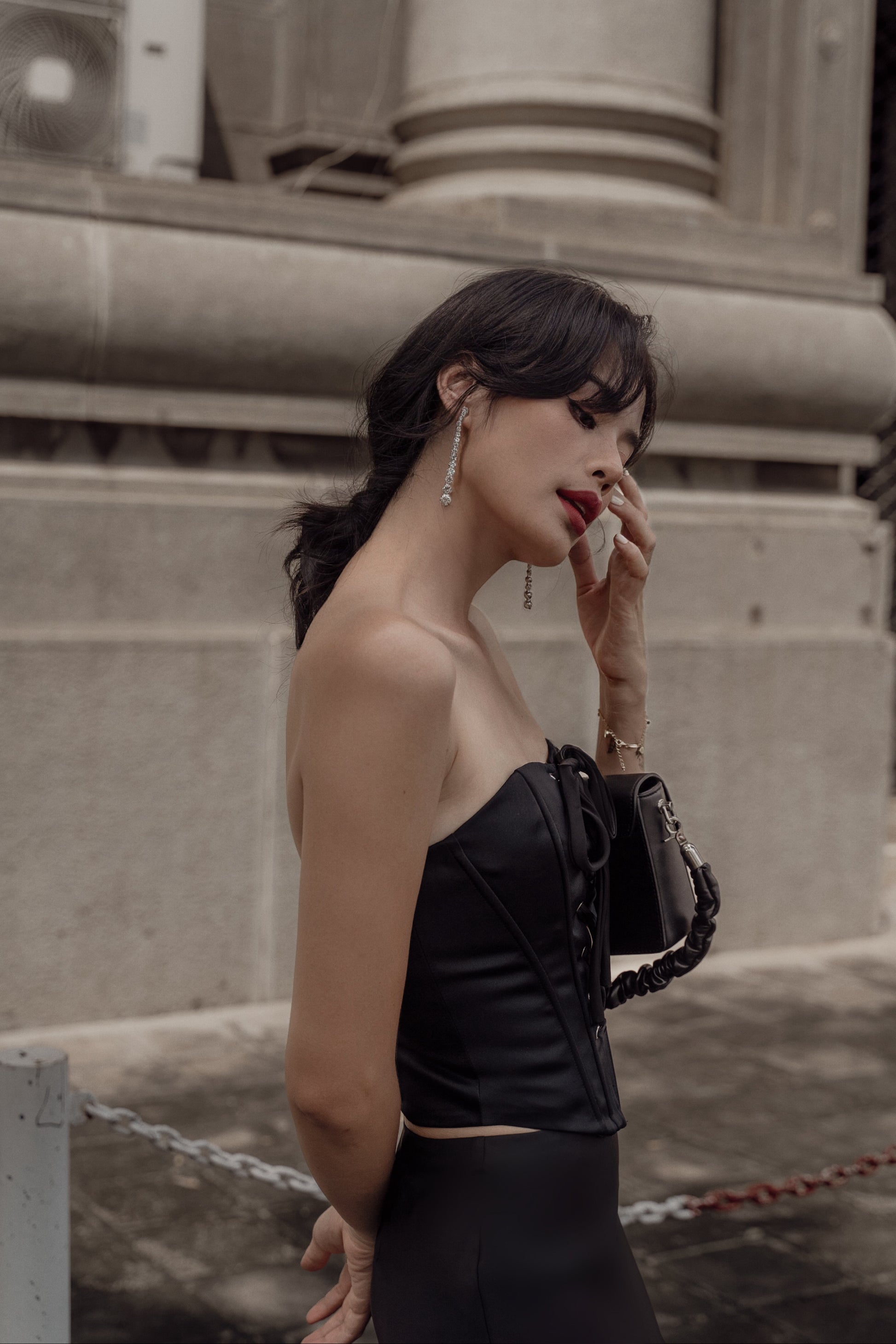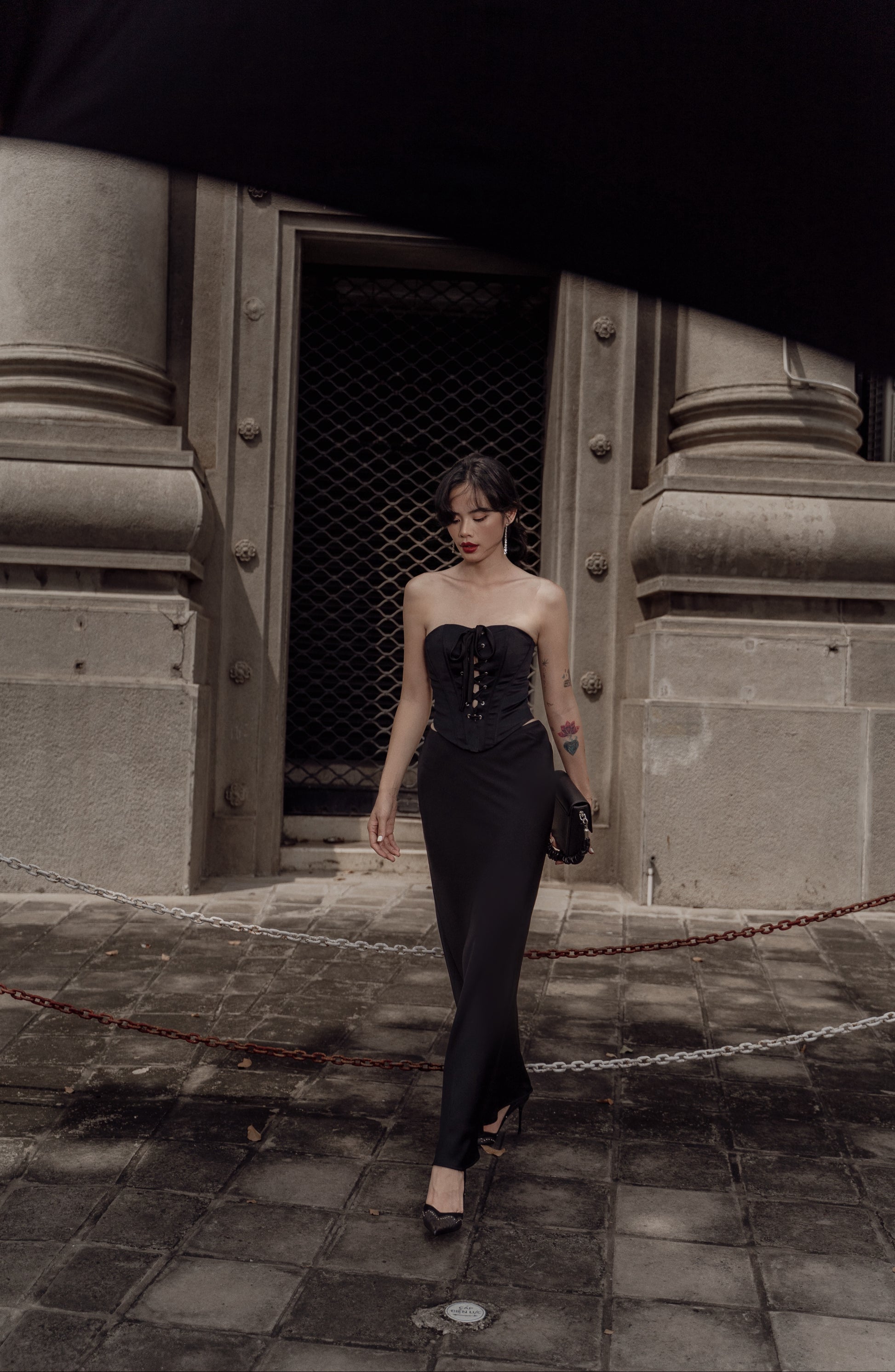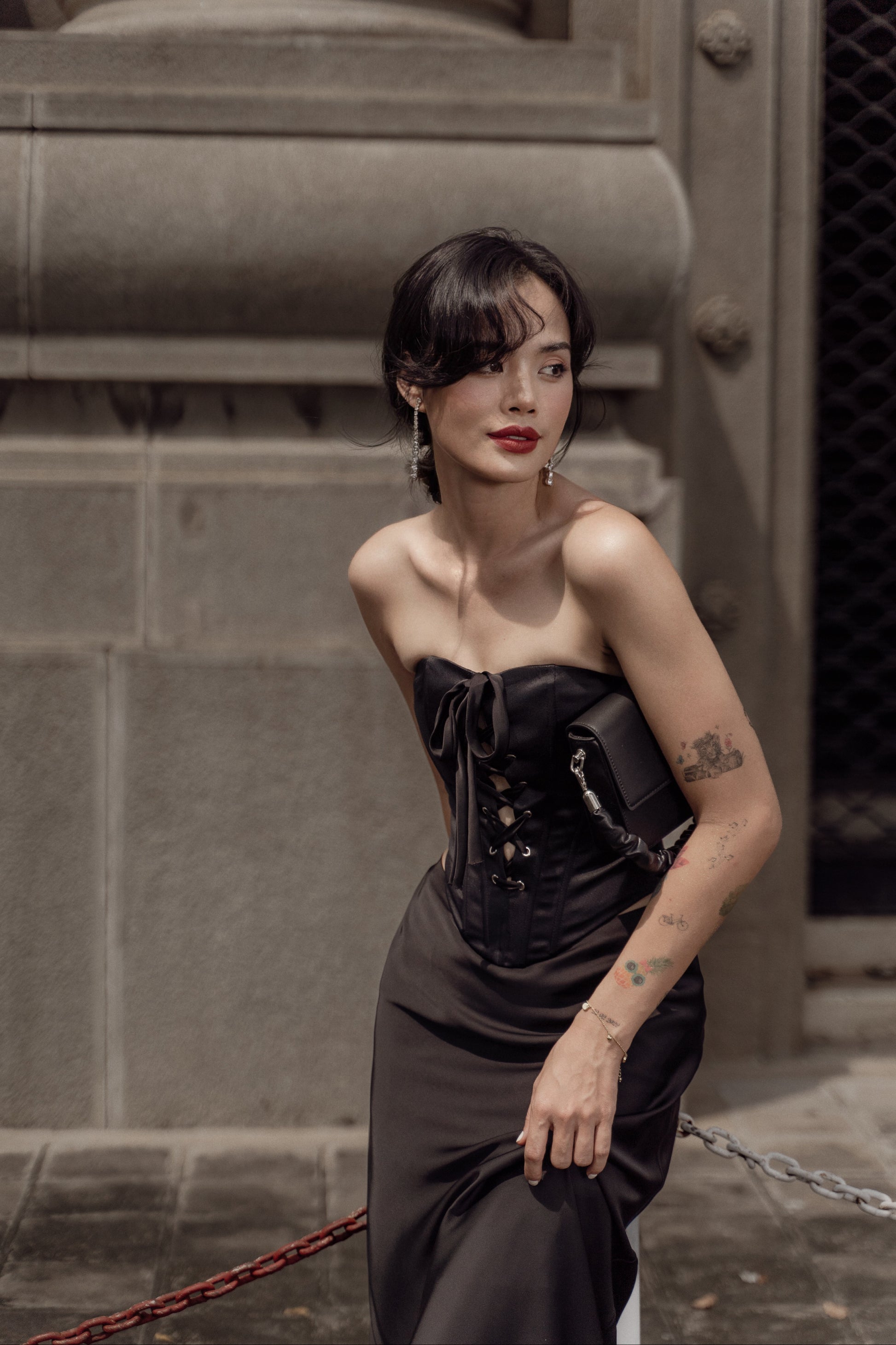 Quyến rũ, bí ẩn và sang trọng với gam màu đen, thiết kế Britney corset với chất liệu phi 2 da cứng cáp, đứng phom cùng các chi tiết xỏ khoen mắt cáo phá cách khiến người mặc trở nên vô cùng thu hút và nổi bật.