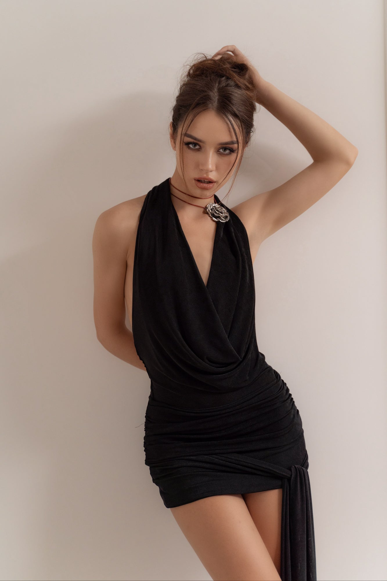 The sexy neckline design and body-hugging short skirt shape attract all eyes, completely highlighting every curve of the wearer. Stretchy material with delicate accents under the hem of the dress allows the wearer to be creative in how they wear it.