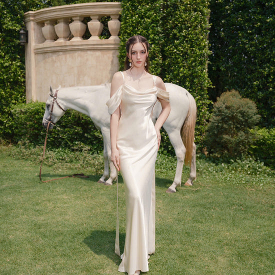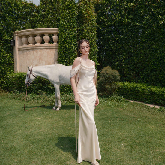The CELIA silk gown captivates every gaze with its delicate cowl neckline, graceful off-shoulder sleeves, and a backless silhouette that flows like a gentle stream. Artfully layered fabric creates a soft draping effect along the back — sensuous, poetic, and full of movement. The shoulder straps offer two styling options: tied straight for a gentle look, or crisscrossed for a bold statement — a versatile detail that makes every wear uniquely yours.
