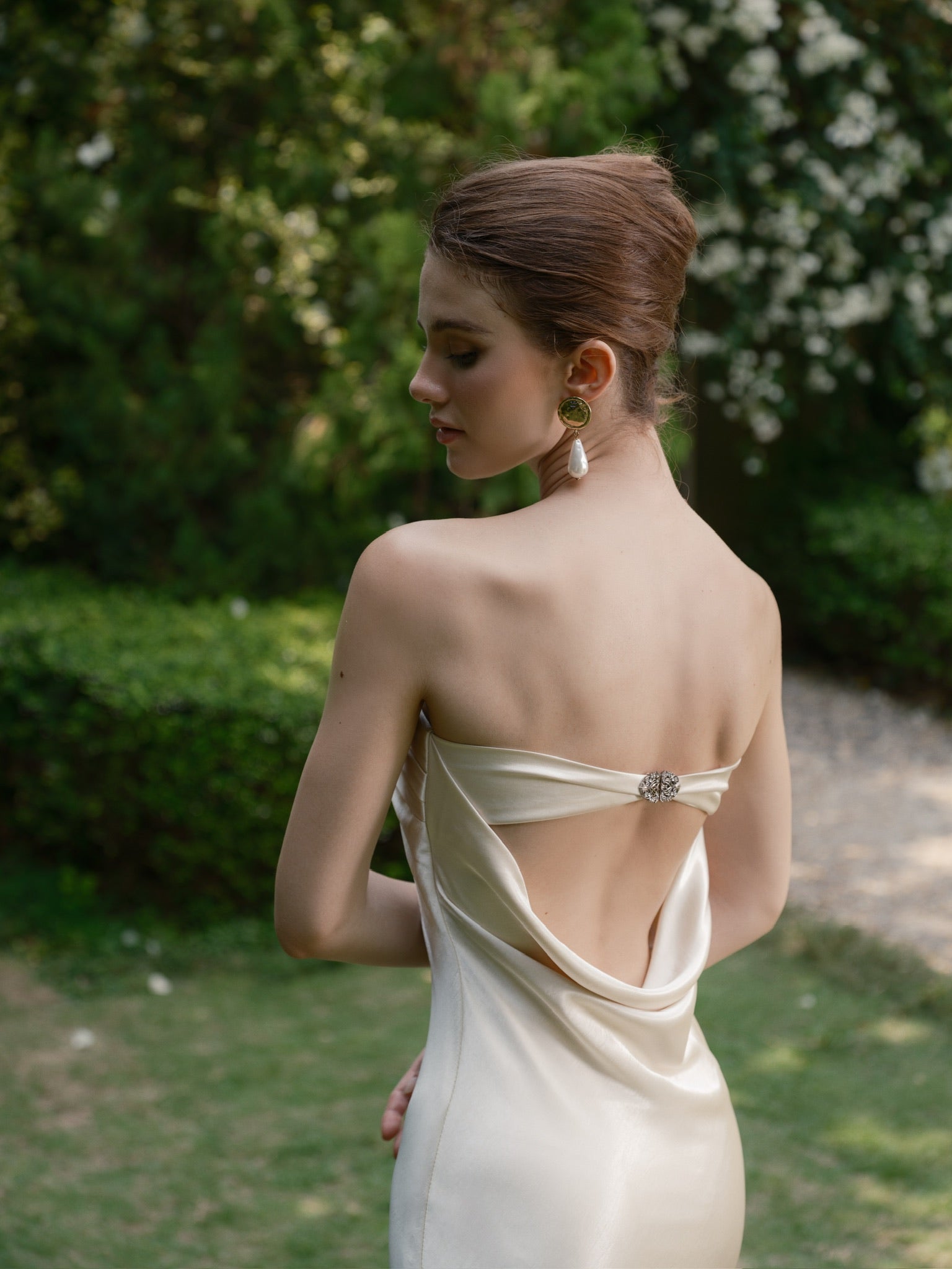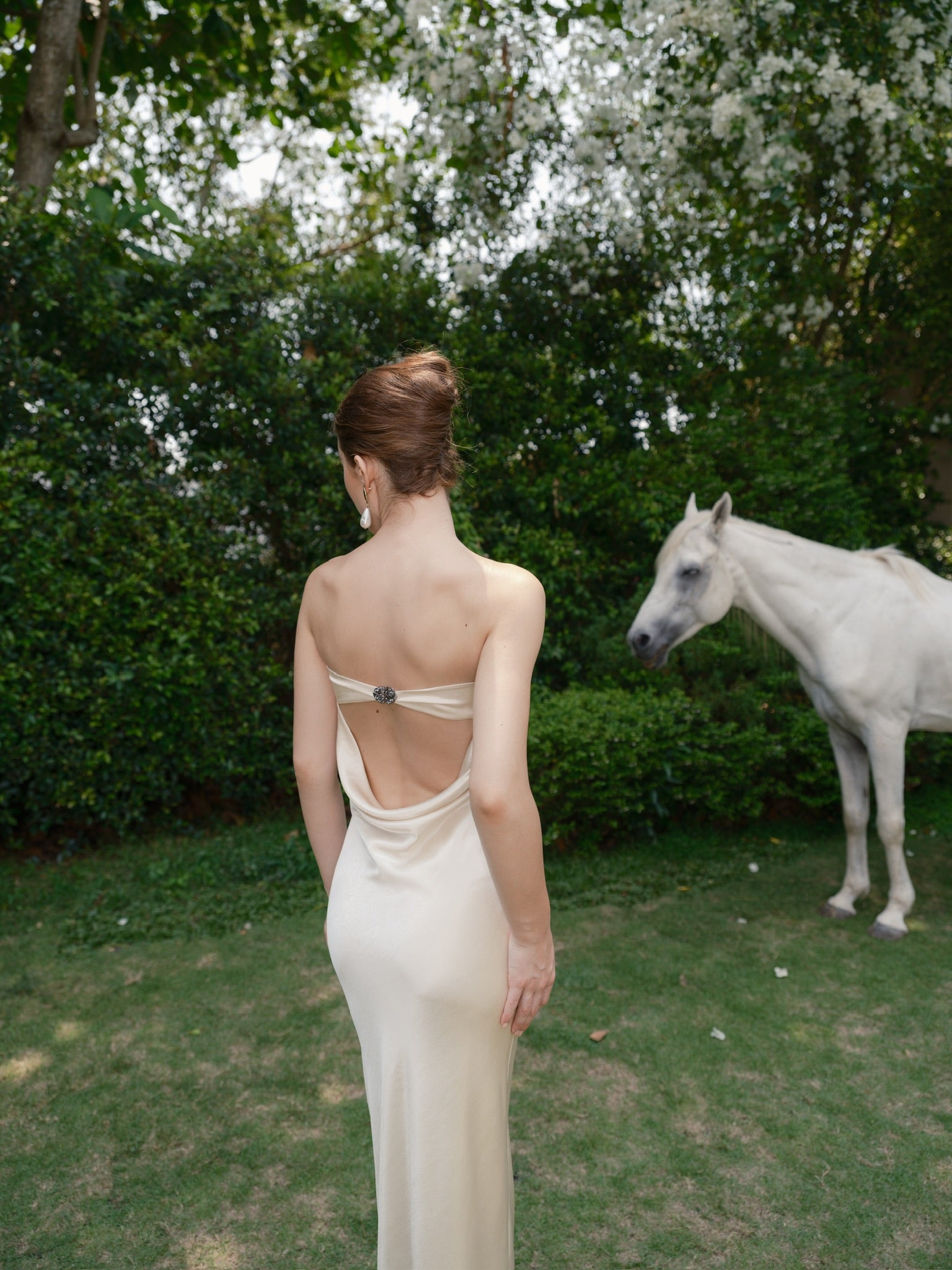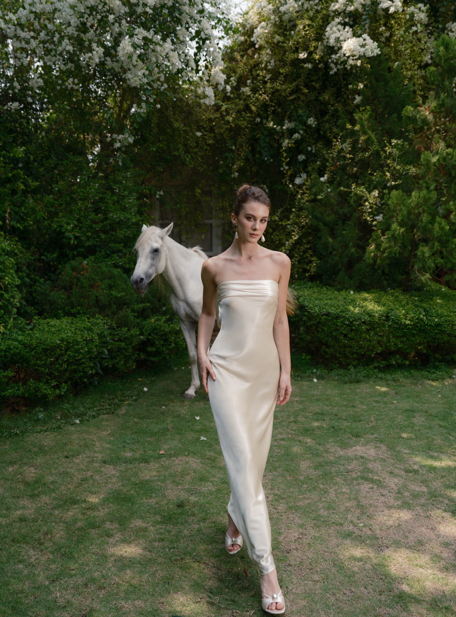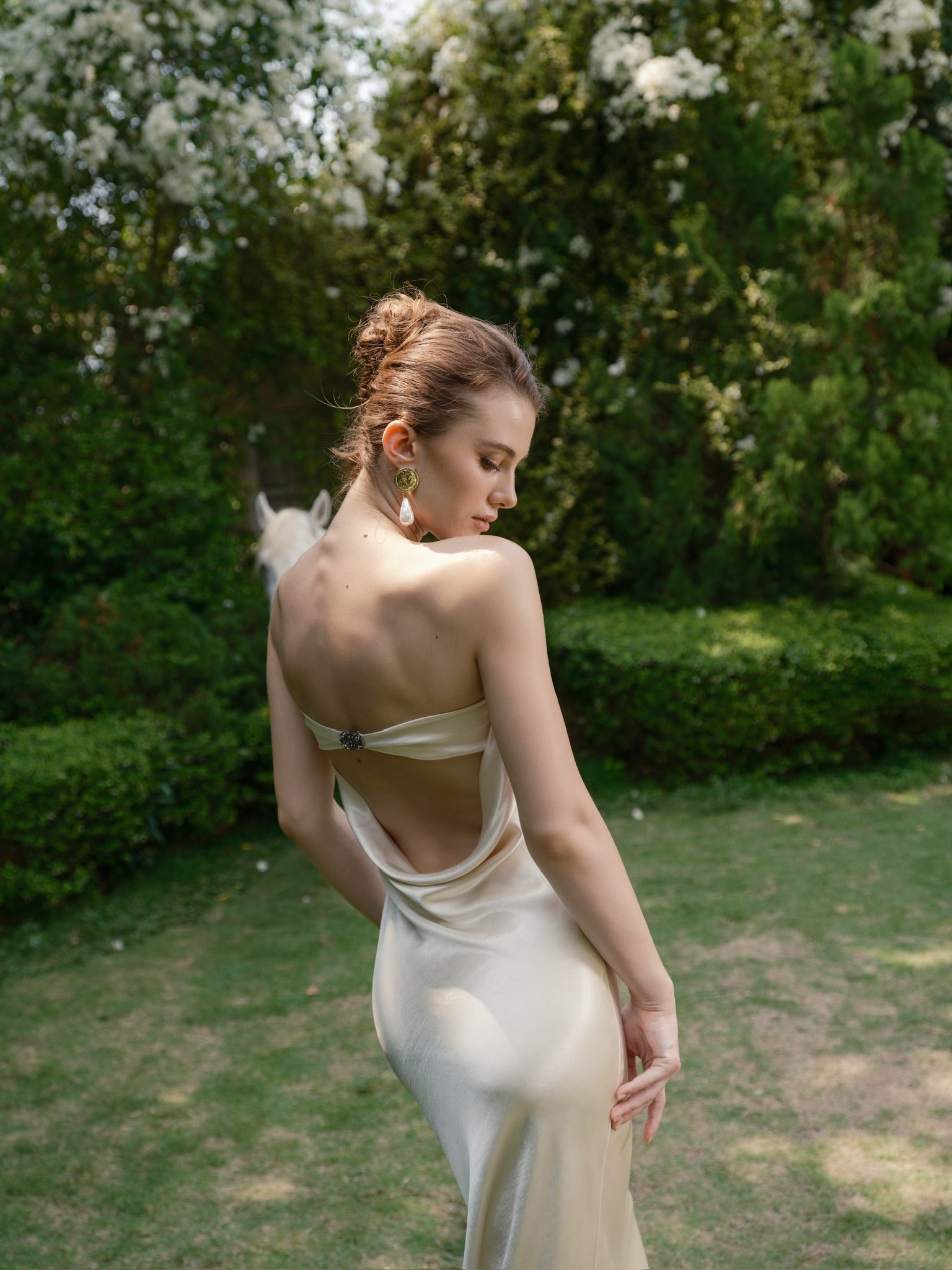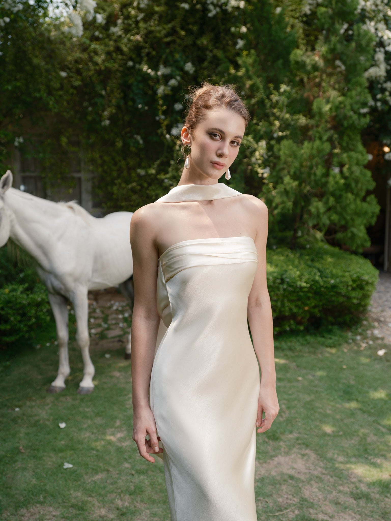 Like moonlight reflected on still water, CELINE is crafted from our new Premium Pearl Charmeuse Silk, offering a lustrous pearlescent sheen and a dreamlike softness to the touch. The strapless silhouette gently embraces the body, featuring a sensuous open back and a long matching silk scarf — allowing you to style it your way: wrapped around the neck, tied into a bow, or left to flow freely.