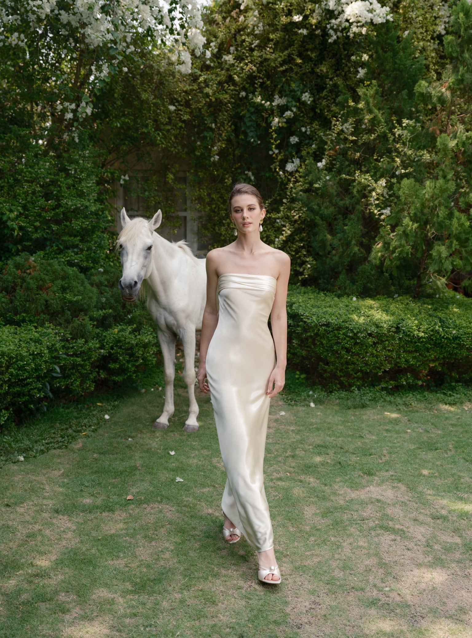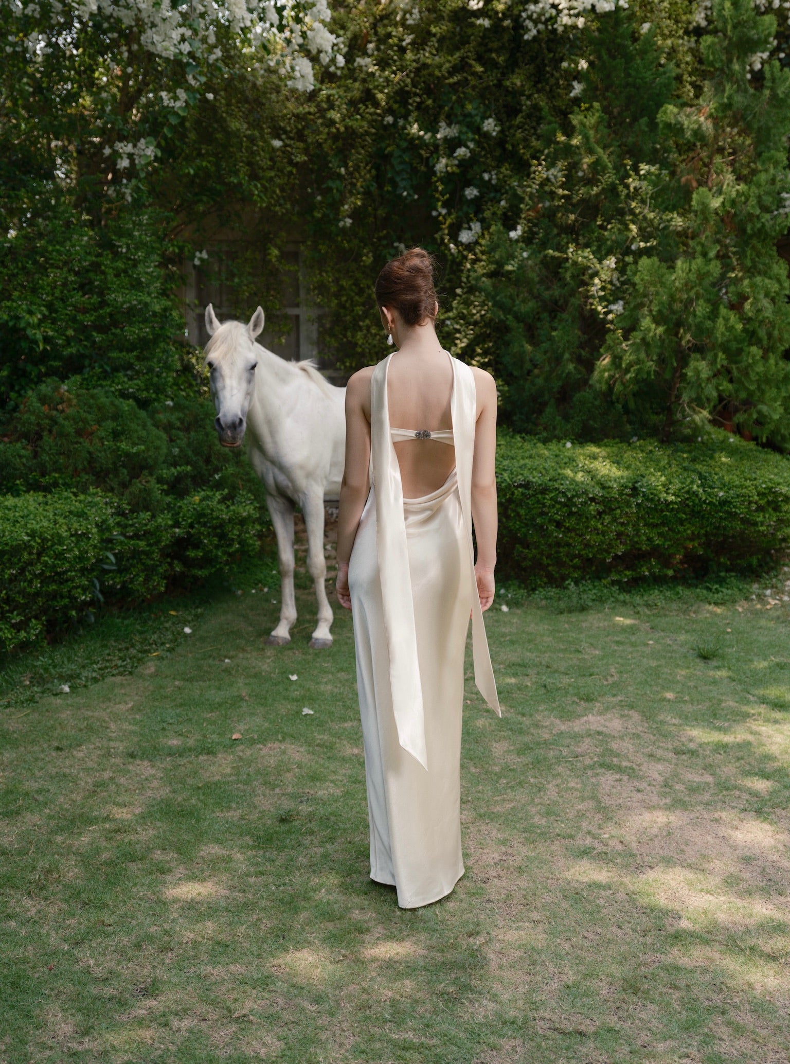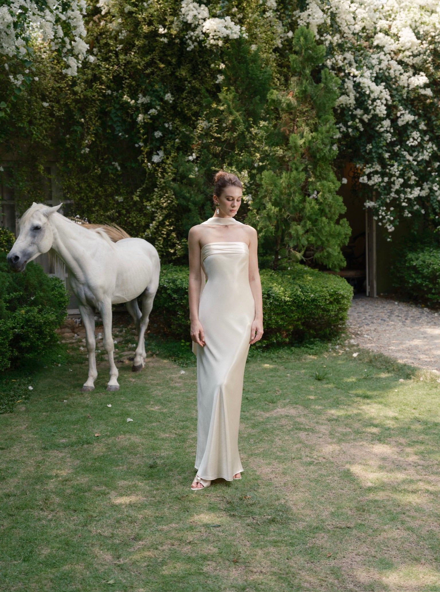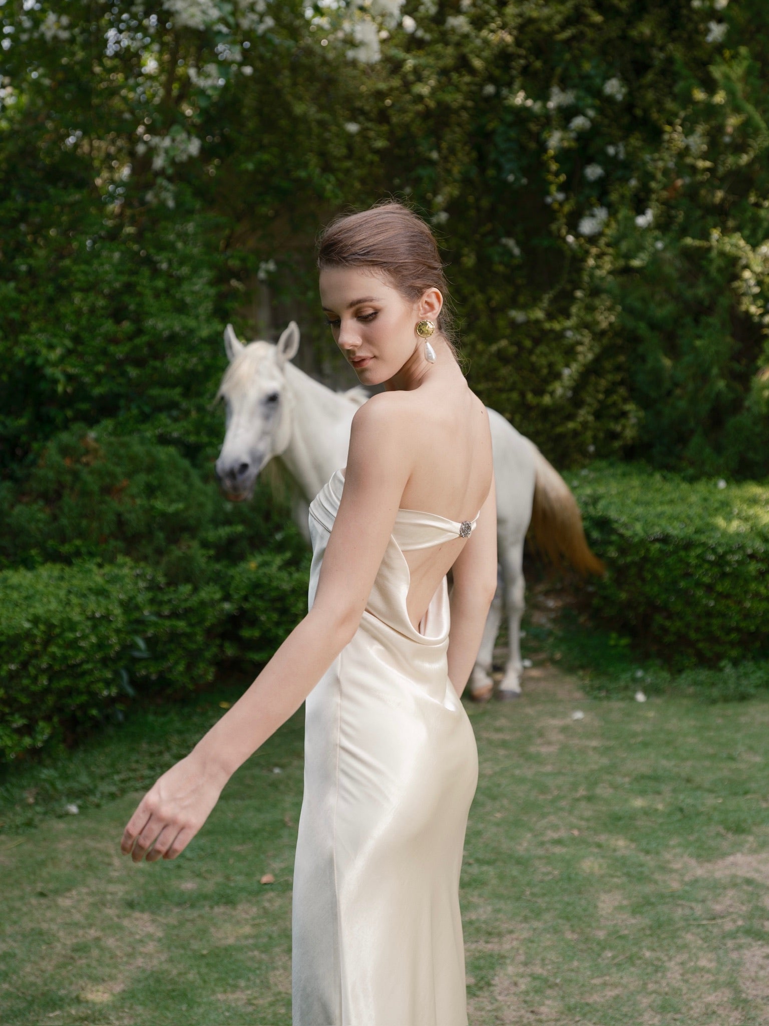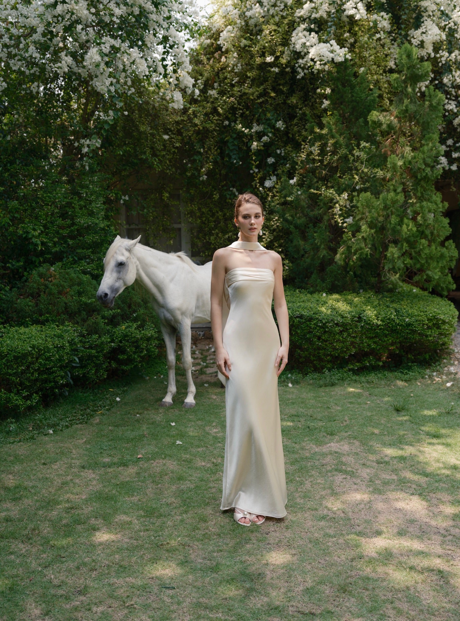 Like moonlight reflected on still water, CELINE is crafted from our new Premium Pearl Charmeuse Silk, offering a lustrous pearlescent sheen and a dreamlike softness to the touch. The strapless silhouette gently embraces the body, featuring a sensuous open back and a long matching silk scarf — allowing you to style it your way: wrapped around the neck, tied into a bow, or left to flow freely.