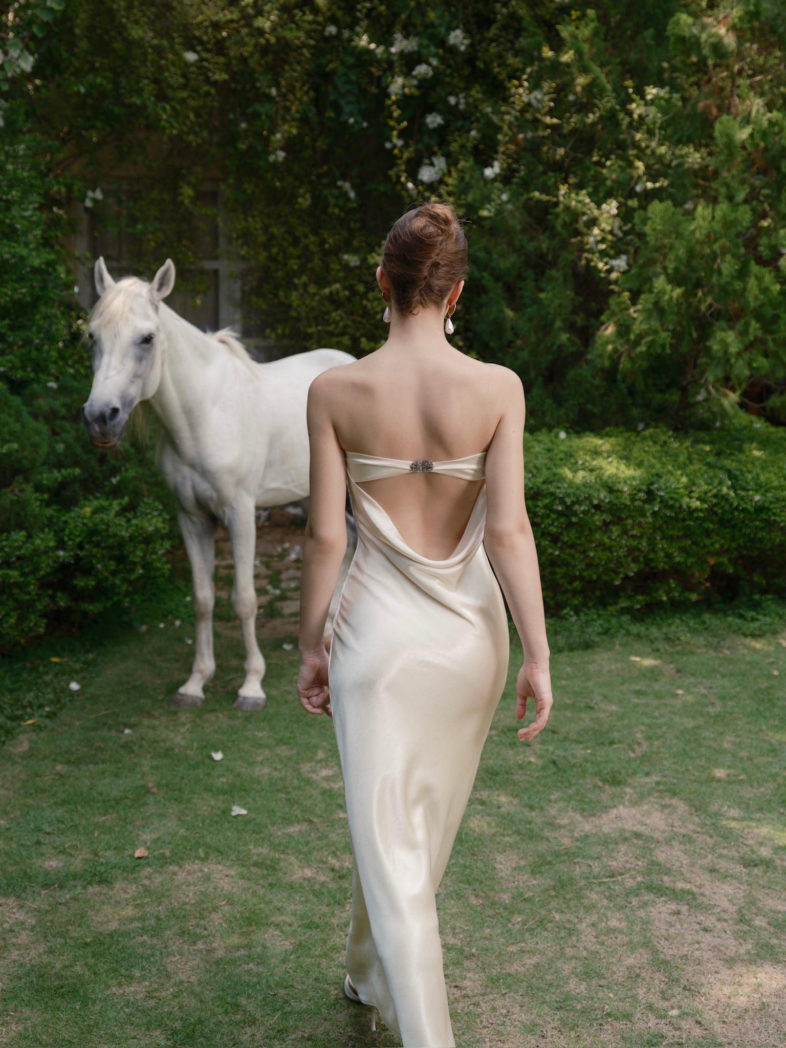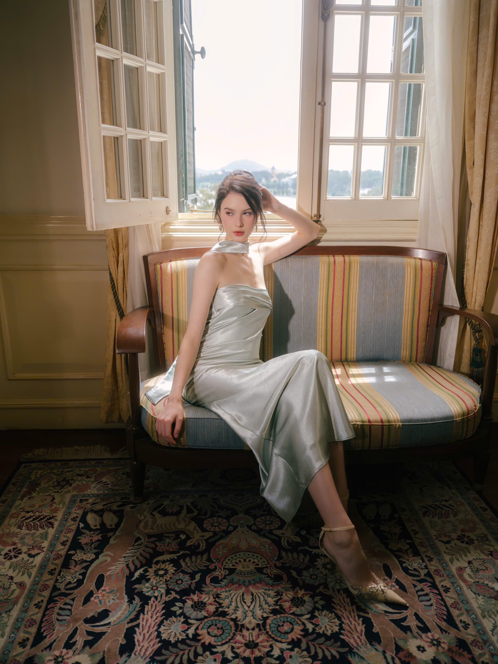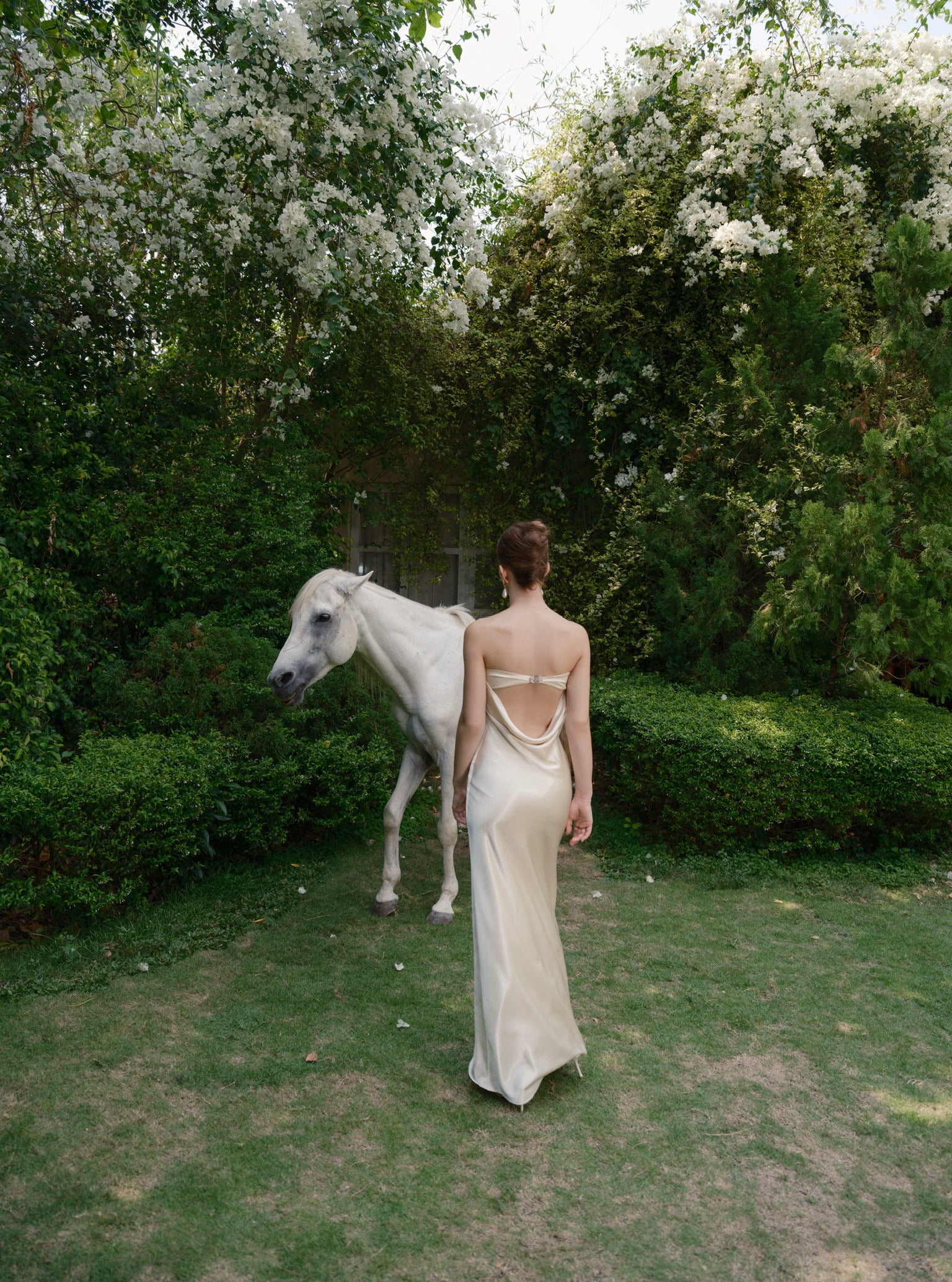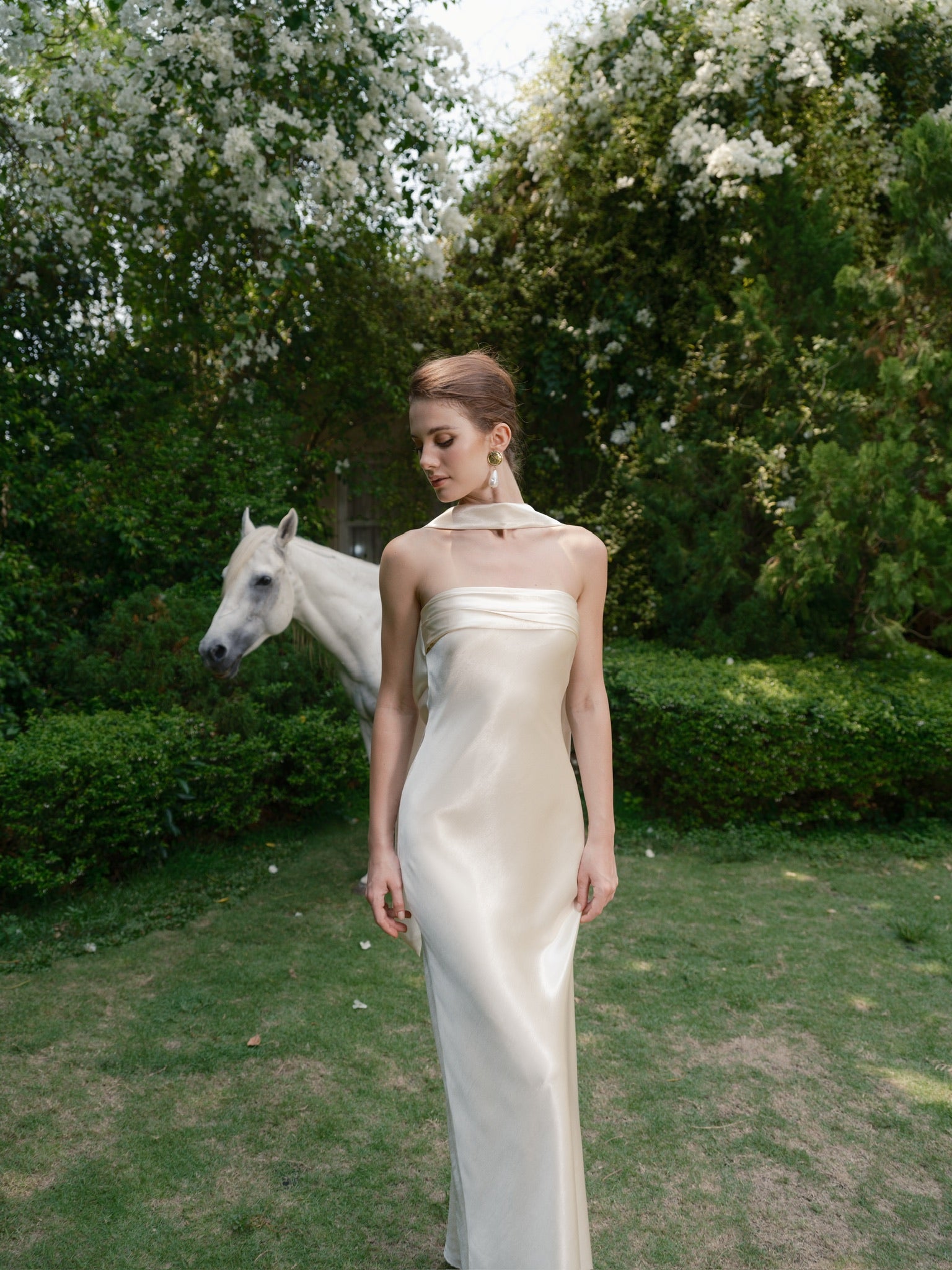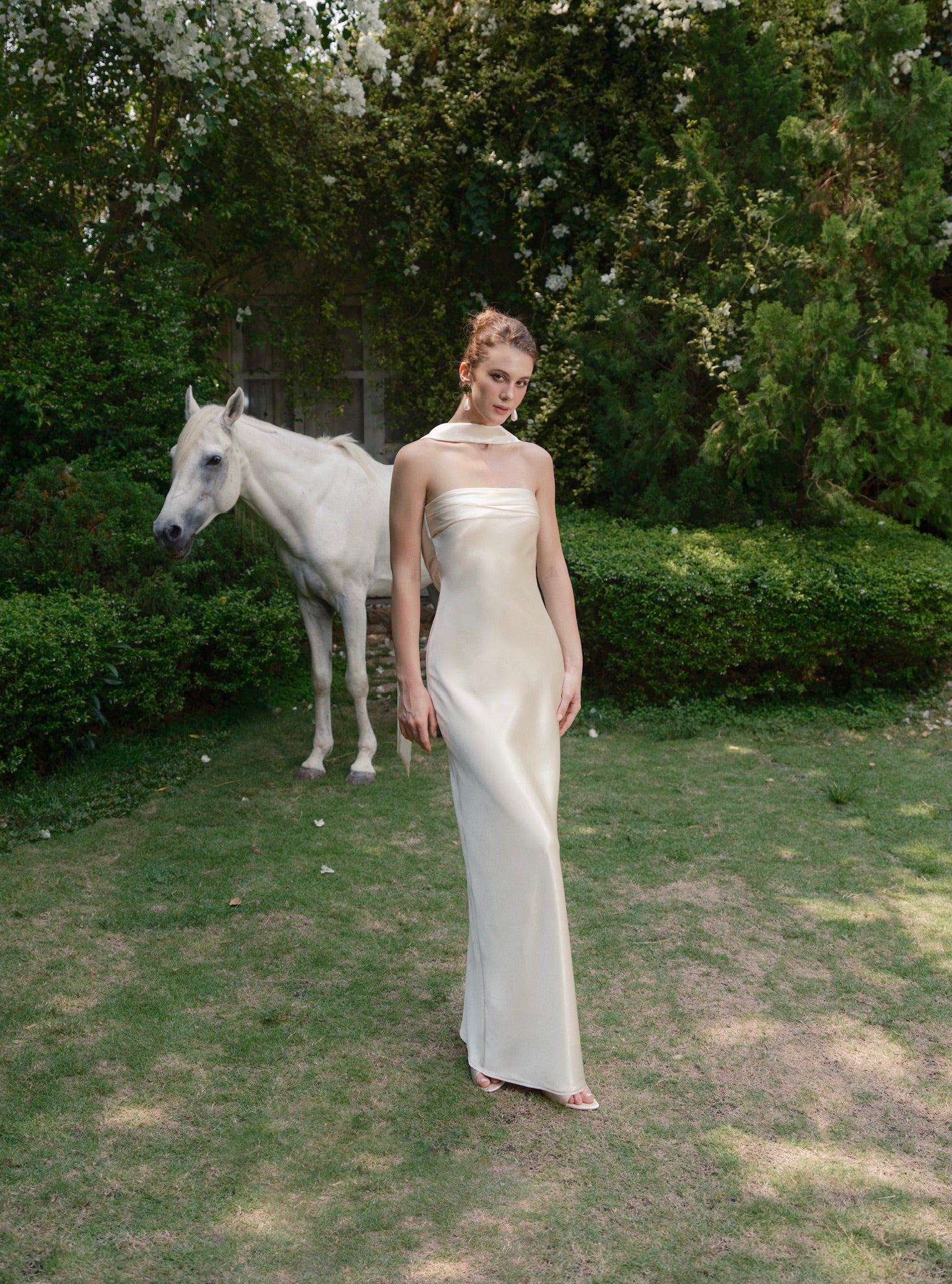 Like moonlight reflected on still water, CELINE is crafted from our new Premium Pearl Charmeuse Silk, offering a lustrous pearlescent sheen and a dreamlike softness to the touch. The strapless silhouette gently embraces the body, featuring a sensuous open back and a long matching silk scarf — allowing you to style it your way: wrapped around the neck, tied into a bow, or left to flow freely.