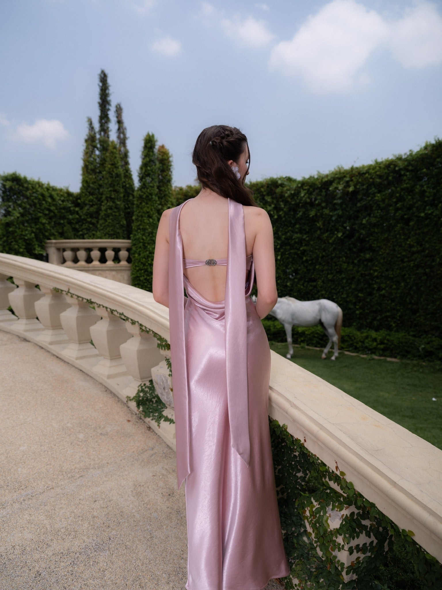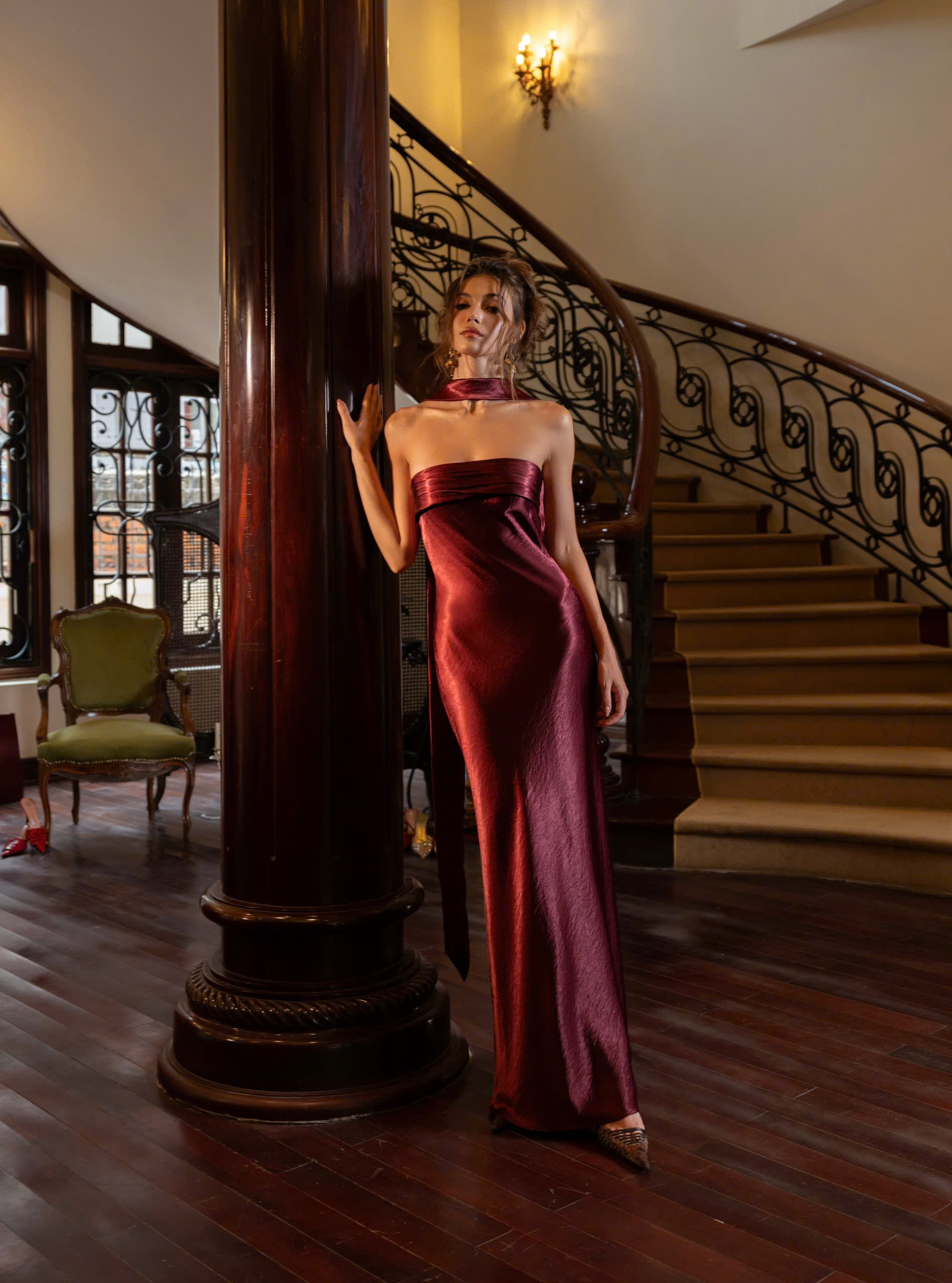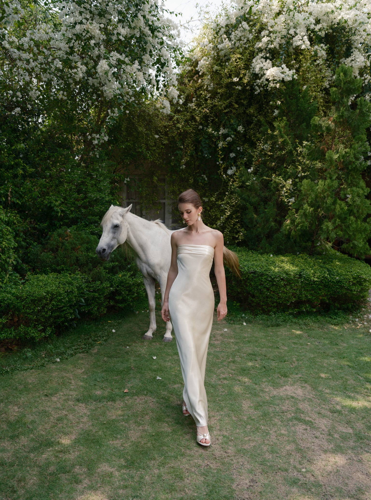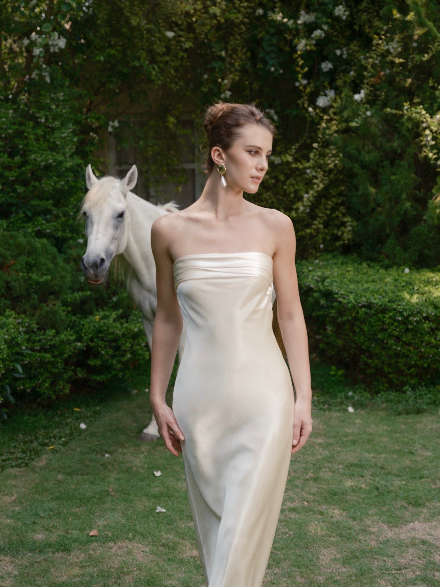 Like moonlight reflected on still water, CELINE is crafted from our new Premium Pearl Charmeuse Silk, offering a lustrous pearlescent sheen and a dreamlike softness to the touch. The strapless silhouette gently embraces the body, featuring a sensuous open back and a long matching silk scarf — allowing you to style it your way: wrapped around the neck, tied into a bow, or left to flow freely.