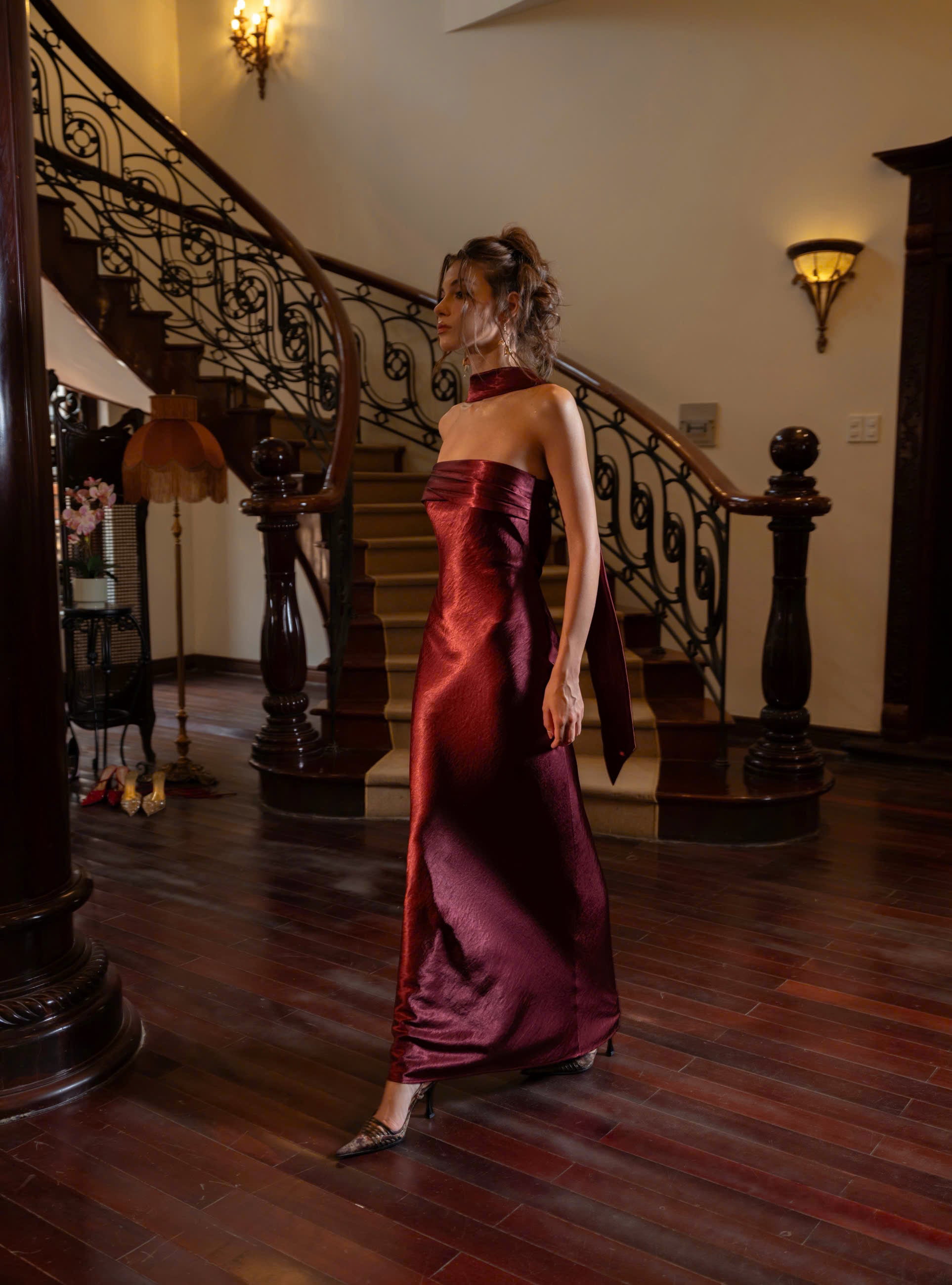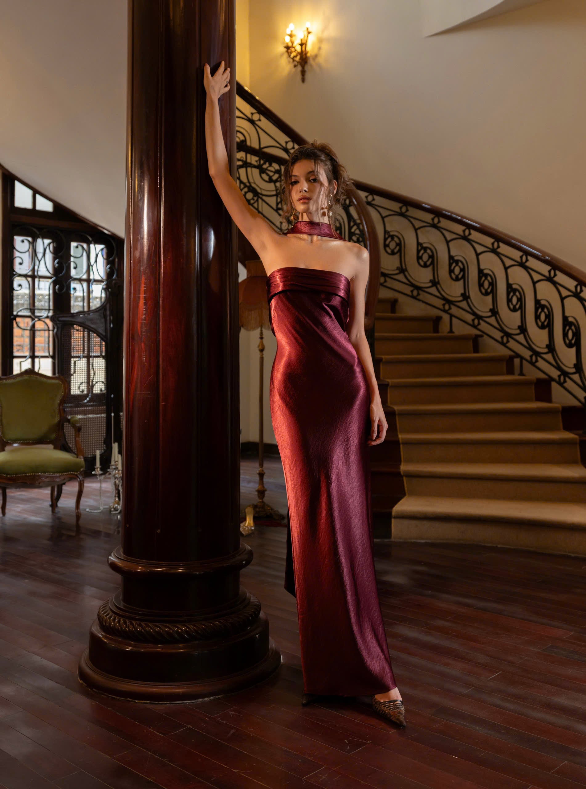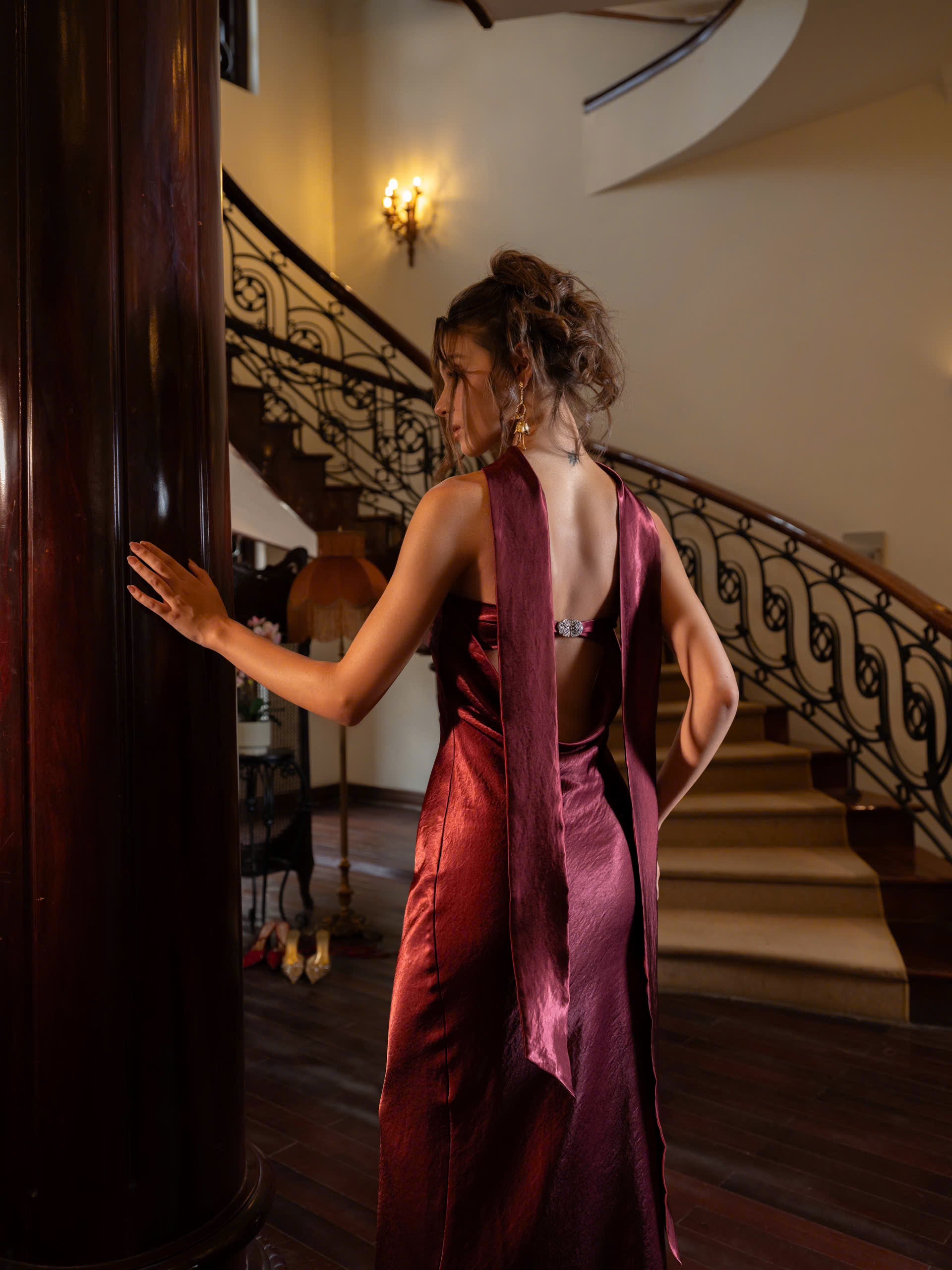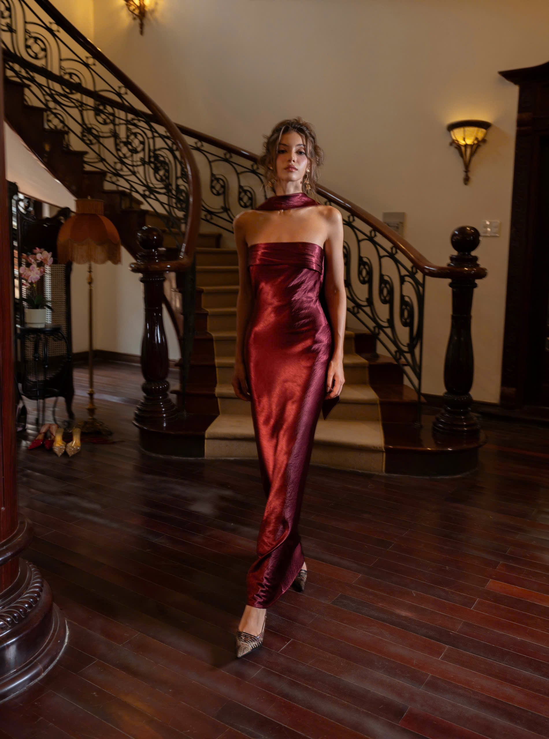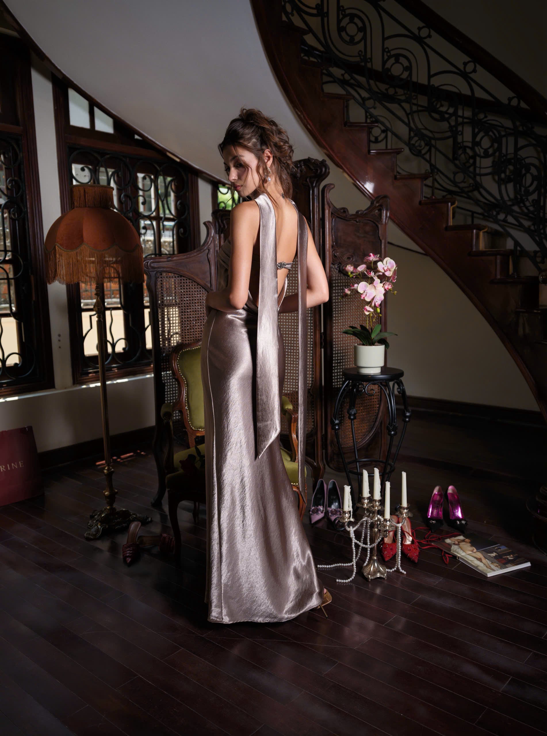 Like moonlight reflected on still water, CELINE is crafted from our new Premium Pearl Charmeuse Silk, offering a lustrous pearlescent sheen and a dreamlike softness to the touch. The strapless silhouette gently embraces the body, featuring a sensuous open back and a long matching silk scarf — allowing you to style it your way: wrapped around the neck, tied into a bow, or left to flow freely.