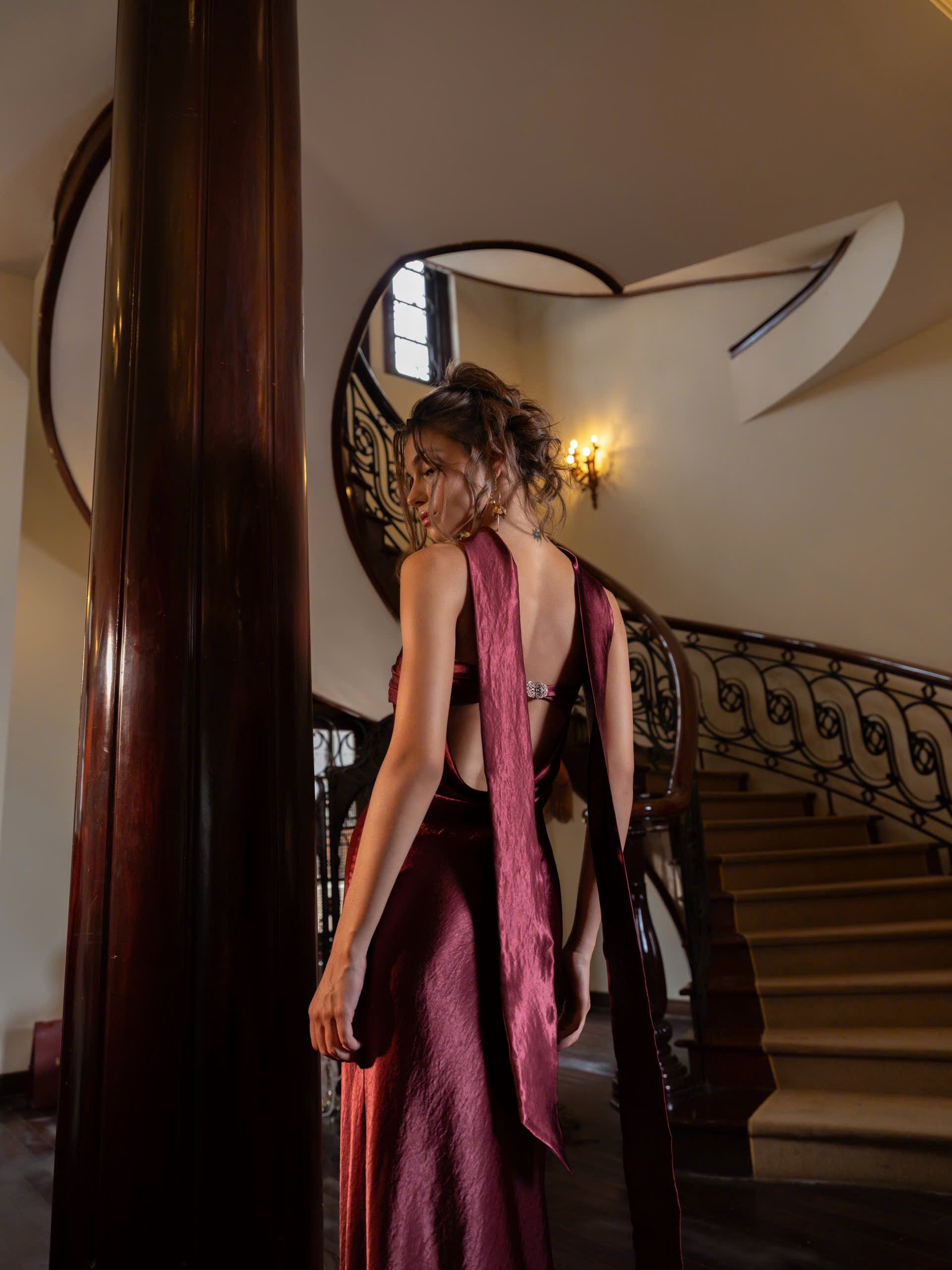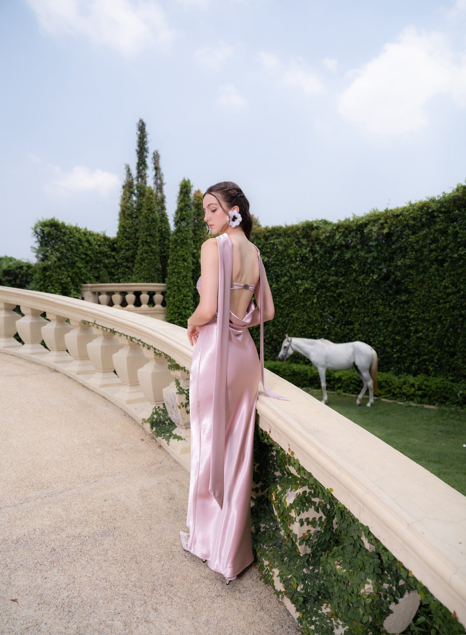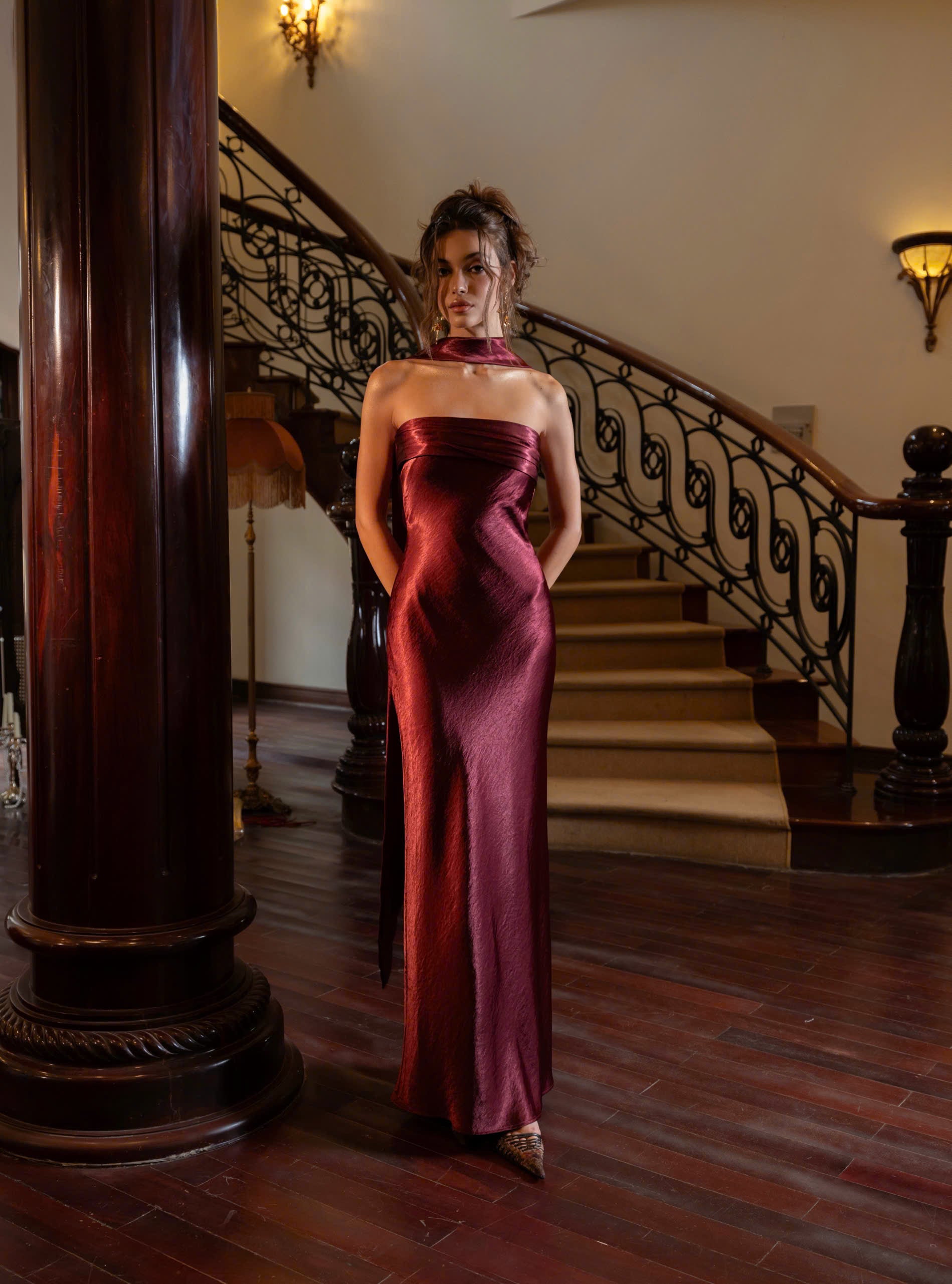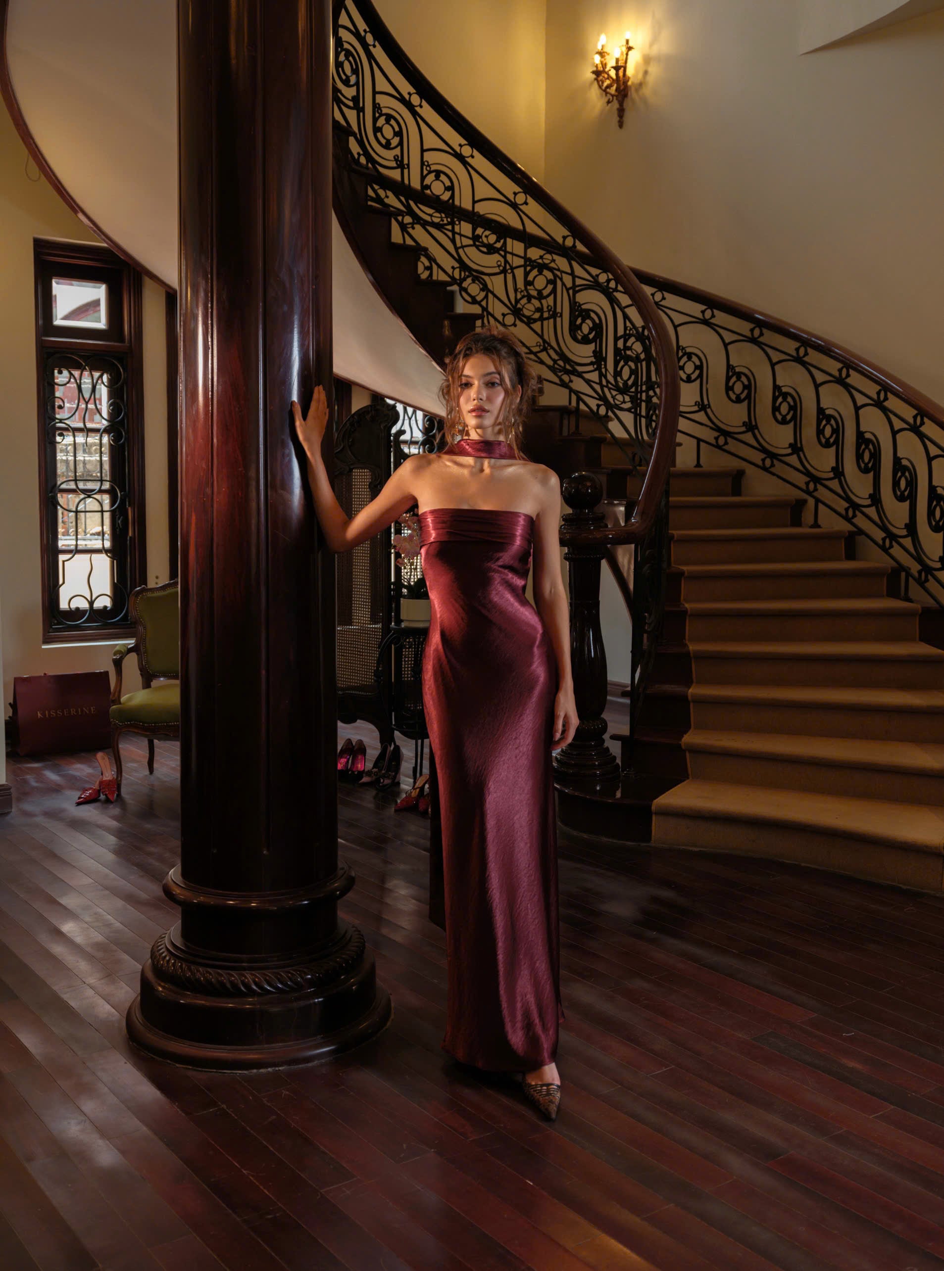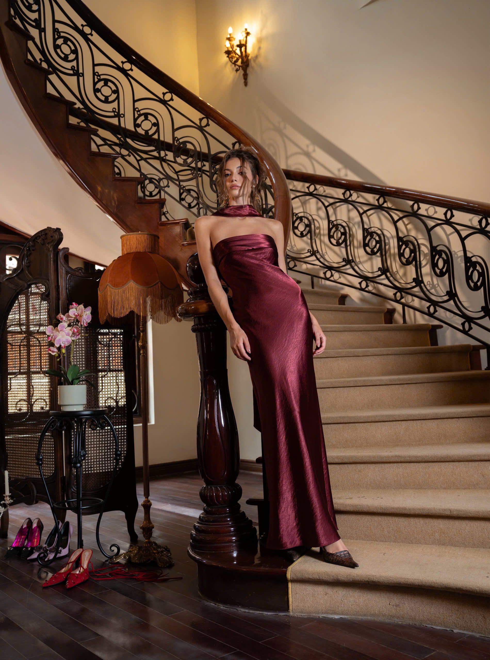 Like moonlight reflected on still water, CELINE is crafted from our new Premium Pearl Charmeuse Silk, offering a lustrous pearlescent sheen and a dreamlike softness to the touch. The strapless silhouette gently embraces the body, featuring a sensuous open back and a long matching silk scarf — allowing you to style it your way: wrapped around the neck, tied into a bow, or left to flow freely.