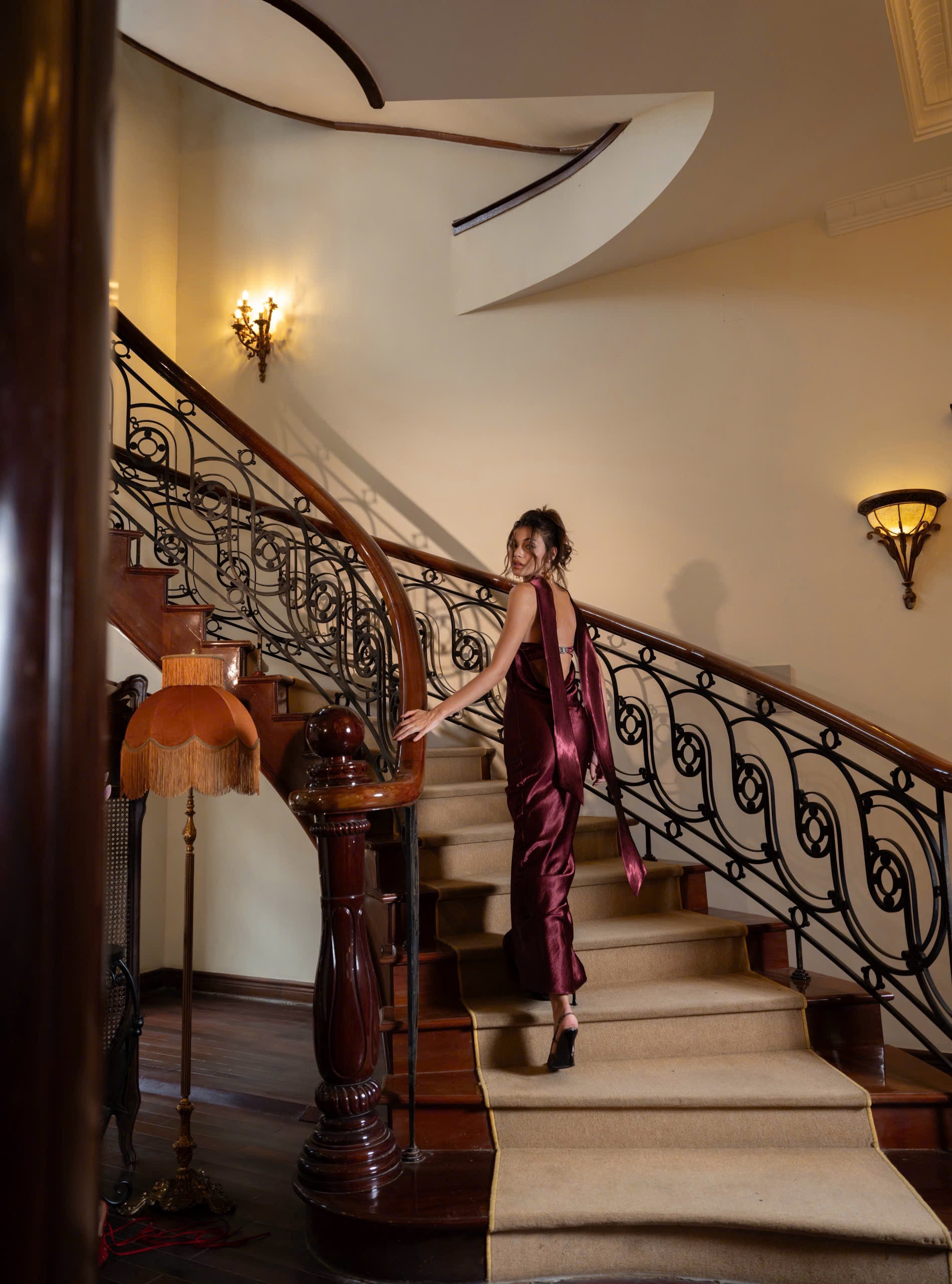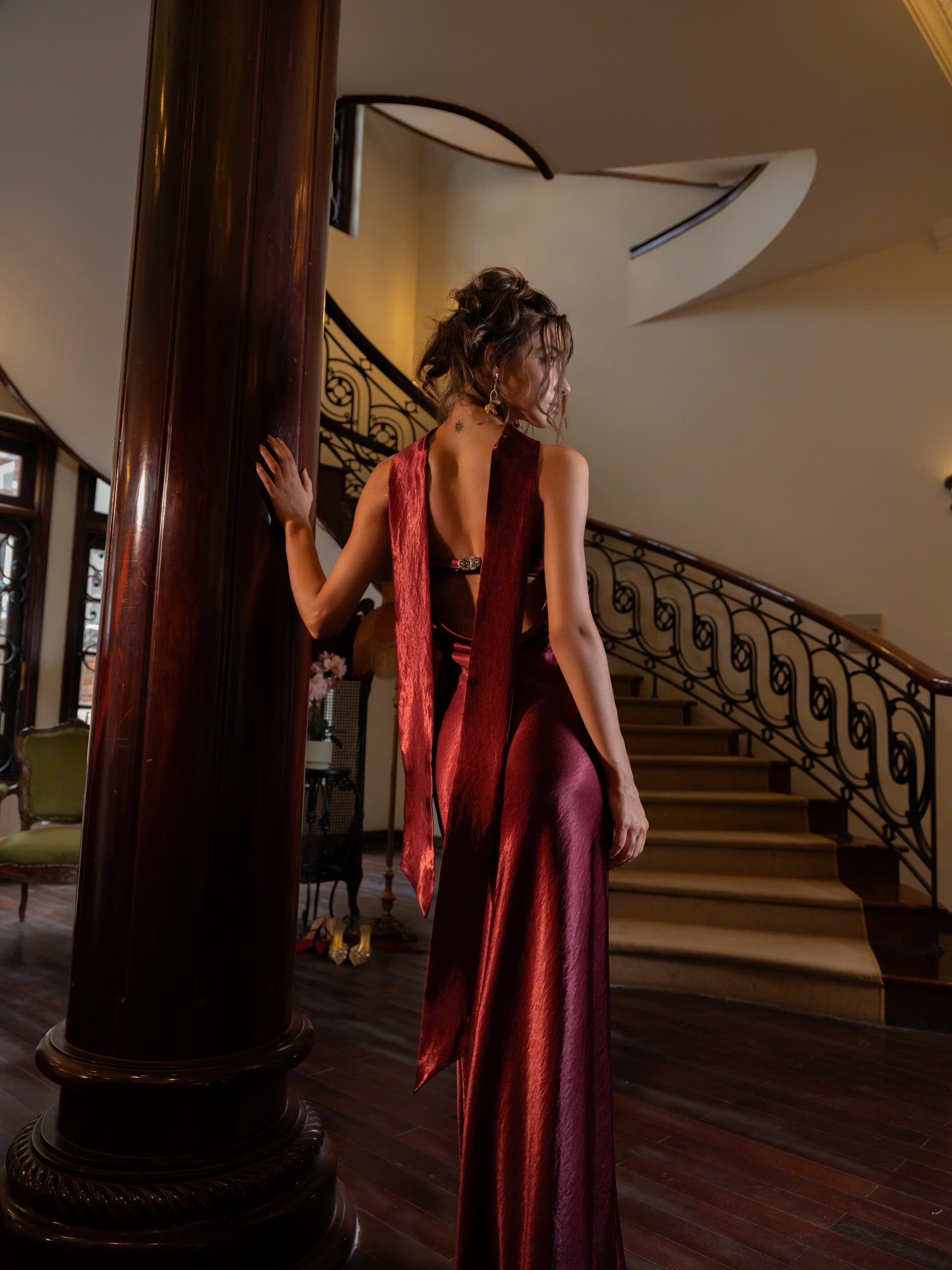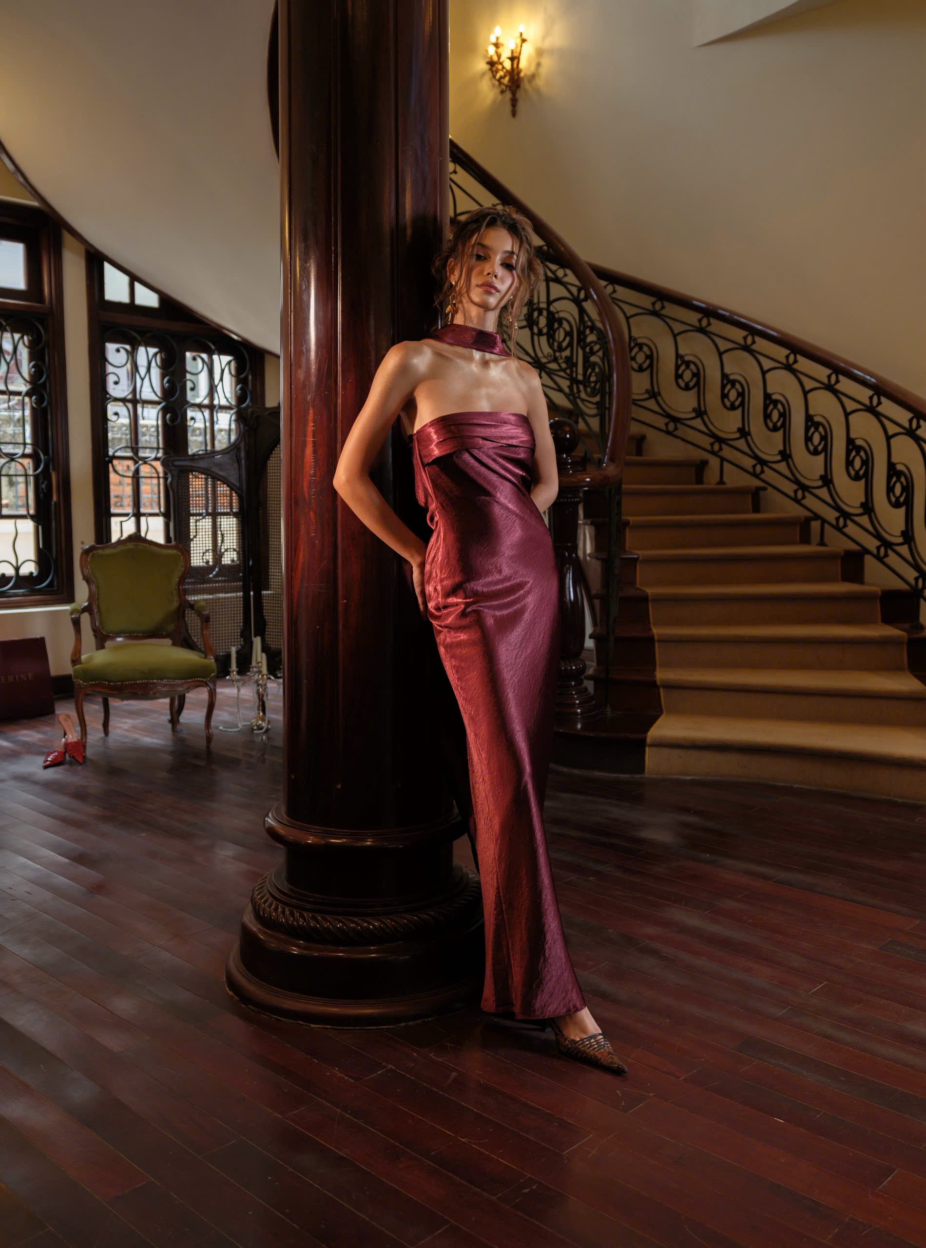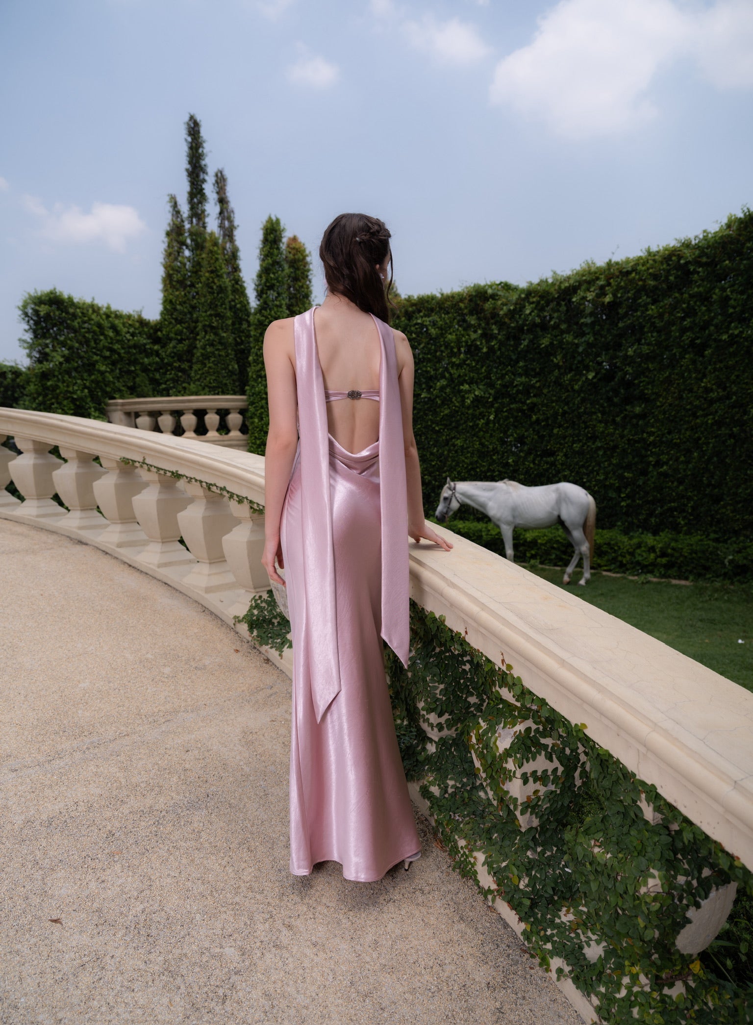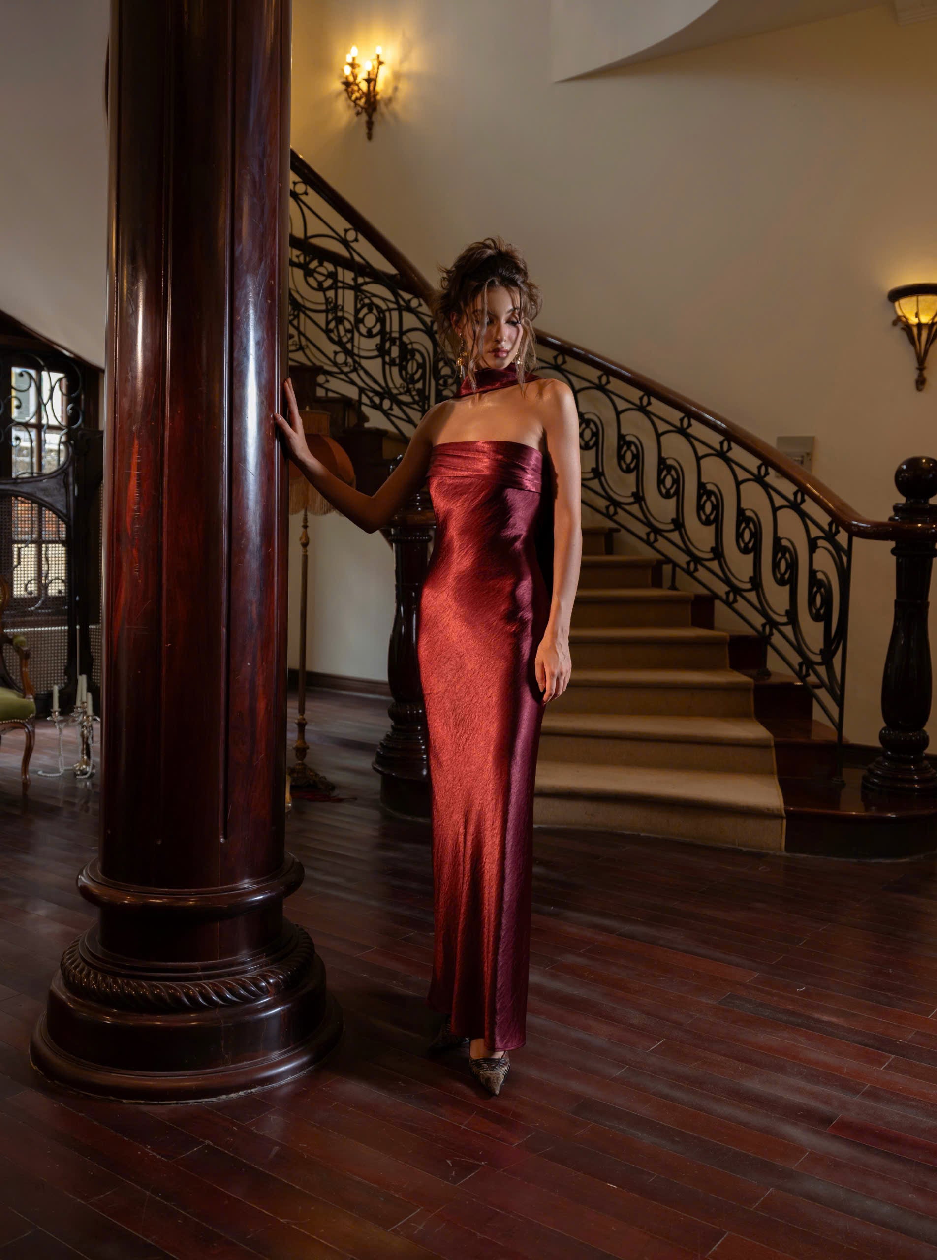Like moonlight reflected on still water, CELINE is crafted from our new Premium Pearl Charmeuse Silk, offering a lustrous pearlescent sheen and a dreamlike softness to the touch. The strapless silhouette gently embraces the body, featuring a sensuous open back and a long matching silk scarf — allowing you to style it your way: wrapped around the neck, tied into a bow, or left to flow freely.