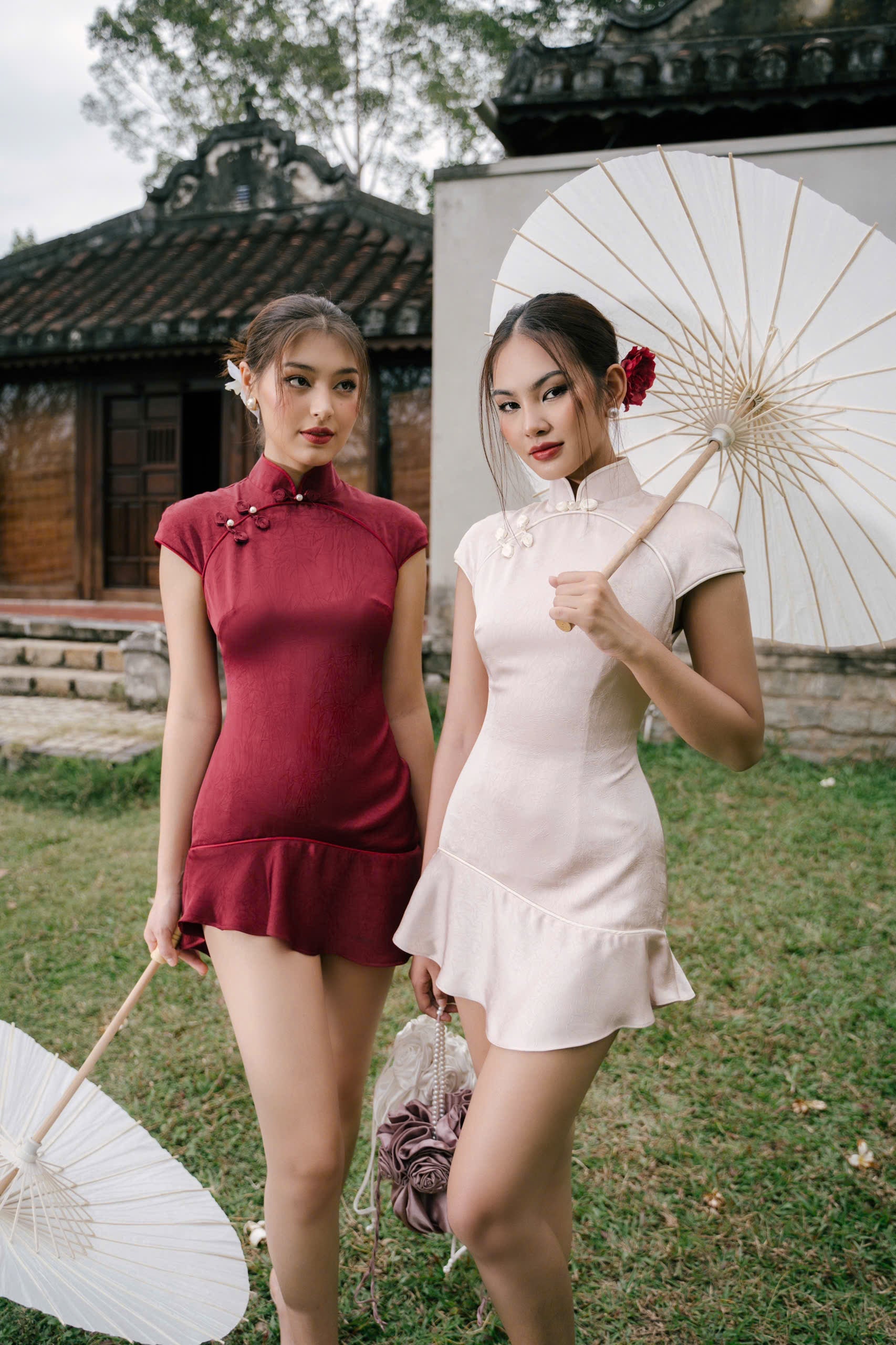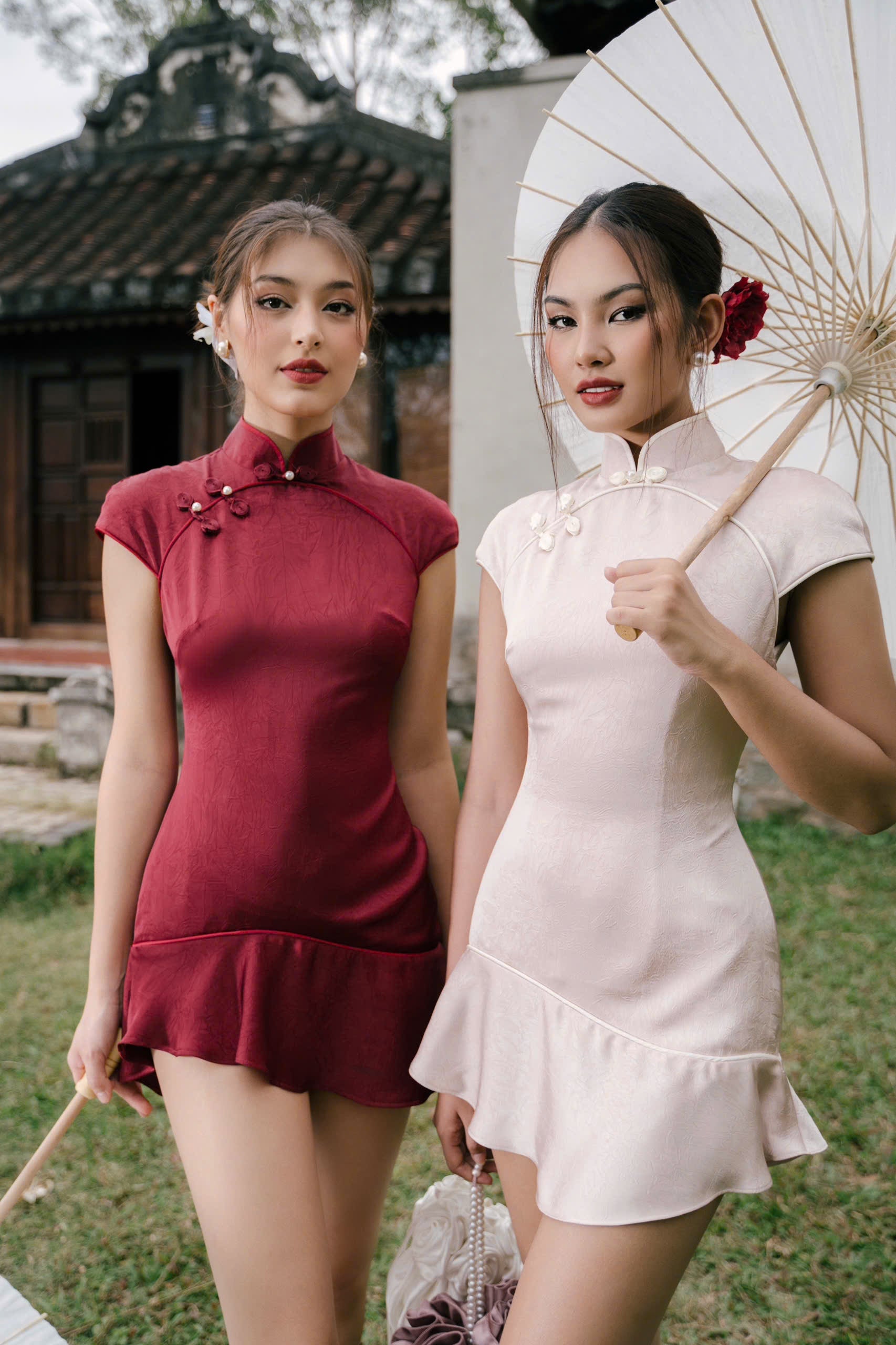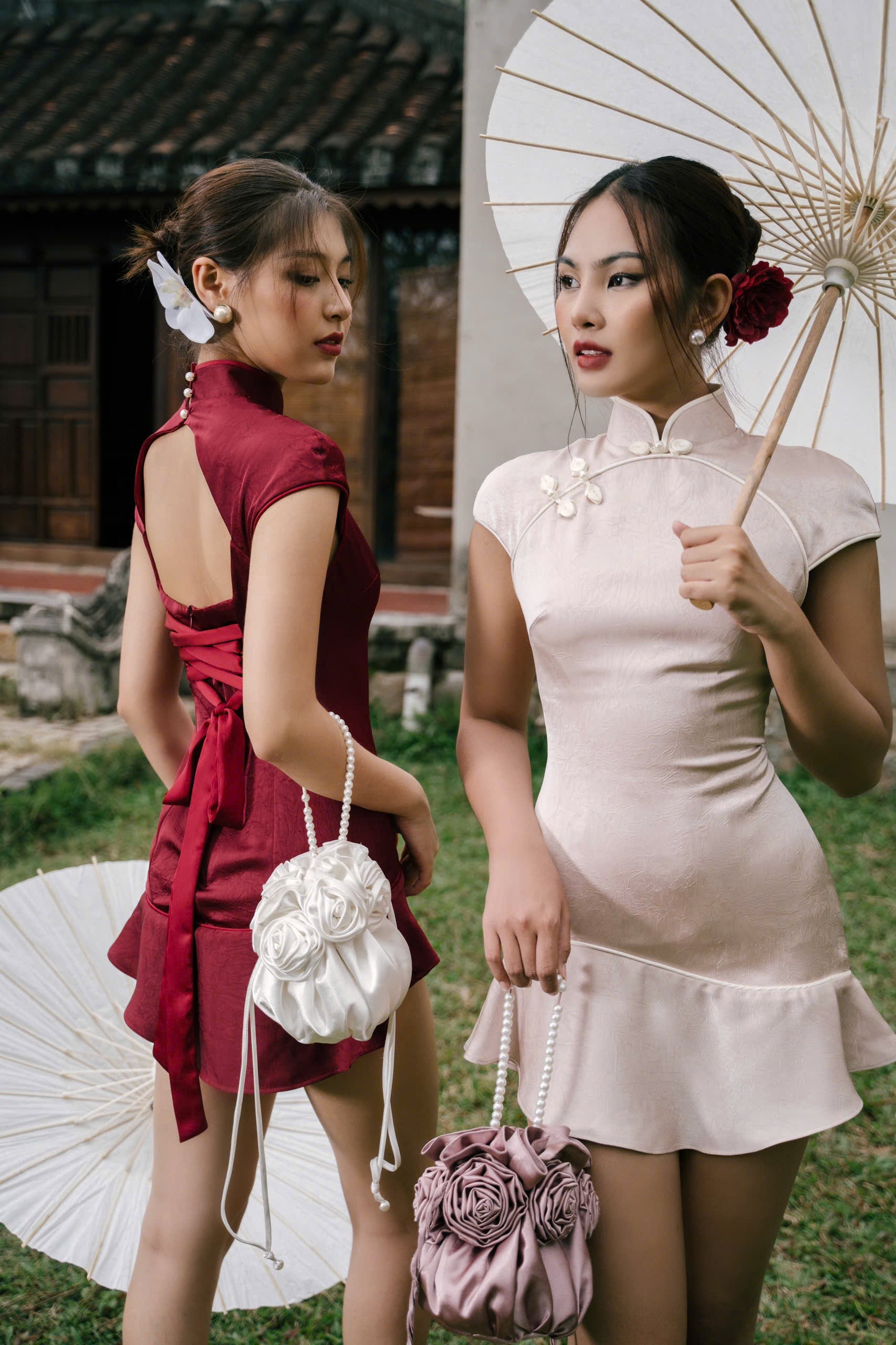 Regarding colors, Châu Anh comes in two versions: ruby red for a captivating look and pastel pink for a sweet, romantic touch.