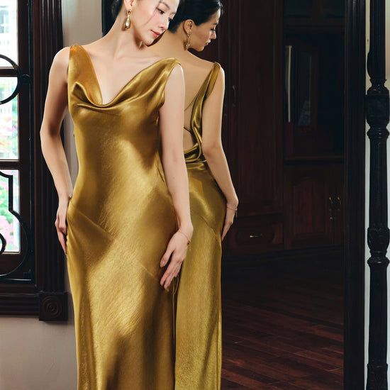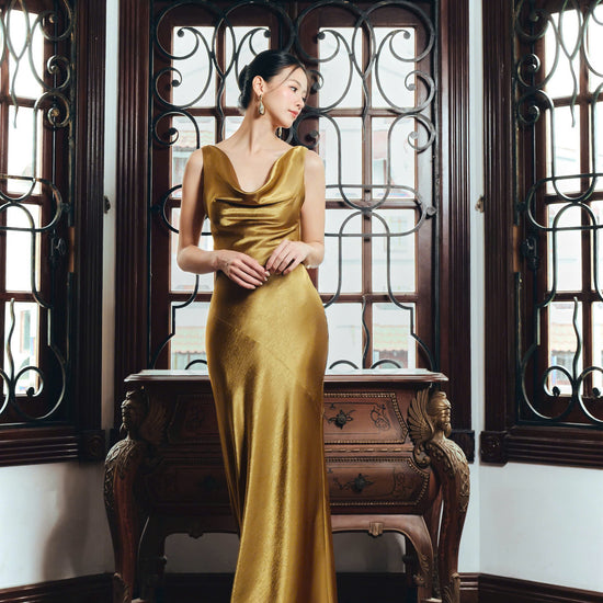 This long silk silhouette features a softly draped neckline that highlights the delicate collarbones, paired with a refined cross tied open back for an elegant yet captivating finish.