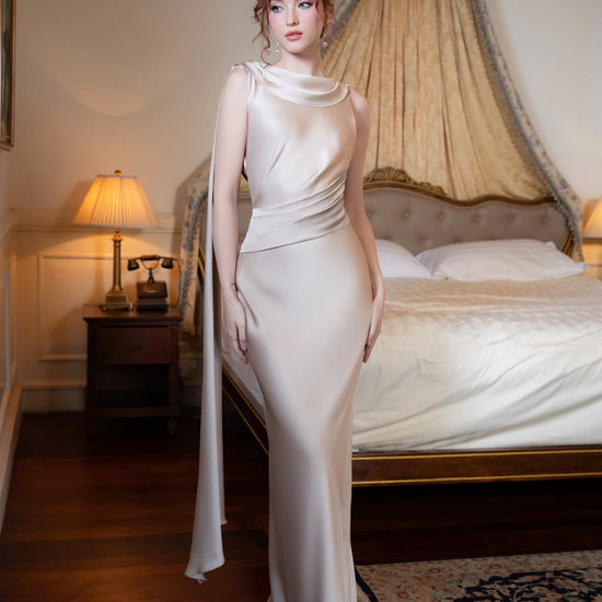 The DIANA satin dress is the epitome of elegance and sophistication, crafted from premium satin for a soft, lightweight feel against the skin. Its refined boat neckline, paired with delicate draping that cinches the waist, accentuates natural curves while creating a flattering silhouette. At the back, the low cascading draped detail and flowing satin train exude a mesmerizing allure. With an ankle-grazing length and graceful drape, DIANA is the perfect choice for evening parties or formal events where elegance and sophistication take center stage.