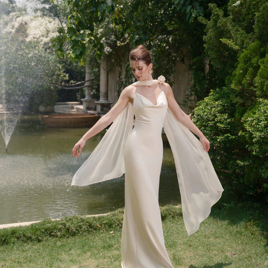 Beneath the dreamy organza veil lies a soft, figure-hugging cowl neck gown, crafted from luxurious silk that gently caresses every curve. The detachable veil allows for endless styling — wrapped around the neck, draped over the shoulder, or left to flow freely with every graceful movement. A delicate handmade rose adorns the shoulder, like a quiet note in a symphony of silk and light.