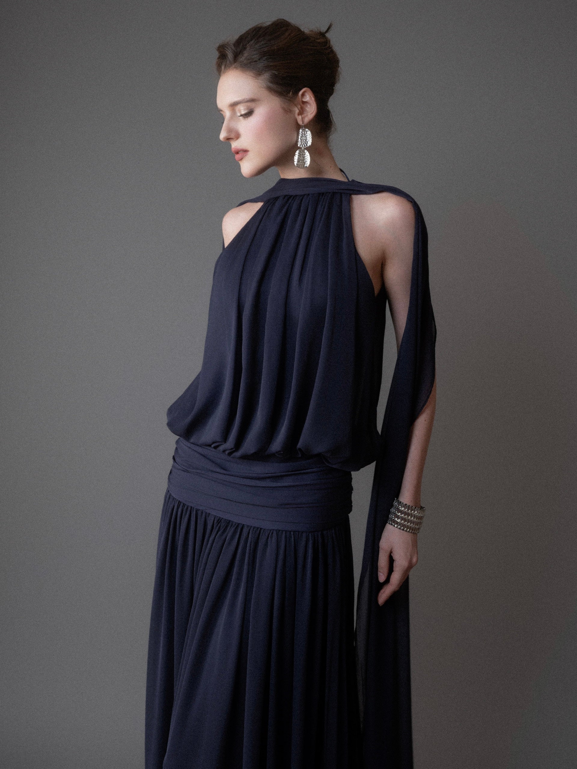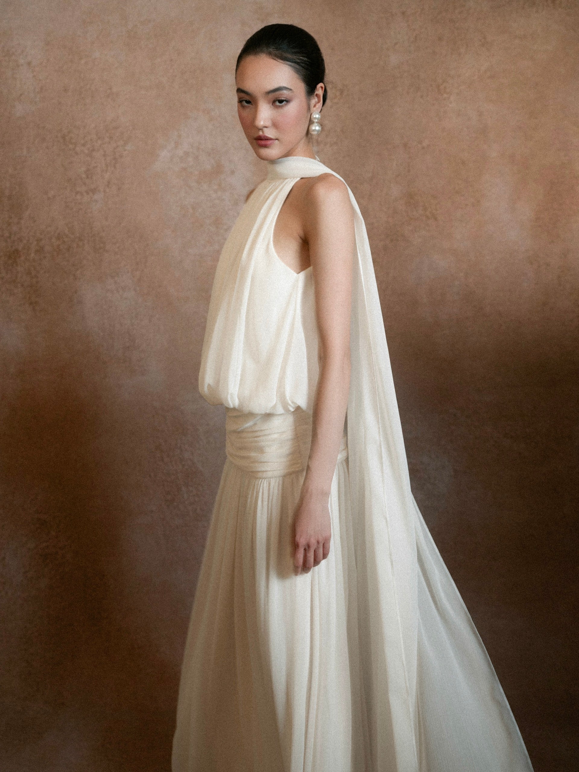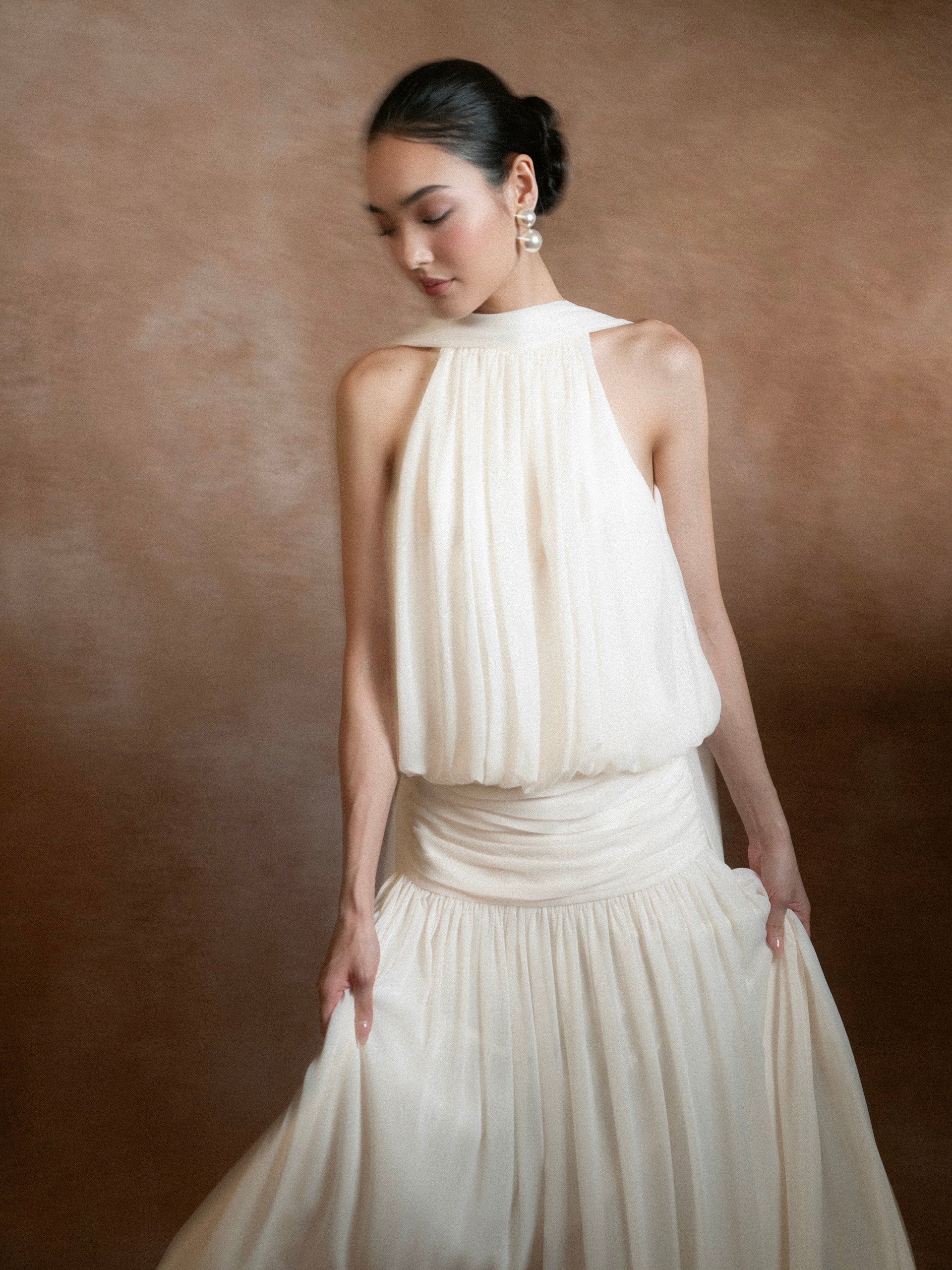 A gentle melody crafted for pure, refined beauty. ELVA is made with soft chiffon on the outside and smooth silk lining inside, creating an airy, weightless feel that remains graceful, modest, and luxurious. The elegant halter neckline and long, straight silhouette flatter the figure, while the deep open back with delicate tie straps adds just the right touch of sensuality.