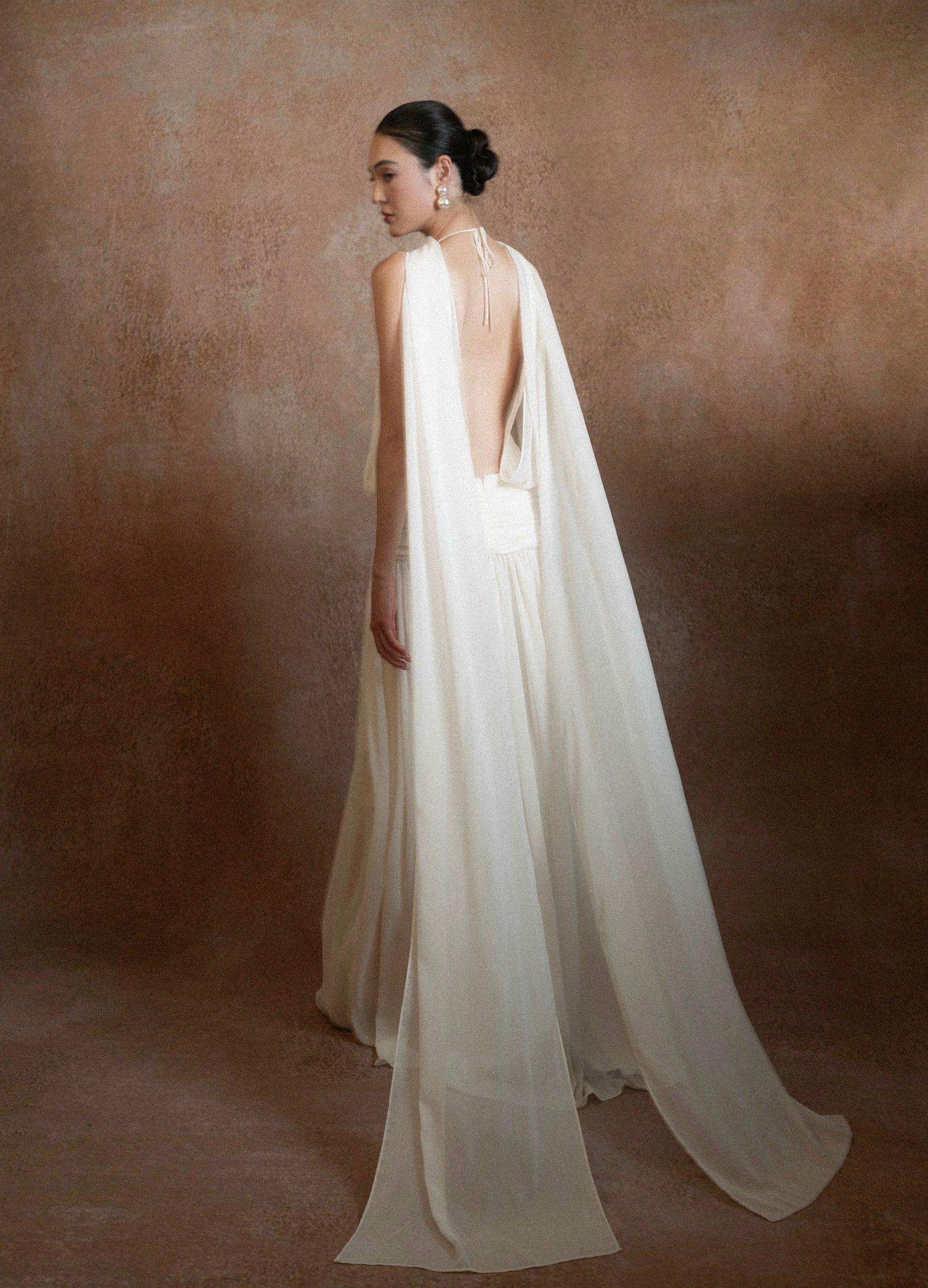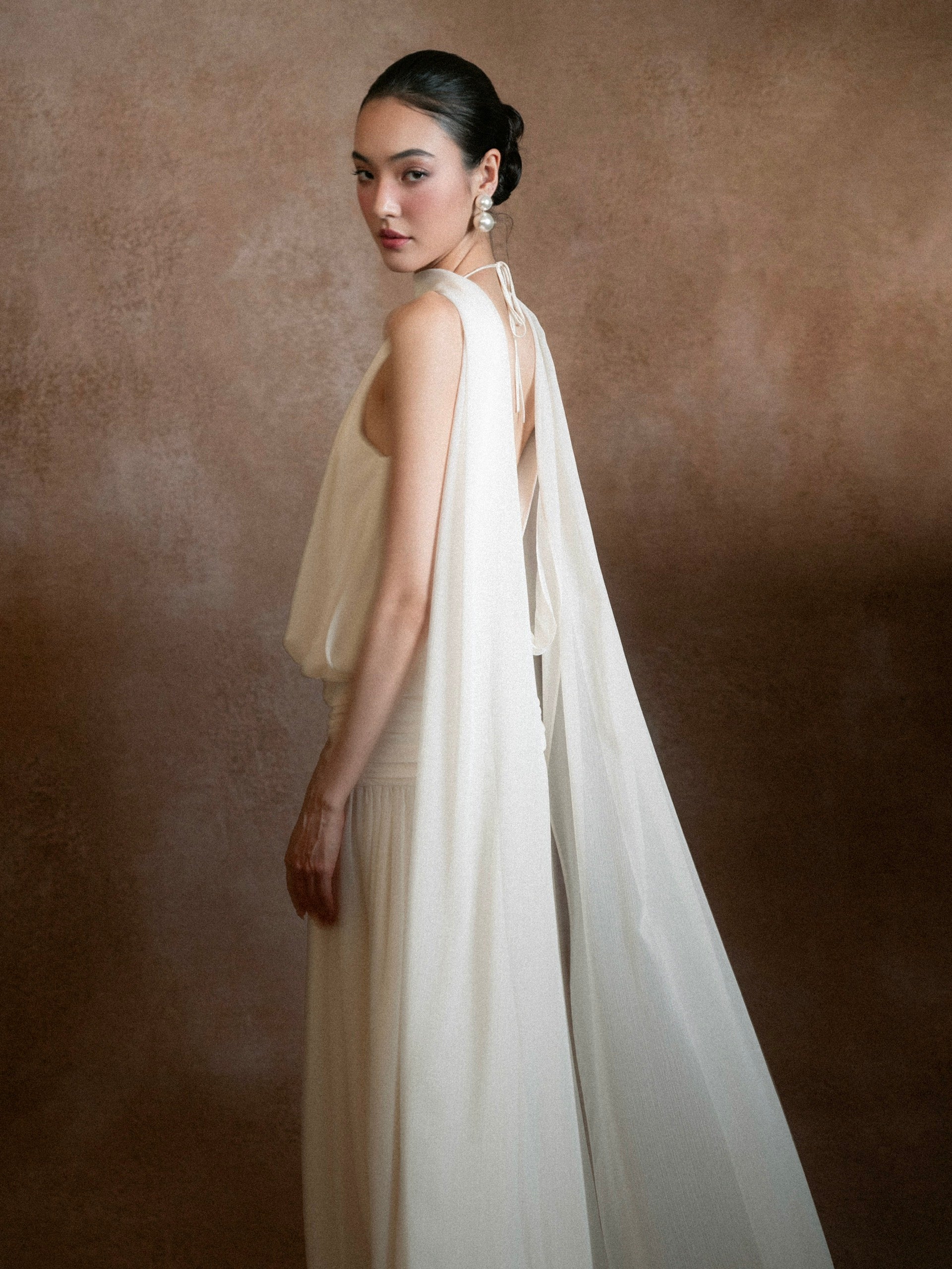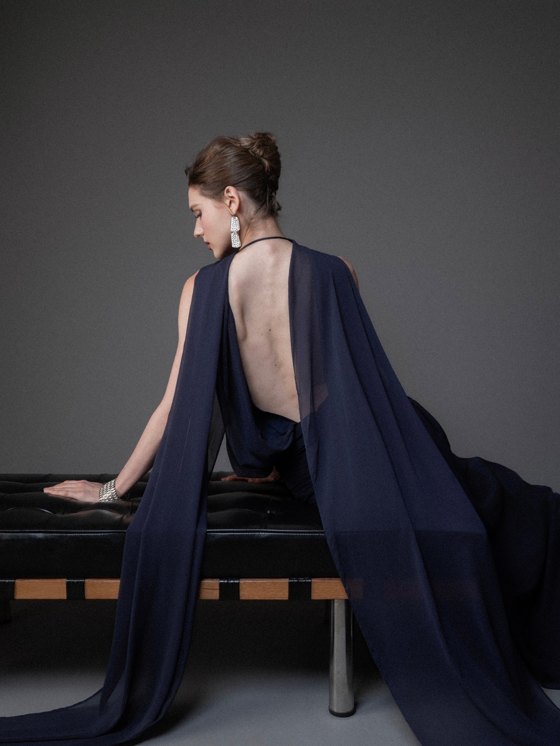 A gentle melody crafted for pure, refined beauty. ELVA is made with soft chiffon on the outside and smooth silk lining inside, creating an airy, weightless feel that remains graceful, modest, and luxurious. The elegant halter neckline and long, straight silhouette flatter the figure, while the deep open back with delicate tie straps adds just the right touch of sensuality.