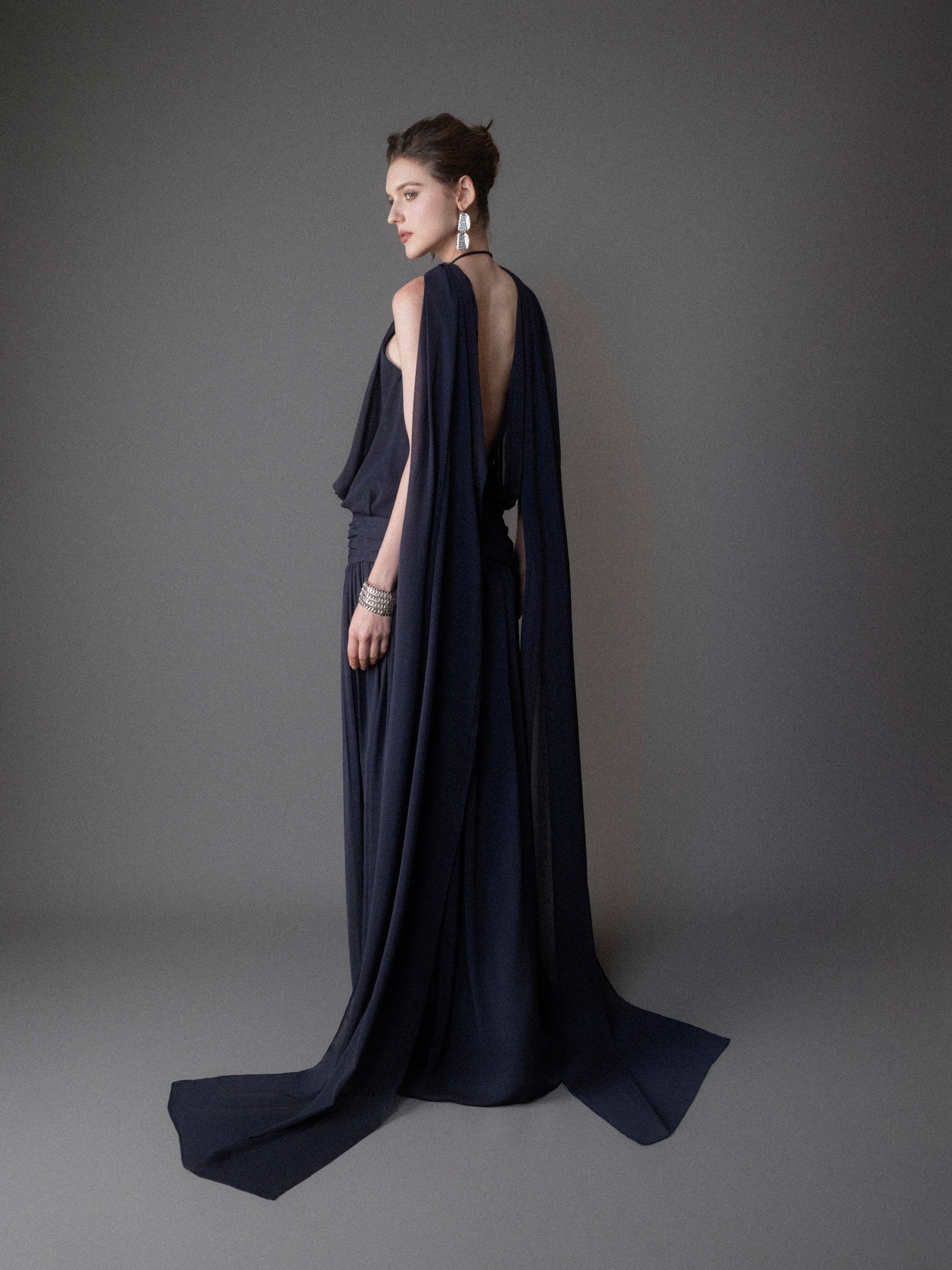 Flowing chiffon panels drape from the shoulders like a soft cape, creating poetic movement with every step. Subtle gathers at the waist and a straight-falling pleated skirt enhance a feminine, fluid elegance from every angle. The ELVA GOWN is the perfect choice for evening soirées, weddings, and moments when she wishes to shine—softly, yet unforgettable.