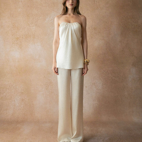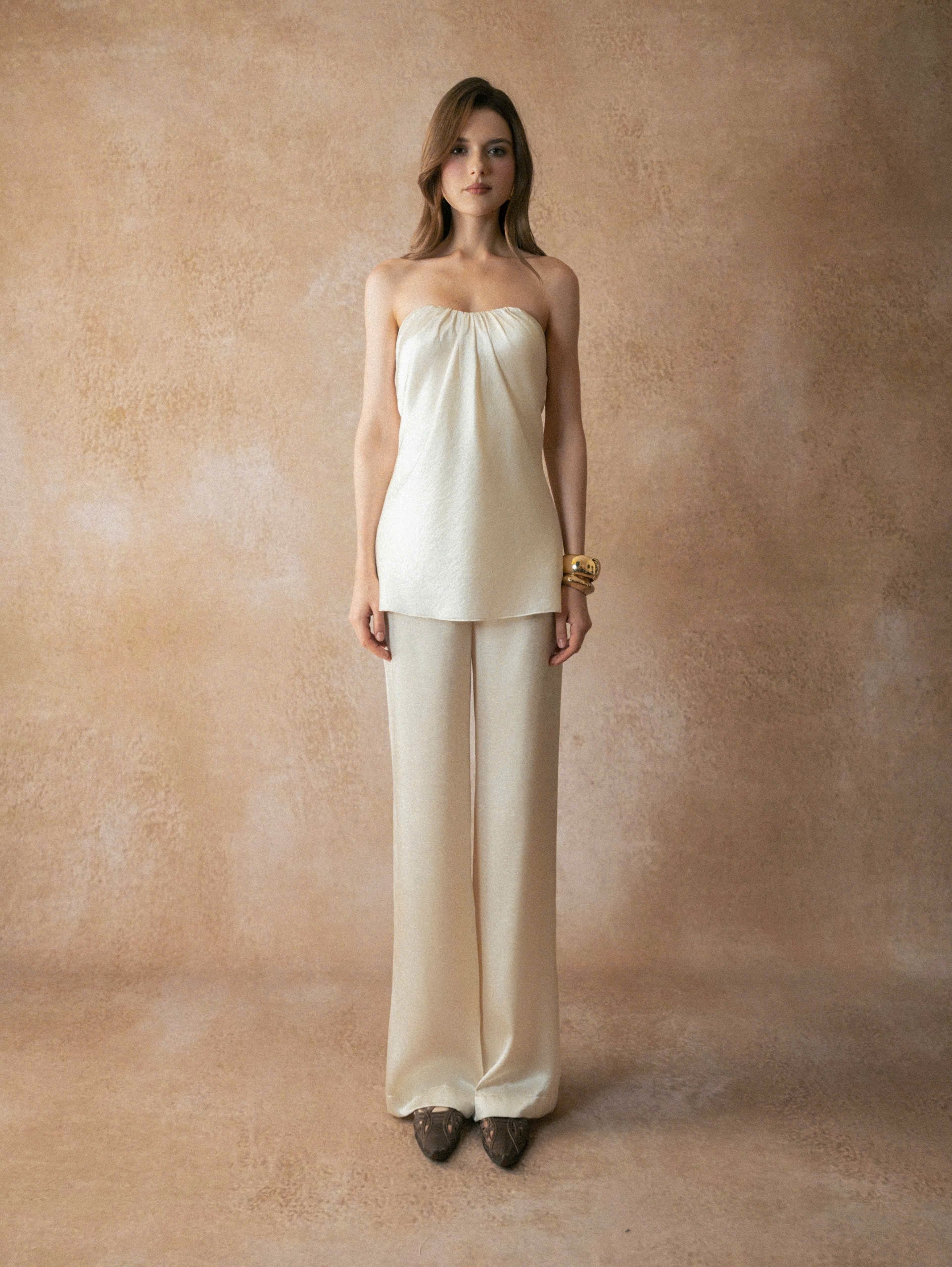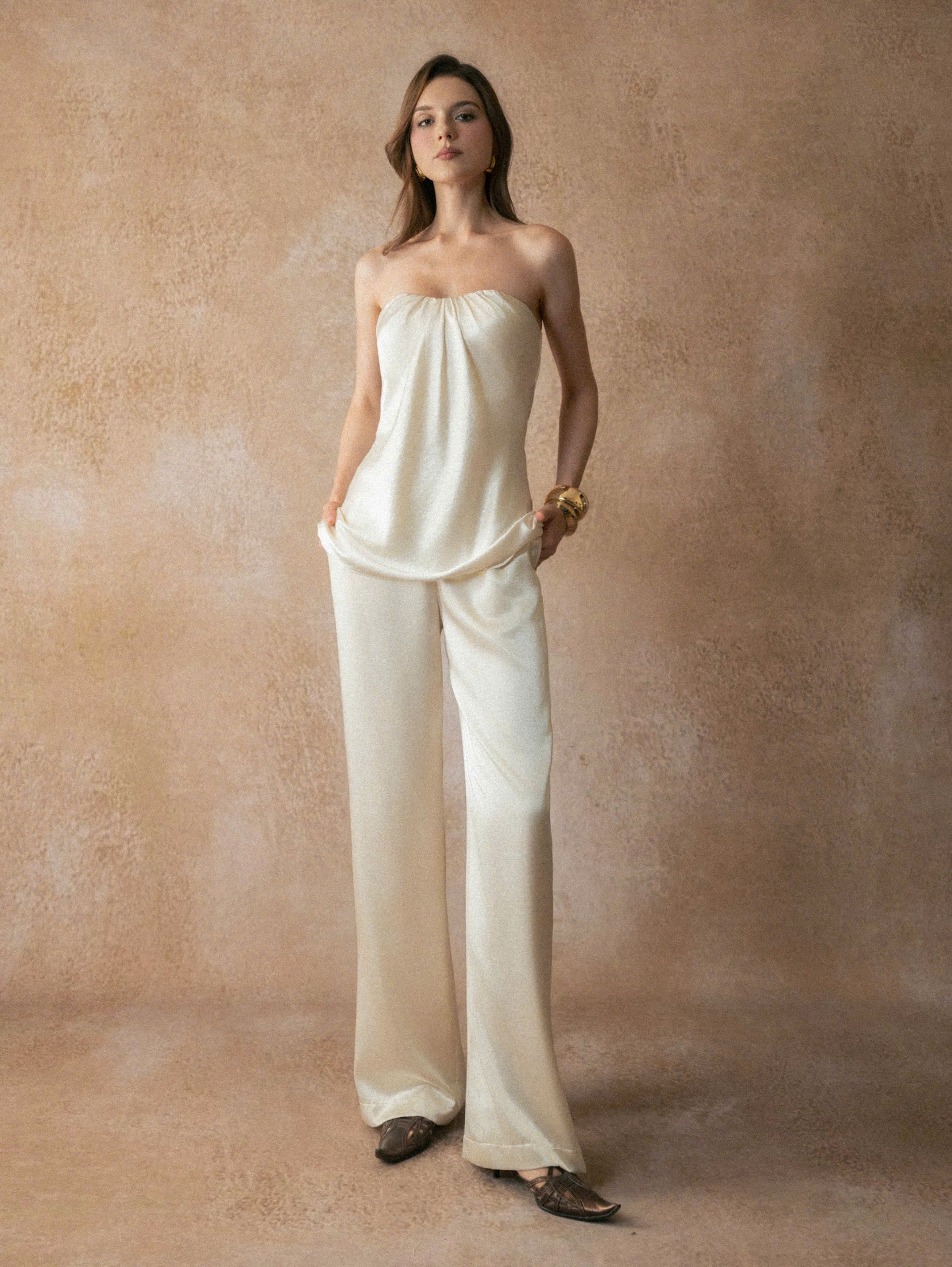 Carries the spirit of captivating minimalism: a softly draped bandeau silhouette that embraces the curves, highlighted by a graceful back bow, paired with straight-fall silk pants for an effortlessly sleek and modern look.