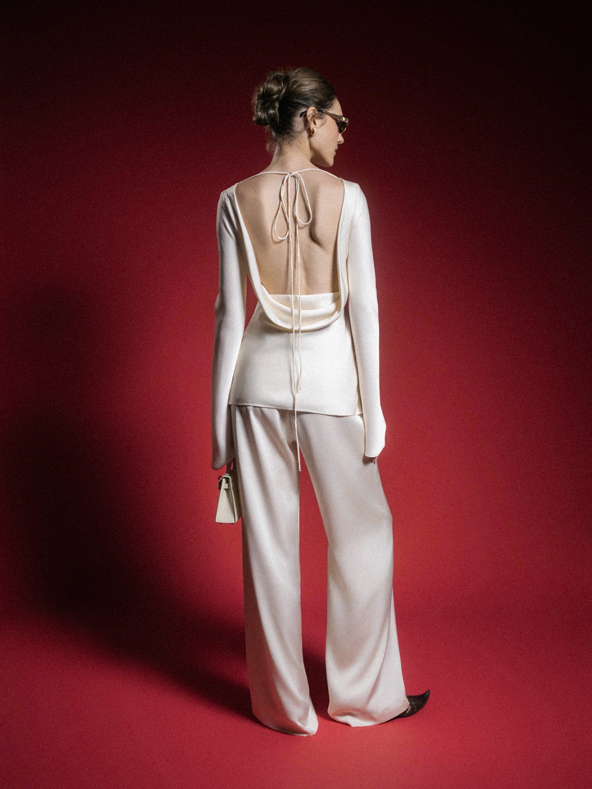 At the back, the deep open cut paired with delicate ties offers a refined focal point, accentuating the back and bringing a modern sense of allure. Crafted from premium satin with a soft sheen and fluid drape, the material ensures the top maintains its radiance and elegance from every angle.