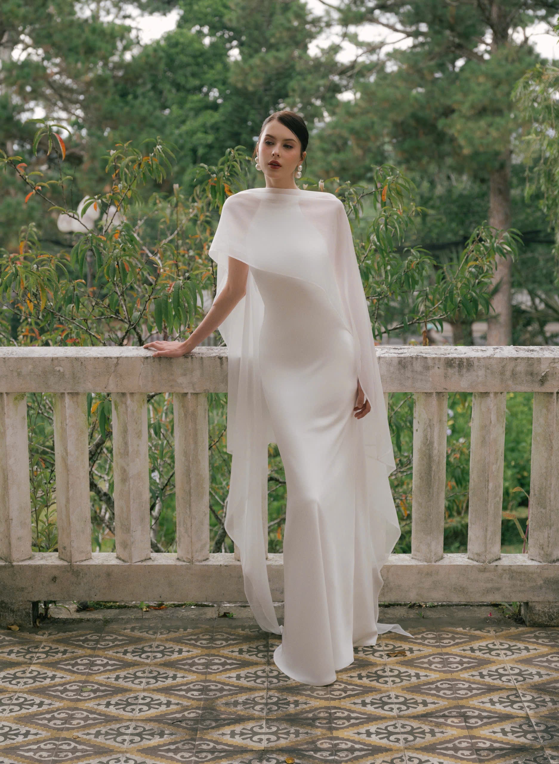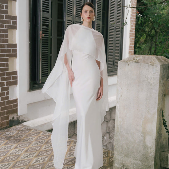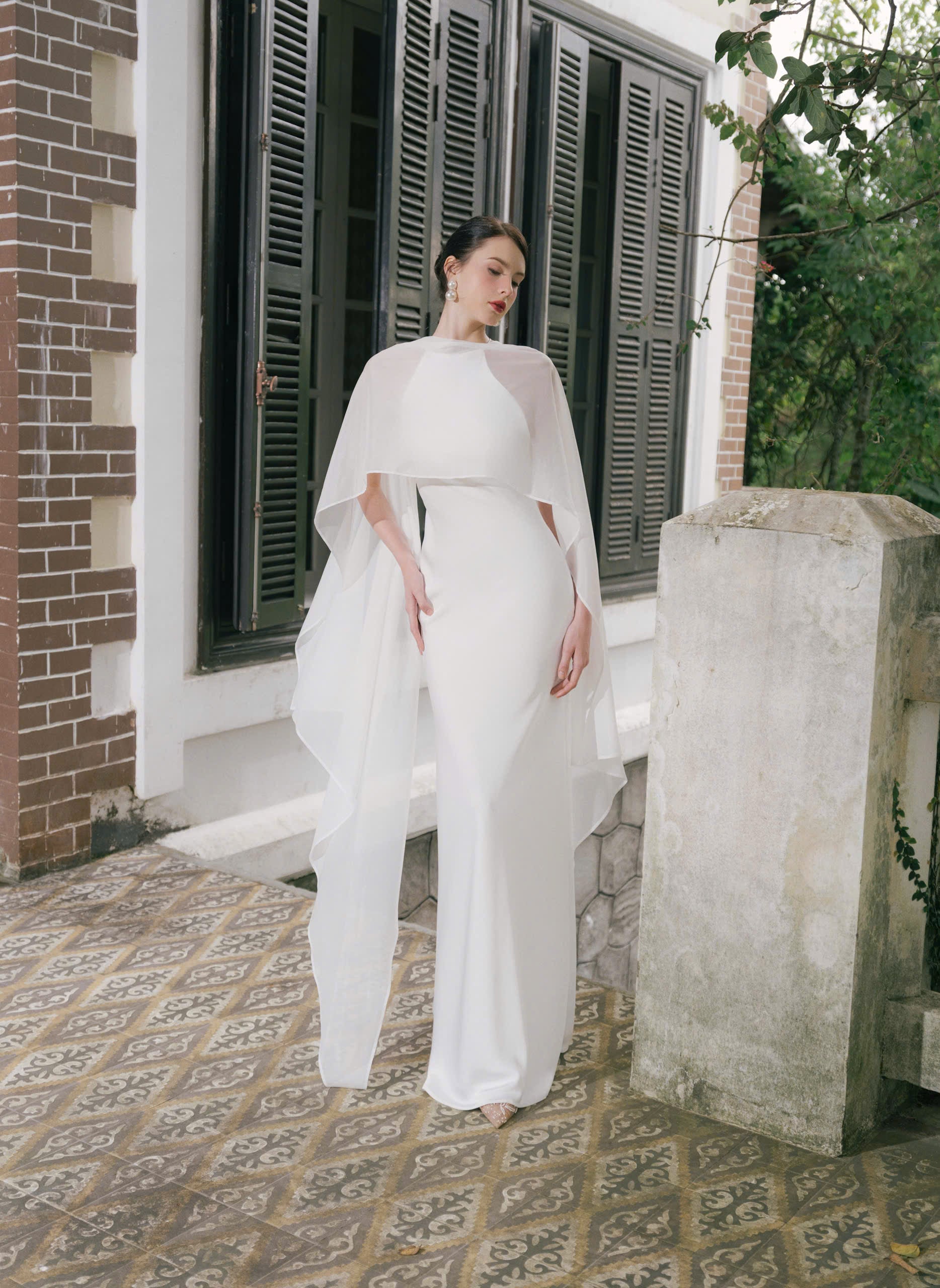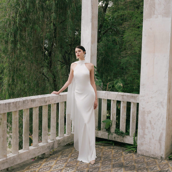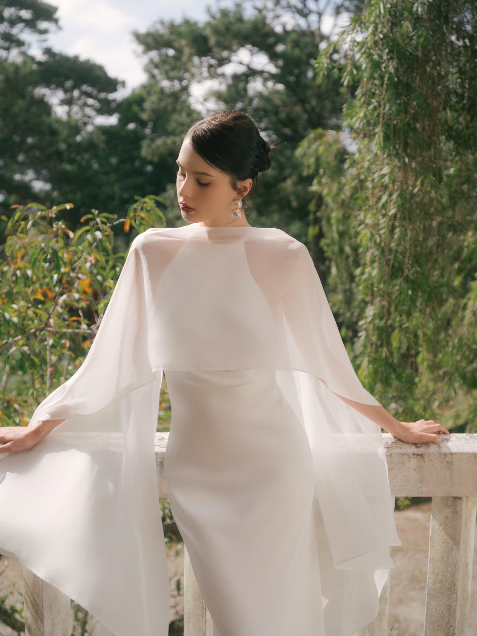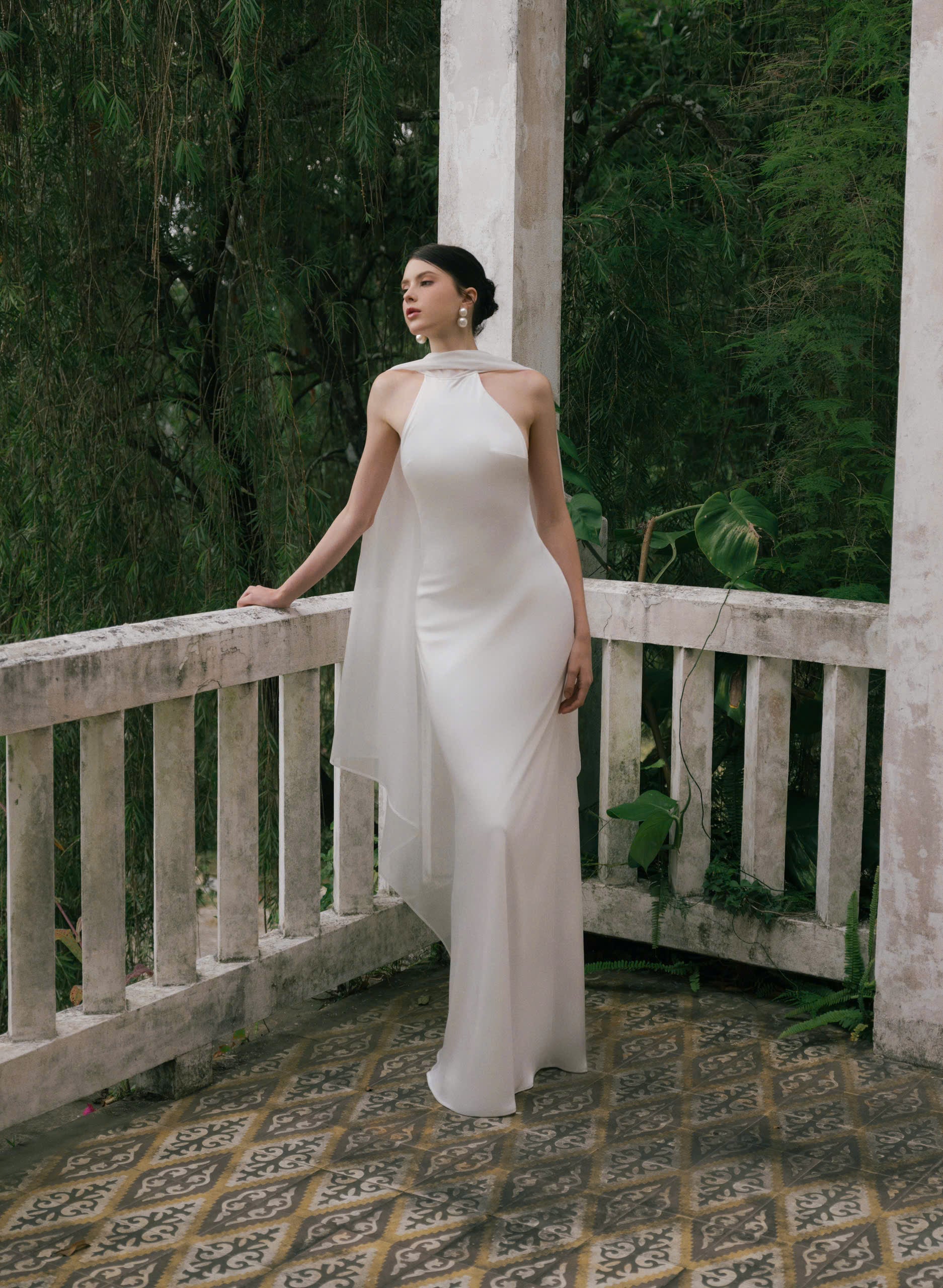 A silk dress design combined with chiffon, radiating pure and delicate beauty. The soft chiffon panel can be styled in various ways: flowing naturally, draped gently over the shoulder, or tied neatly at the back — each style accentuating a unique sense of femininity and elegance. The dress features a softly fitted silhouette that subtly highlights the curves, paired with a captivating open back adorned with delicate crisscross straps, creating a look that is both graceful and alluring.