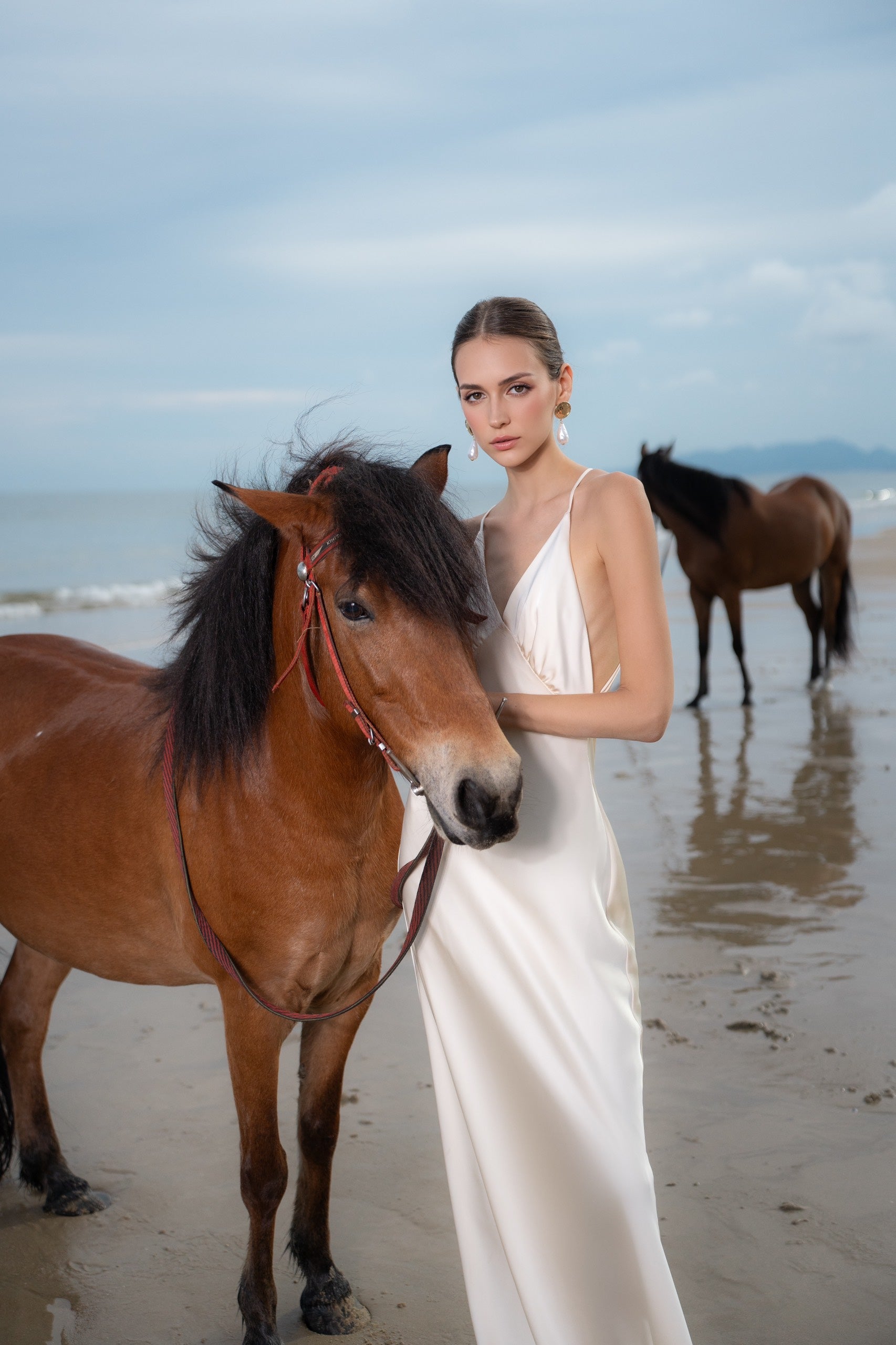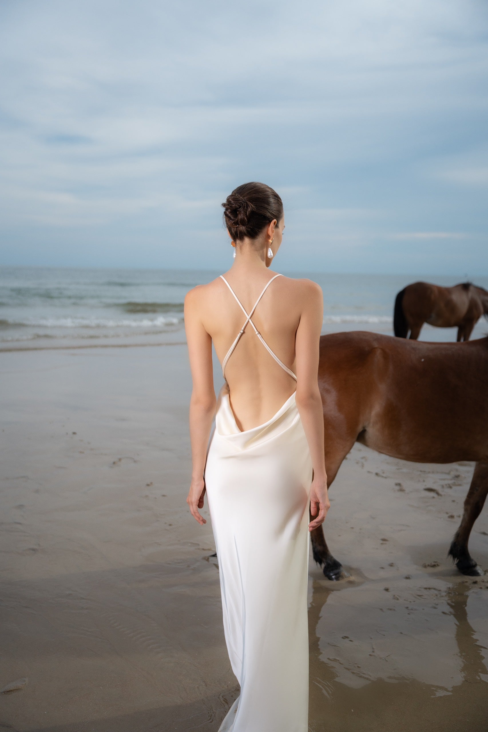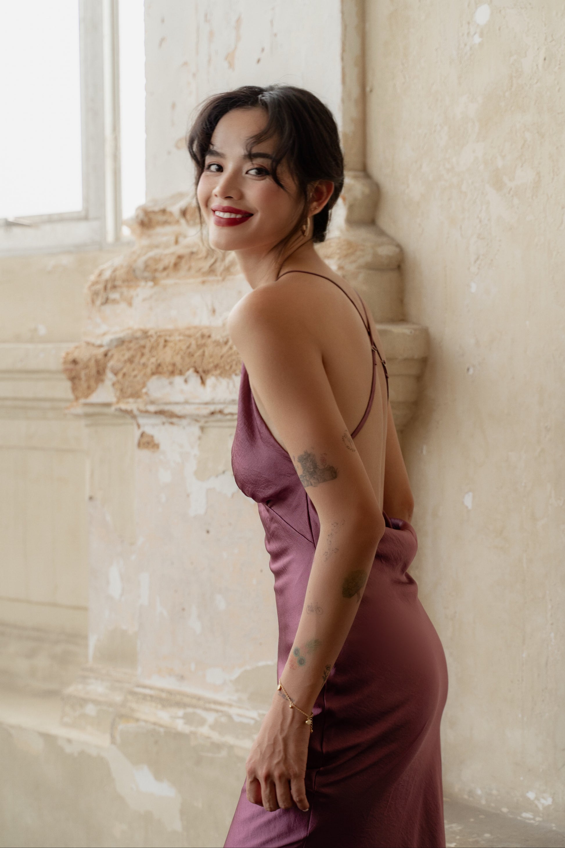 Lấy cảm hứng từ sắc tím ngọt ngào, lãng mạn, sang trọng và lạ mắt như tên gọi của loài hoa "Diên Vỹ" cao quý, chiếc váy lụa Iris với thiết kế hai dây, chi tiết xếp nếp tinh tế ở ngực cùng phần lưng khoét sâu gợi cảm đem đến tinh thần vượt thời gian, tính ứng dụng cao và nét riêng độc đáo cho người mặc.
