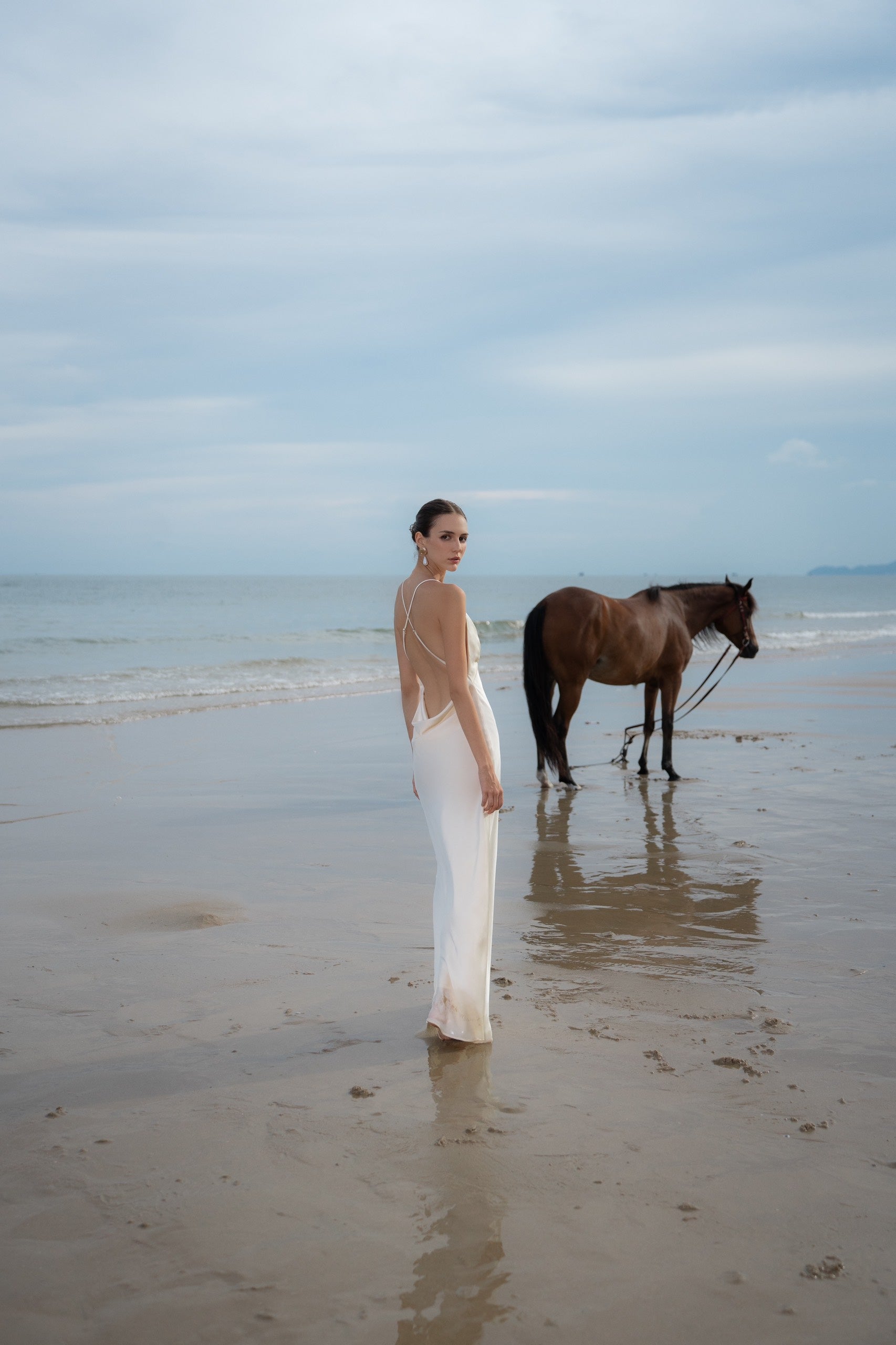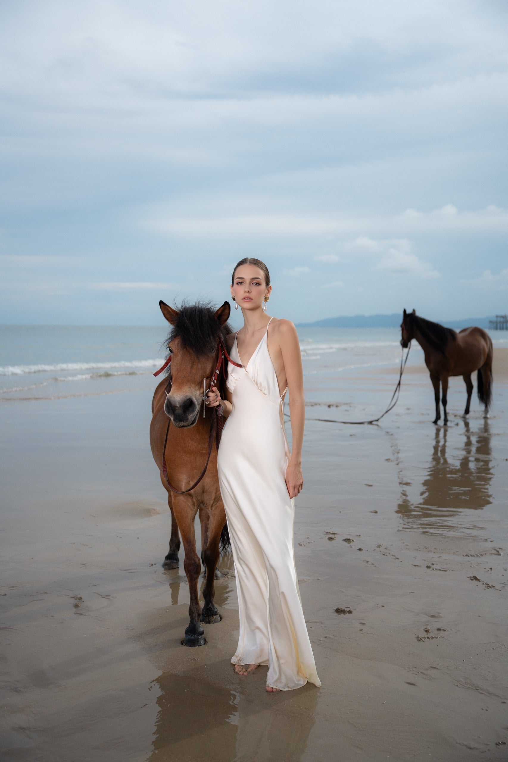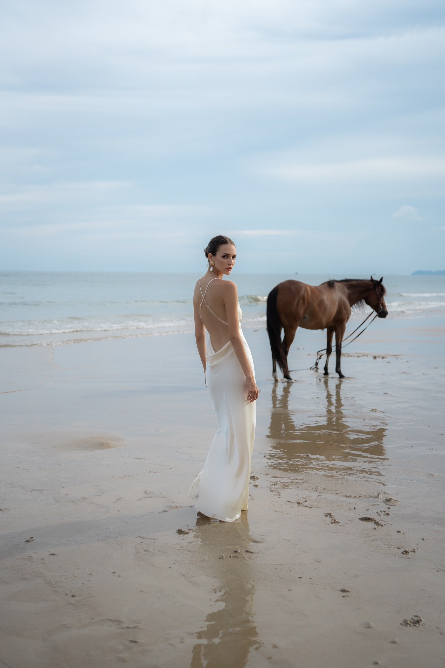 Lấy cảm hứng từ sắc tím ngọt ngào, lãng mạn, sang trọng và lạ mắt như tên gọi của loài hoa "Diên Vỹ" cao quý, chiếc váy lụa Iris với thiết kế hai dây, chi tiết xếp nếp tinh tế ở ngực cùng phần lưng khoét sâu gợi cảm đem đến tinh thần vượt thời gian, tính ứng dụng cao và nét riêng độc đáo cho người mặc.