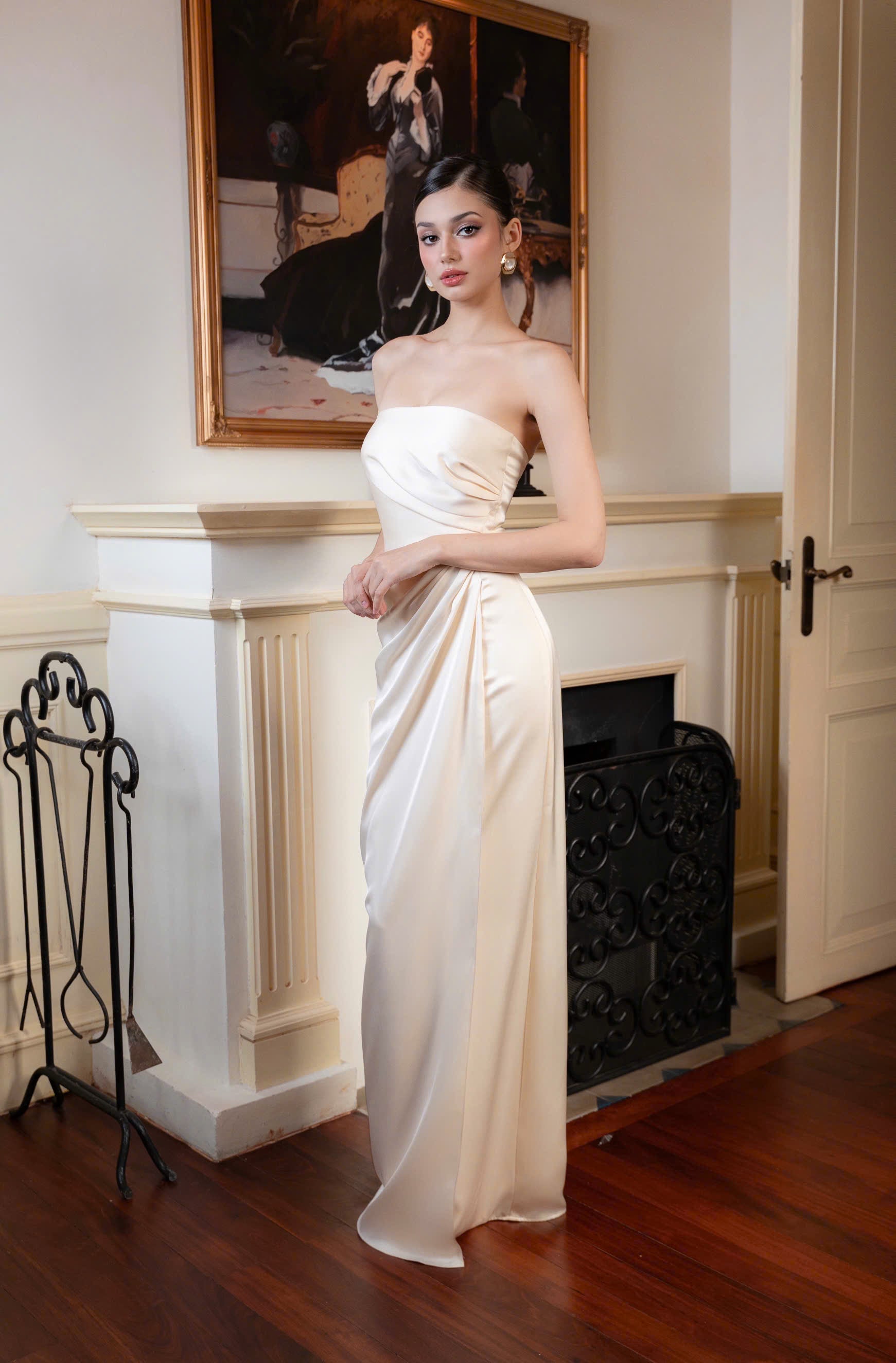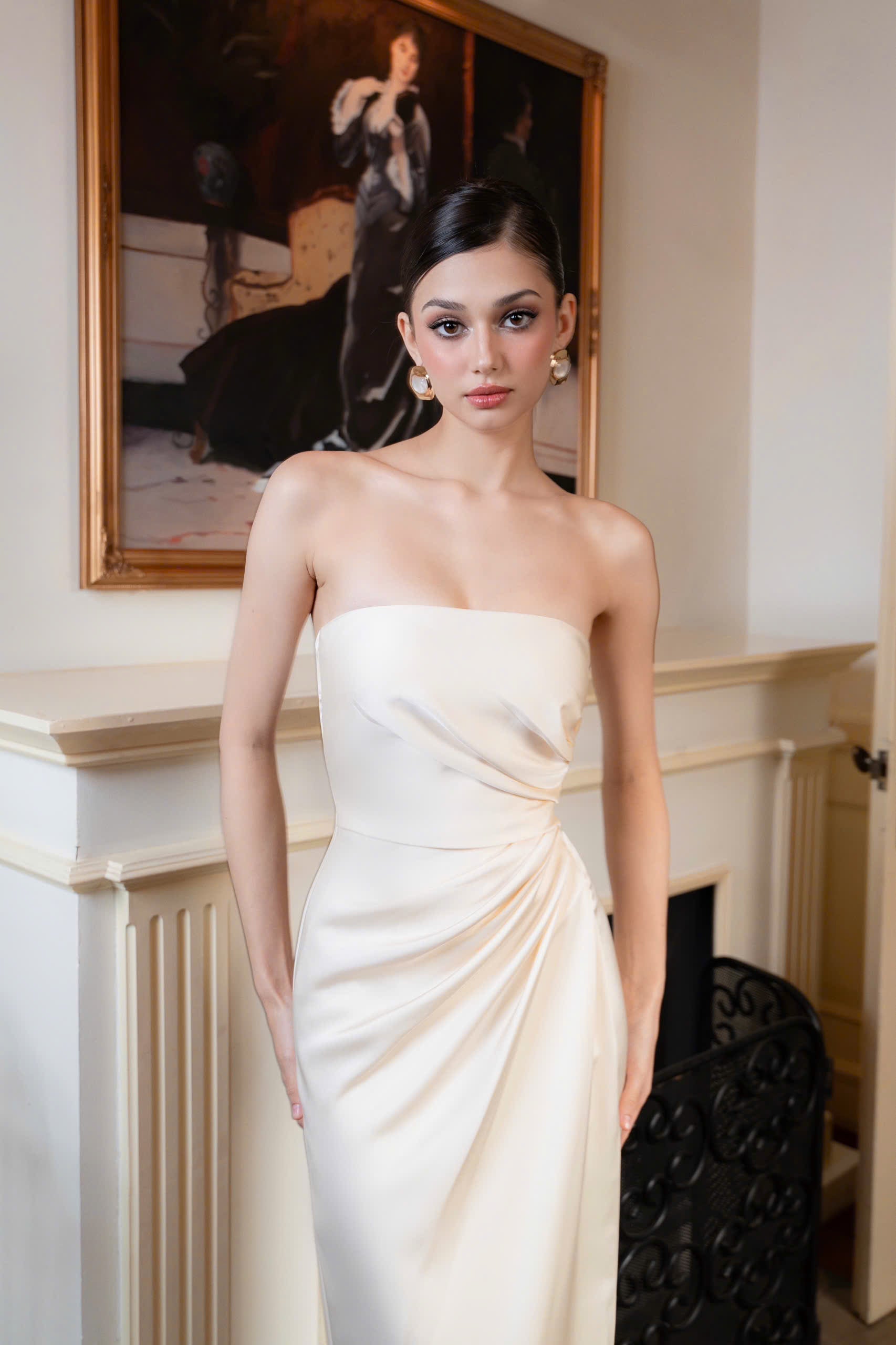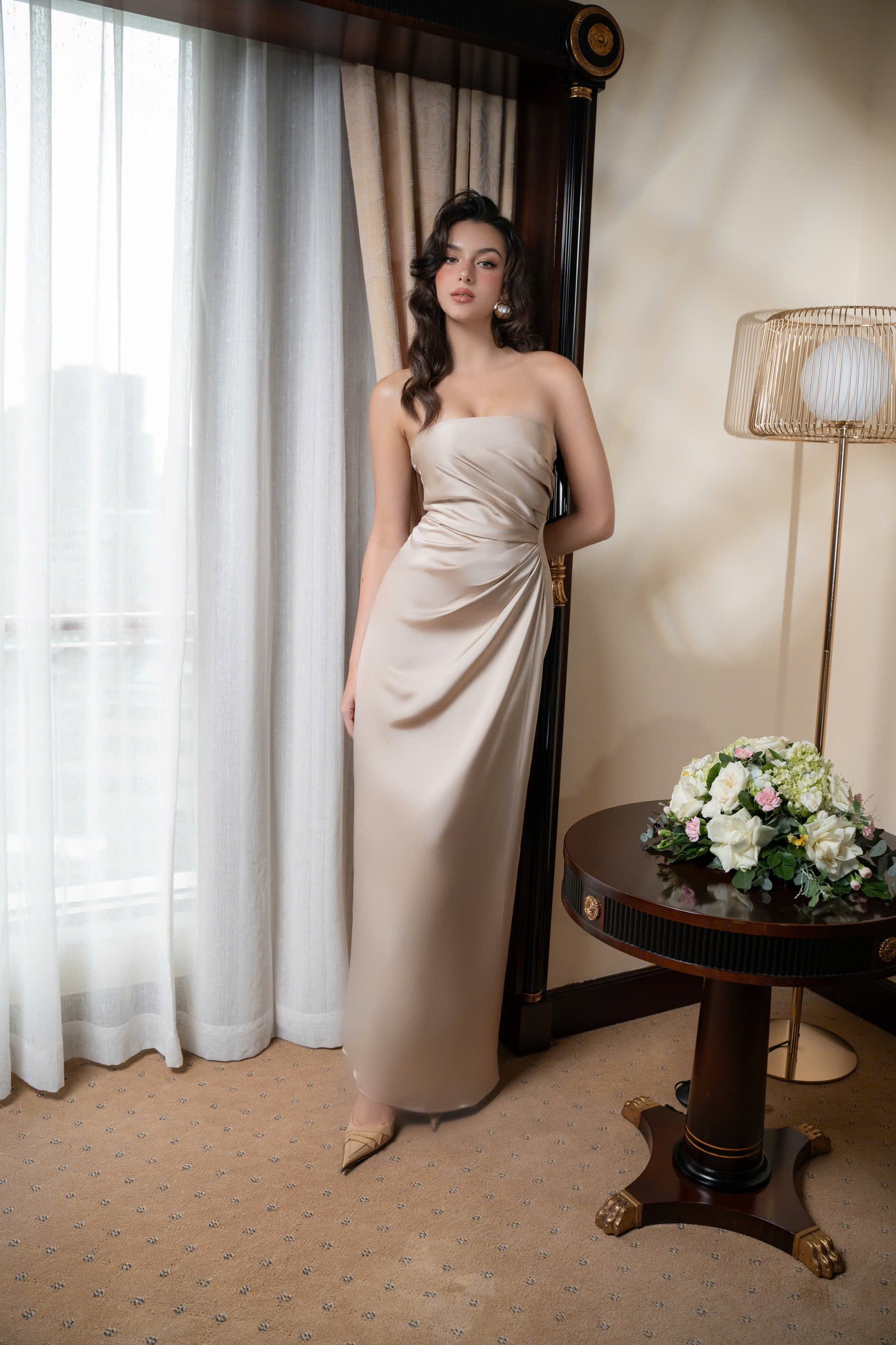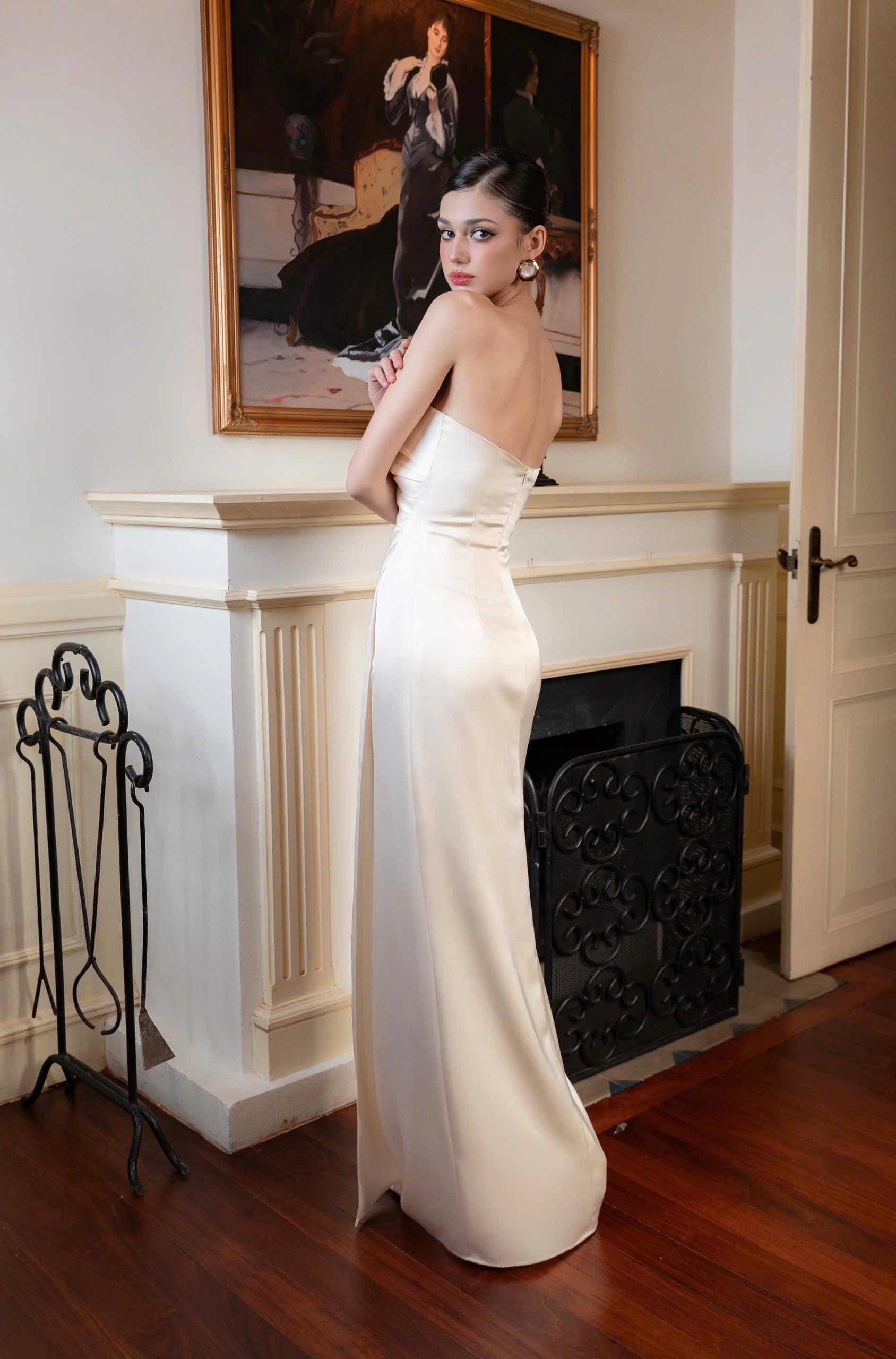 An extremely flattering and seductive dress, are the words that the Kisserine design team had to exclaim when fitting the dress with the model for the first time. The characteristics of silk are very soft and slippery, so the pleated details on the silk background have been meticulously draping by skilled craftsmen for each dress before reaching the hands of Kisserine’s muses. Discover the 4 colors: creamy white, navy blue, sangre red and light beige of Jenny’s design!