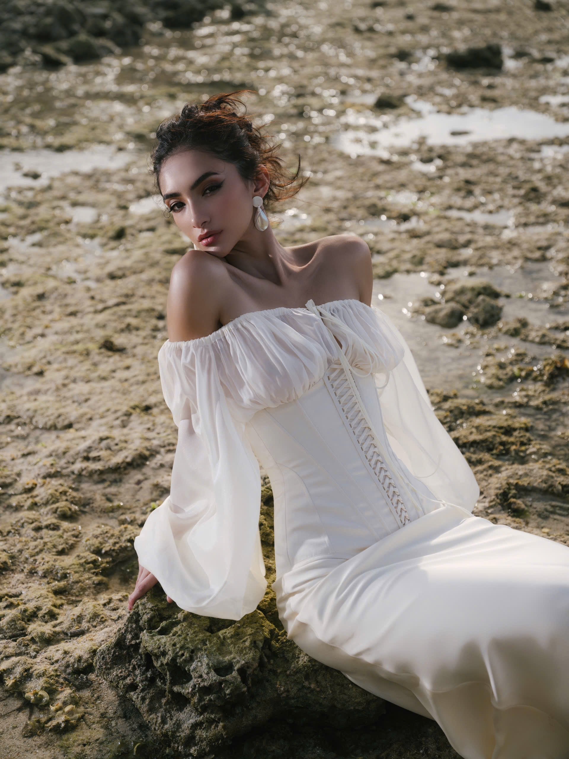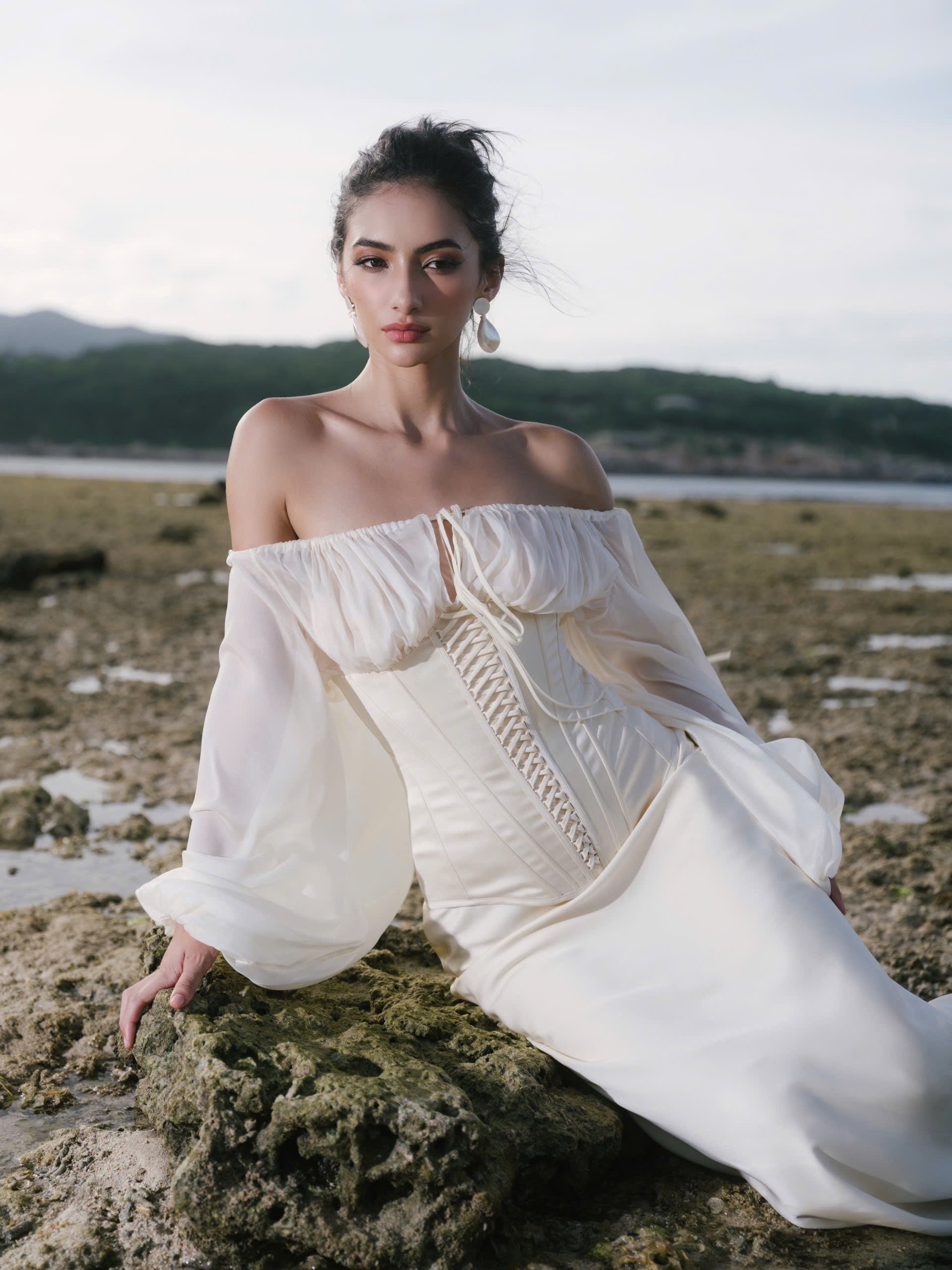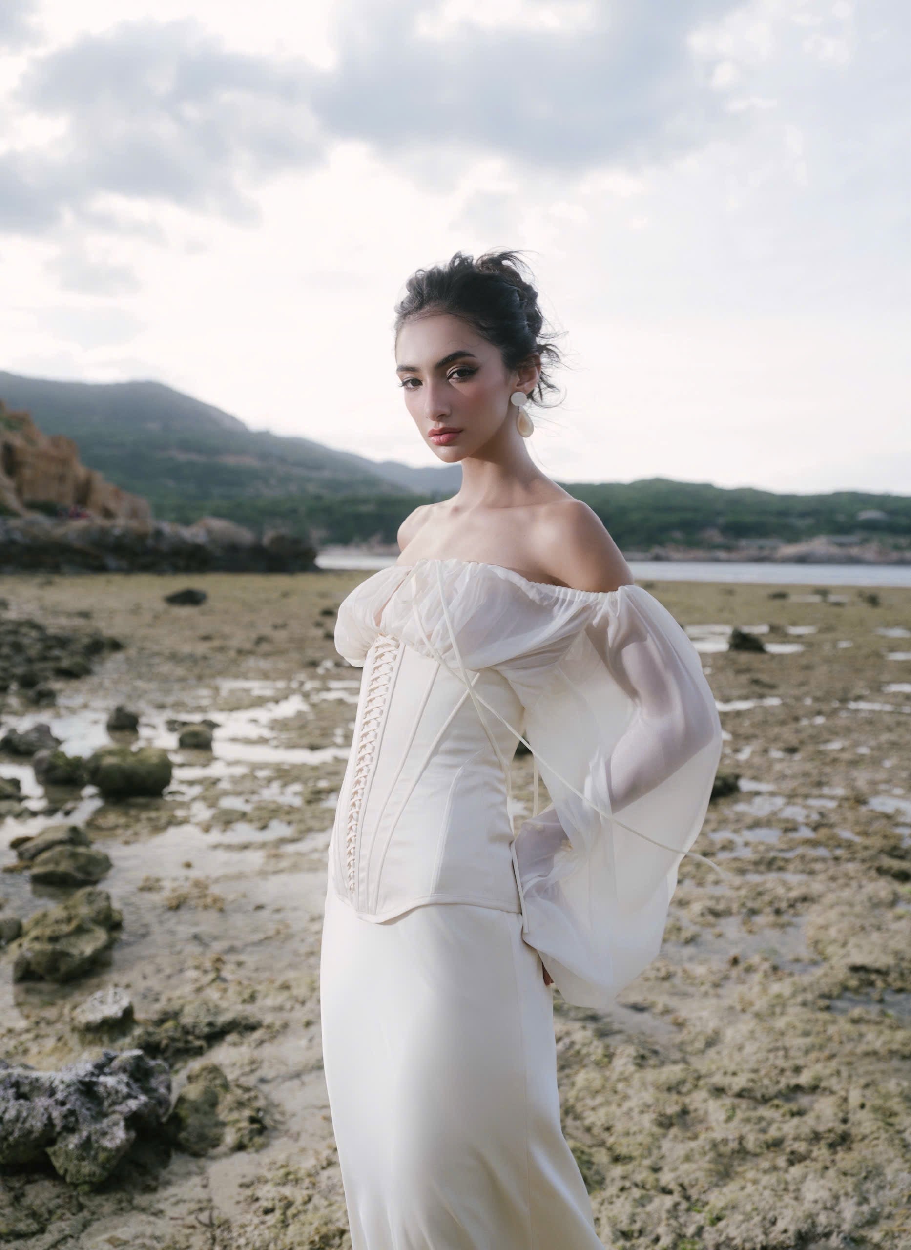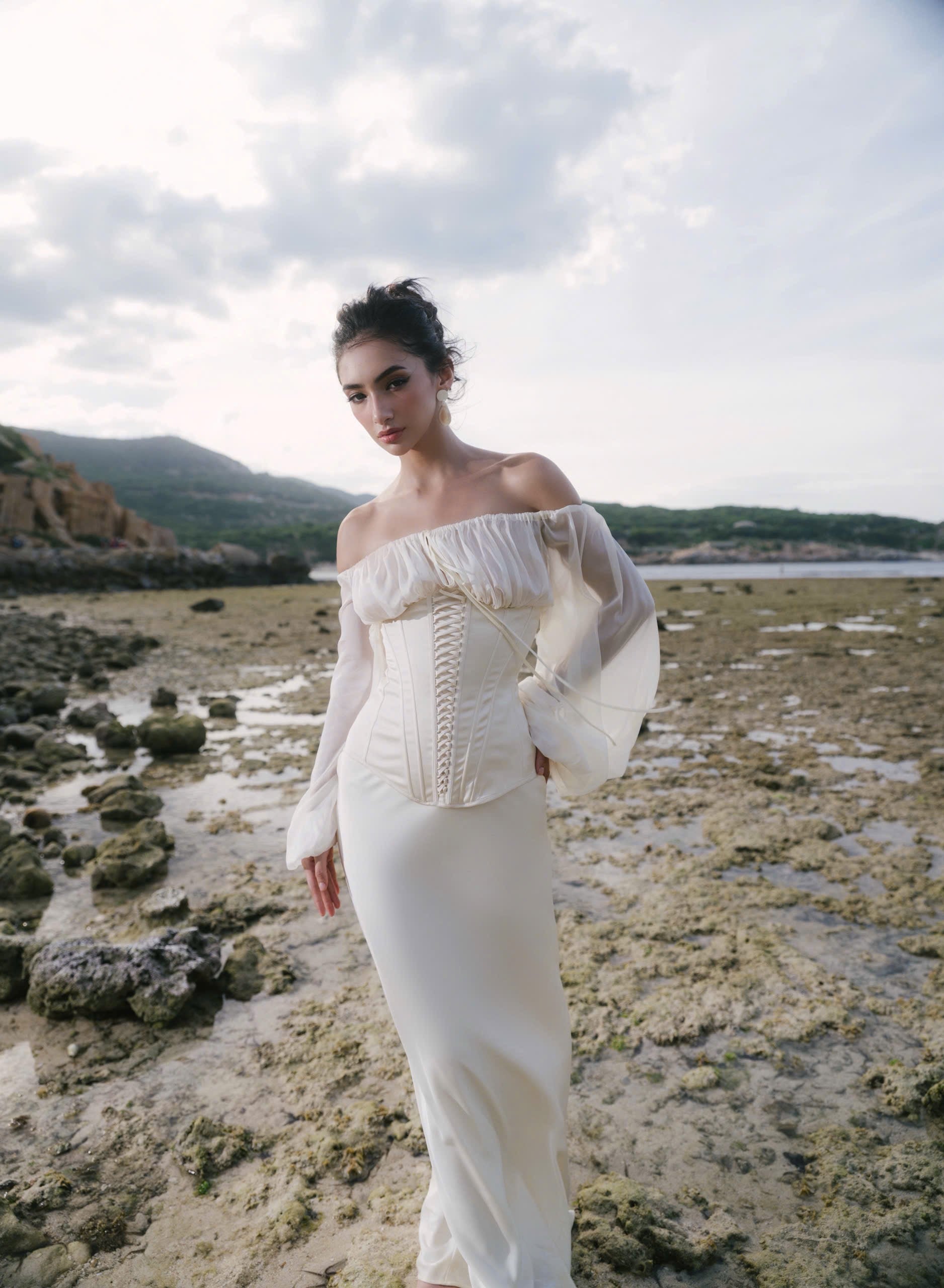 Like a fairytale ballad, the KAIA CORSET. With its structured bodice embracing every curve and dreamy organza sleeves flowing like clouds, this look is a celebration of strength wrapped in softness.