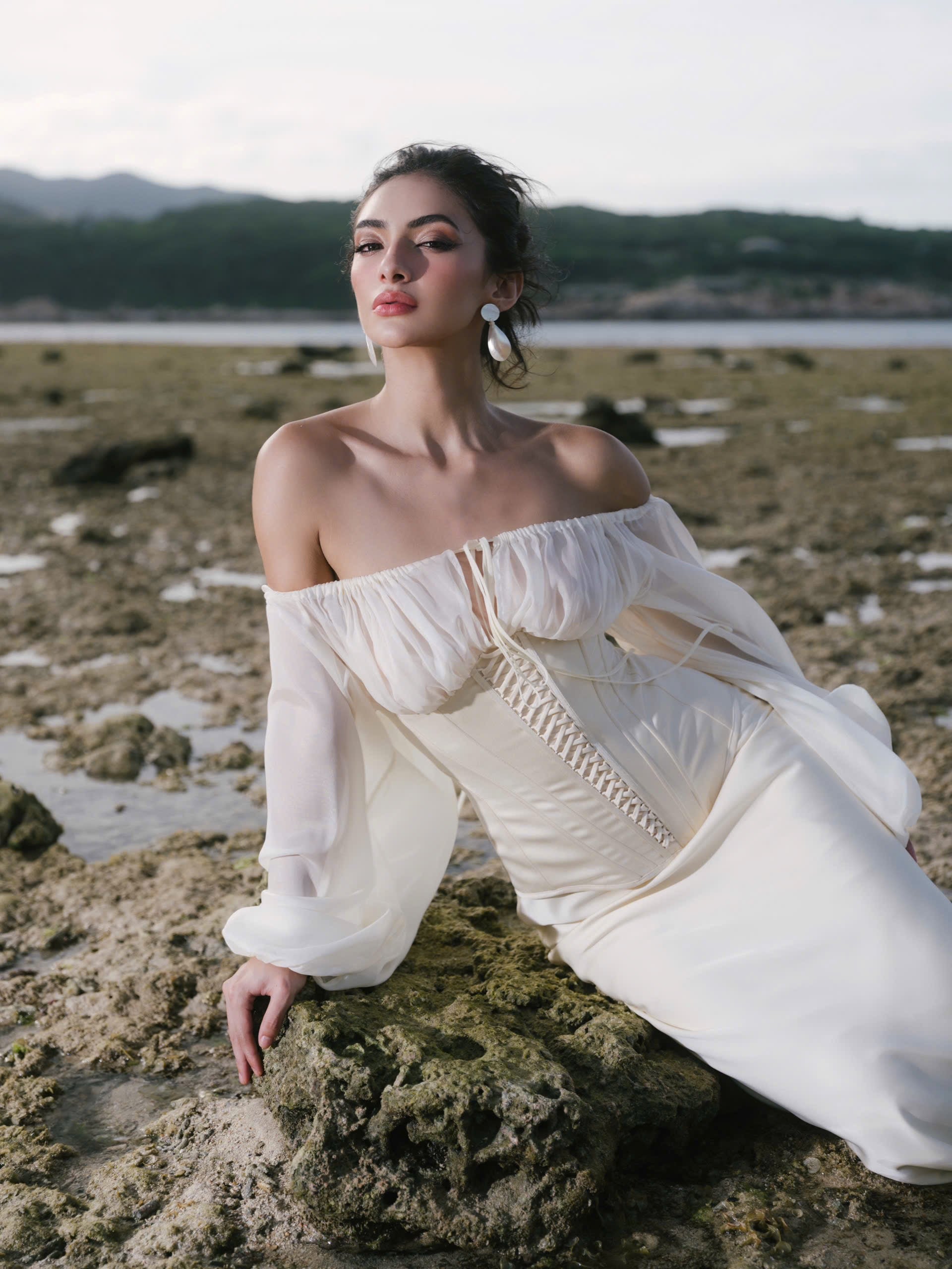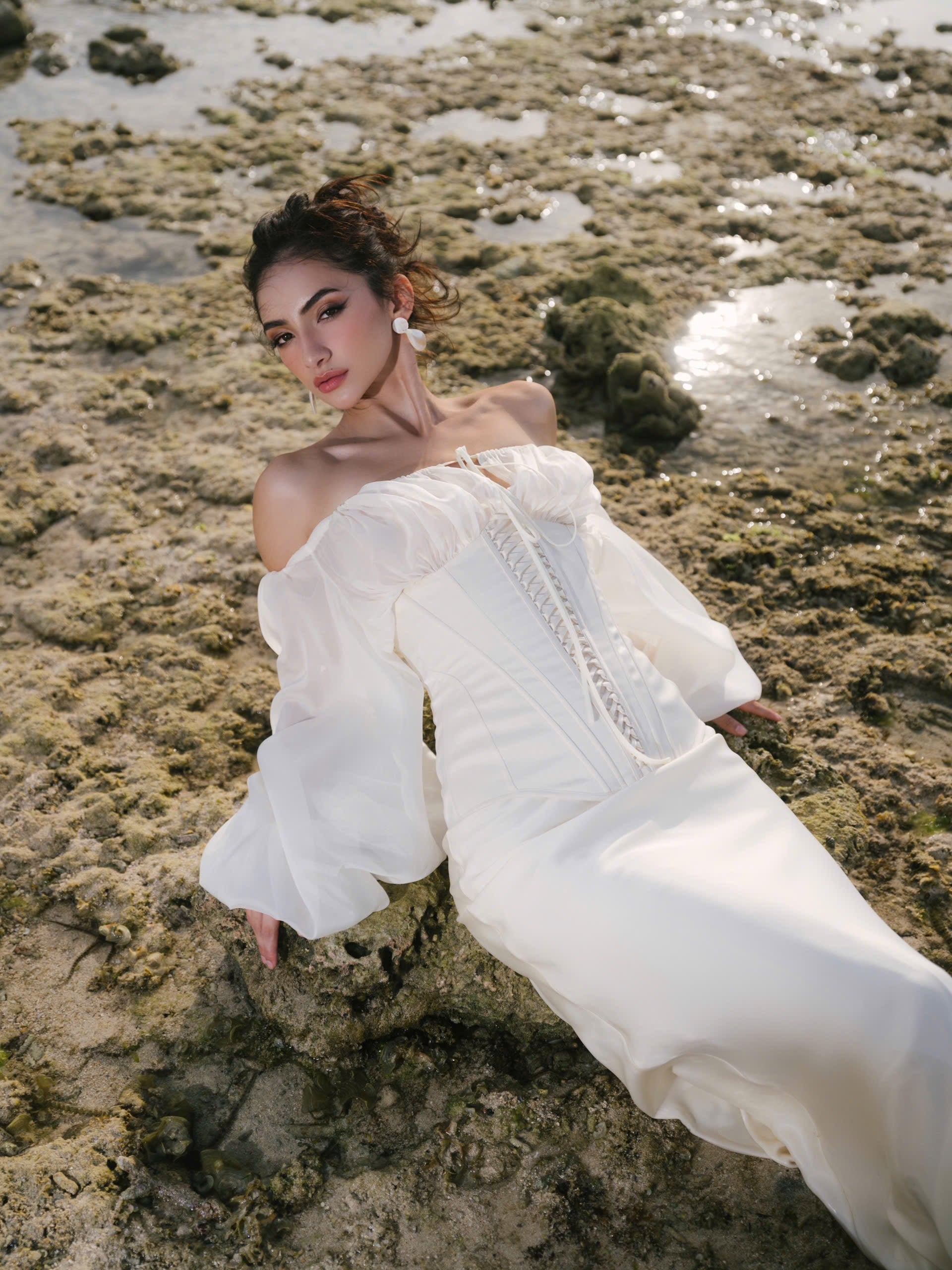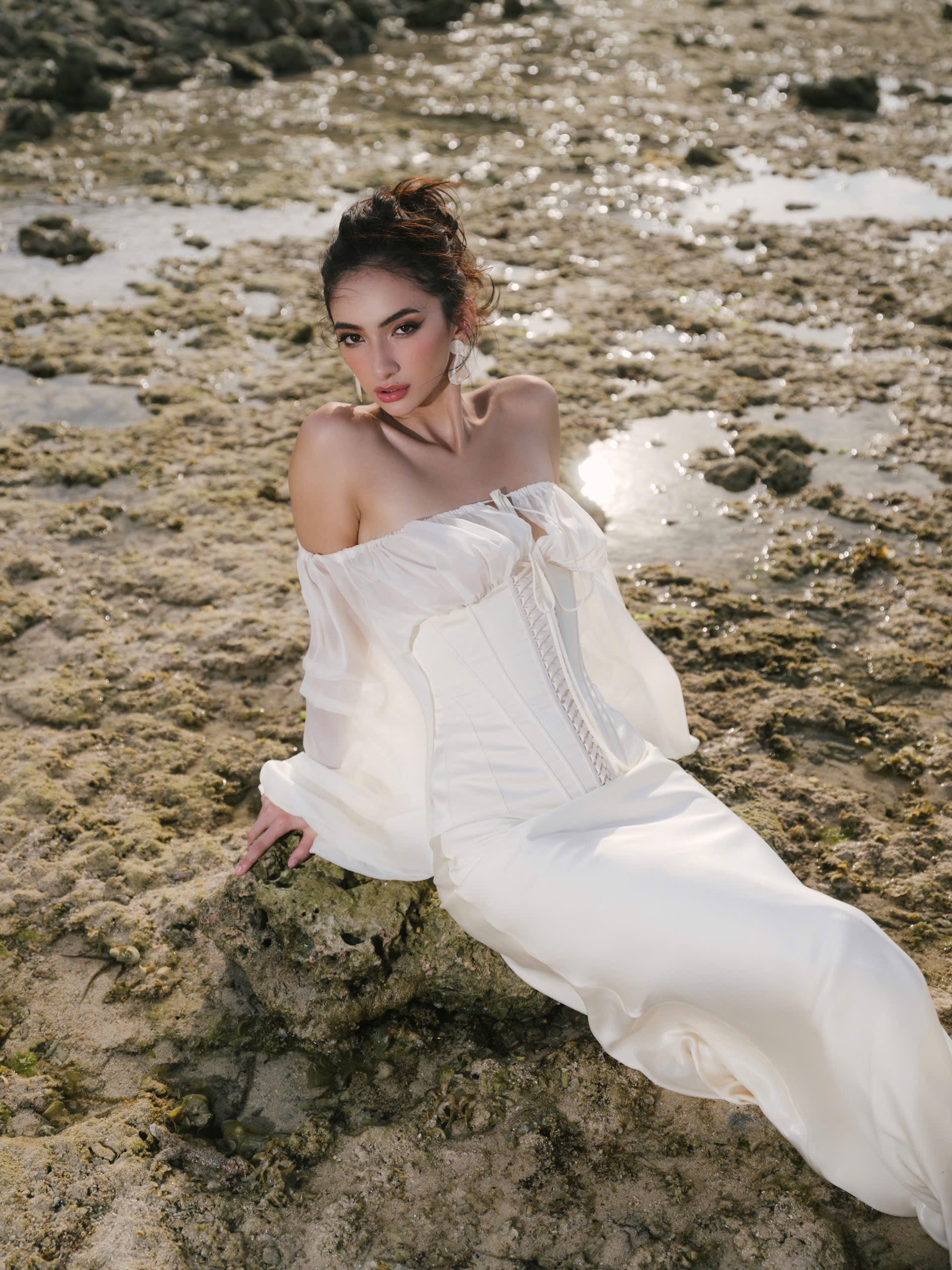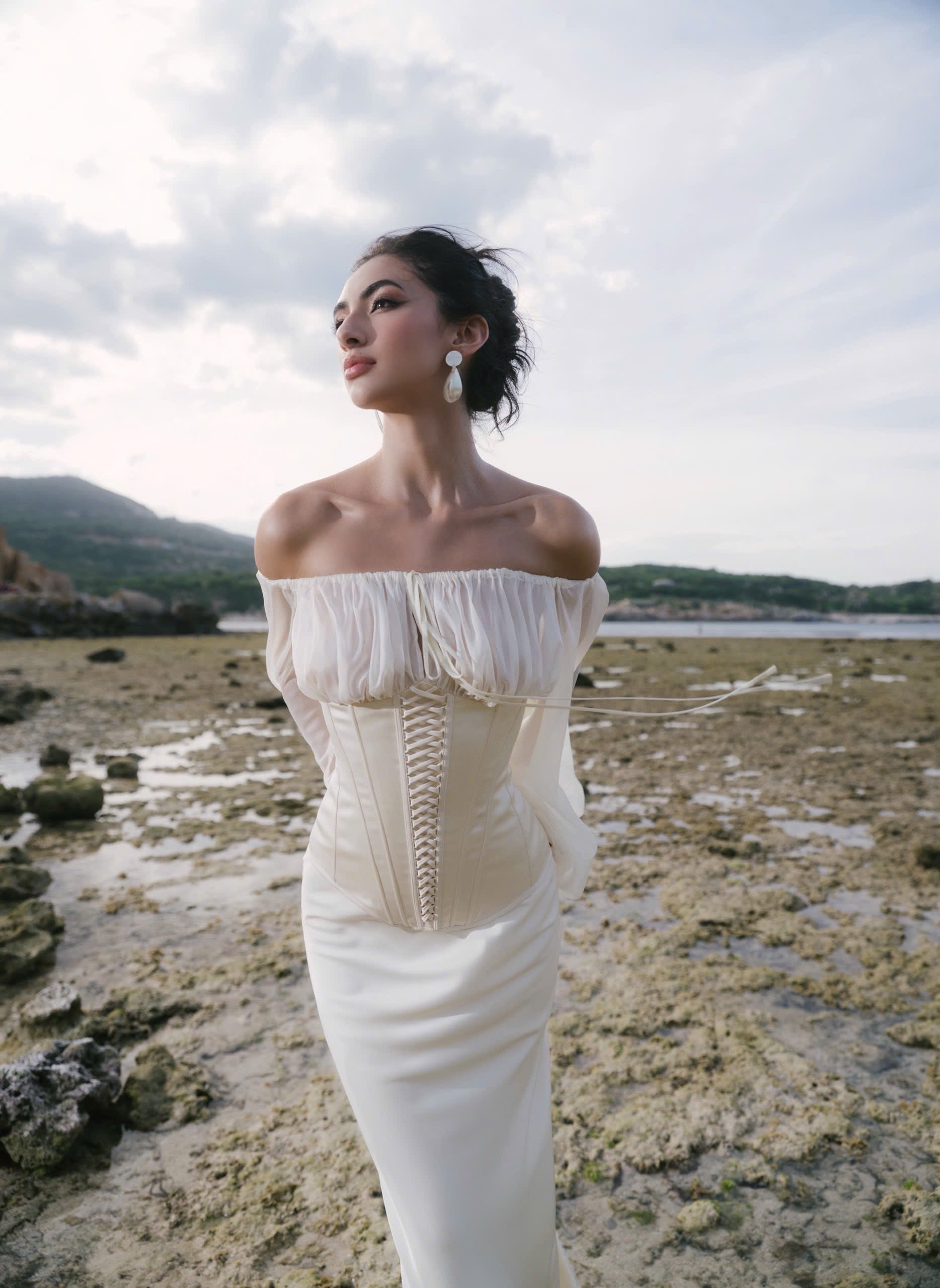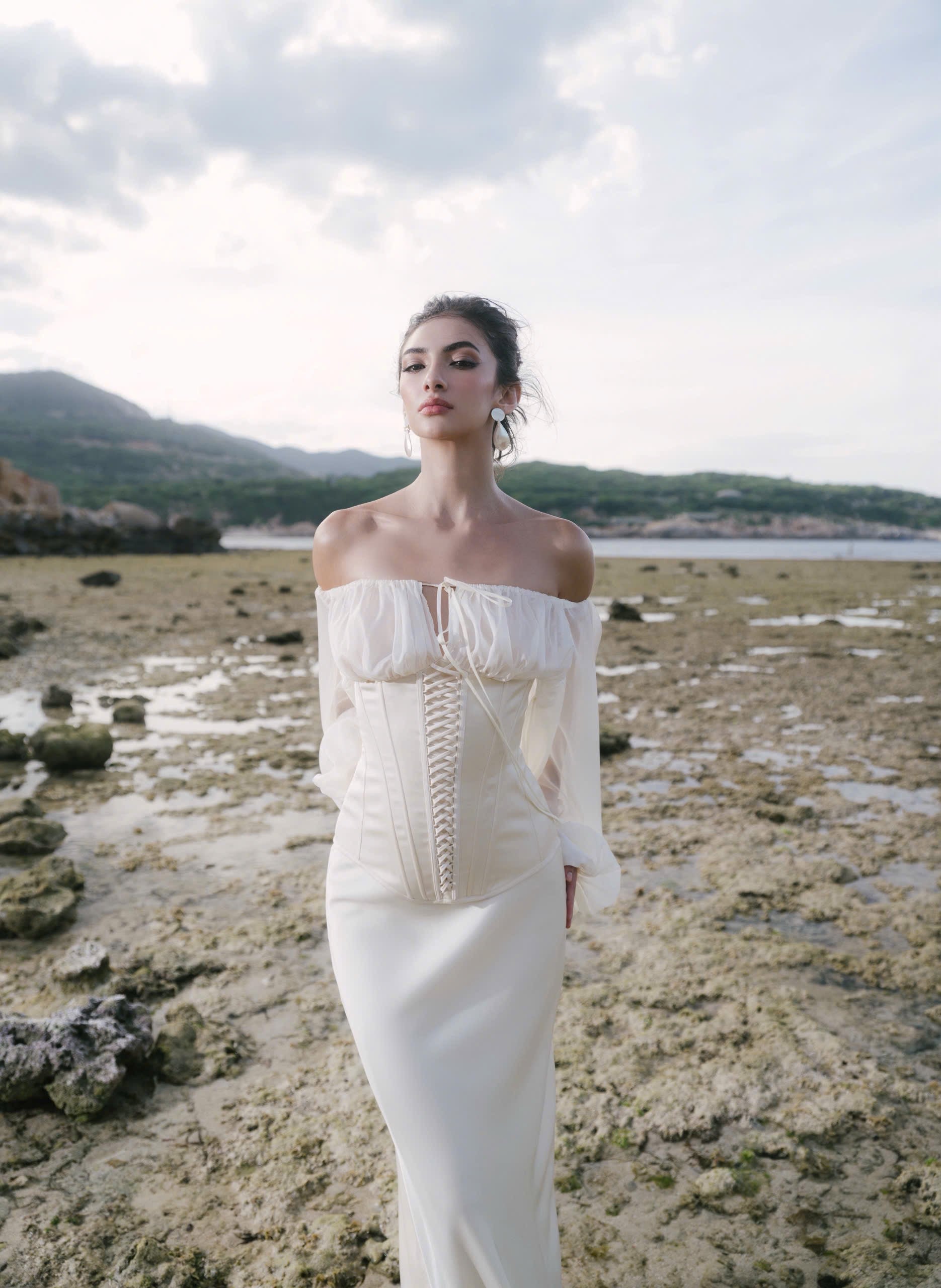 Like a fairytale ballad, the KAIA CORSET. With its structured bodice embracing every curve and dreamy organza sleeves flowing like clouds, this look is a celebration of strength wrapped in softness.