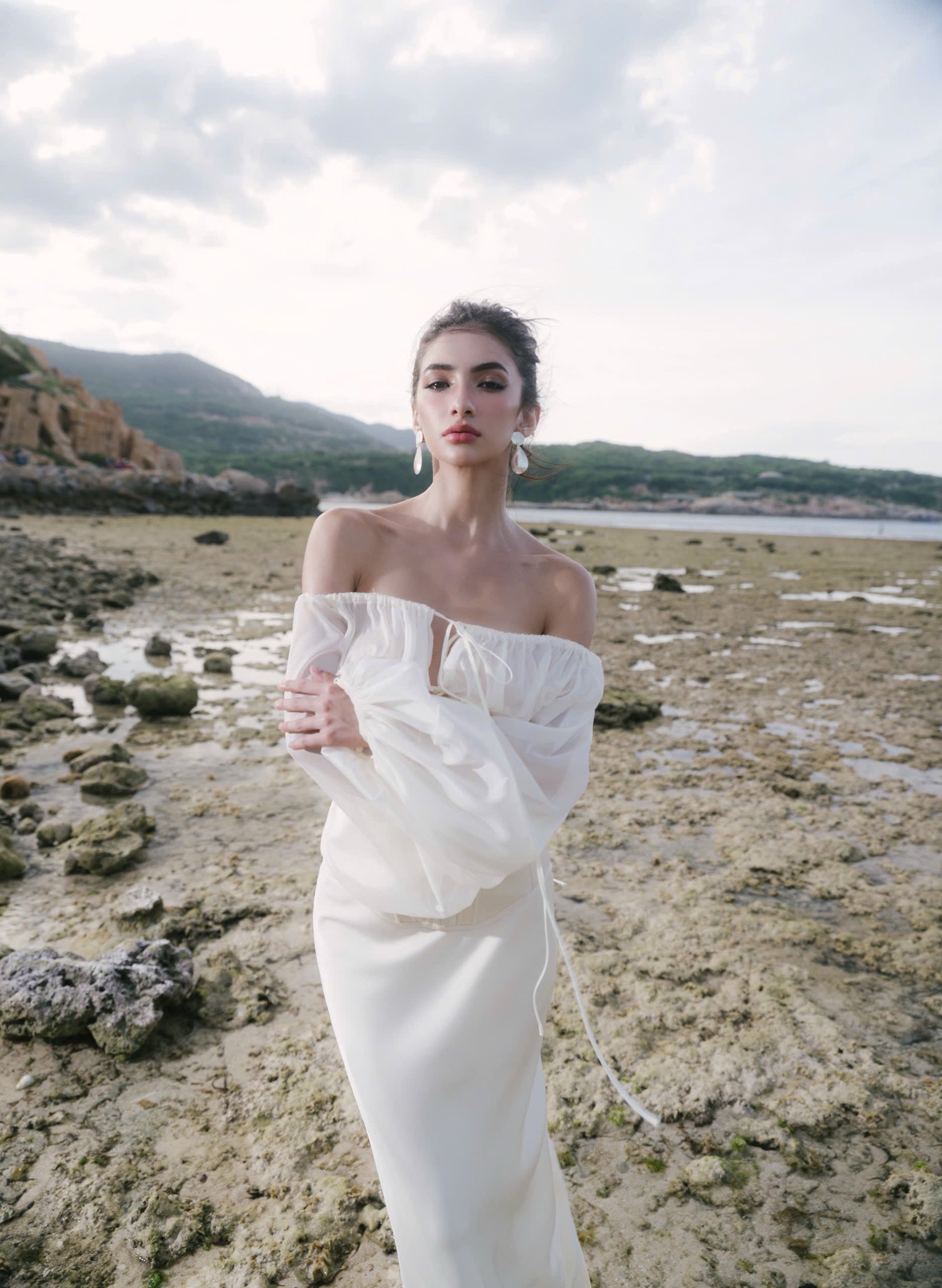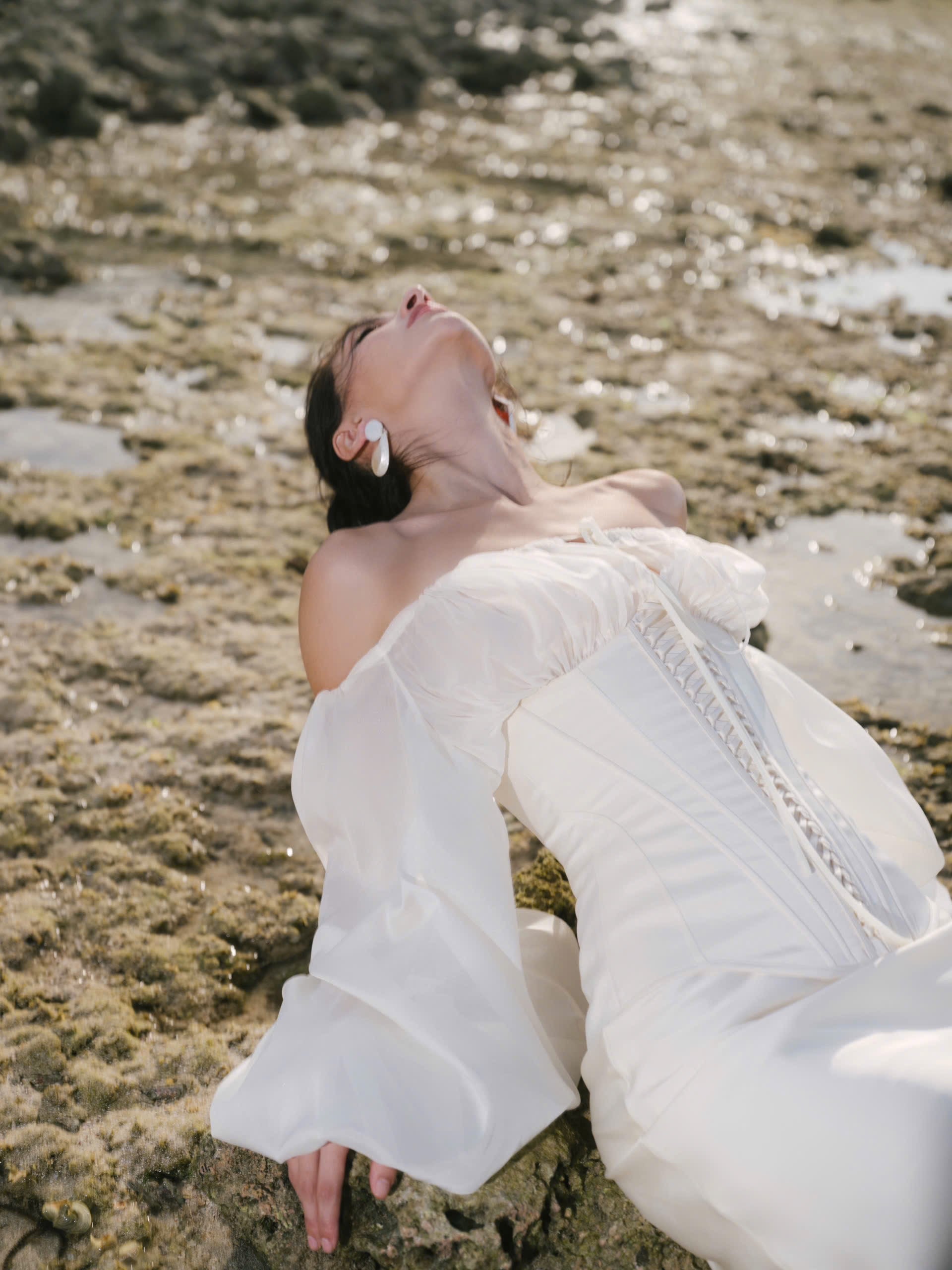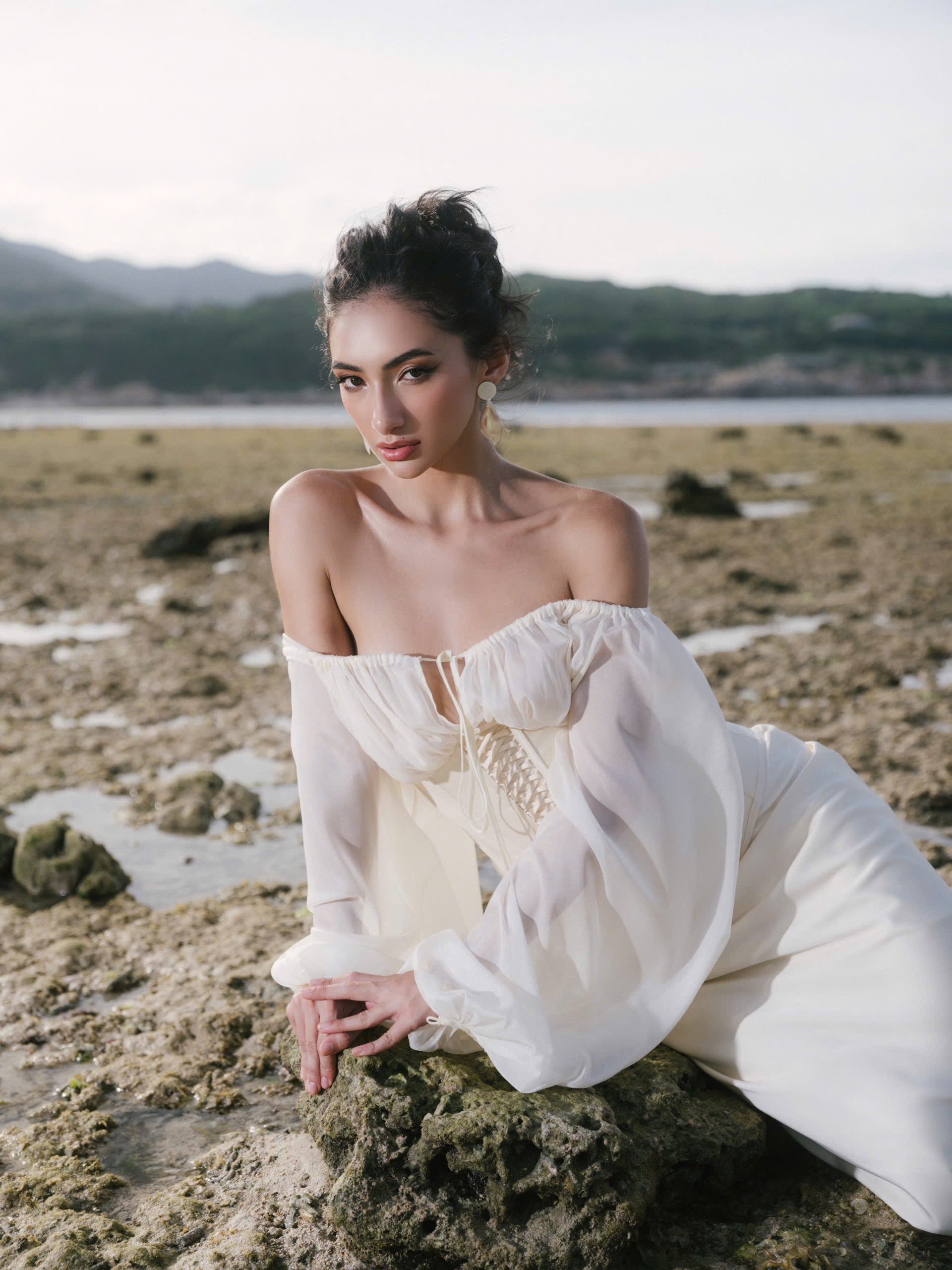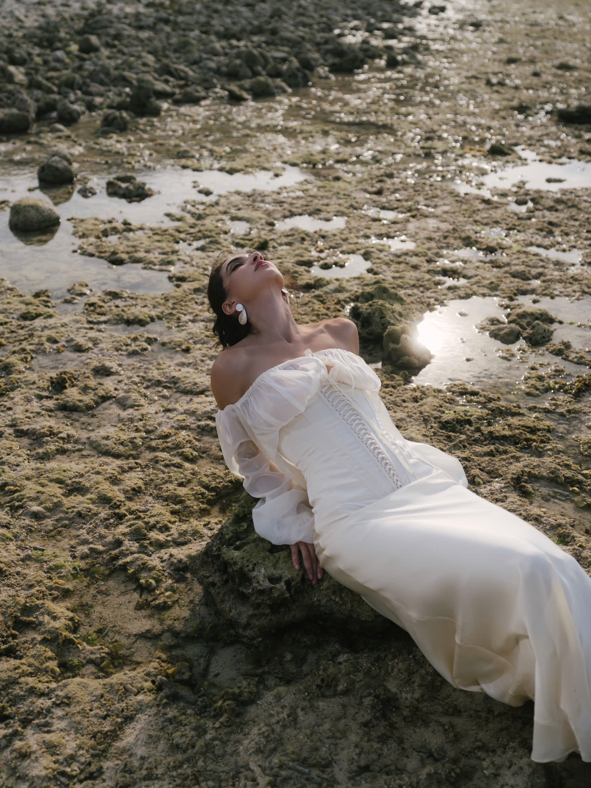 Like a fairytale ballad, the KAIA CORSET. With its structured bodice embracing every curve and dreamy organza sleeves flowing like clouds, this look is a celebration of strength wrapped in softness.