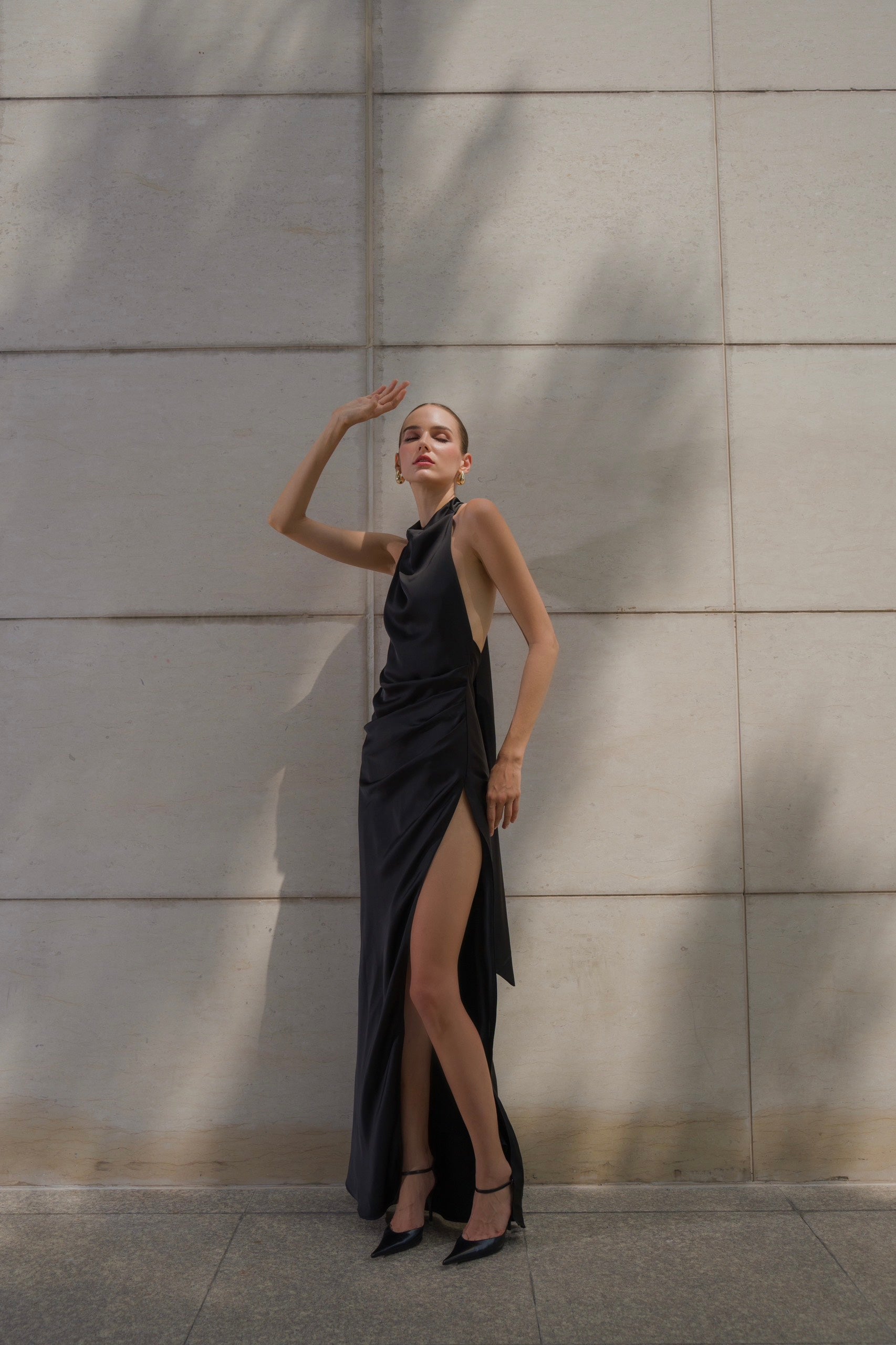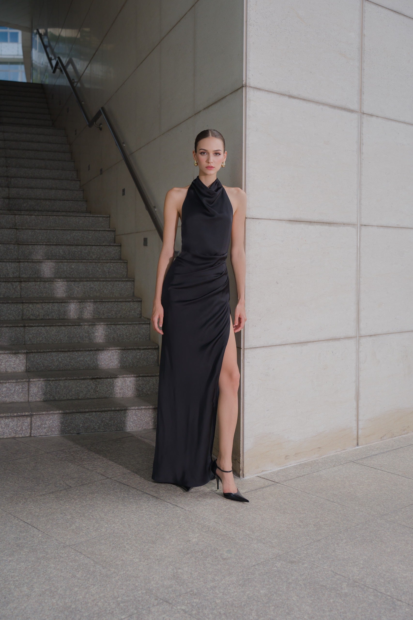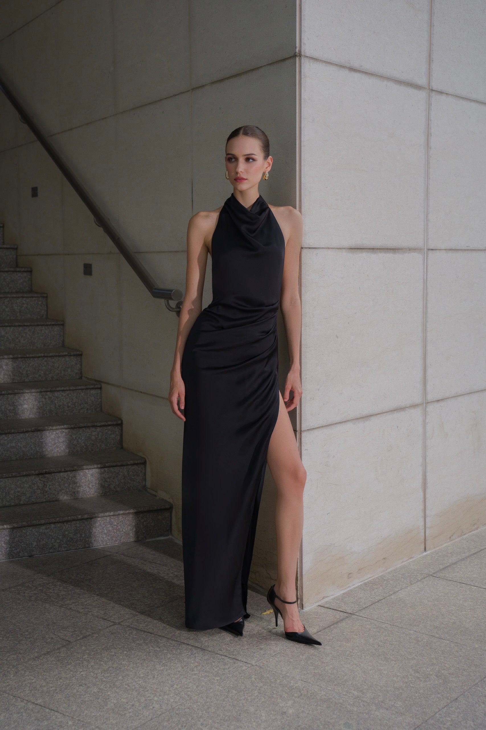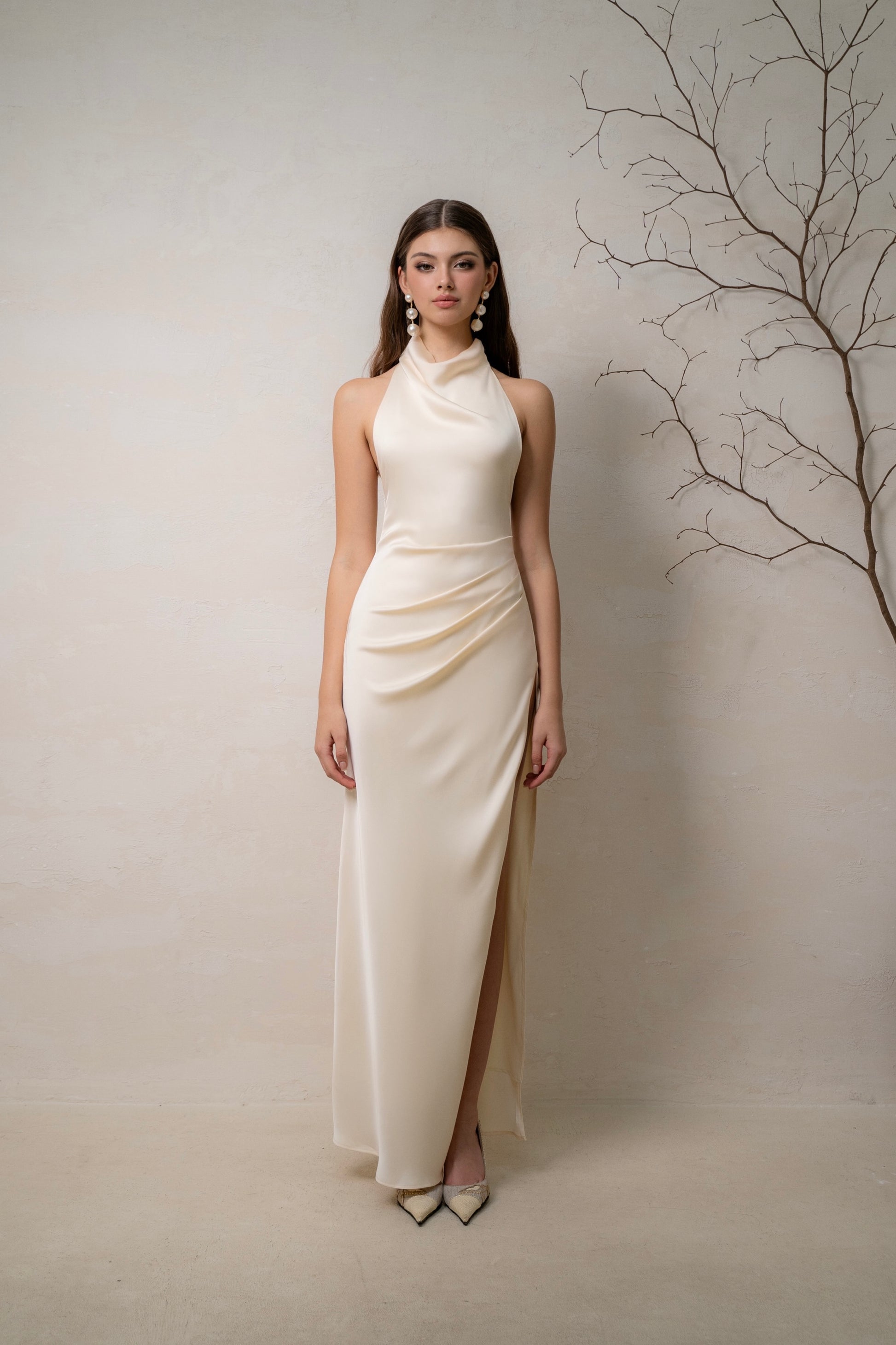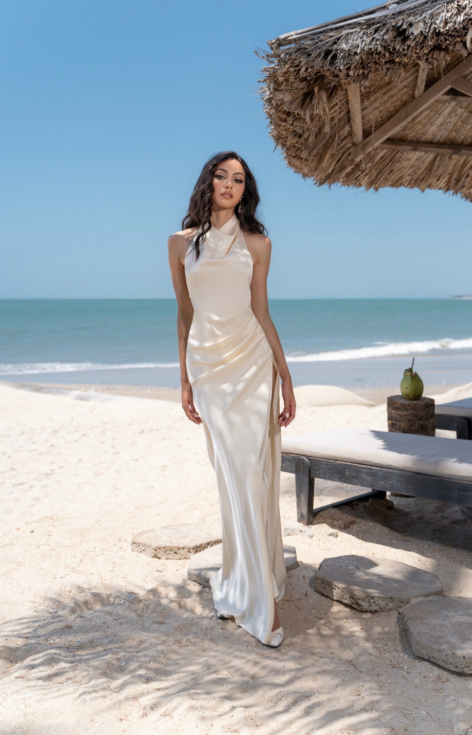 Thiết kế đầm lụa dài với phần xẻ tinh tế khoe trọn thân hình người mặc, cổ yếm với nếp xếp vừa vặn và dải dây buộc điệu đà khéo léo tăng thêm nét thanh lịch cho phần hở lưng.