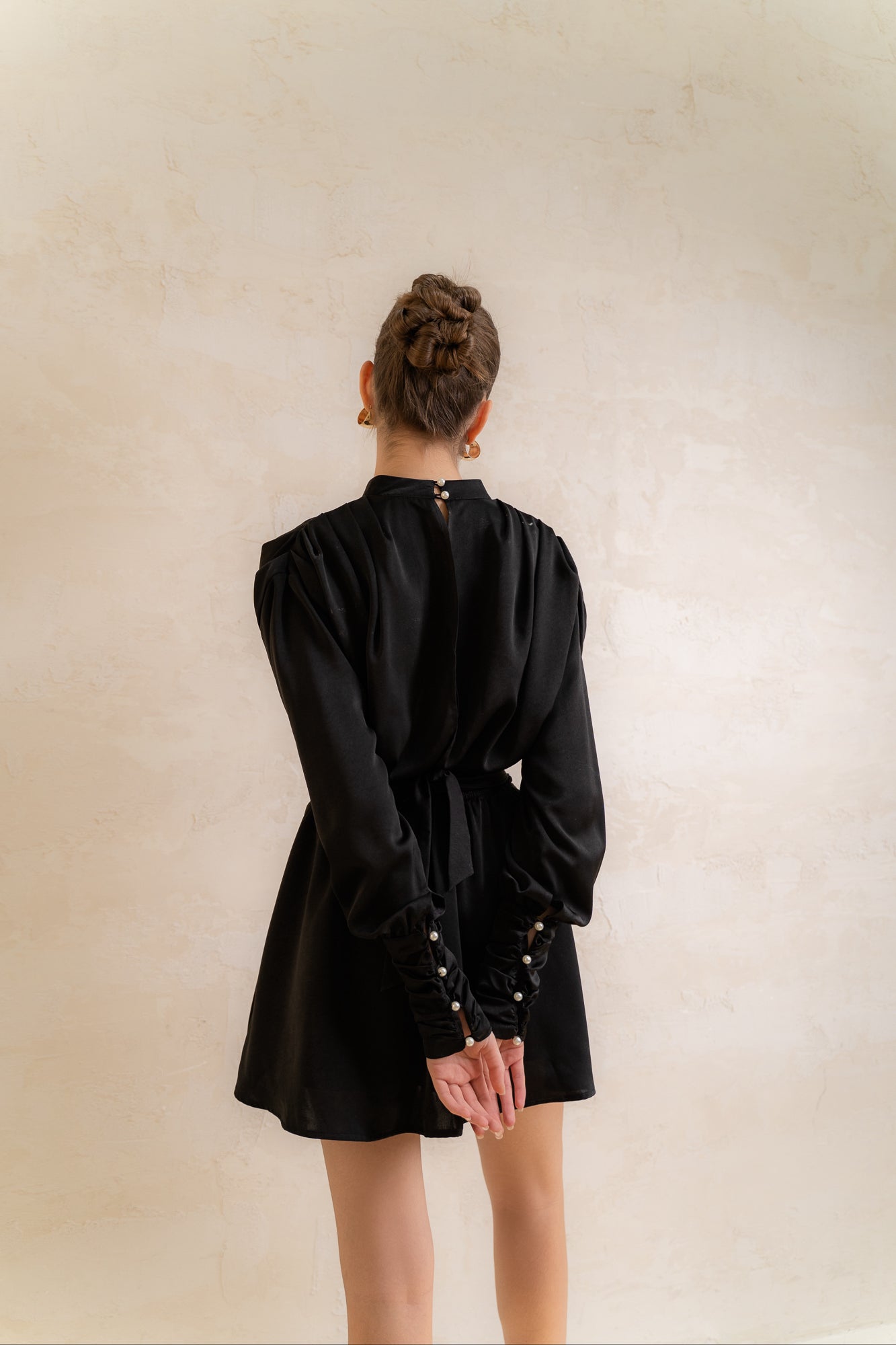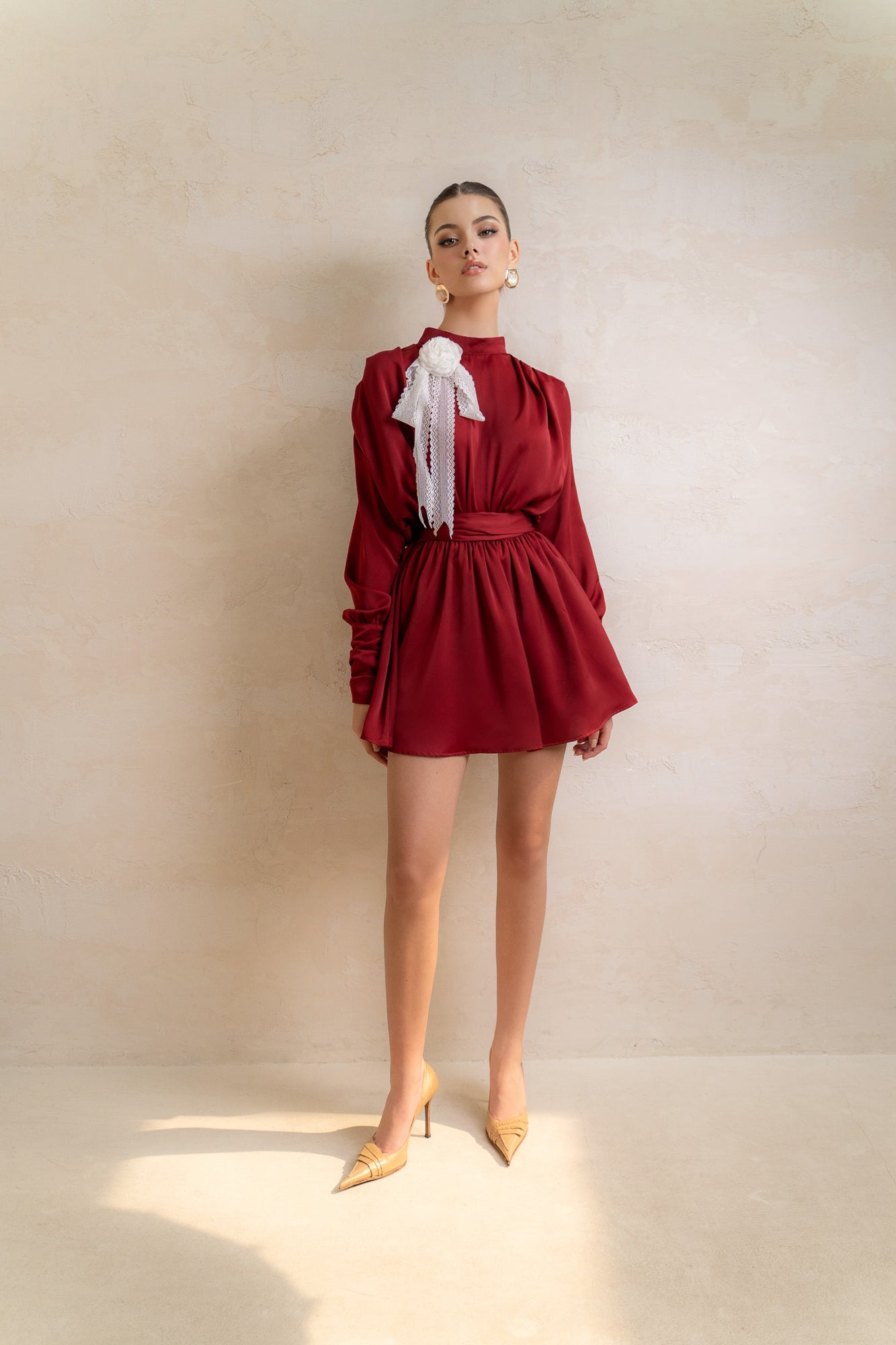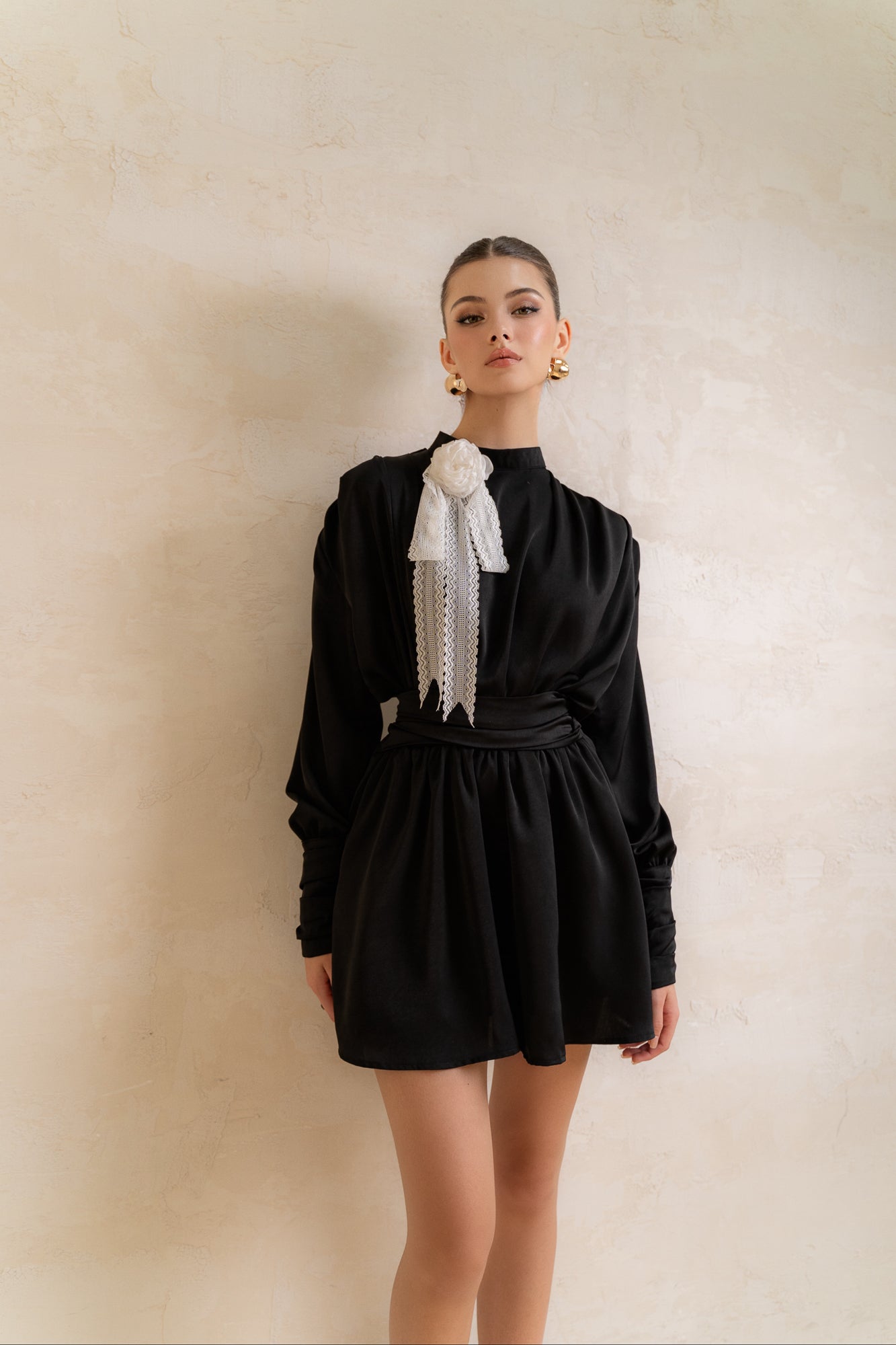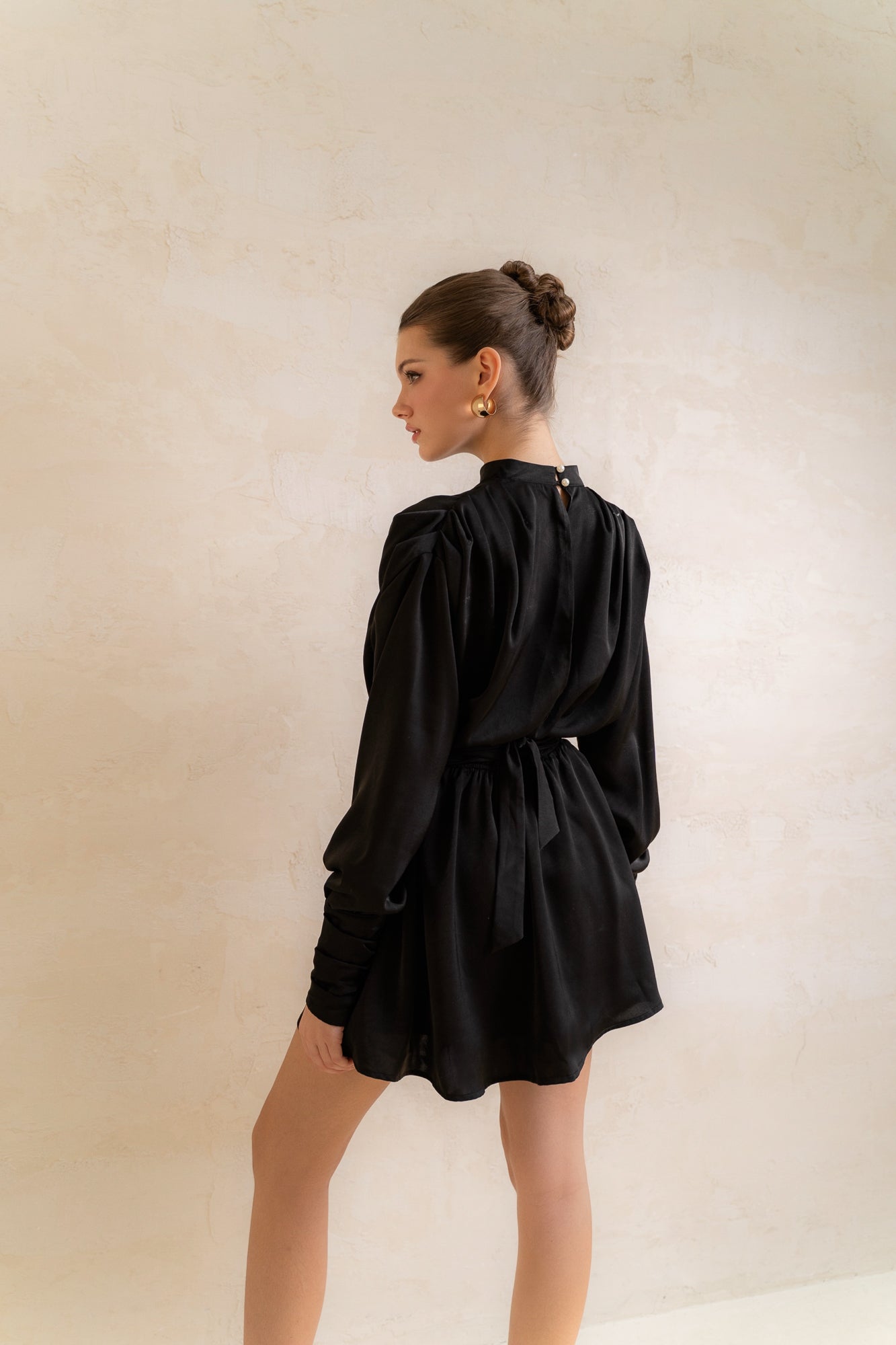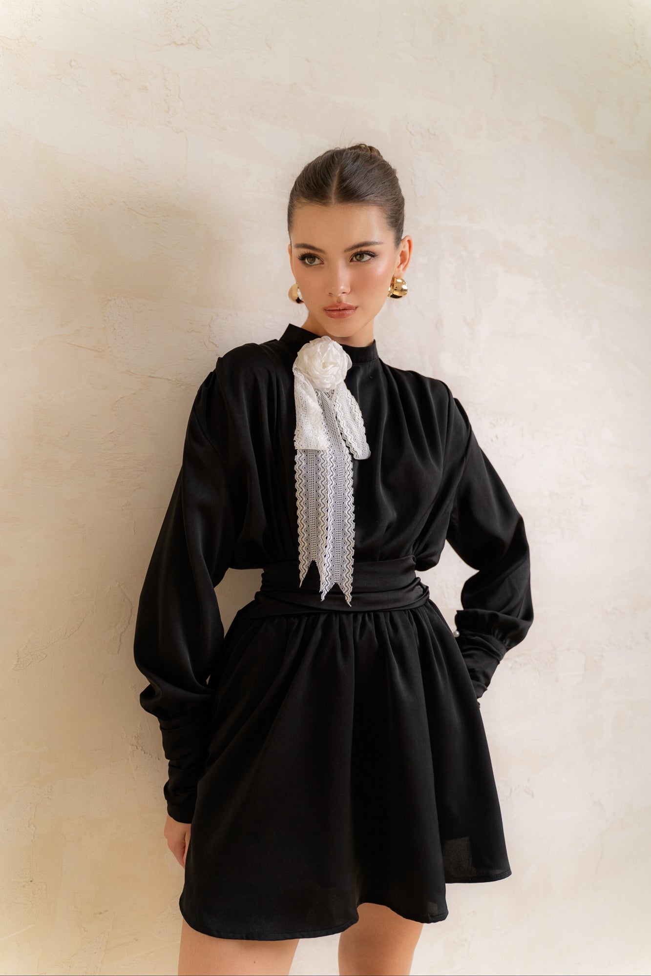 Ngọt ngào, thanh lịch và cổ điển, đó là những mô tả đặc trưng về thiết kế đầm lụa ngắn này. với phần tay dài, cổ cao tinh tế kết hợp với chân váy ngắn tạo nên một tổng thể pha trộn thú vị và vô cùng duyên dáng.