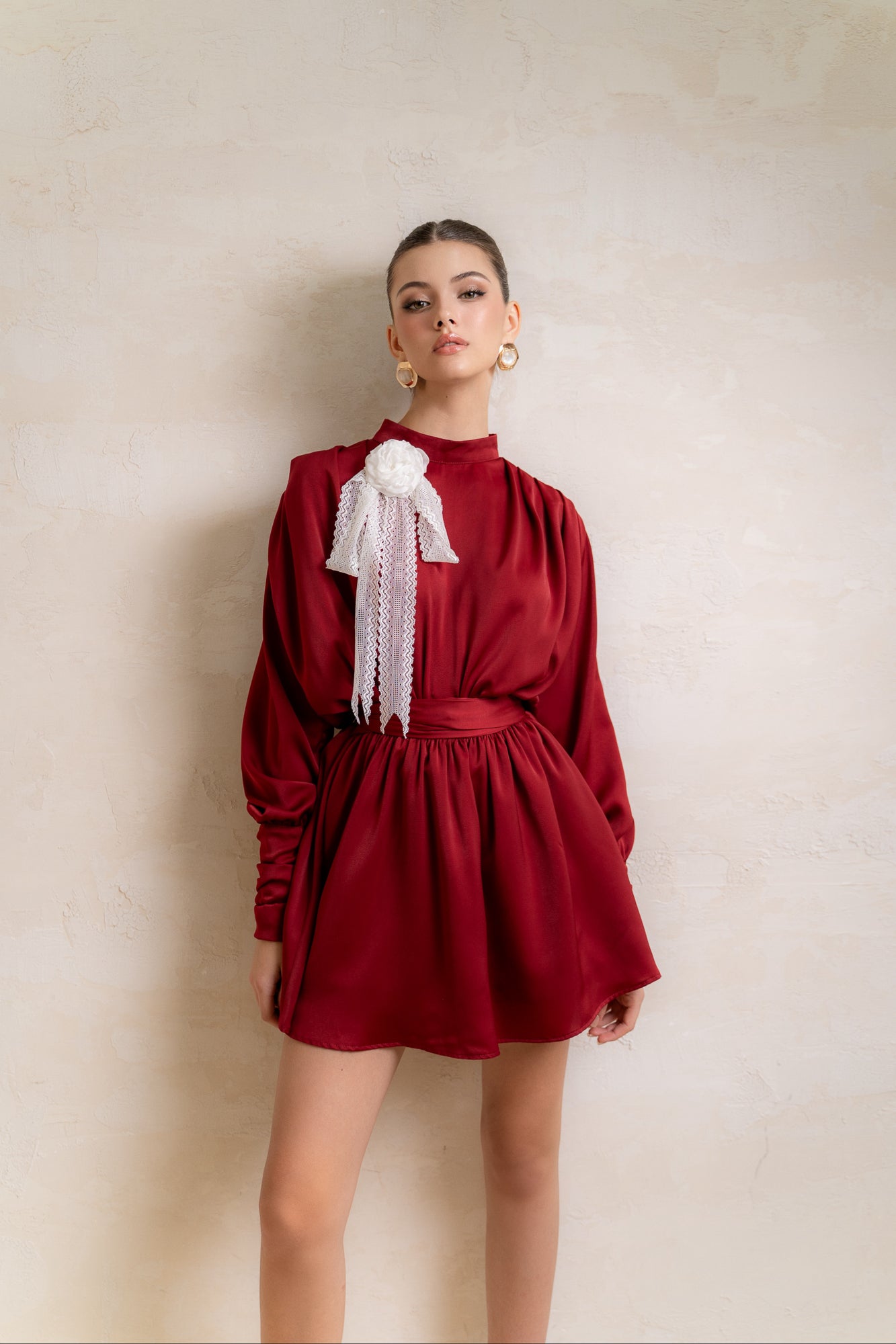 Sweet, elegant and classic, those are the typical descriptions of this short silk dress design. With long sleeves and a delicate high neck combined with a short skirt, it creates an interesting and extremely charming blend.