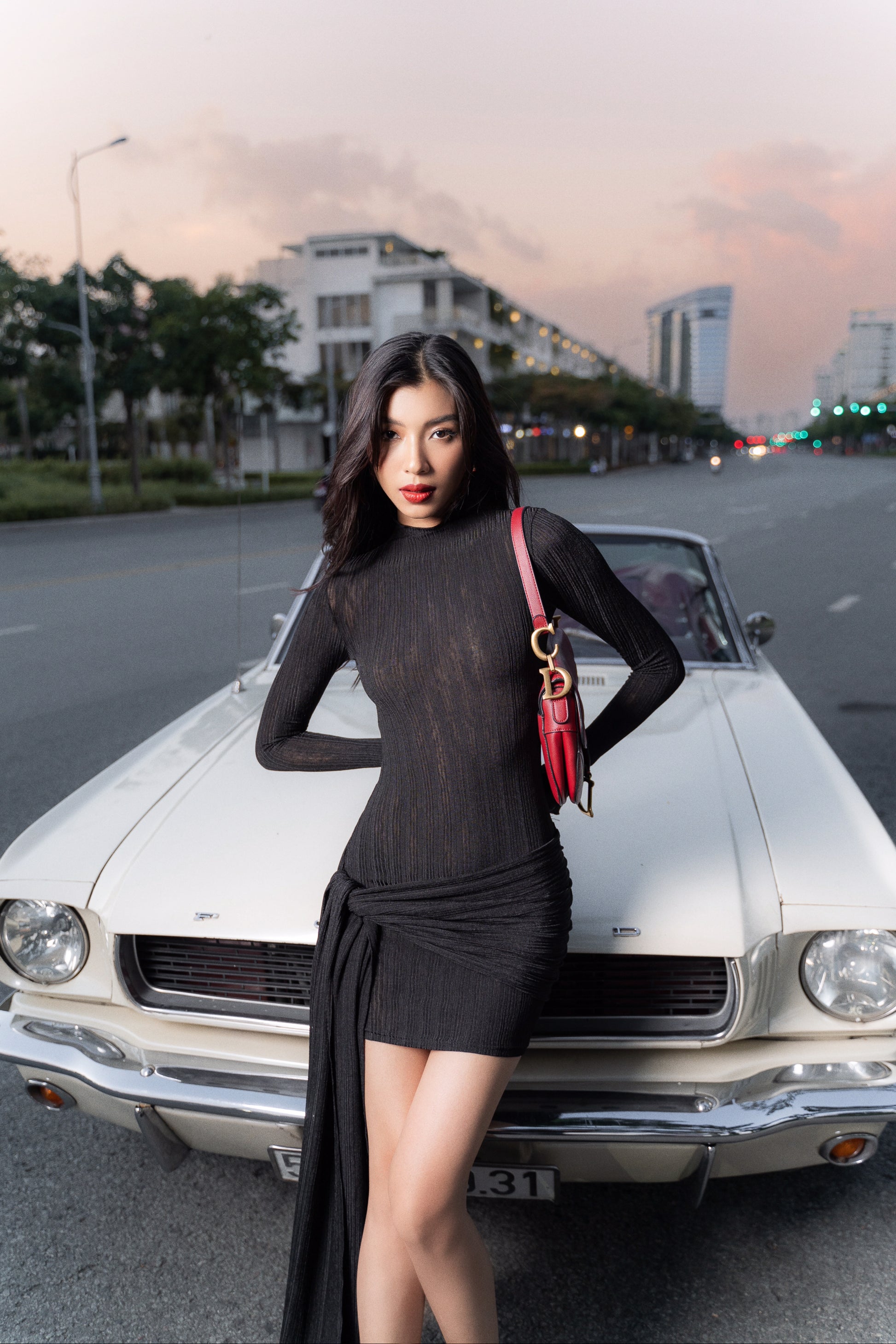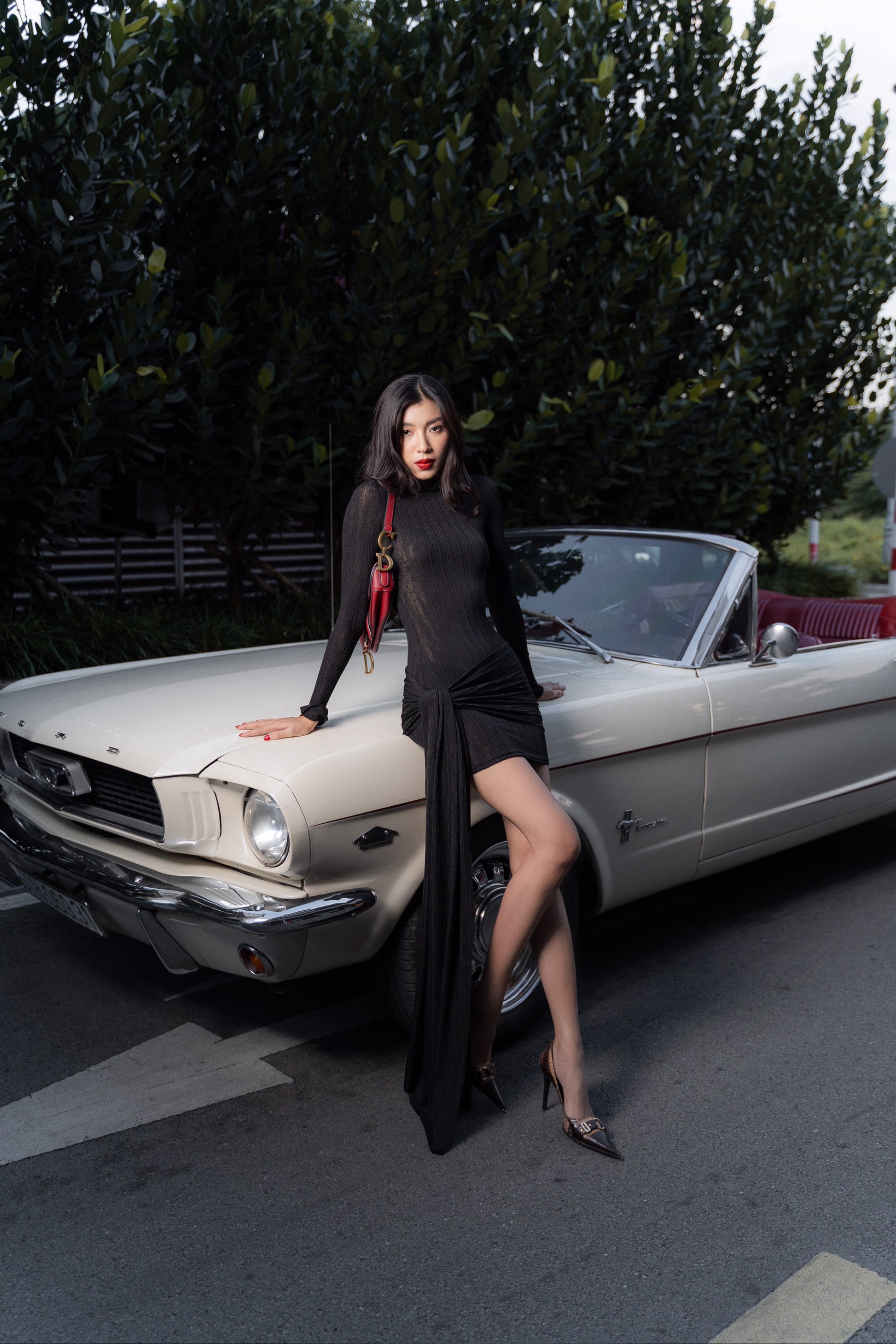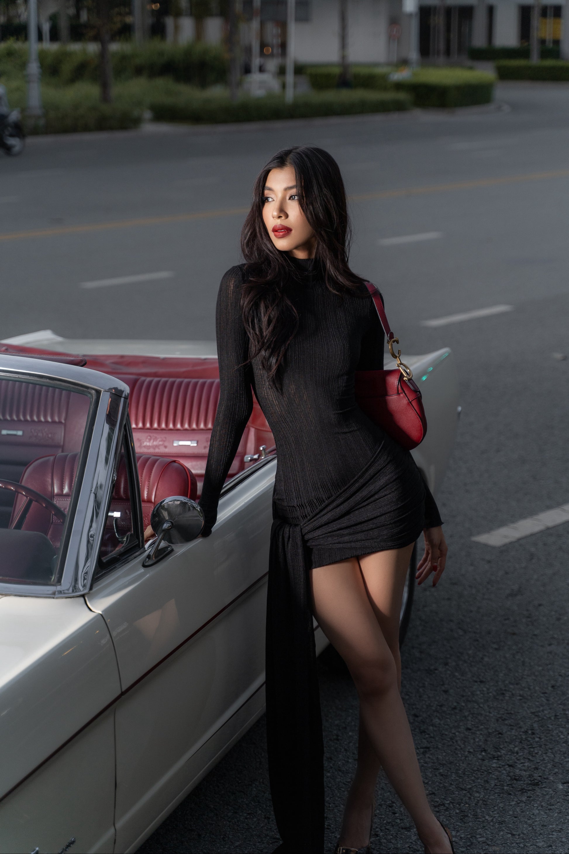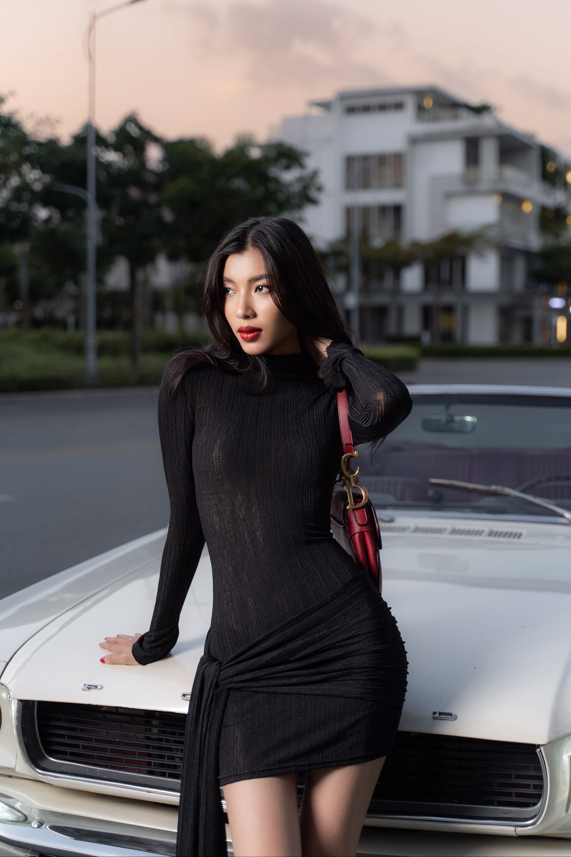Đầm ngắn ôm sát với tay dài, cổ lọ và điểm nhấn vạt dài quấn quanh hông tinh tế, vừa đủ gợi cảm vừa đủ thanh lịch, phù hợp với nhiều hoàn cảnh sử dụng bao gồm cả tiệc tùng.