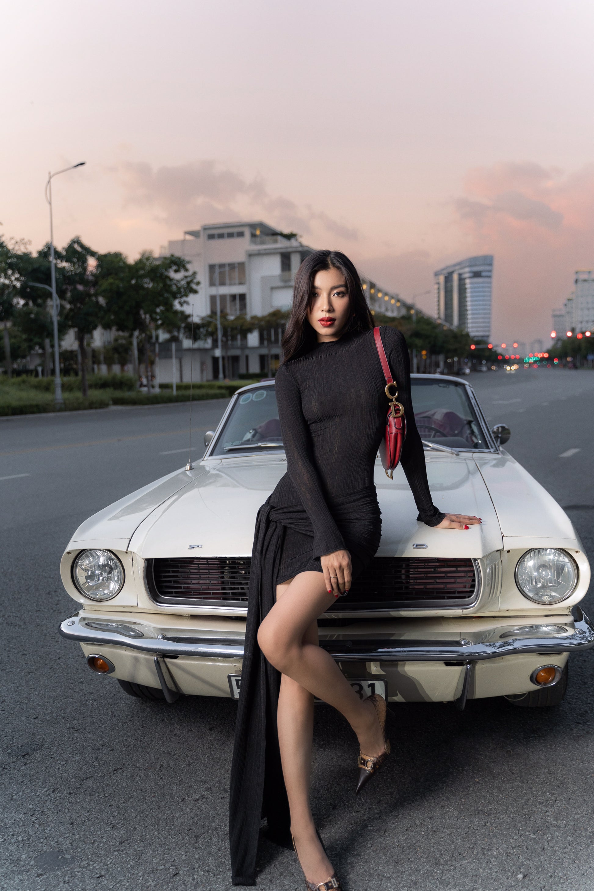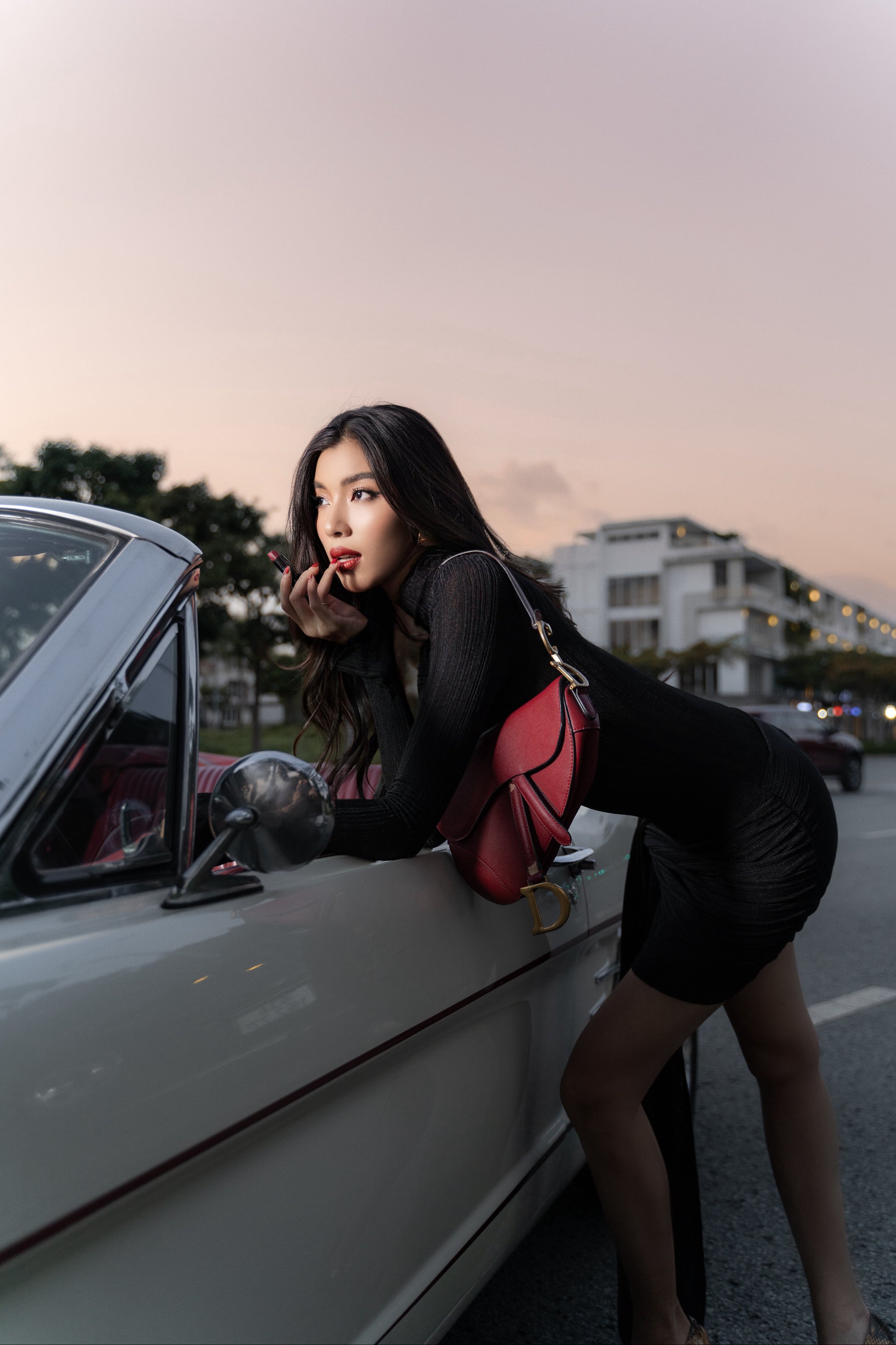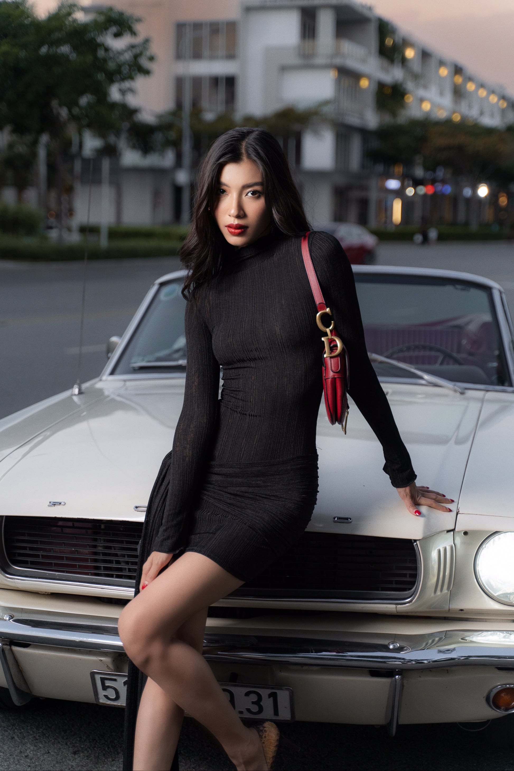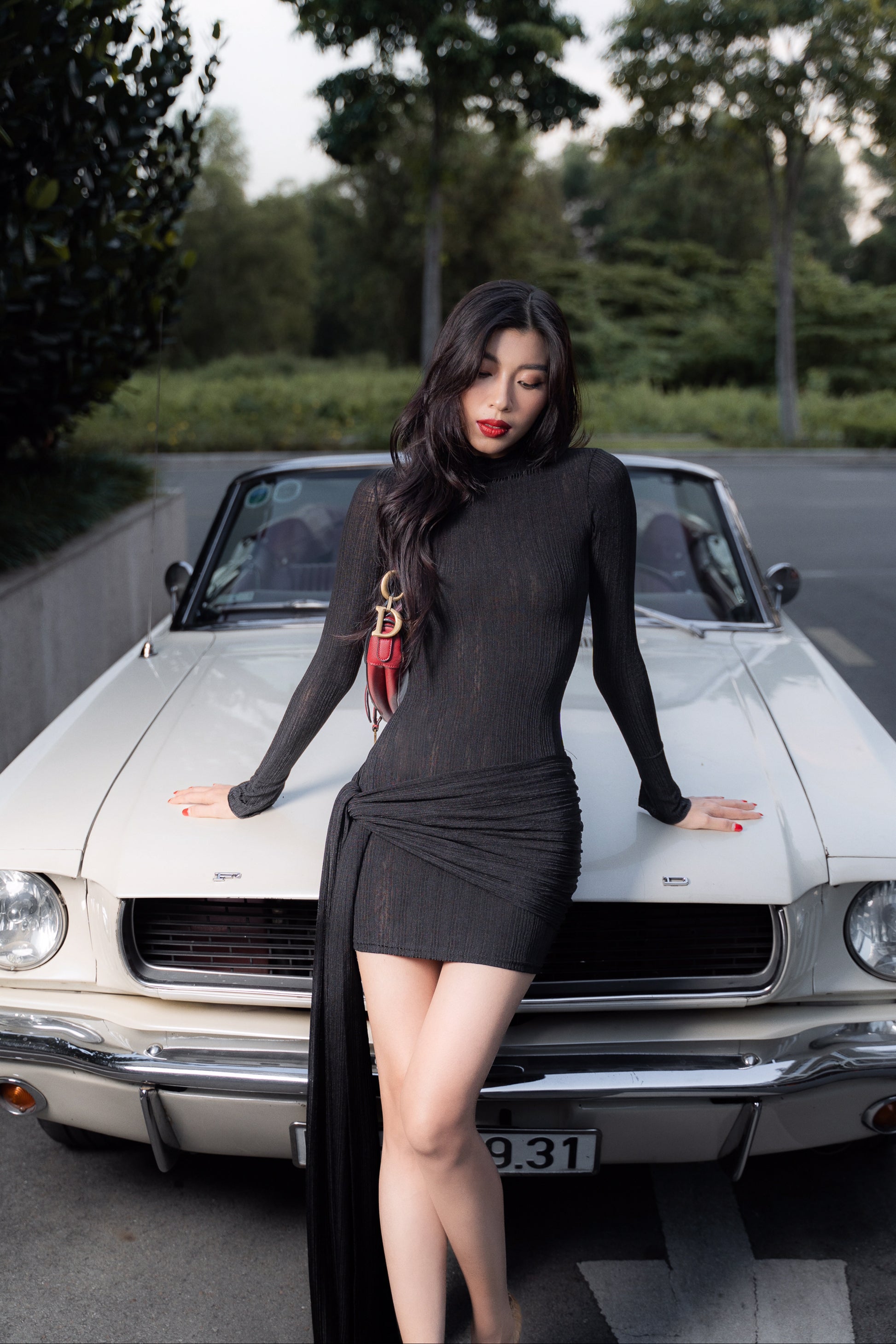 Đầm ngắn ôm sát với tay dài, cổ lọ và điểm nhấn vạt dài quấn quanh hông tinh tế, vừa đủ gợi cảm vừa đủ thanh lịch, phù hợp với nhiều hoàn cảnh sử dụng bao gồm cả tiệc tùng.