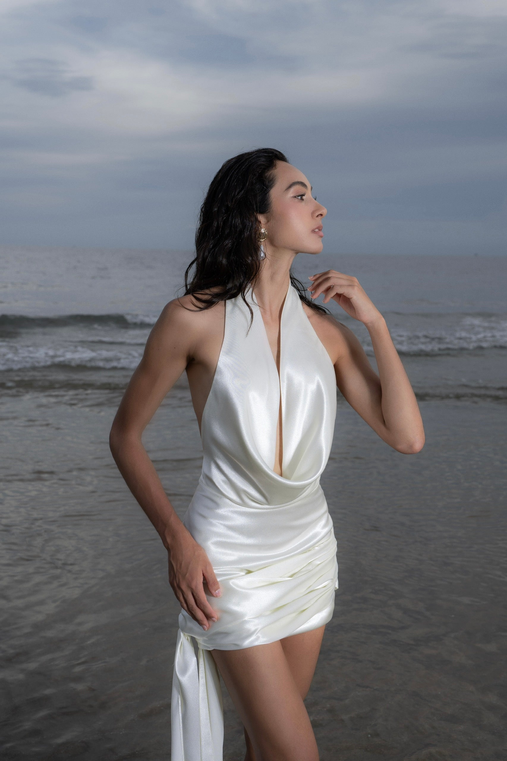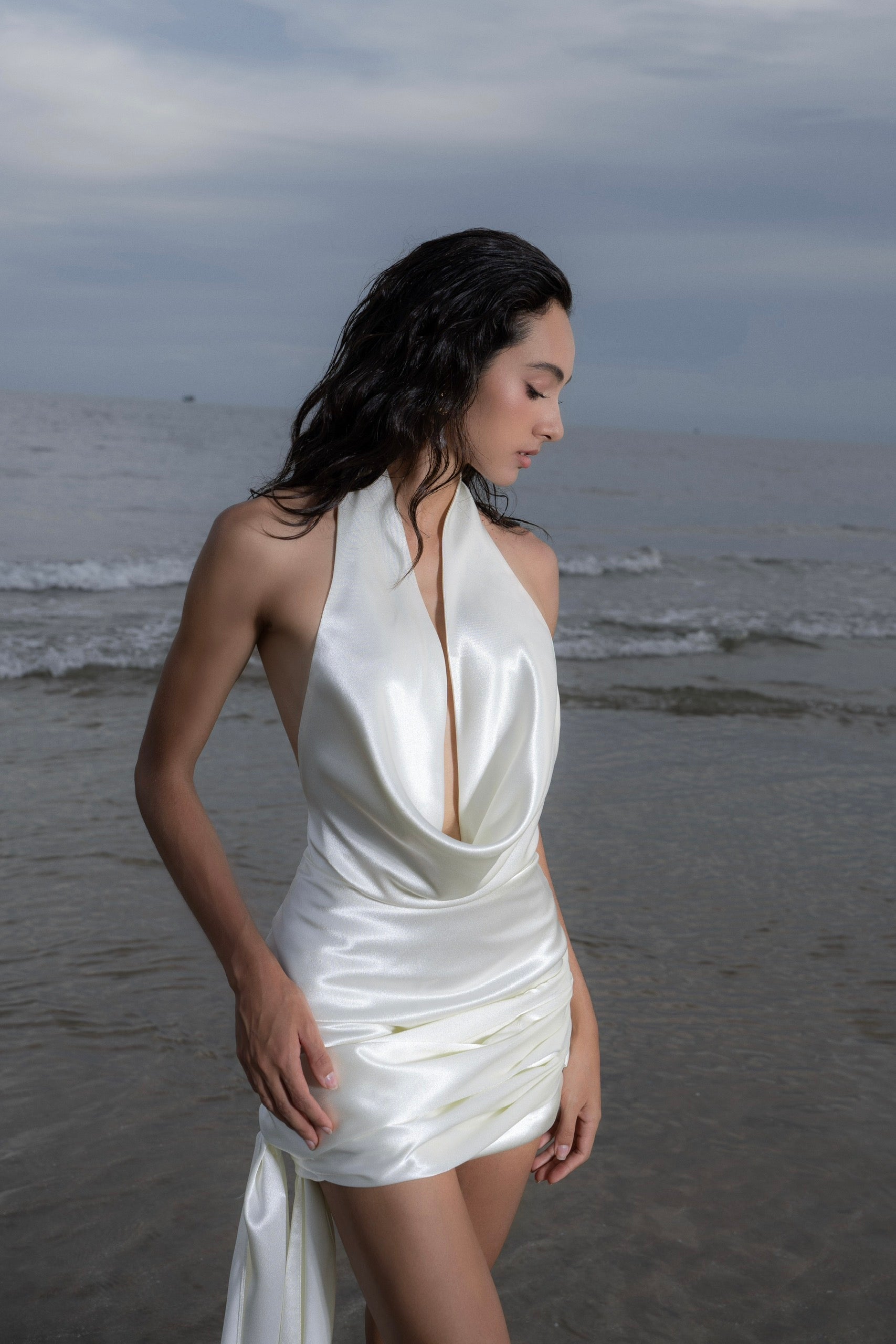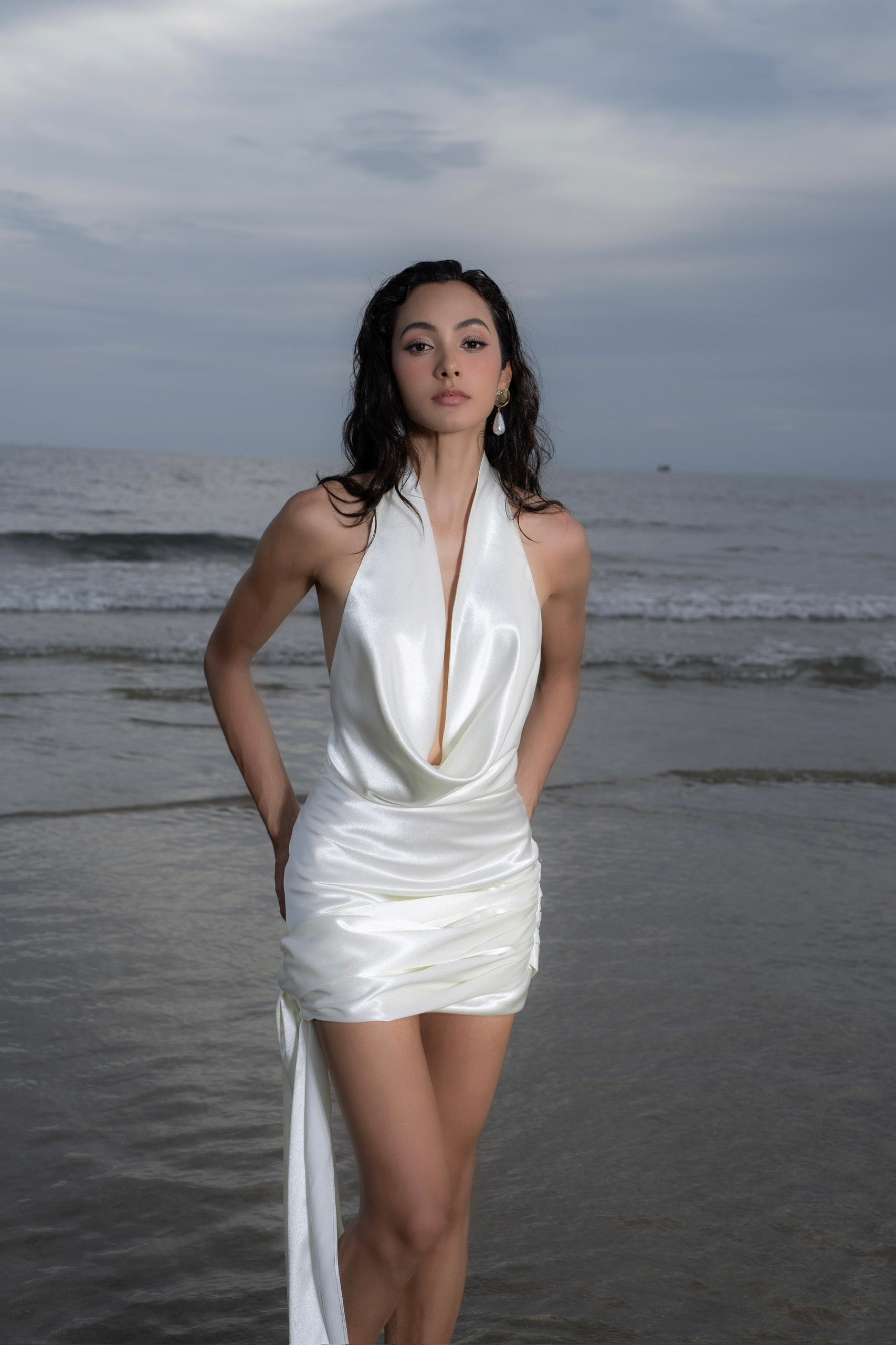 Đầm lụa ngắn cao cấp với màu trắng kem, phần cổ đổ, khoét lưng sâu tinh tế và điểm nhấn dải lụa đính hoa ở gấu váy phù hợp sử dụng trong nhiều dịp đặc biệt.
