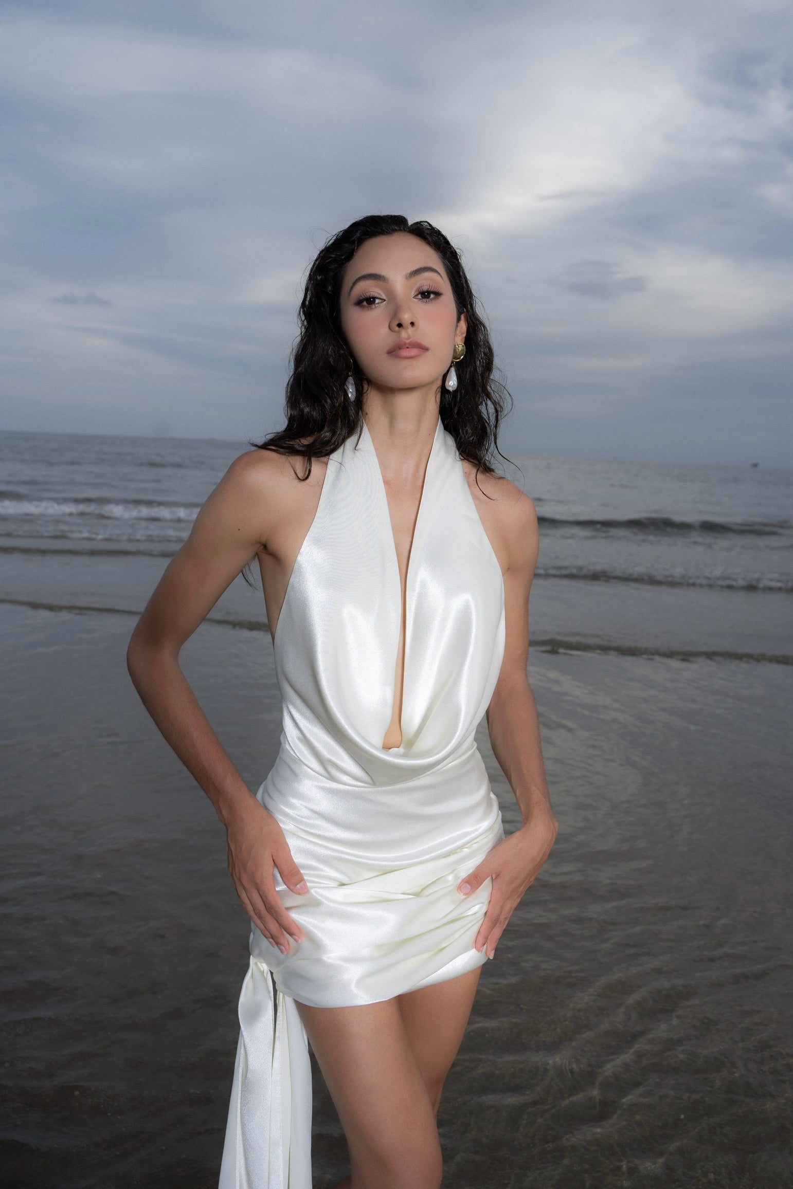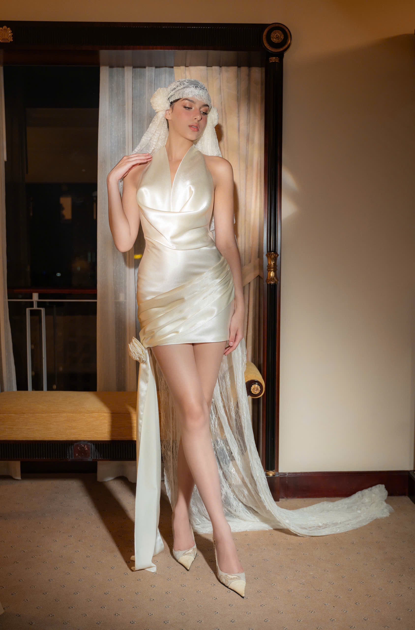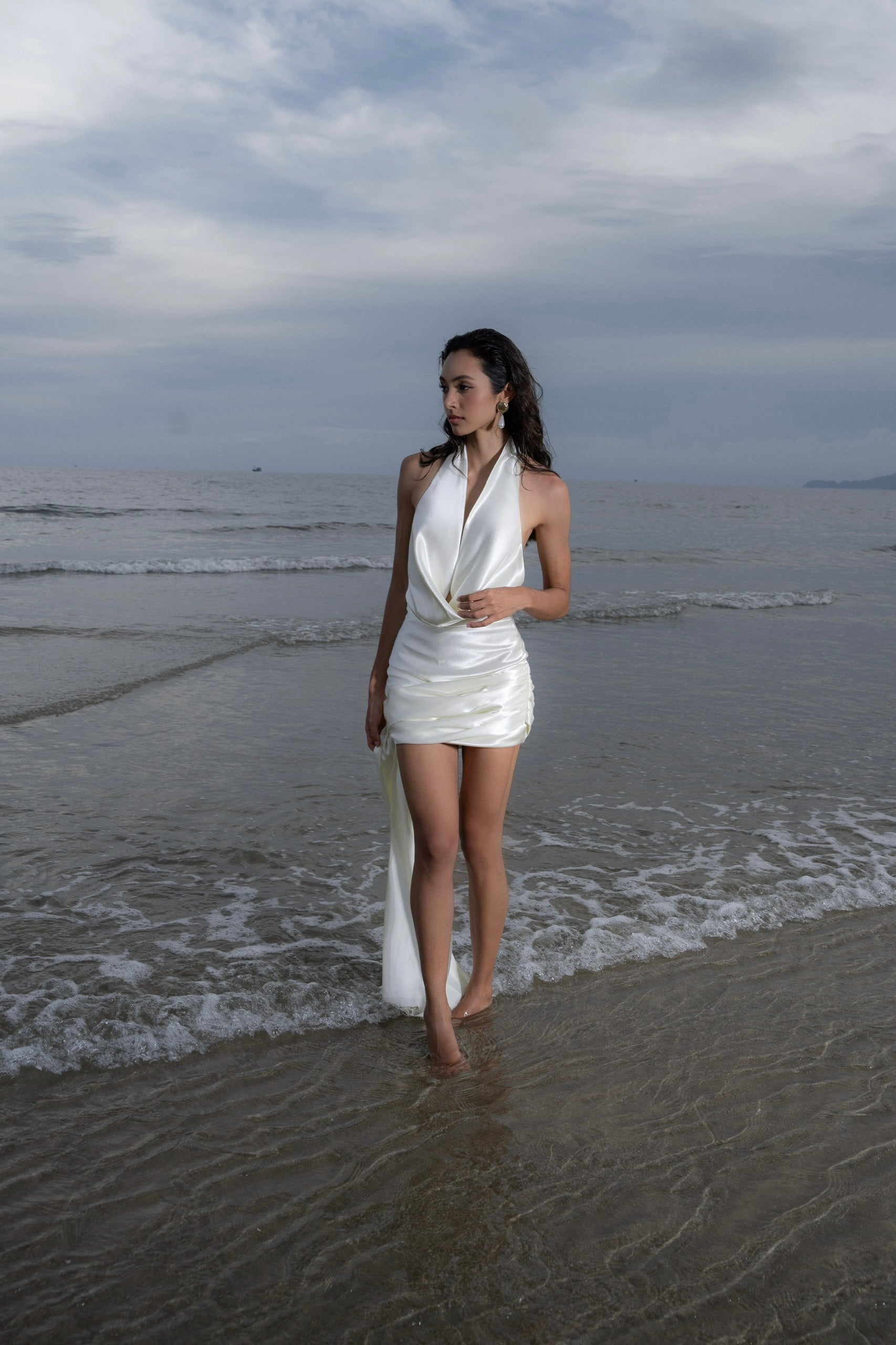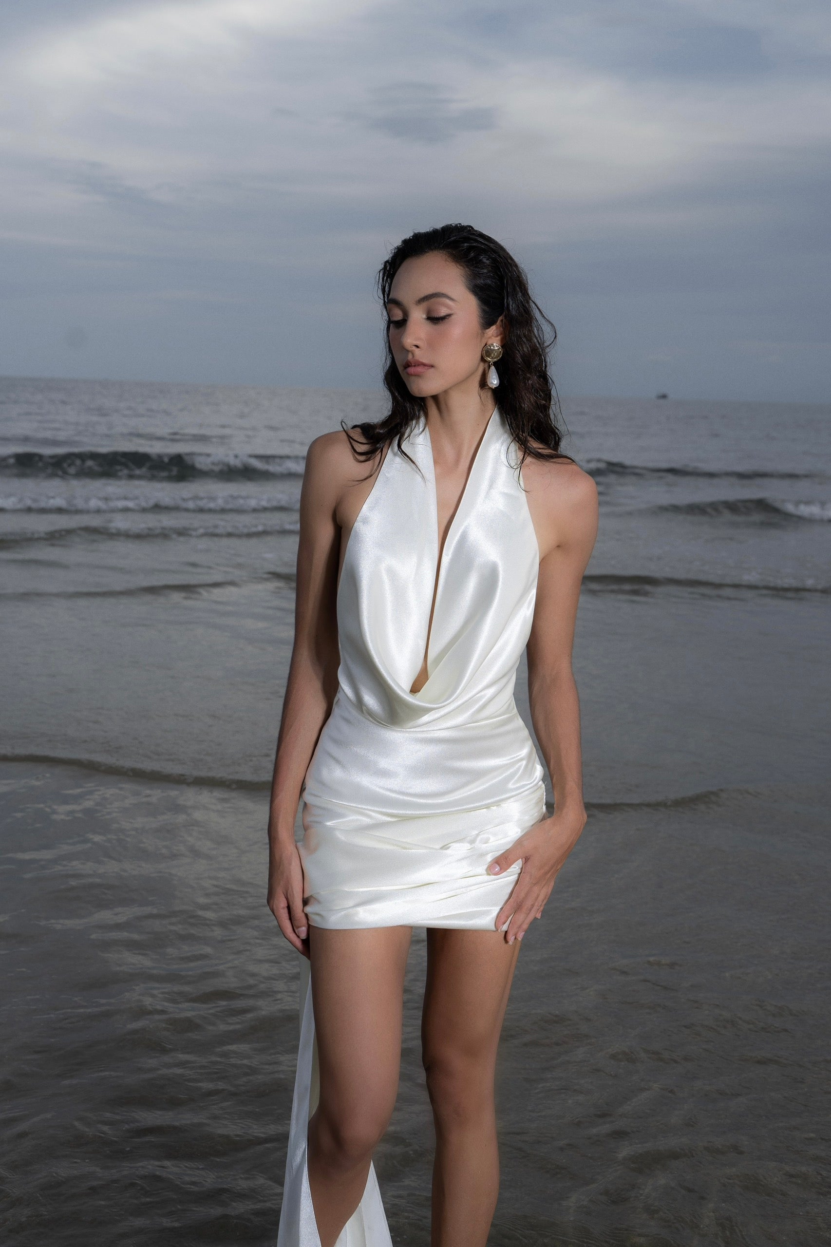 Đầm lụa ngắn cao cấp với màu trắng kem, phần cổ đổ, khoét lưng sâu tinh tế và điểm nhấn dải lụa đính hoa ở gấu váy phù hợp sử dụng trong nhiều dịp đặc biệt.