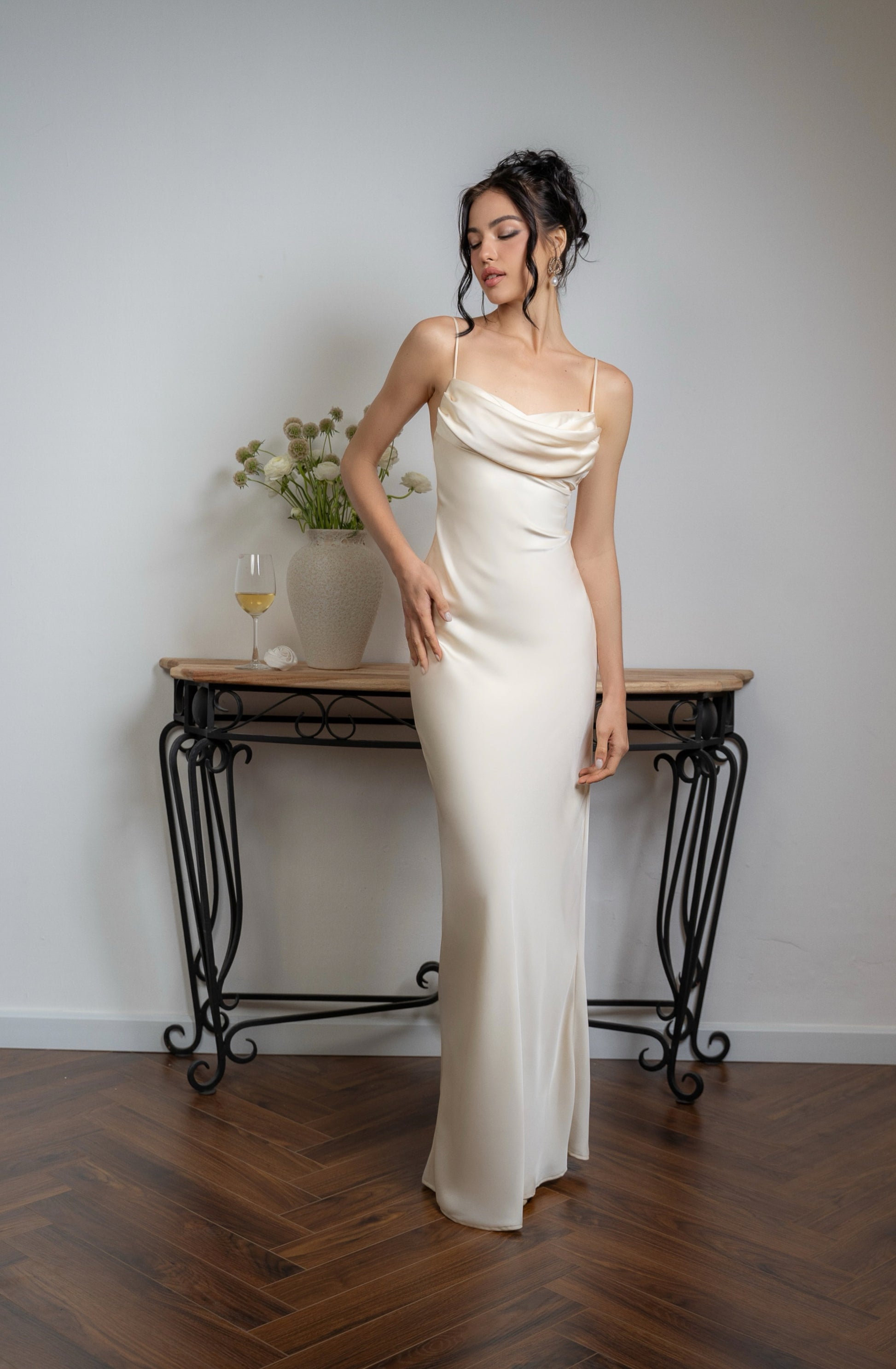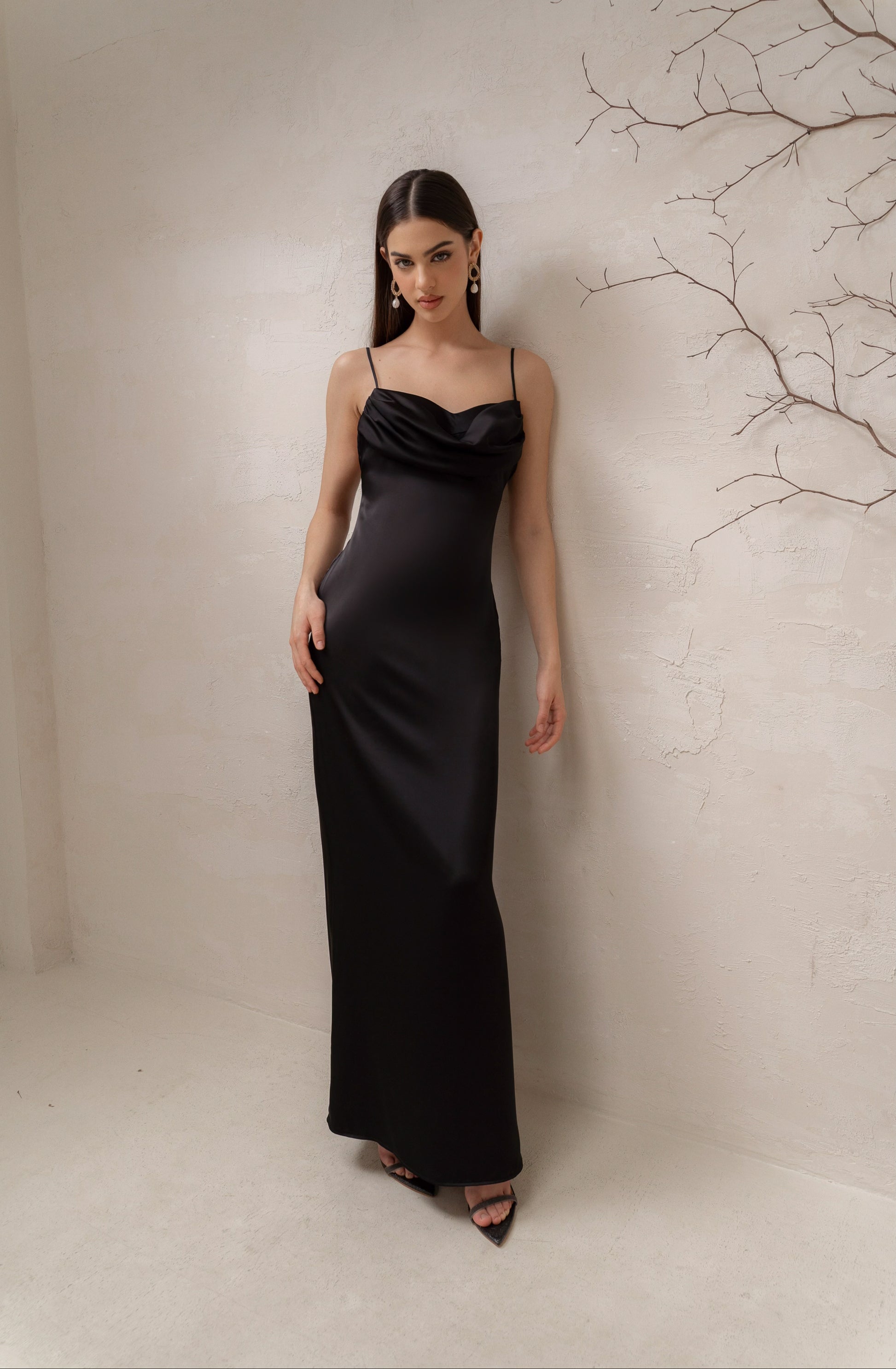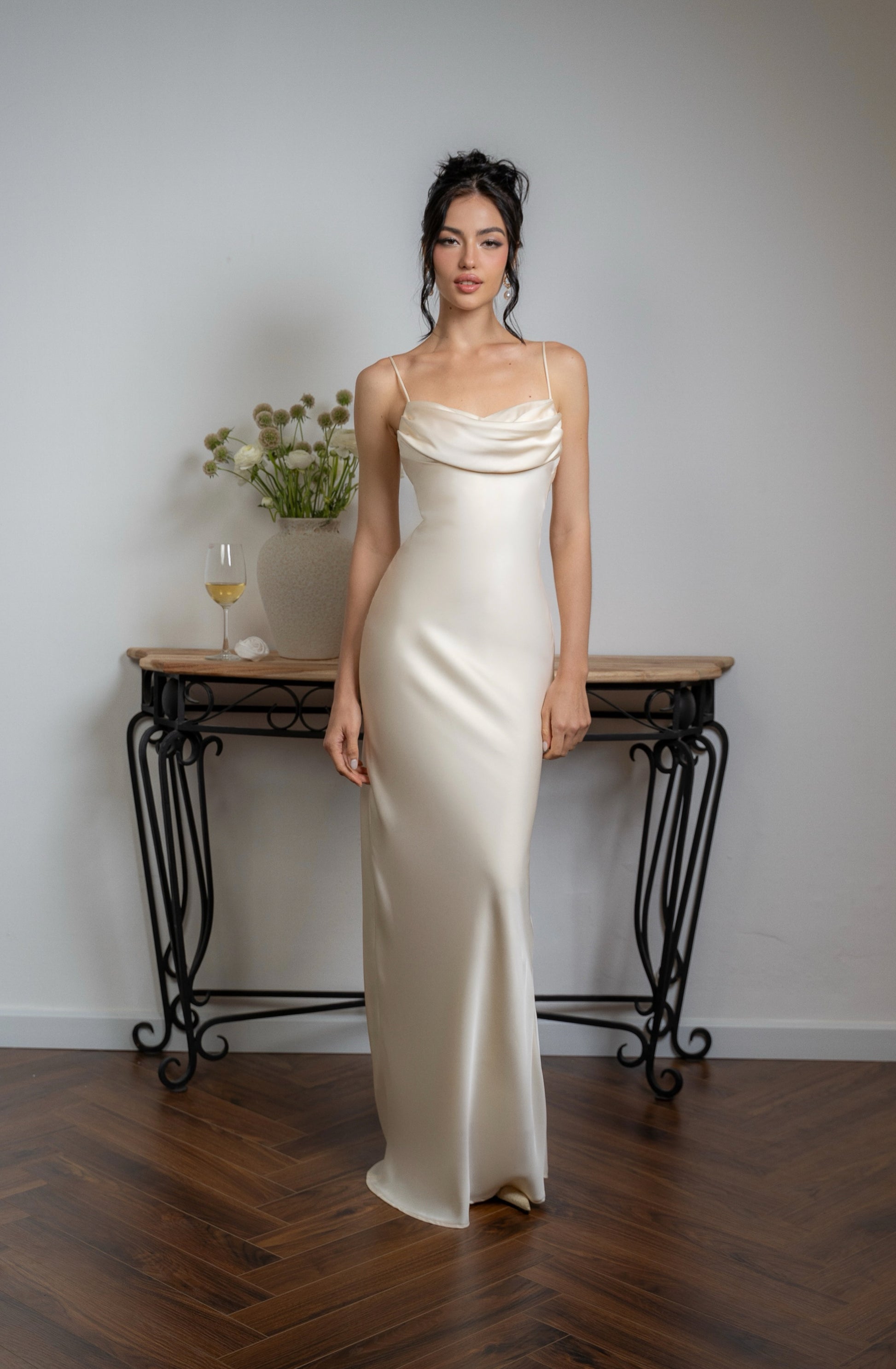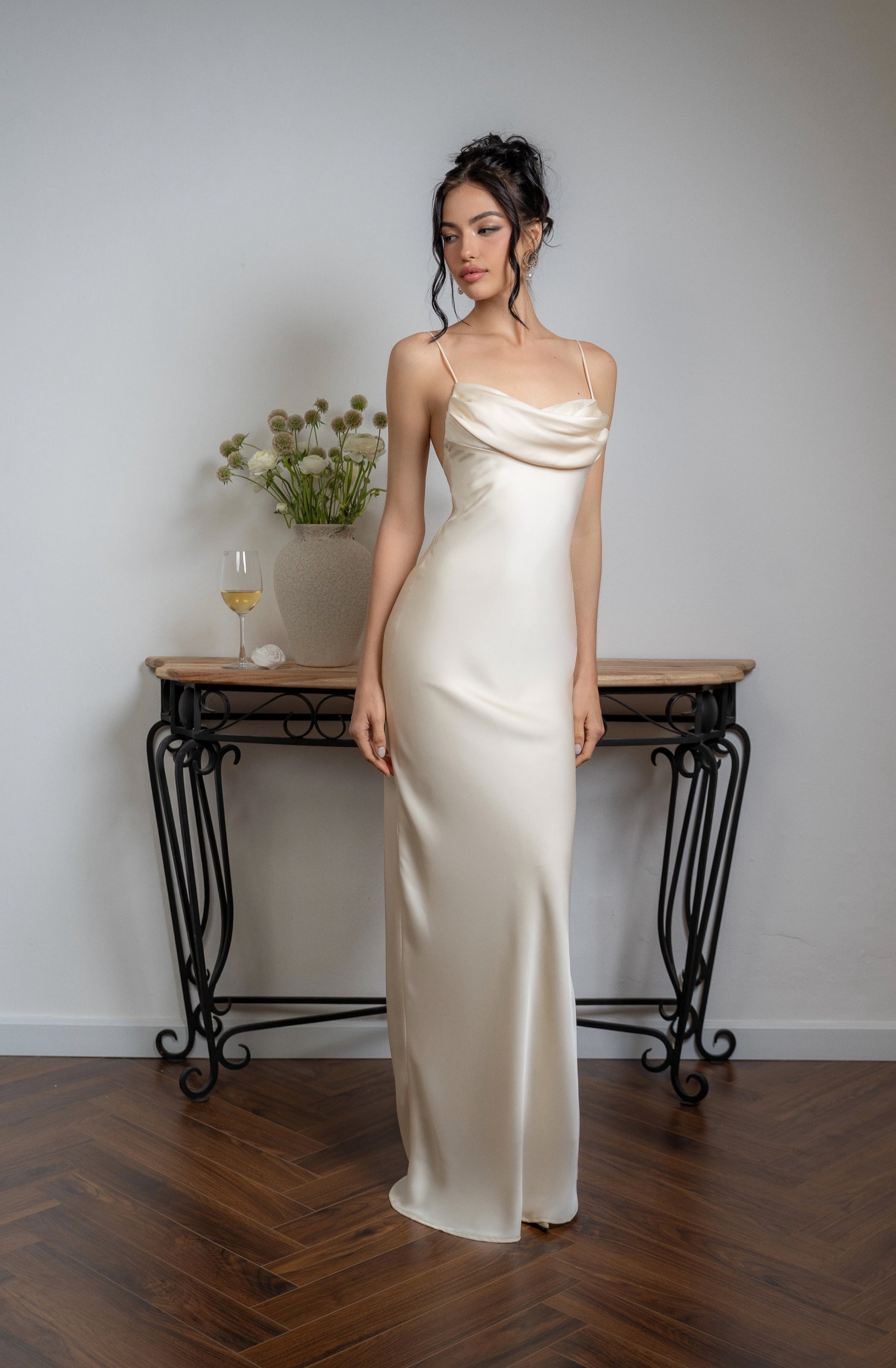 Đầm hai dây với phần ngực xếp nếp điệu đà, phần lưng khoét sâu gợi cảm. Thiết kế mang hơi thở cổ điển, thanh lịch và cảm hứng vượt thời gian.