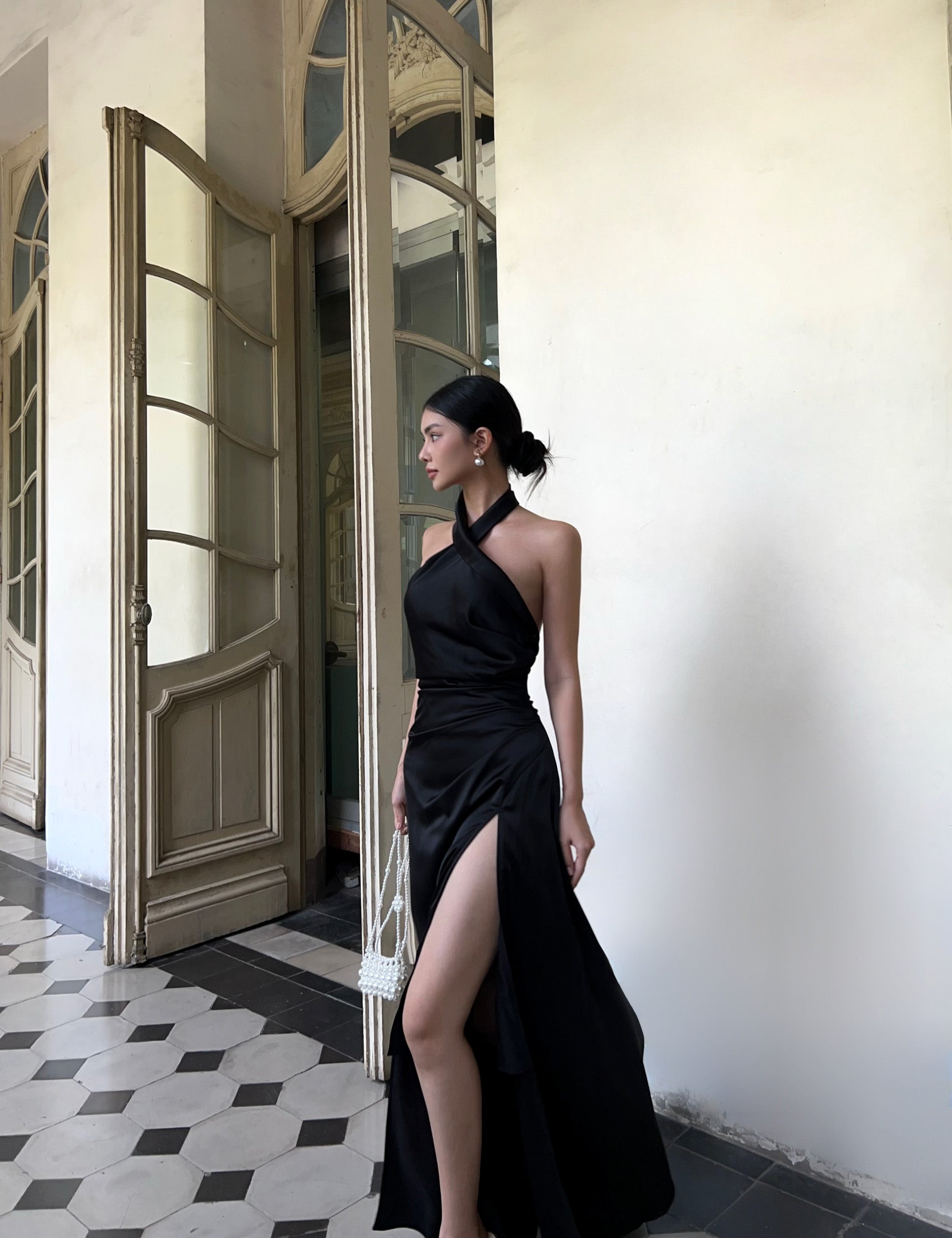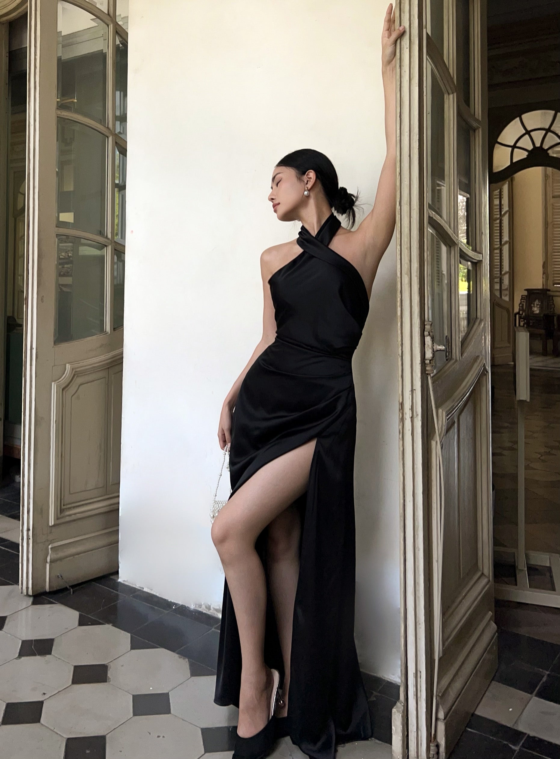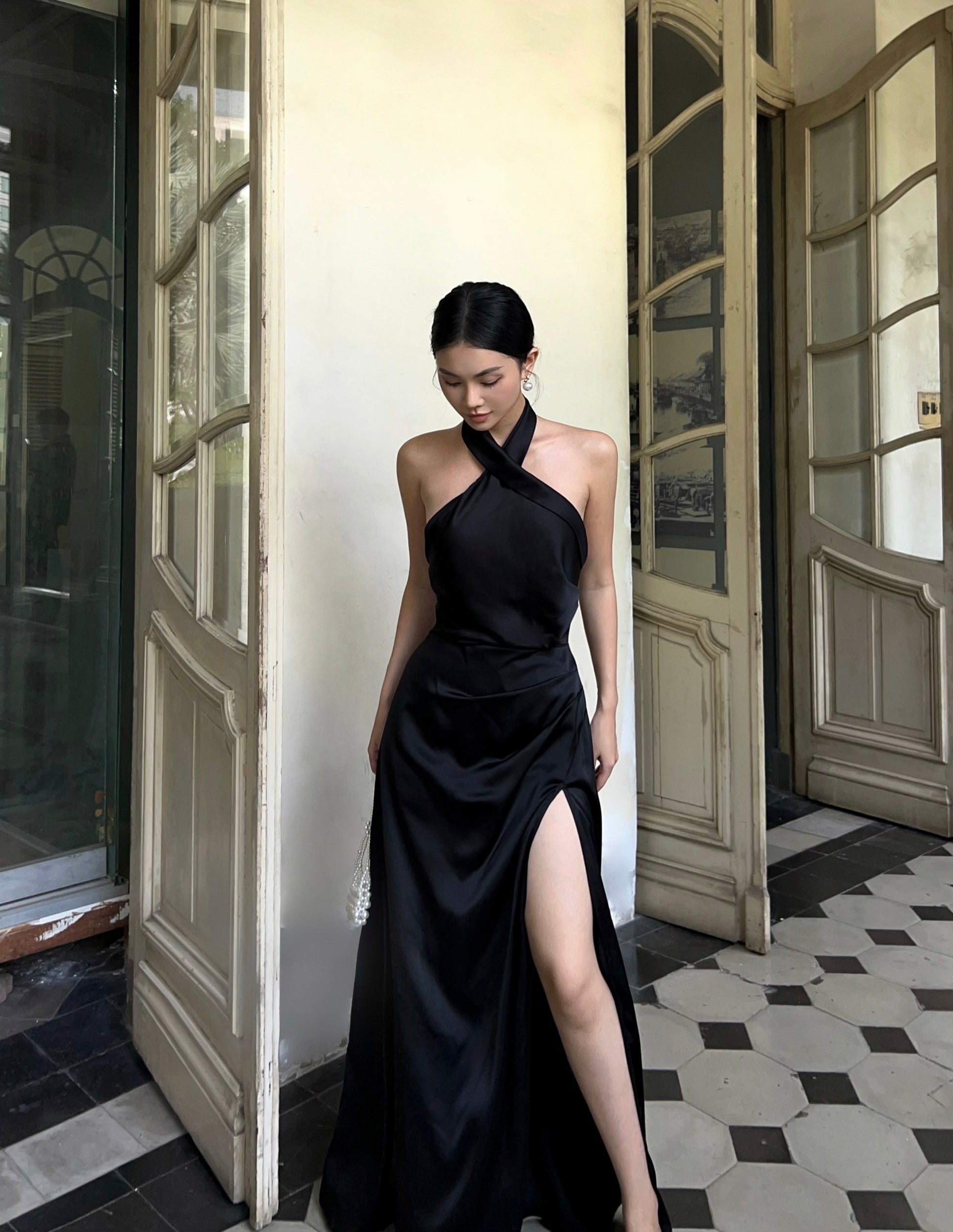 Đầm lụa dài với thiết kế cổ yếm cùng điểm nhấn xếp li ở eo và chi tiết xẻ tà ấn tượng. Đem lại cảm giác sành điệu, gợi cảm và sang trọng.