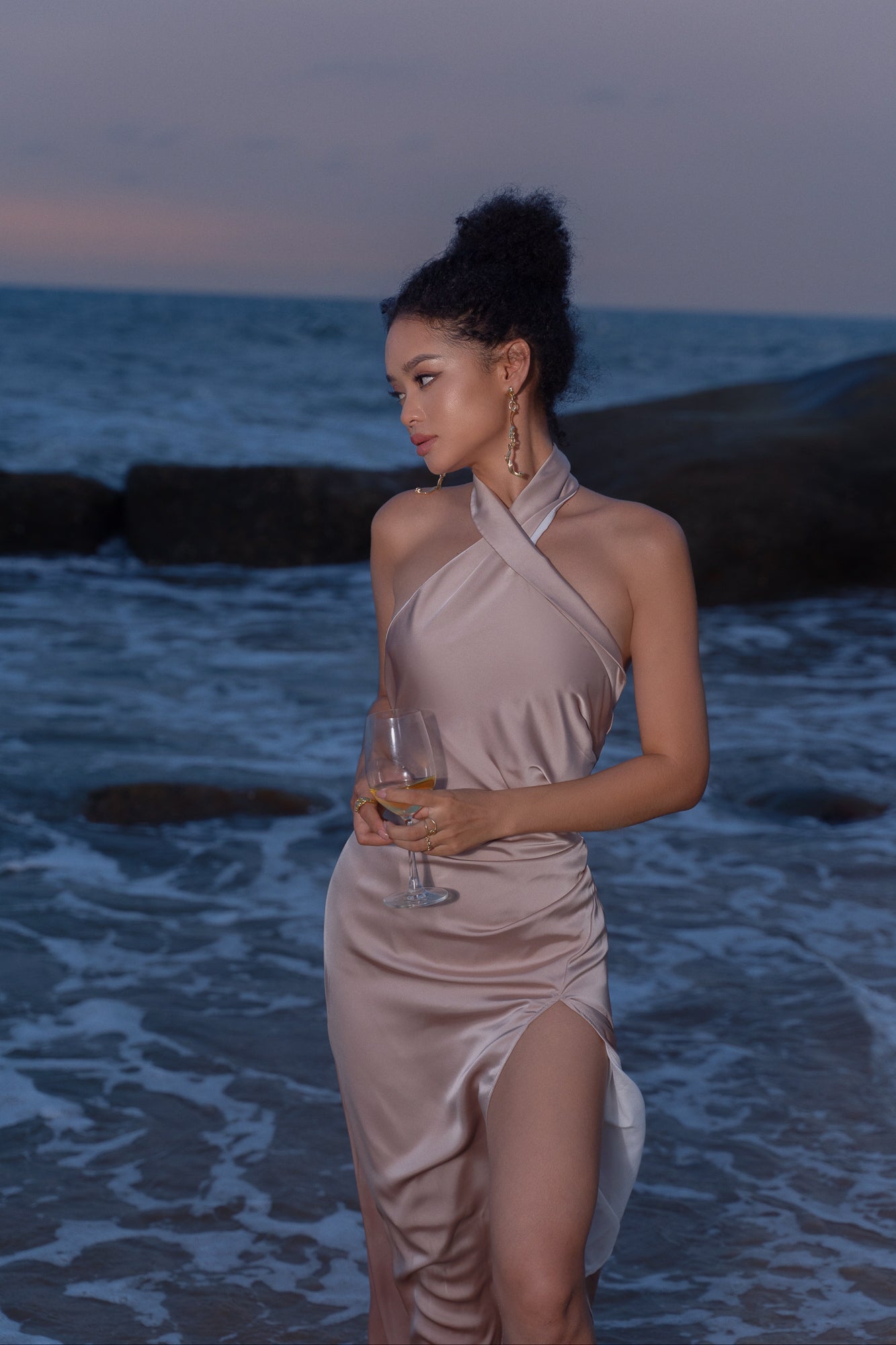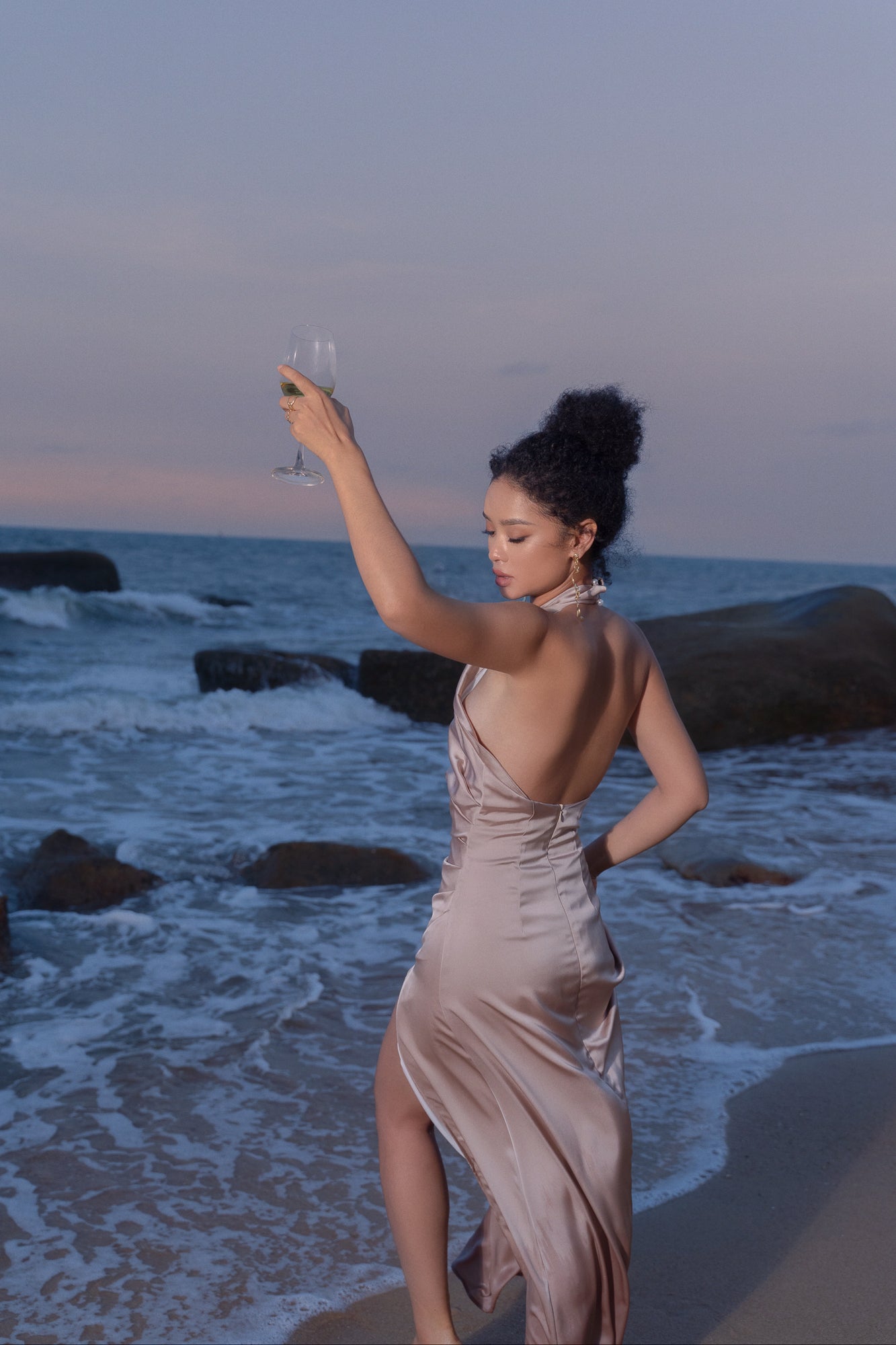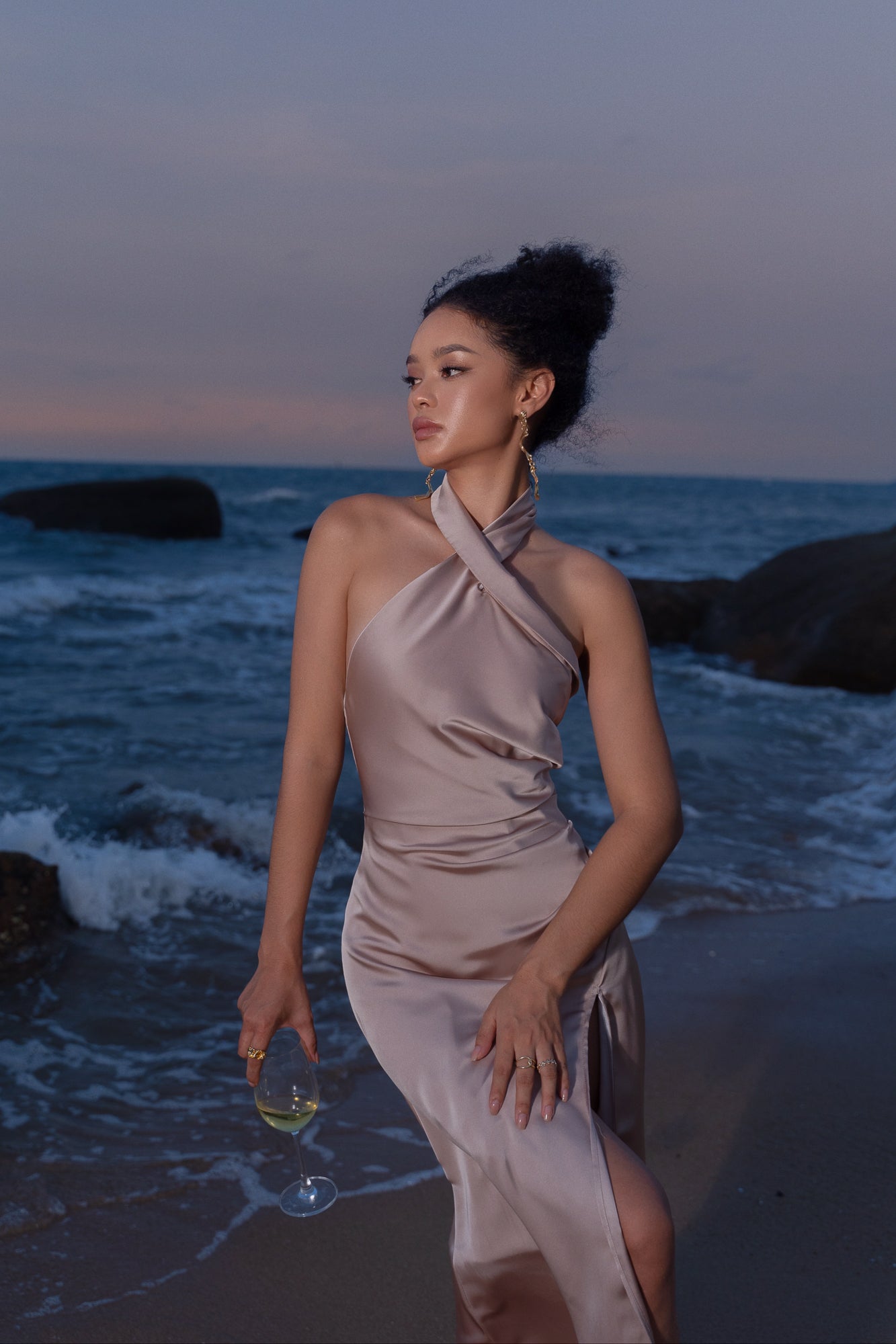 Đầm lụa dài với thiết kế cổ yếm cùng điểm nhấn xếp li ở eo và chi tiết xẻ tà ấn tượng. Đem lại cảm giác sành điệu, gợi cảm và sang trọng.