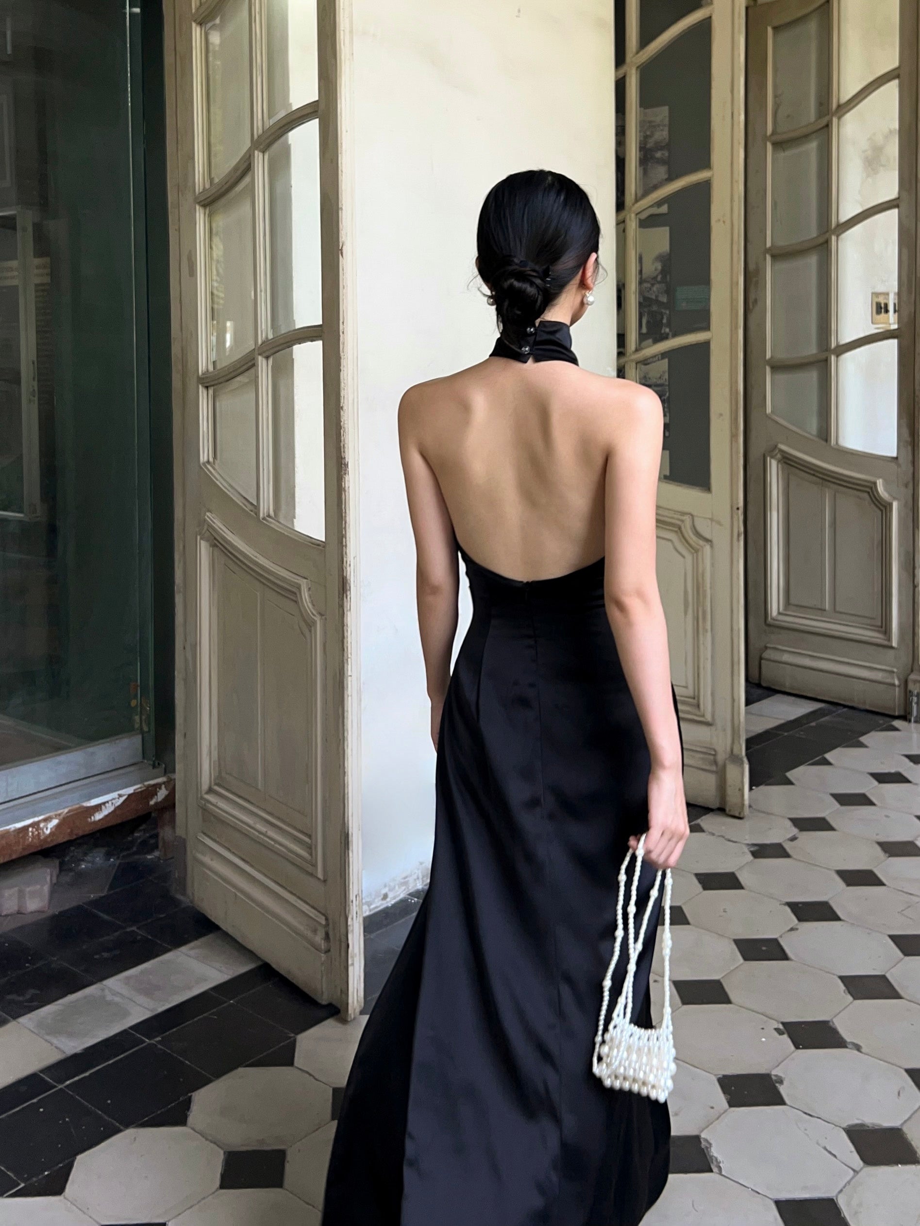 Long silk dress with halter neck design, pleated waist detail and impressive slit details. Brings a stylish, sexy and luxurious feeling.