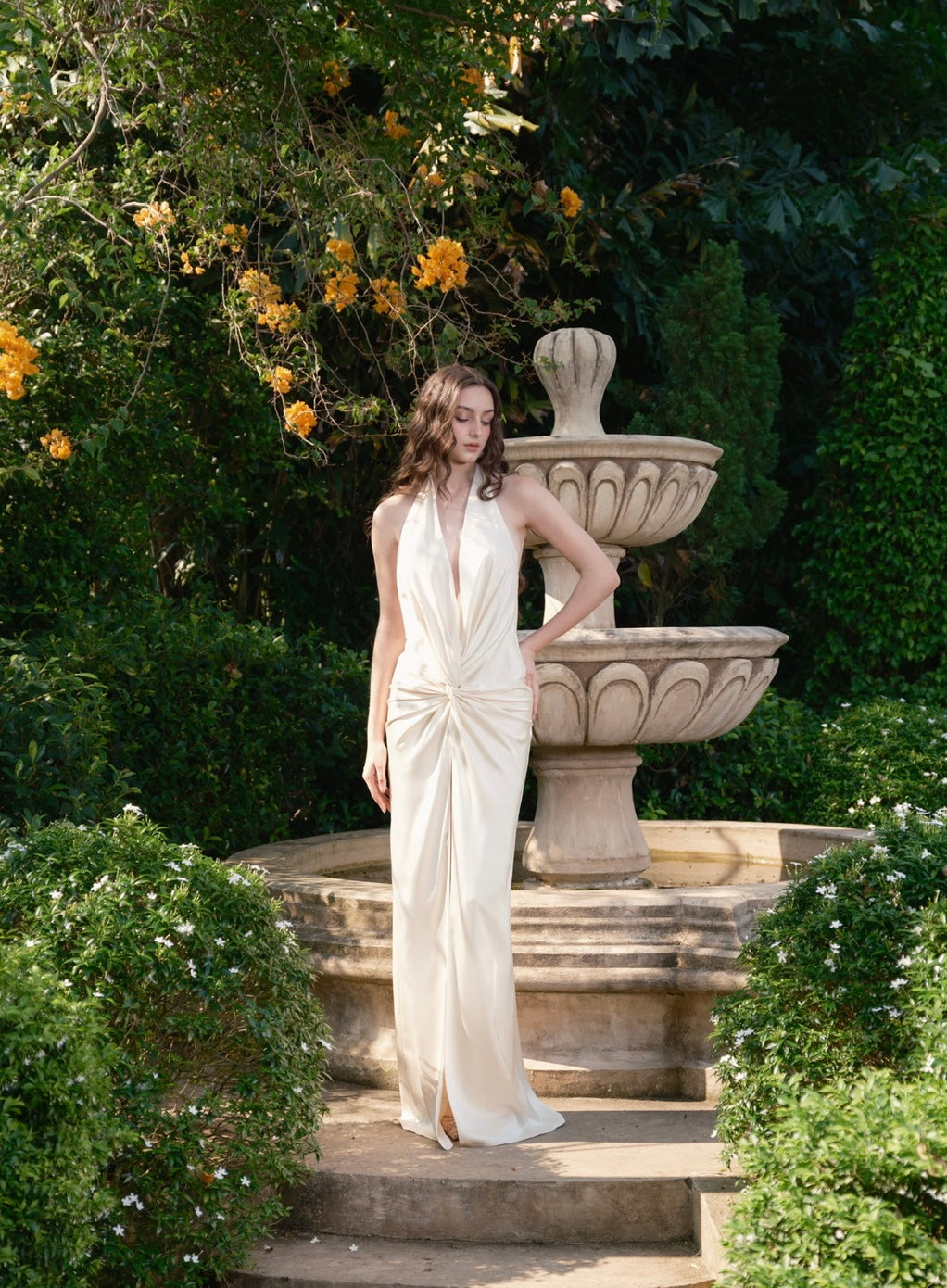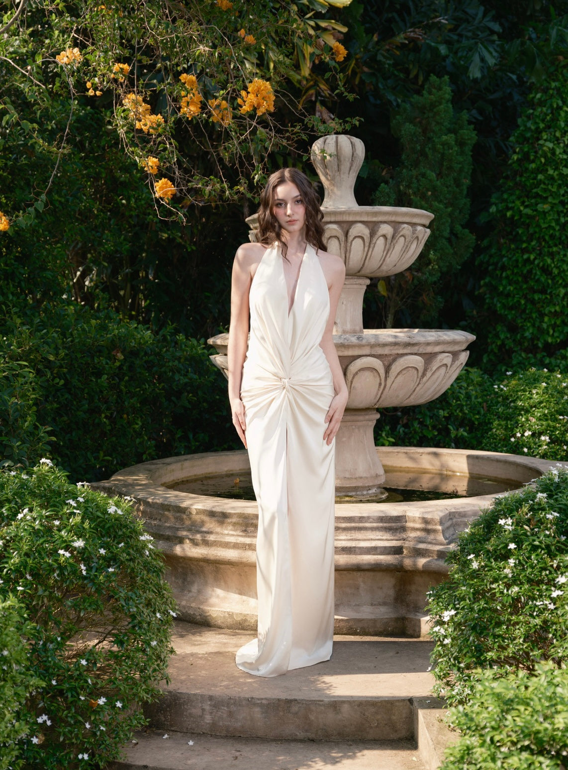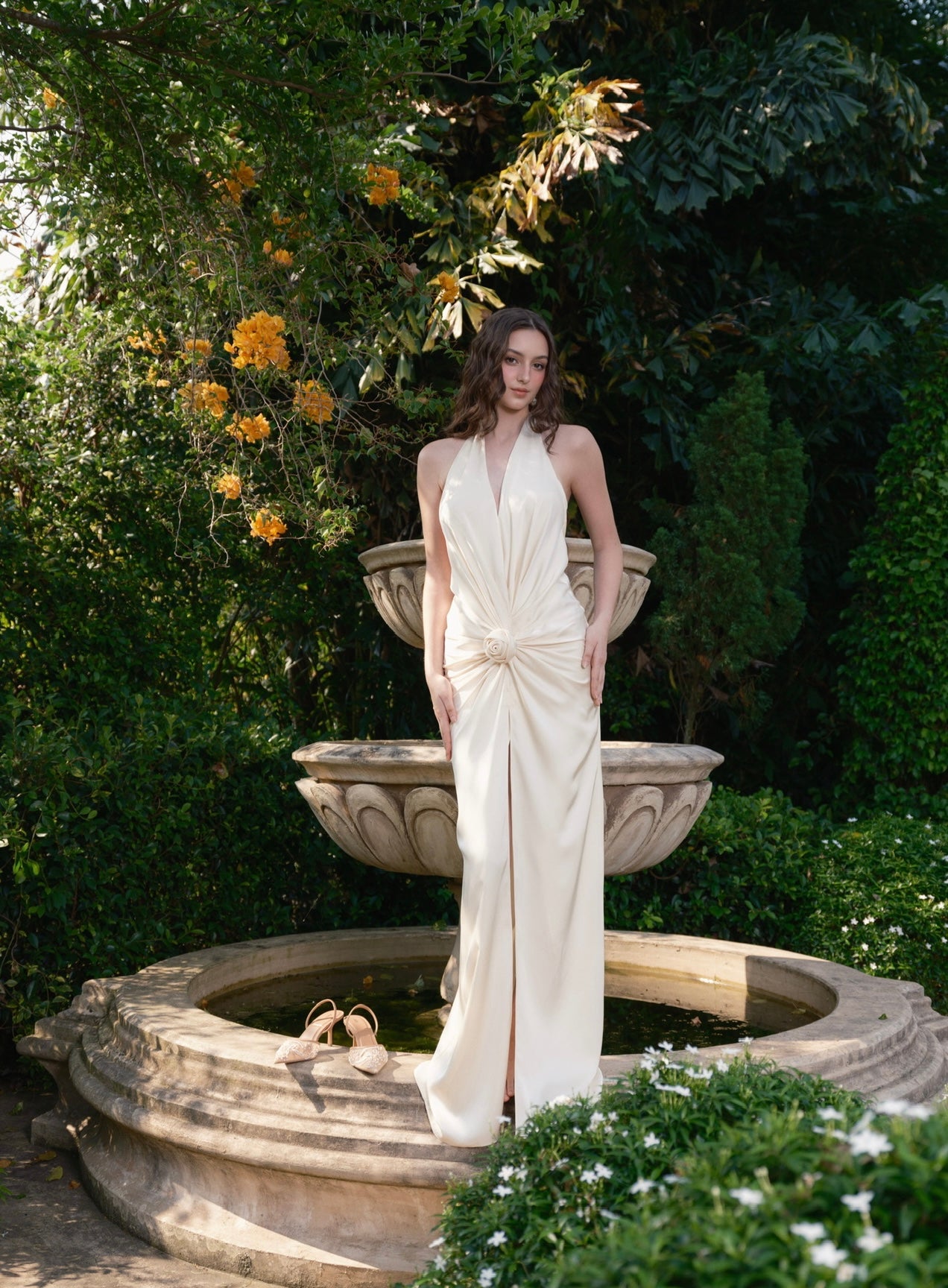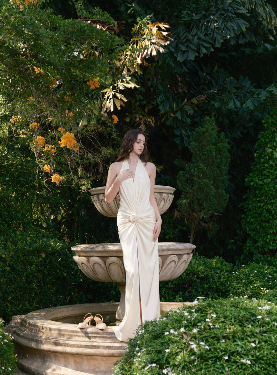 Like a gentle summer breeze in a garden of dreams, LUCIA embodies fluidity, elegance, and romance. Crafted from luxurious silk, this halter-neck gown features a soft silhouette that subtly embraces the body, with a rose-inspired twist detail at the waist — flattering the figure while blooming with ethereal charm.