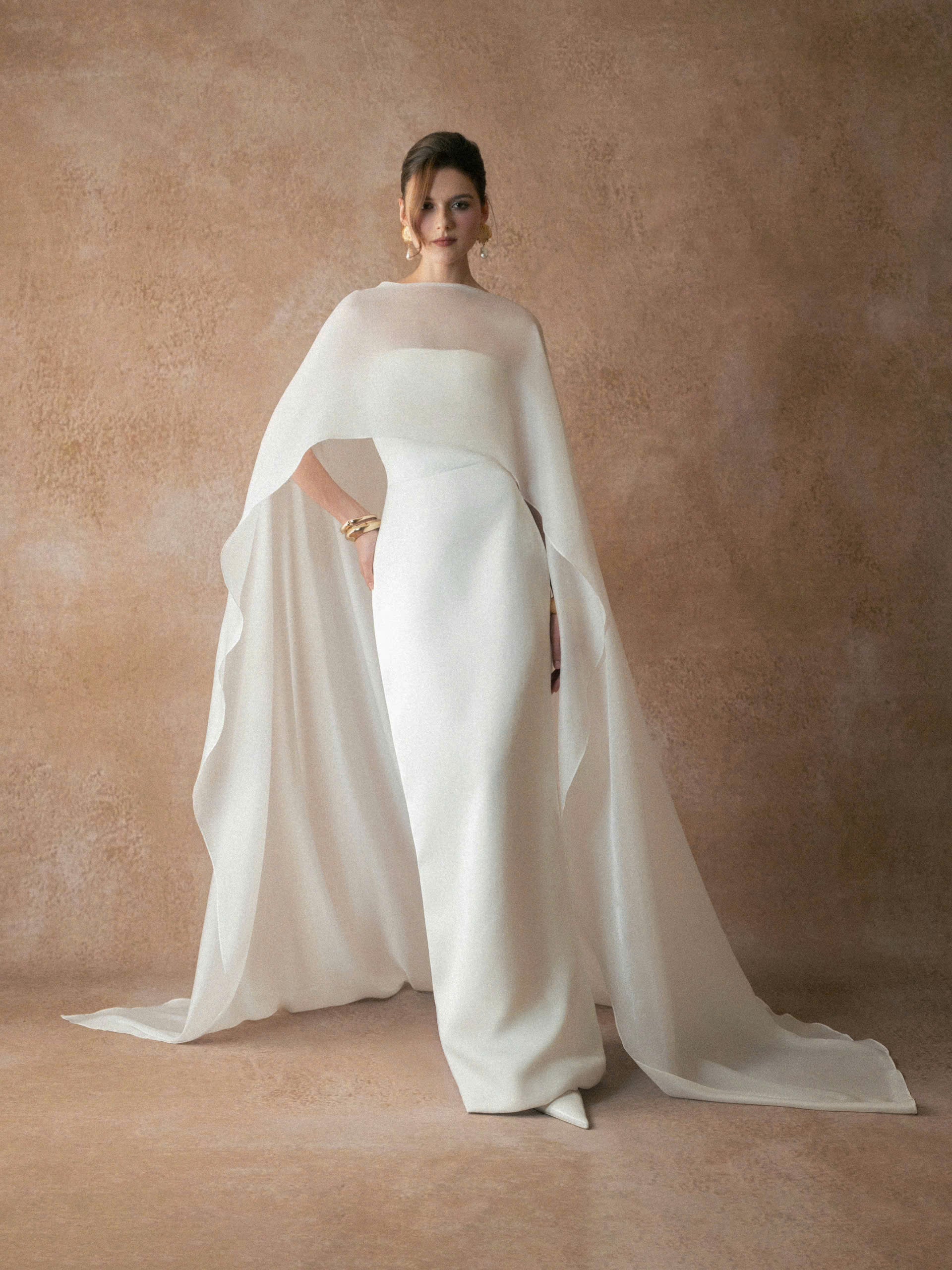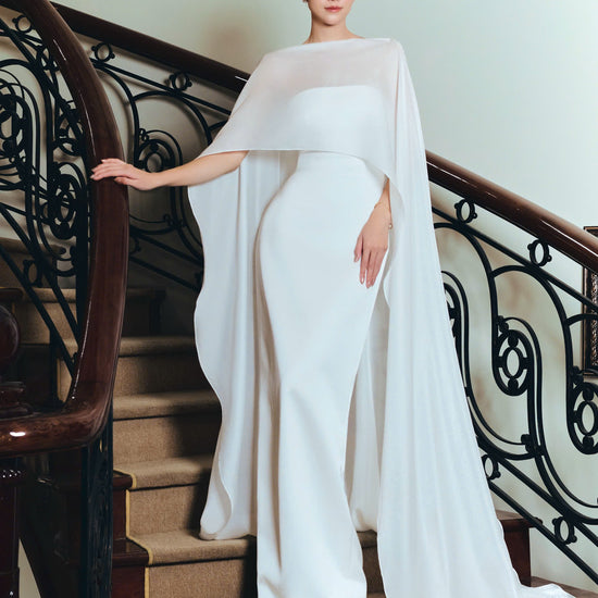A signature highlight lies in the sheer chiffon cape draped effortlessly over the shoulders, cascading gently to evoke an airy, refined elegance. The delicate corset back completes the look with a polished finish, subtly enhancing the figure.