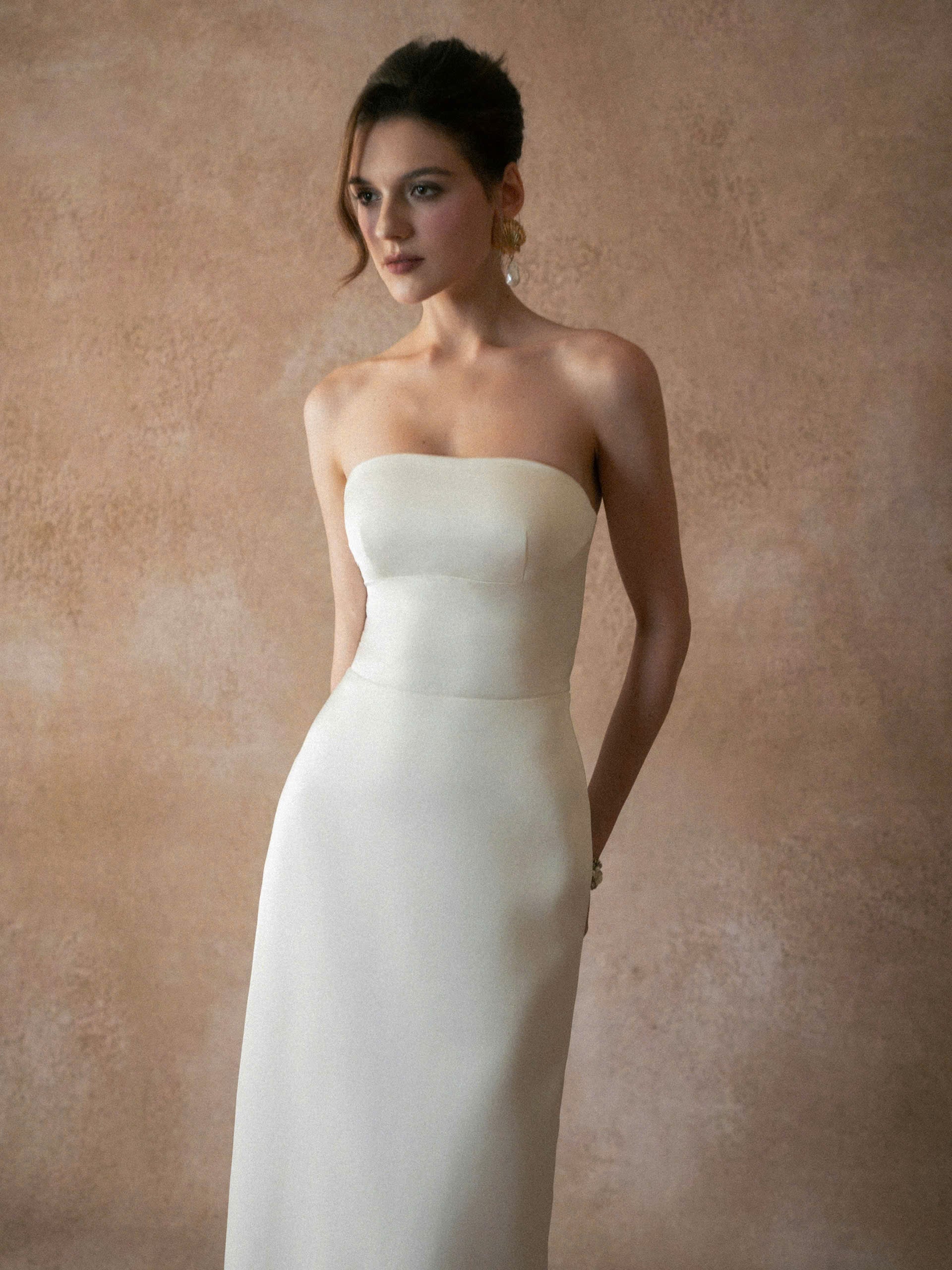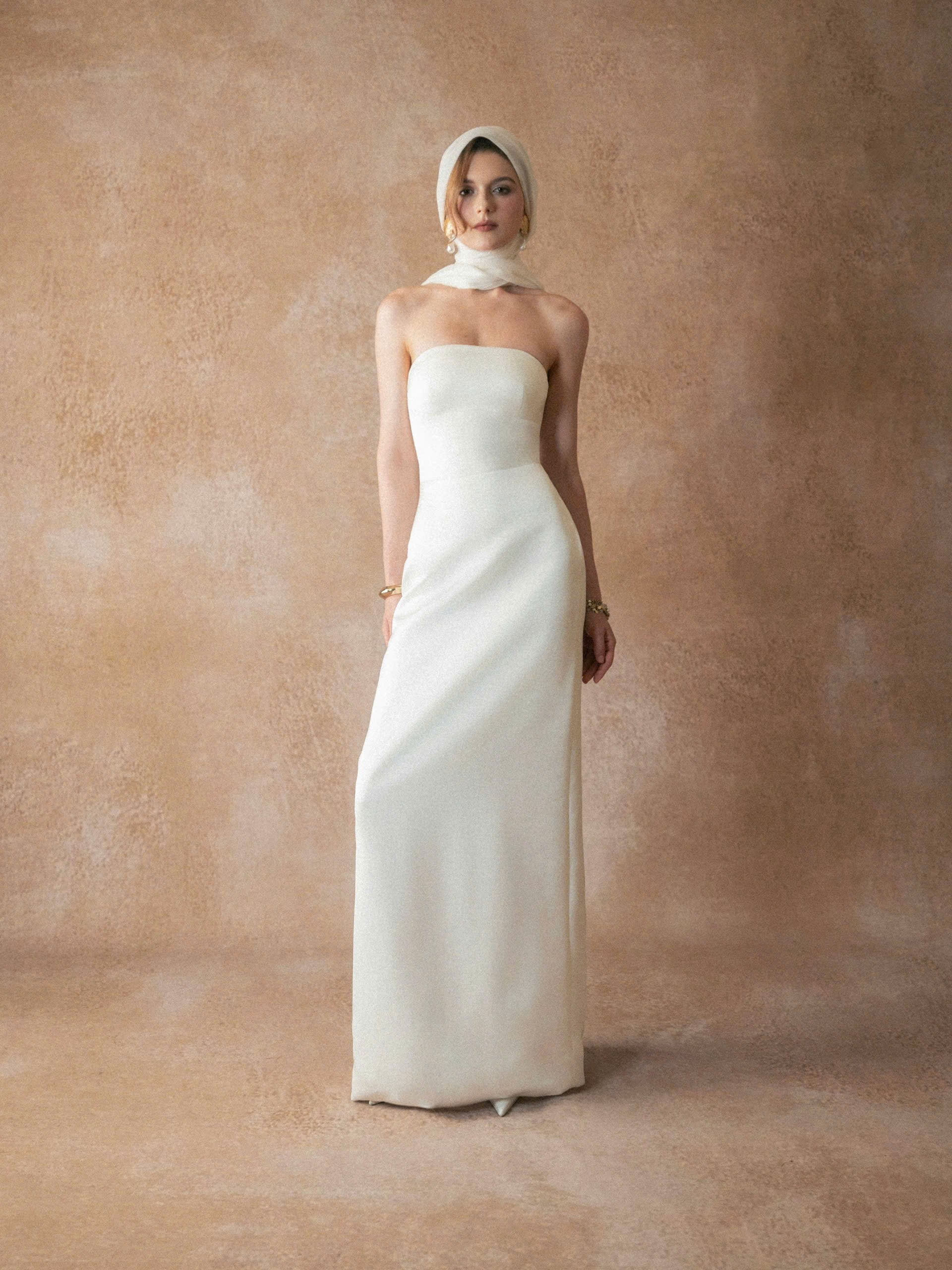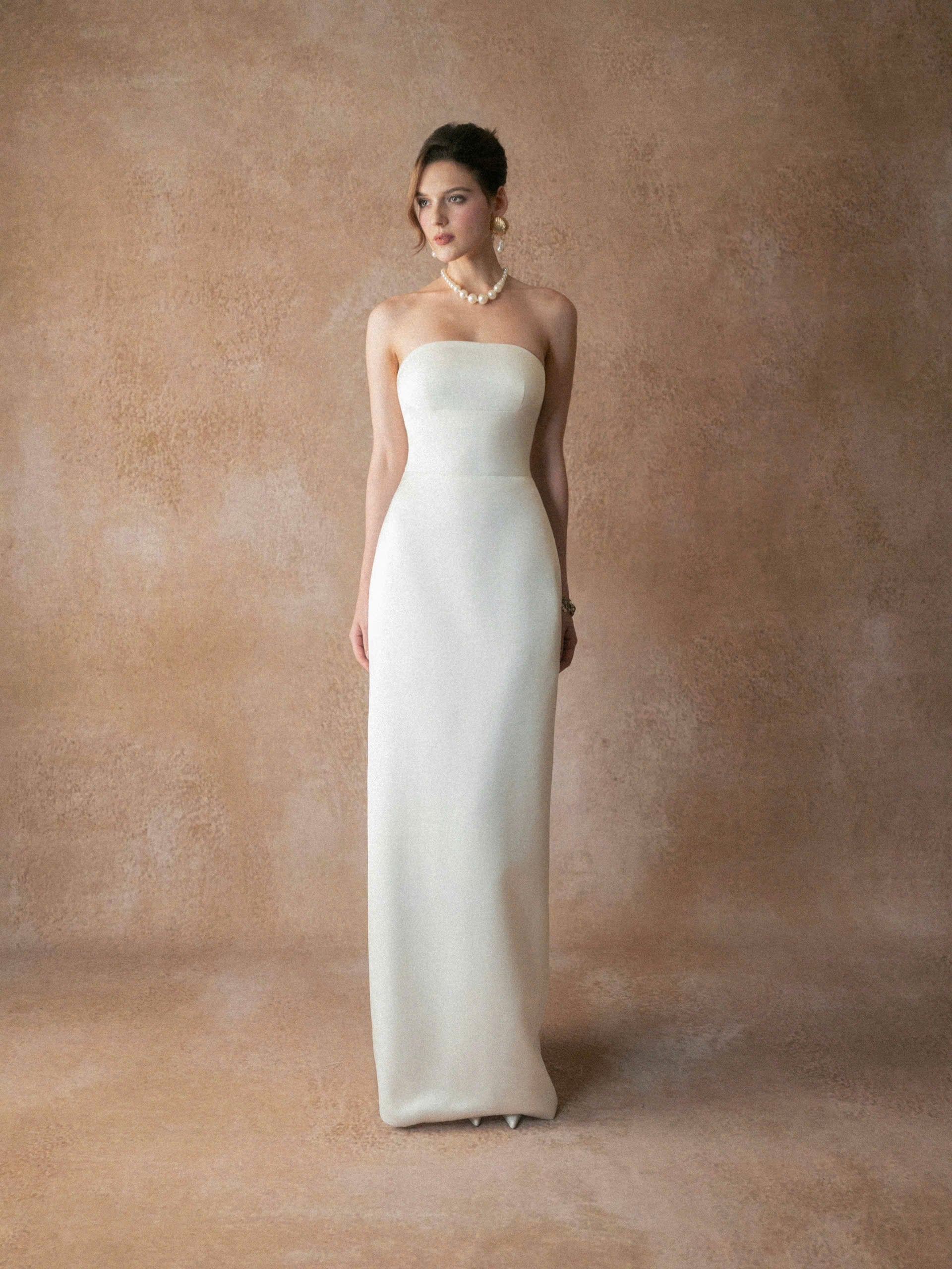 MIVORA captivates with a clean strapless design that embraces the body’s curves, creating a sleek, elongated silhouette filled with quiet confidence. Crafted from smooth silk, the gown holds its shape beautifully while remaining soft and fluid with every movement.