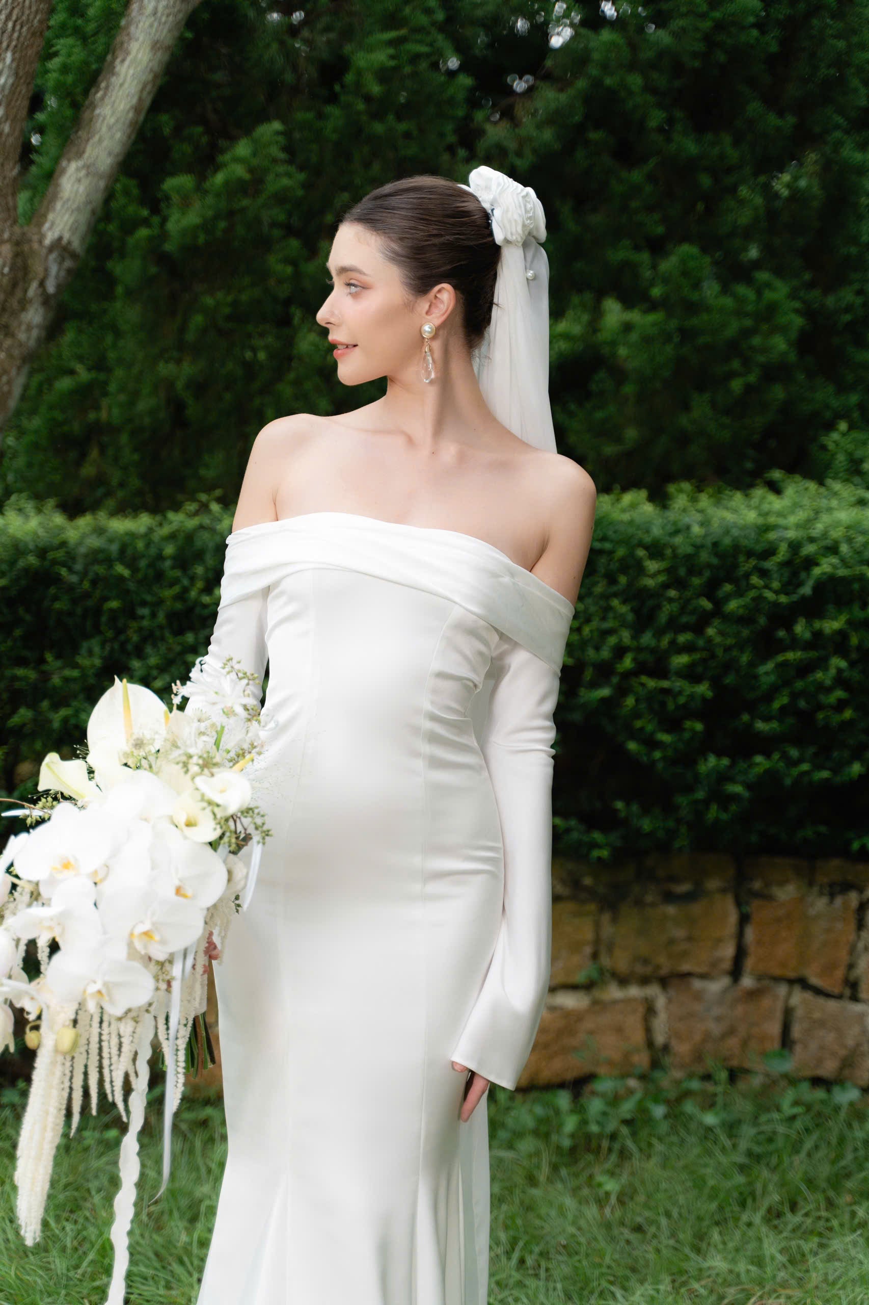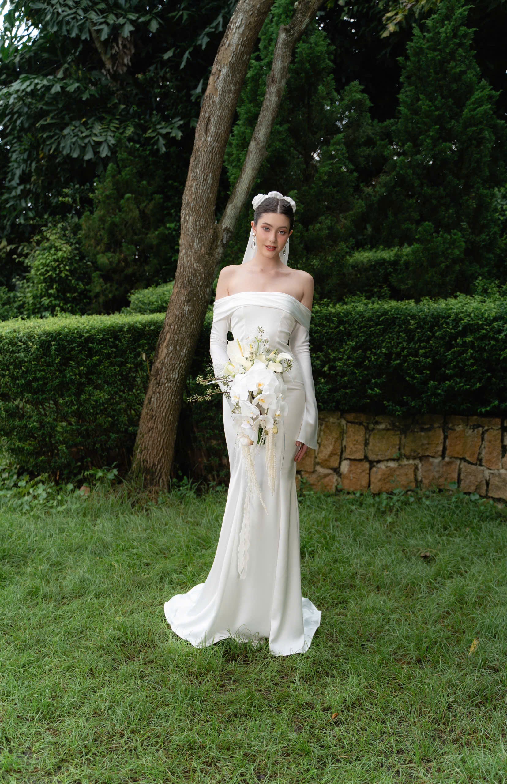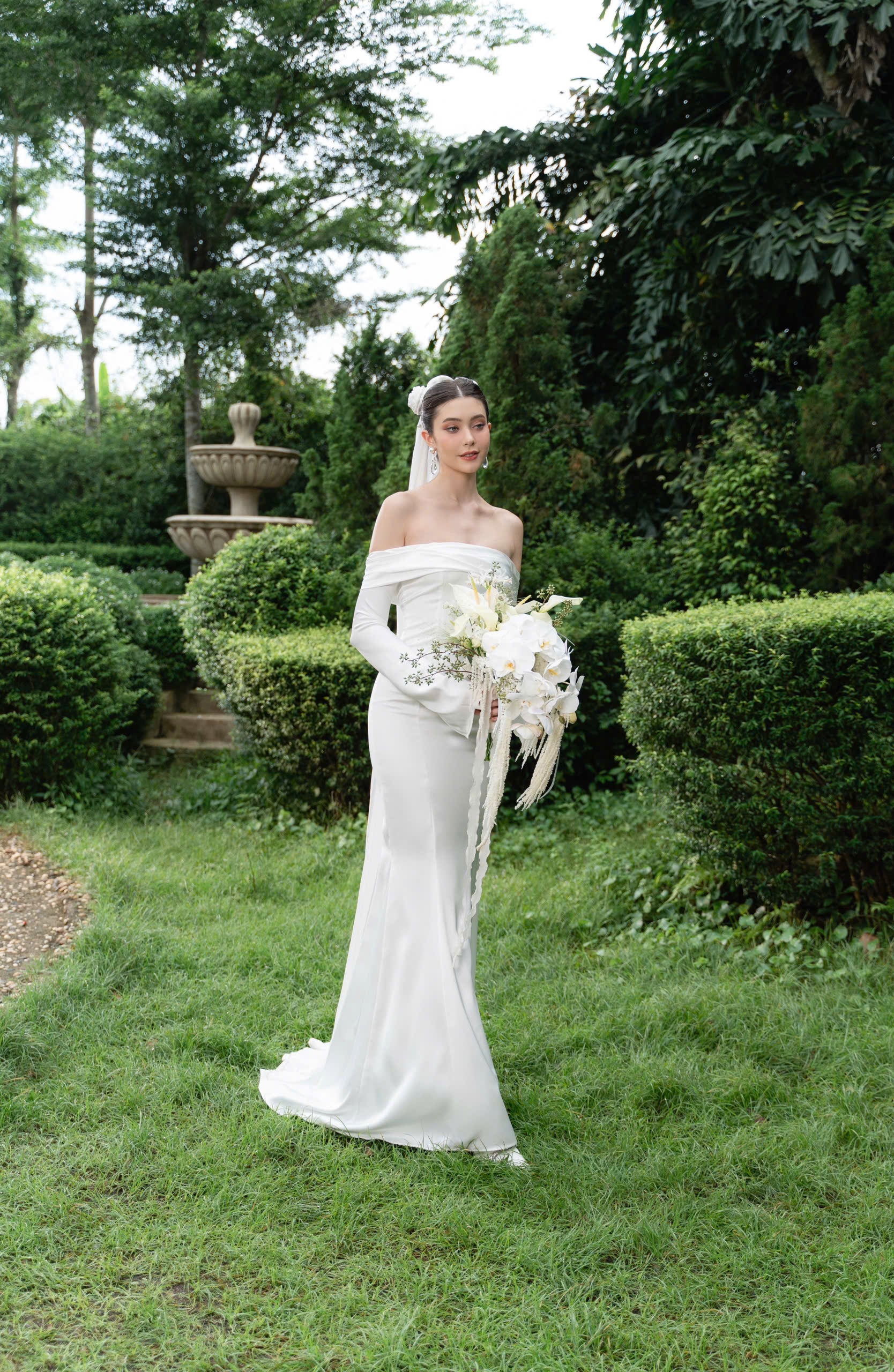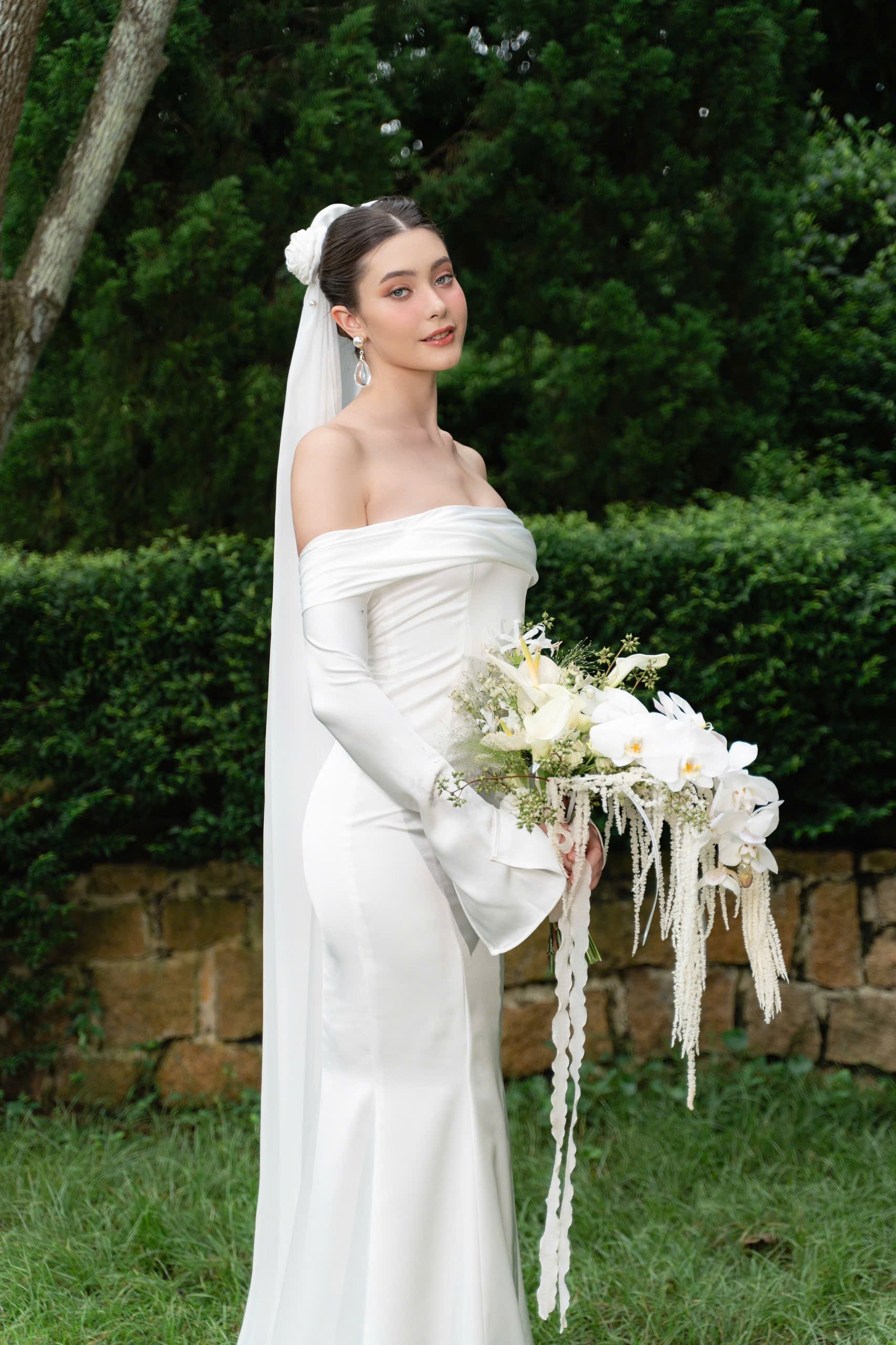 The Mortica silk gown is an elegant design featuring a floor-length silhouette with a long tail, creating a soft and graceful look. The off-shoulder detail highlights the wearer's sensual shoulders, paired with long sleeves that are slit at the wrists for a touch of refinement and uniqueness. At the back, a lace-up detail allows for easy adjustment, ensuring a flattering fit that accentuates the waistline. Crafted from premium silk, the dress exudes luxury and smoothness, making it perfect for special occasions when you want to stand out with a sophisticated, classy style.