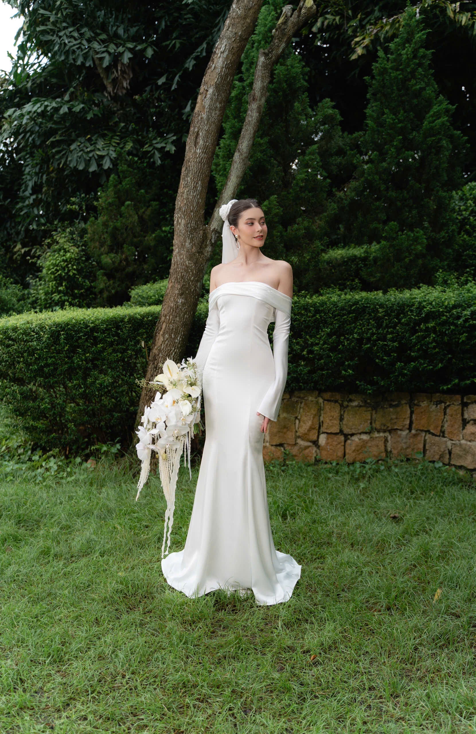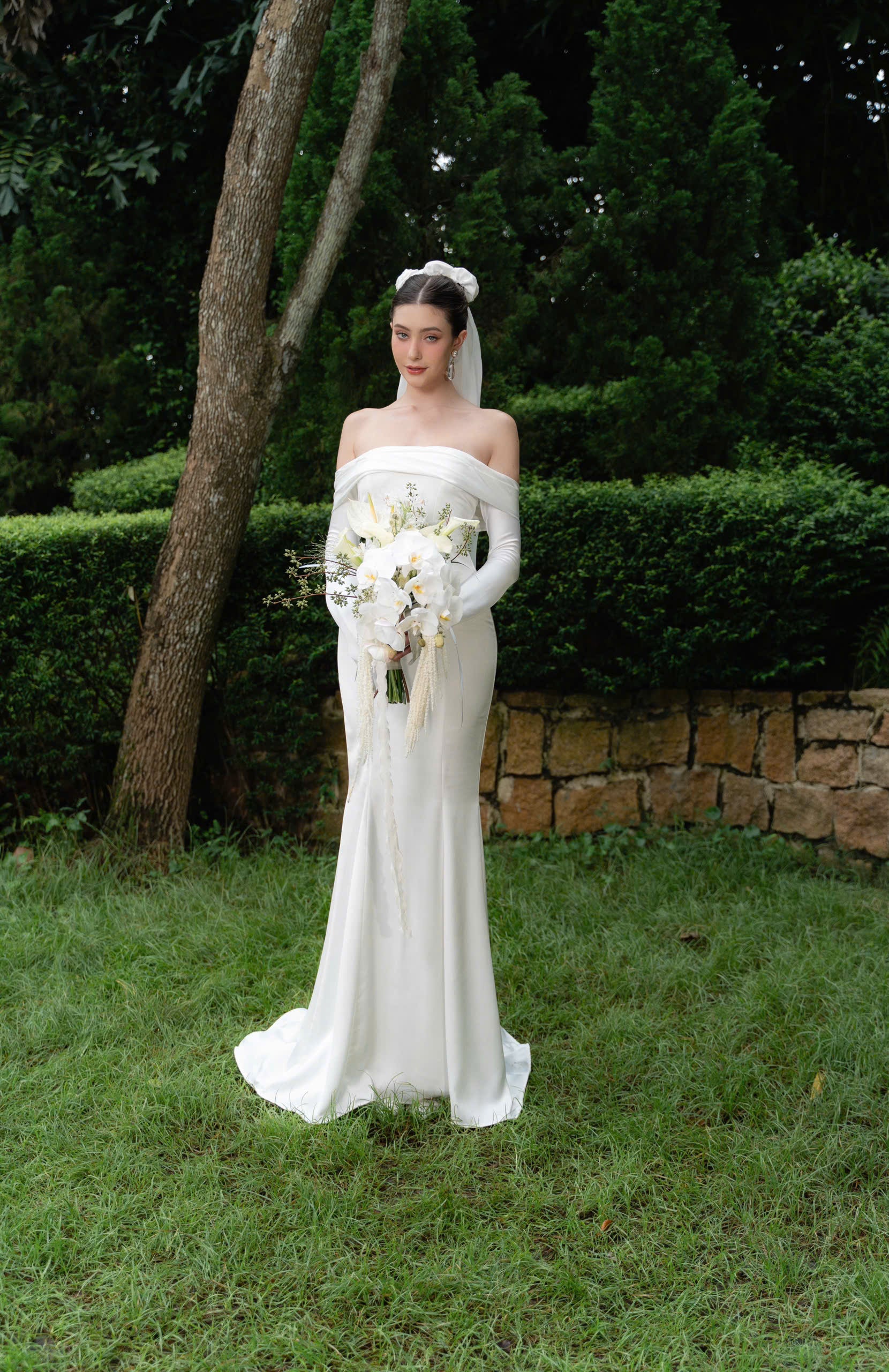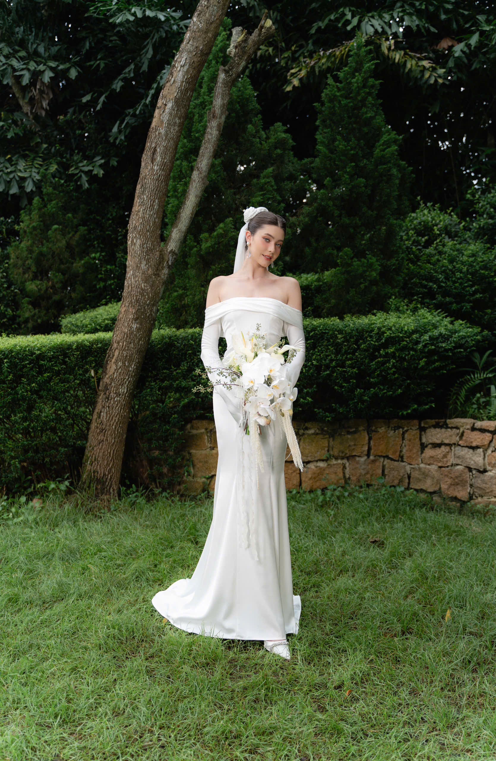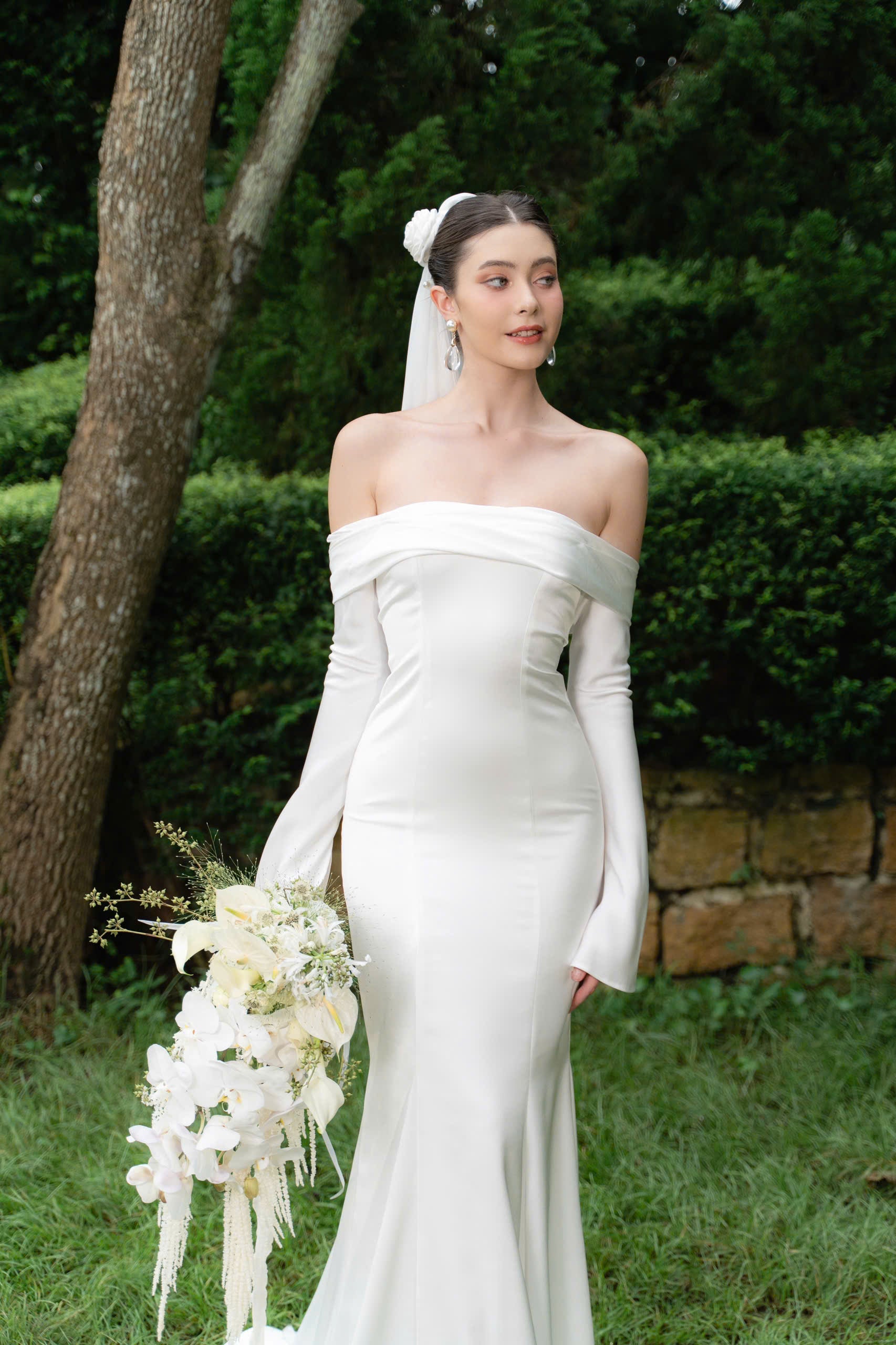 The Mortica silk gown is an elegant design featuring a floor-length silhouette with a long tail, creating a soft and graceful look. The off-shoulder detail highlights the wearer's sensual shoulders, paired with long sleeves that are slit at the wrists for a touch of refinement and uniqueness. At the back, a lace-up detail allows for easy adjustment, ensuring a flattering fit that accentuates the waistline. Crafted from premium silk, the dress exudes luxury and smoothness, making it perfect for special occasions when you want to stand out with a sophisticated, classy style.