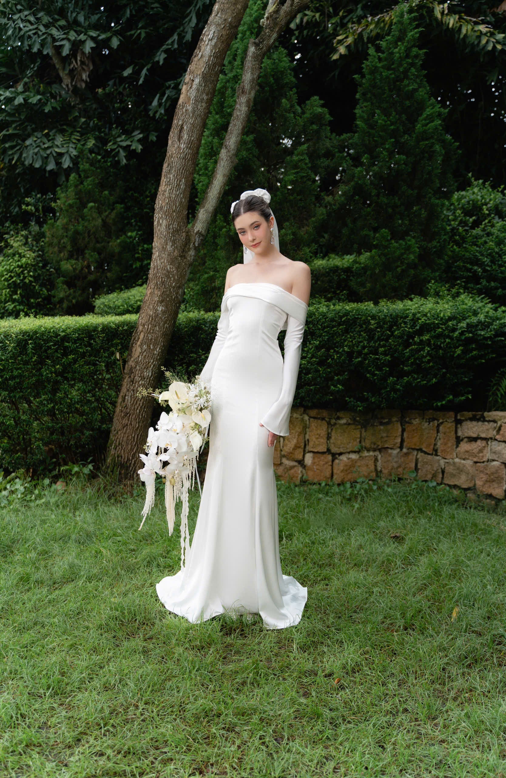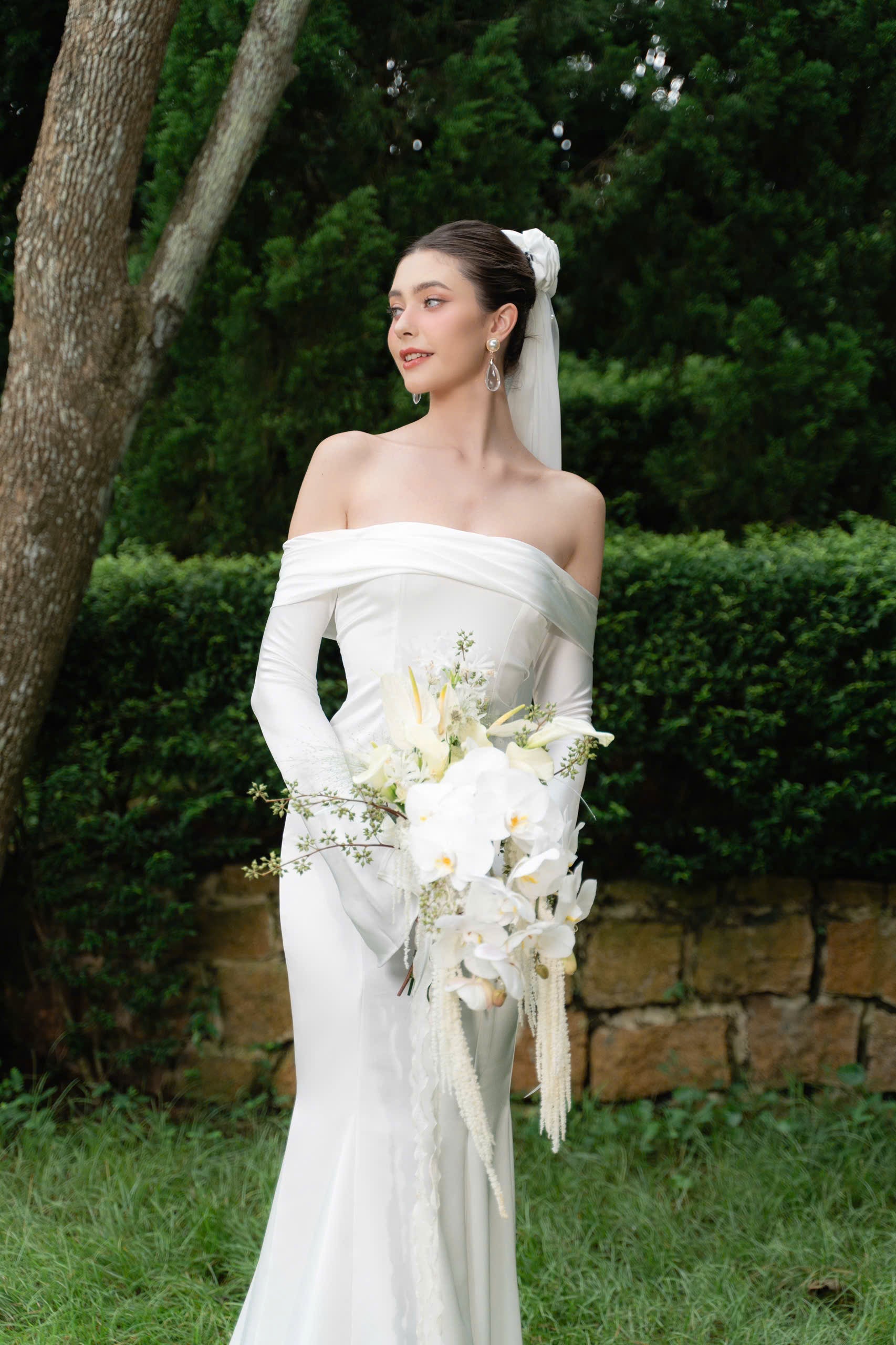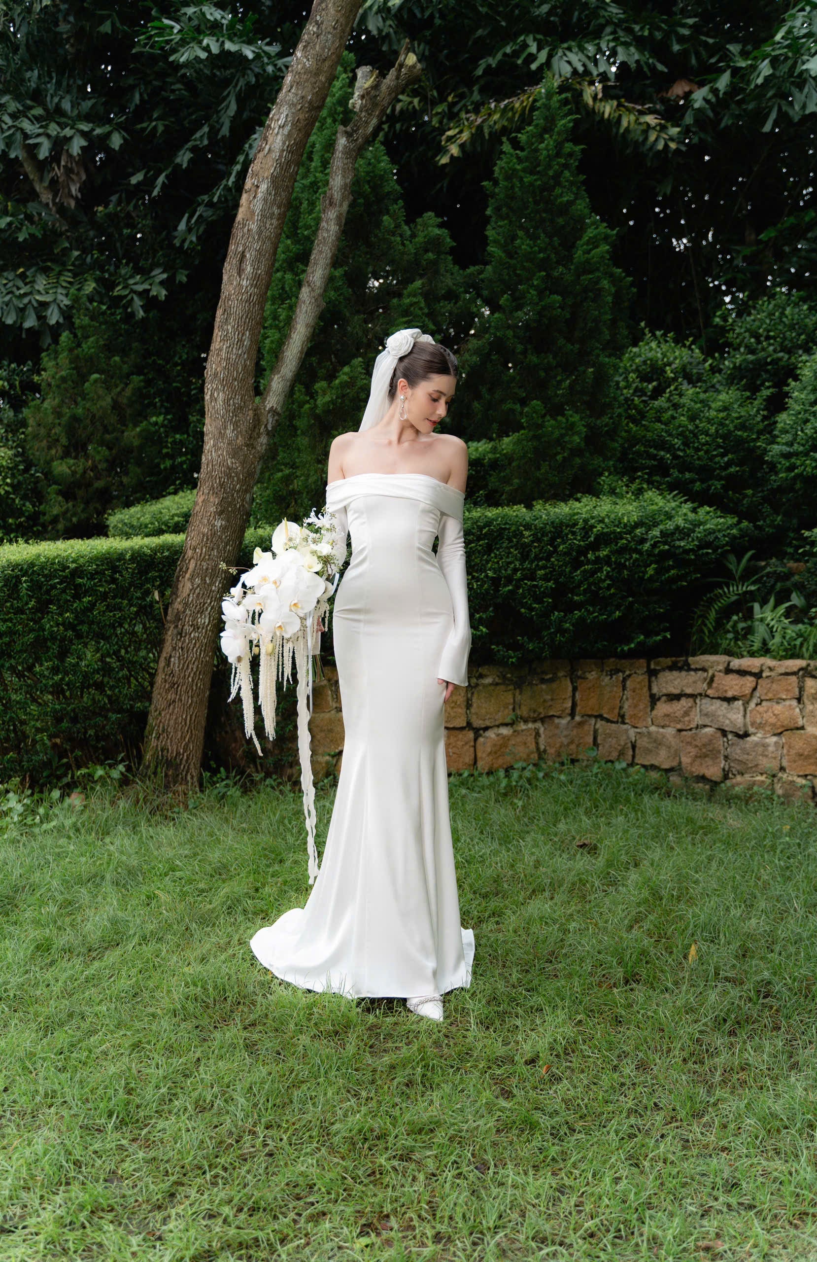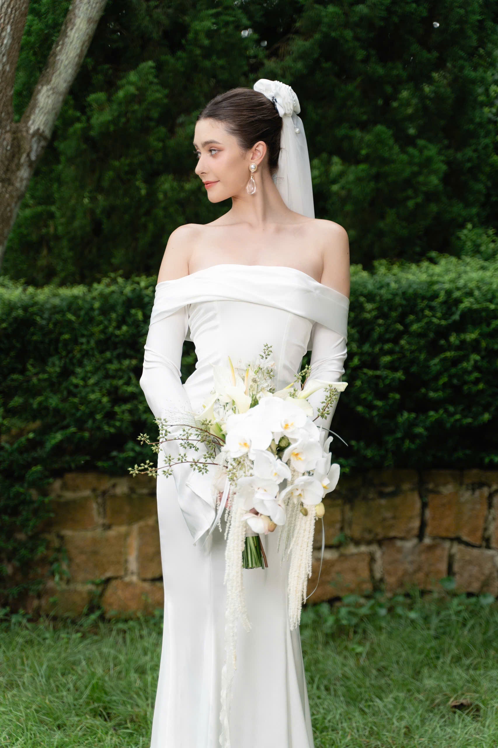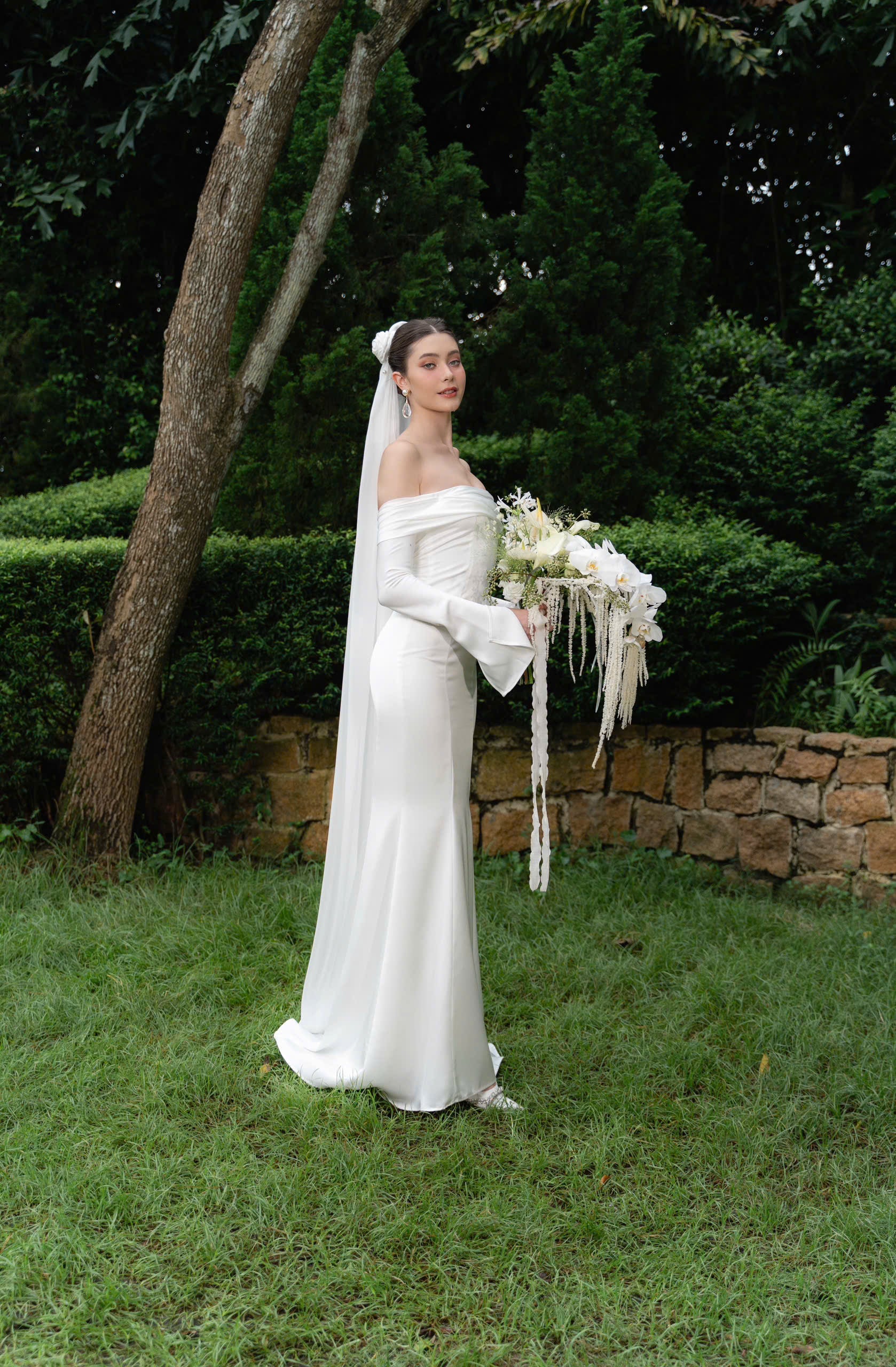 The Mortica silk gown is an elegant design featuring a floor-length silhouette with a long tail, creating a soft and graceful look. The off-shoulder detail highlights the wearer's sensual shoulders, paired with long sleeves that are slit at the wrists for a touch of refinement and uniqueness. At the back, a lace-up detail allows for easy adjustment, ensuring a flattering fit that accentuates the waistline. Crafted from premium silk, the dress exudes luxury and smoothness, making it perfect for special occasions when you want to stand out with a sophisticated, classy style.